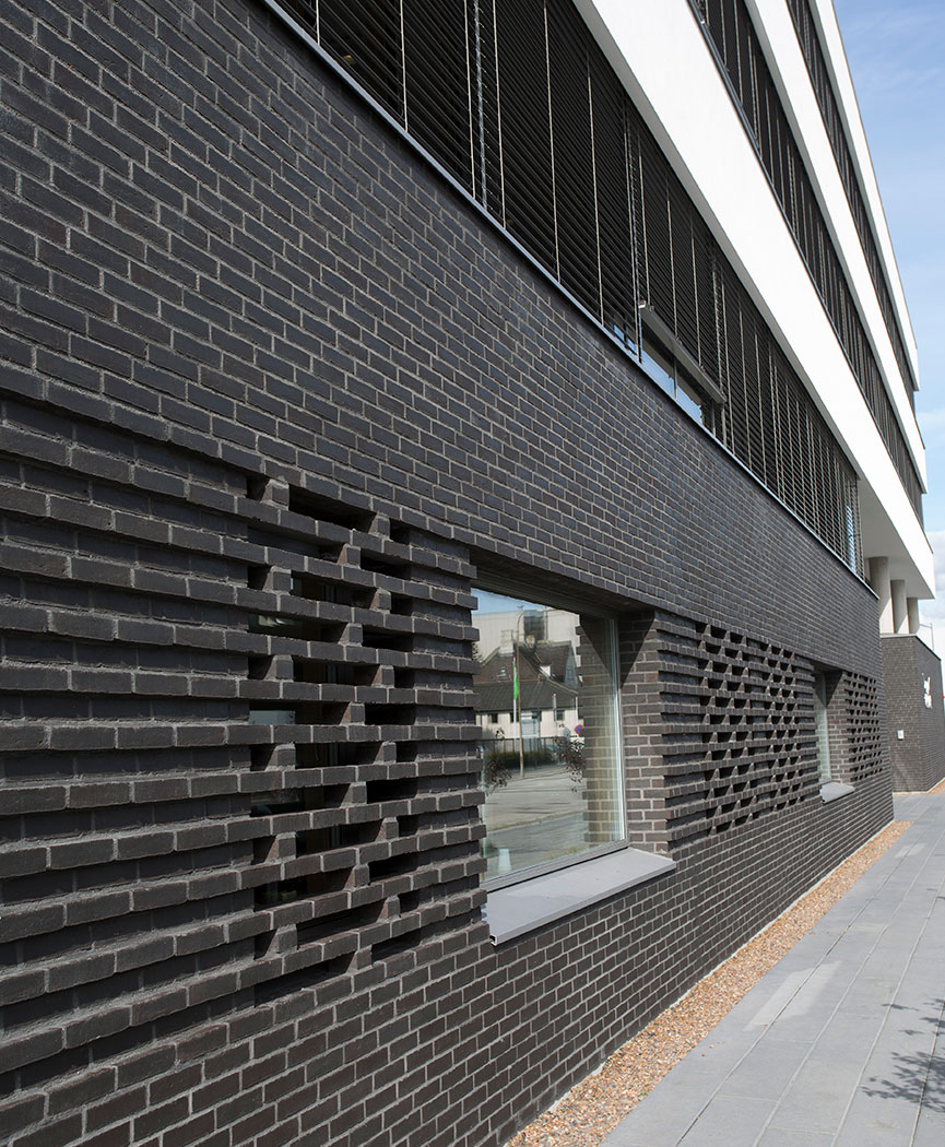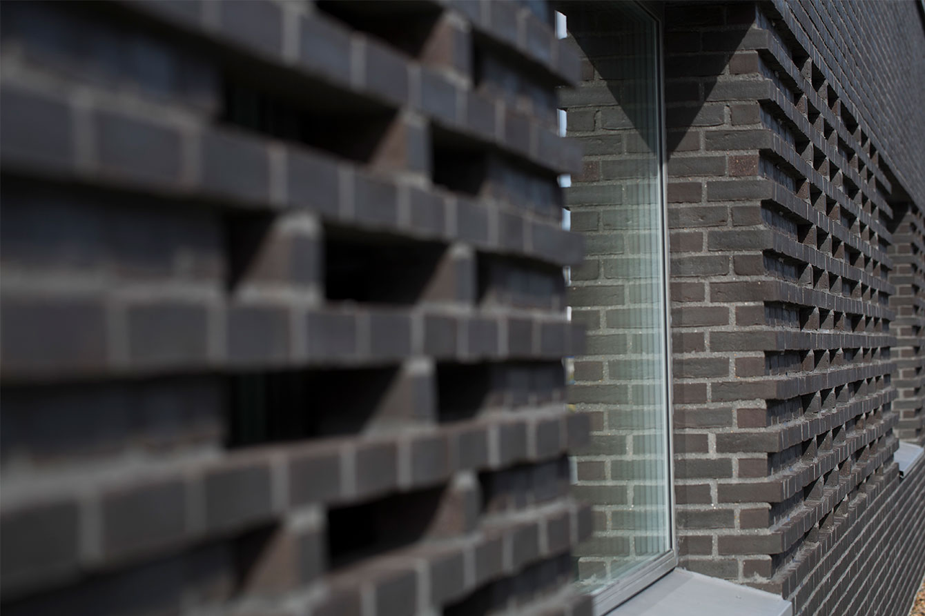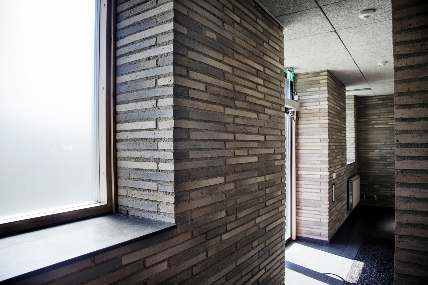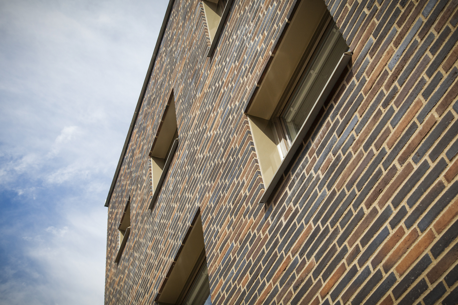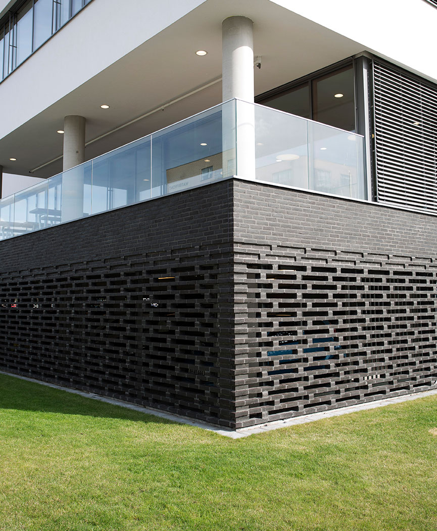 A modern campus building for the students where the special technique to apply the dark grey mortar gives an exciting expression. The glass roof accentuates the modernity.