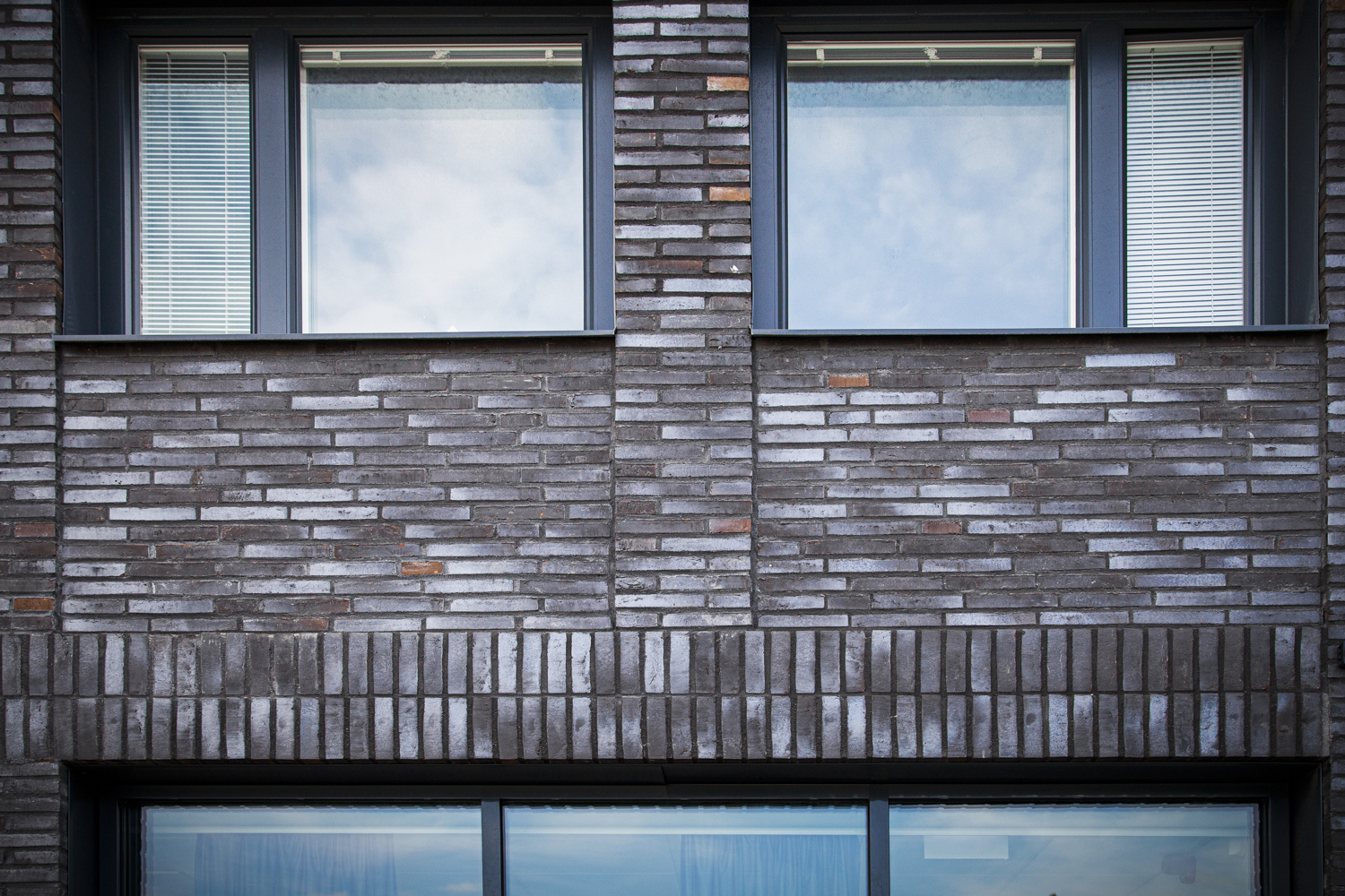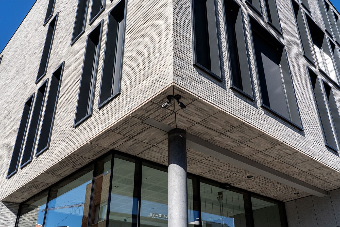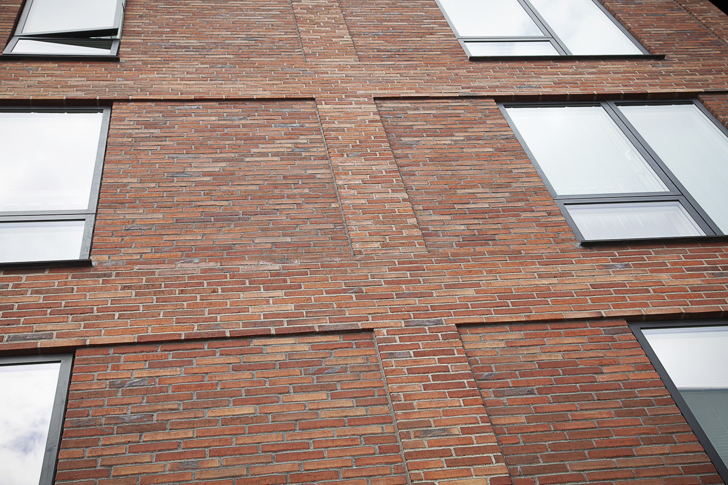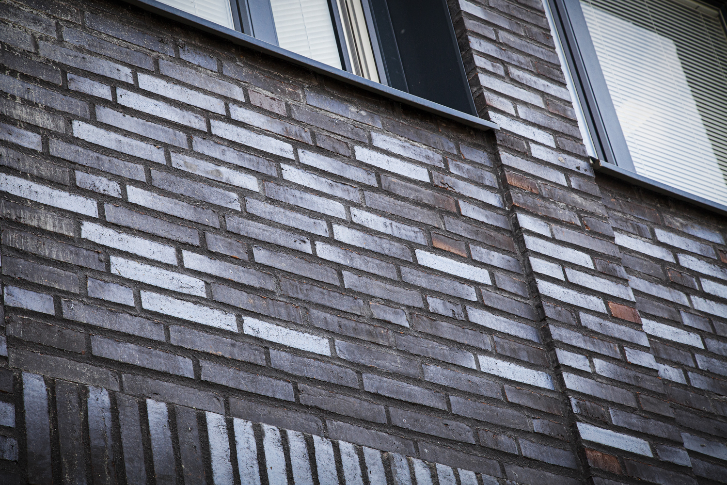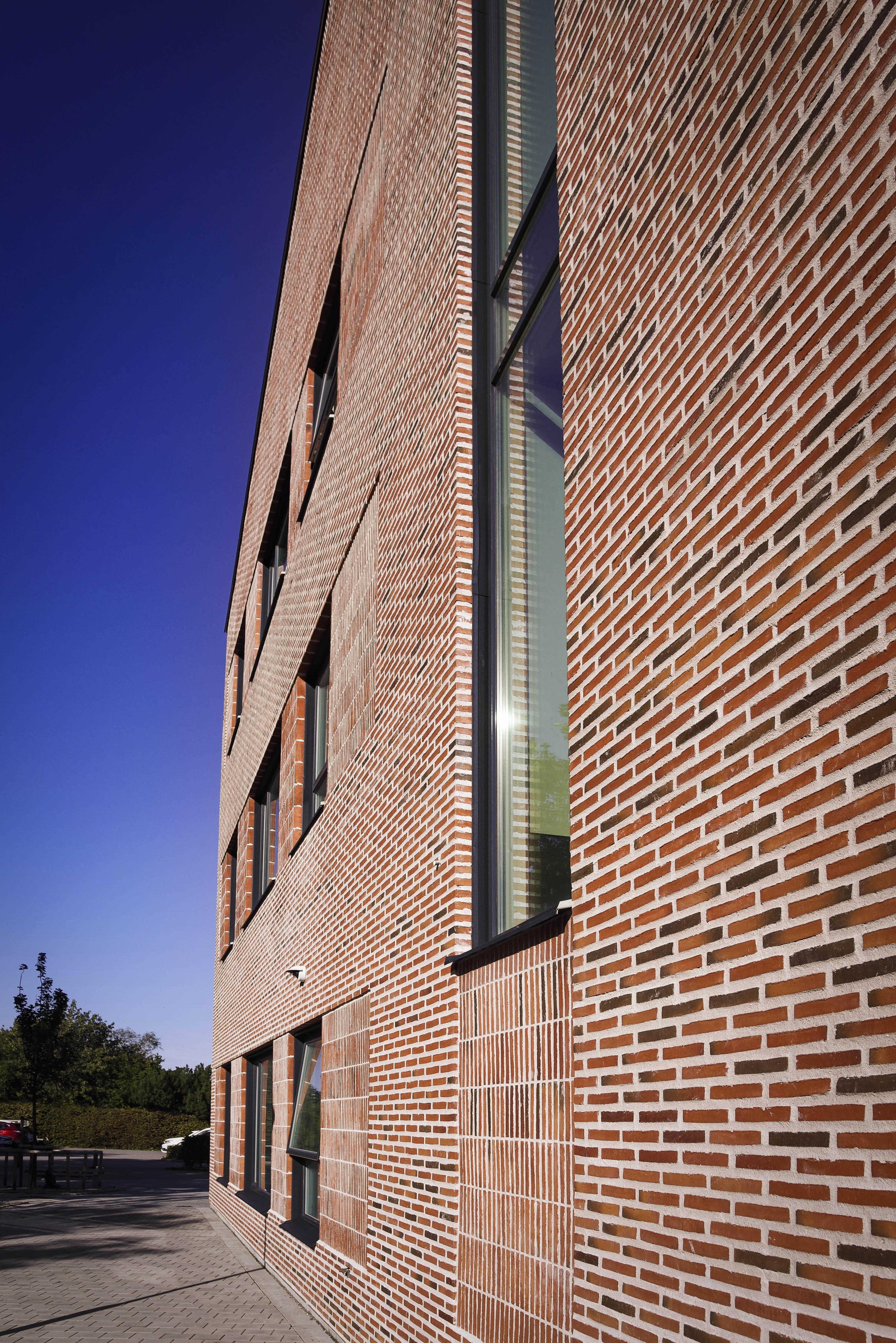 A modern campus building for the students where the special technique to apply the dark grey mortar gives an exciting expression. The glass roof accentuates the modernity.