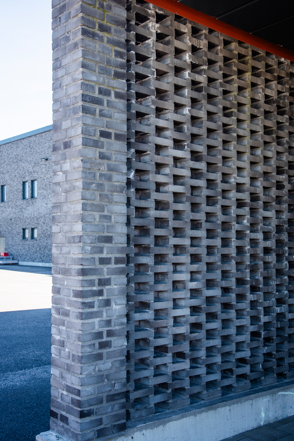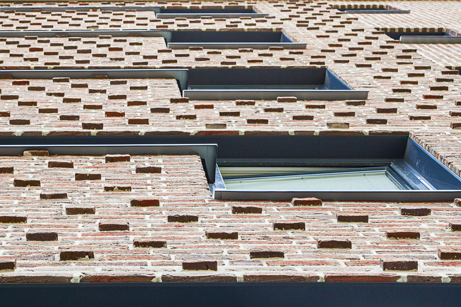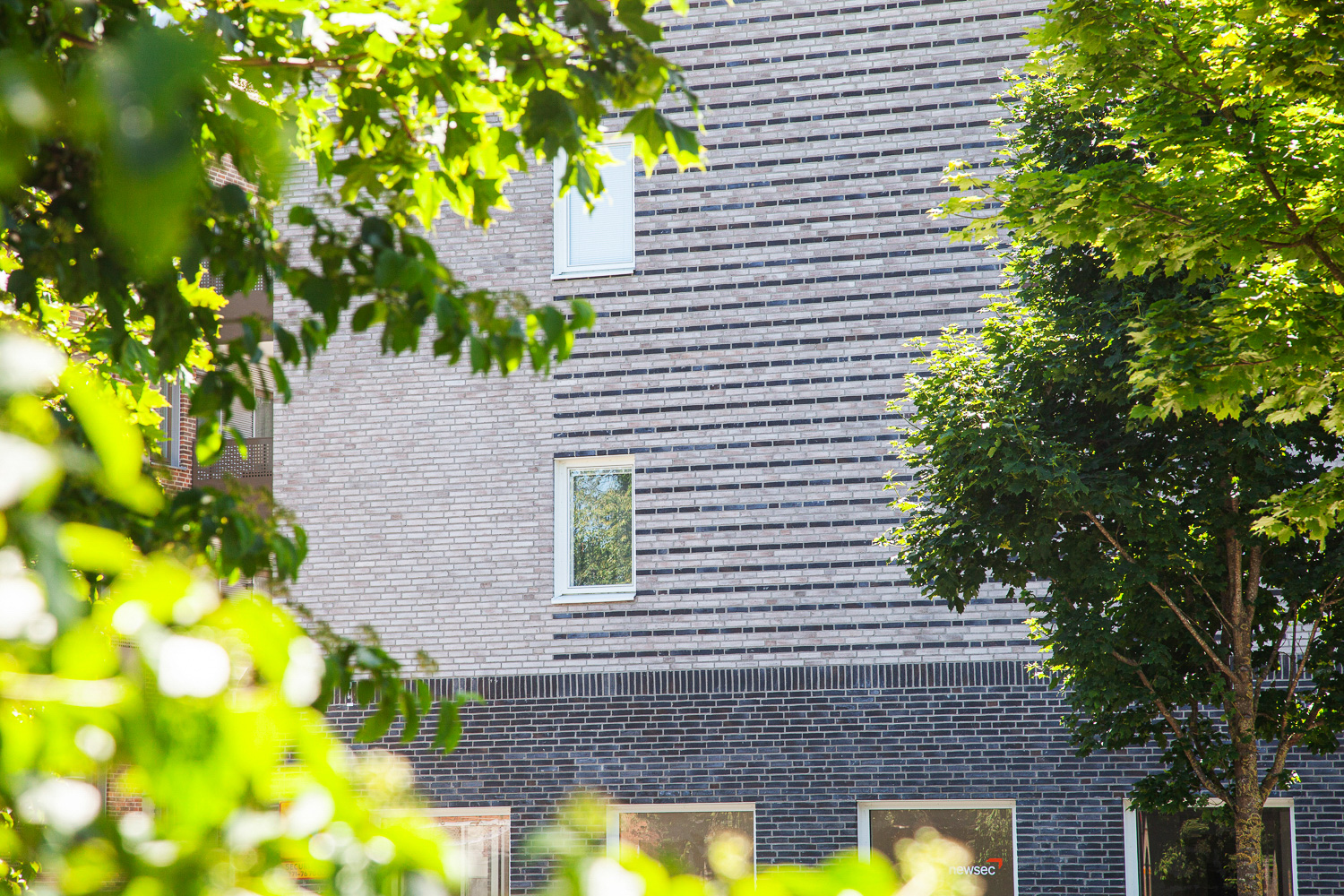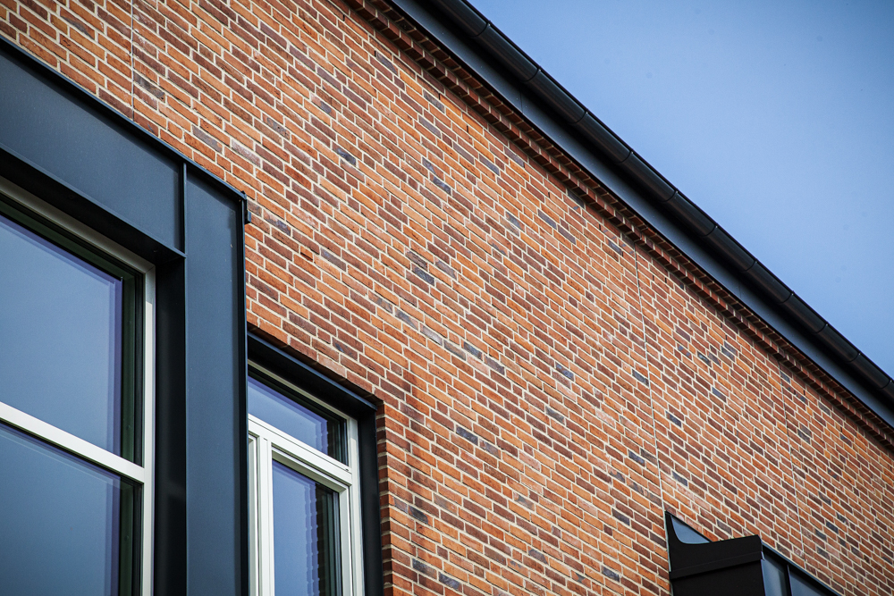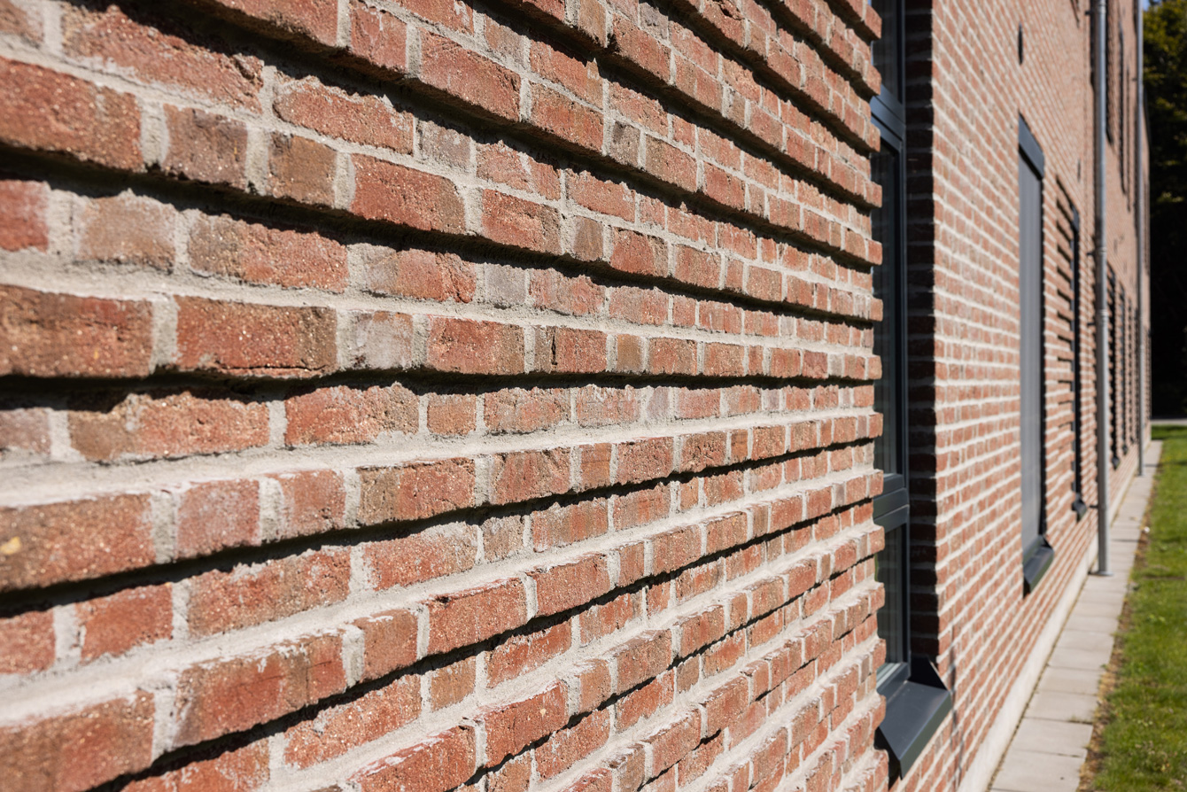 A modern campus building for the students where the special technique to apply the dark grey mortar gives an exciting expression. The glass roof accentuates the modernity.