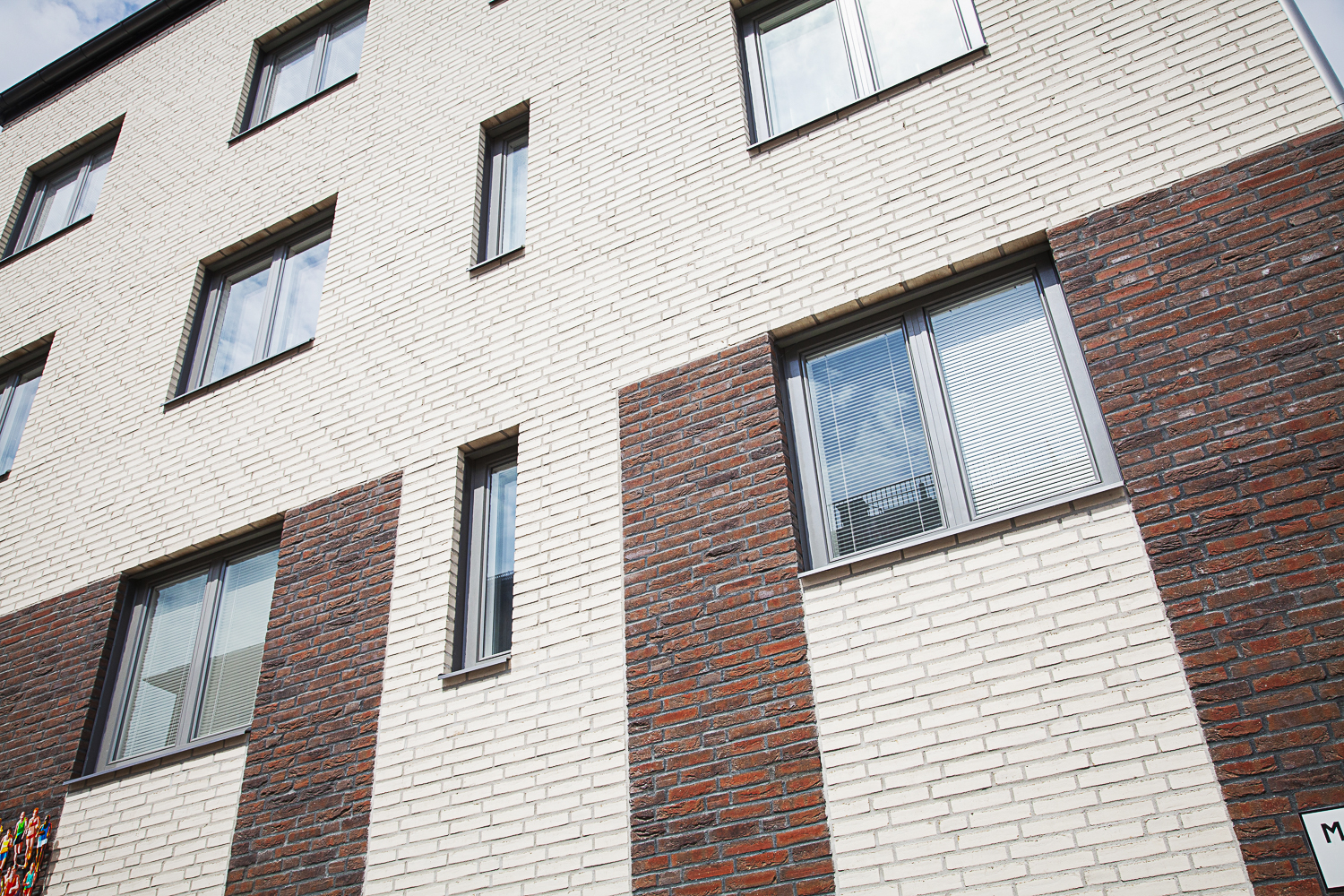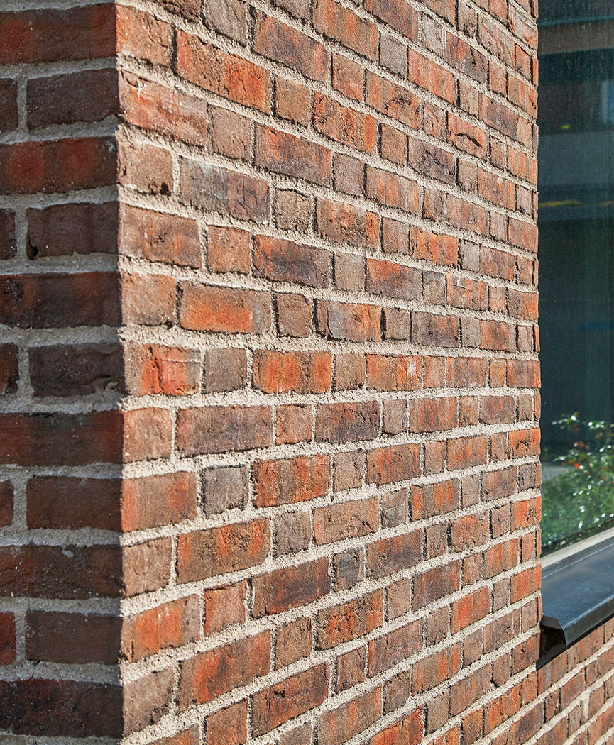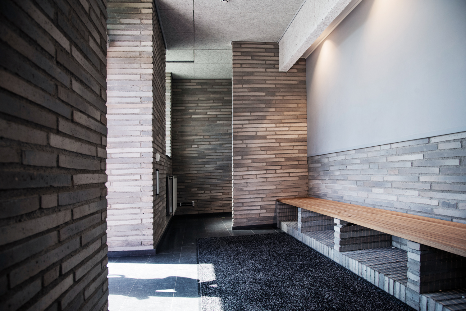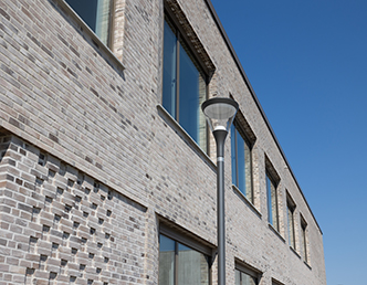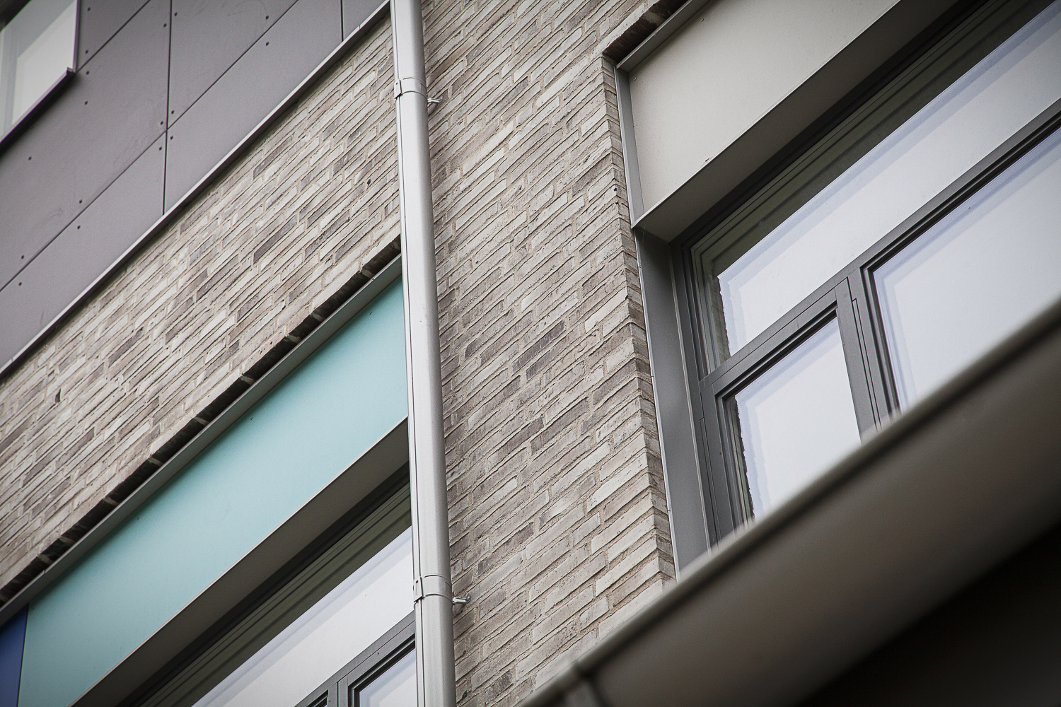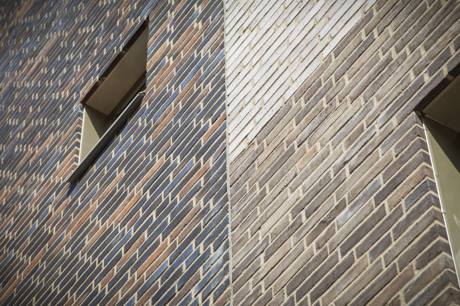 A modern campus building for the students where the special technique to apply the dark grey mortar gives an exciting expression. The glass roof accentuates the modernity.