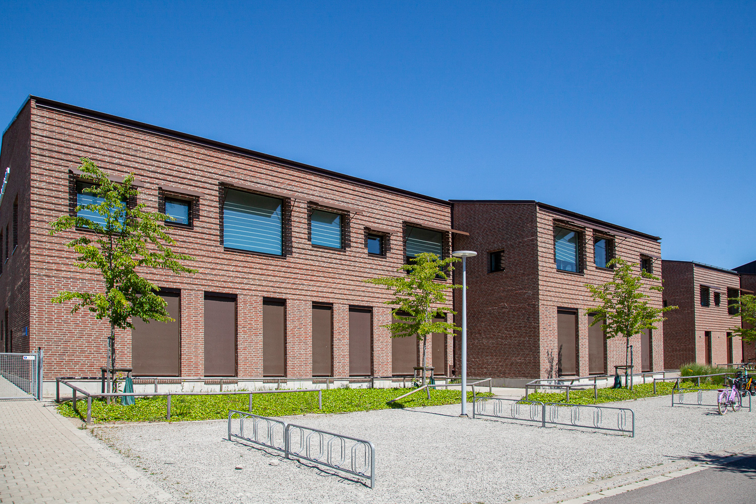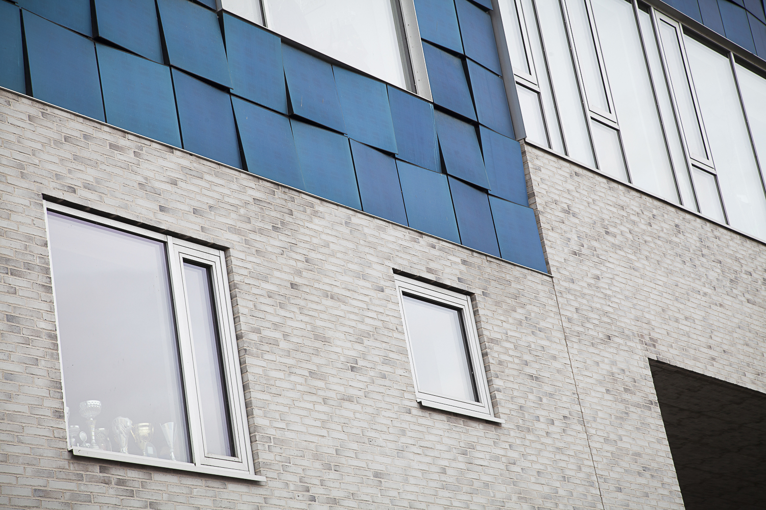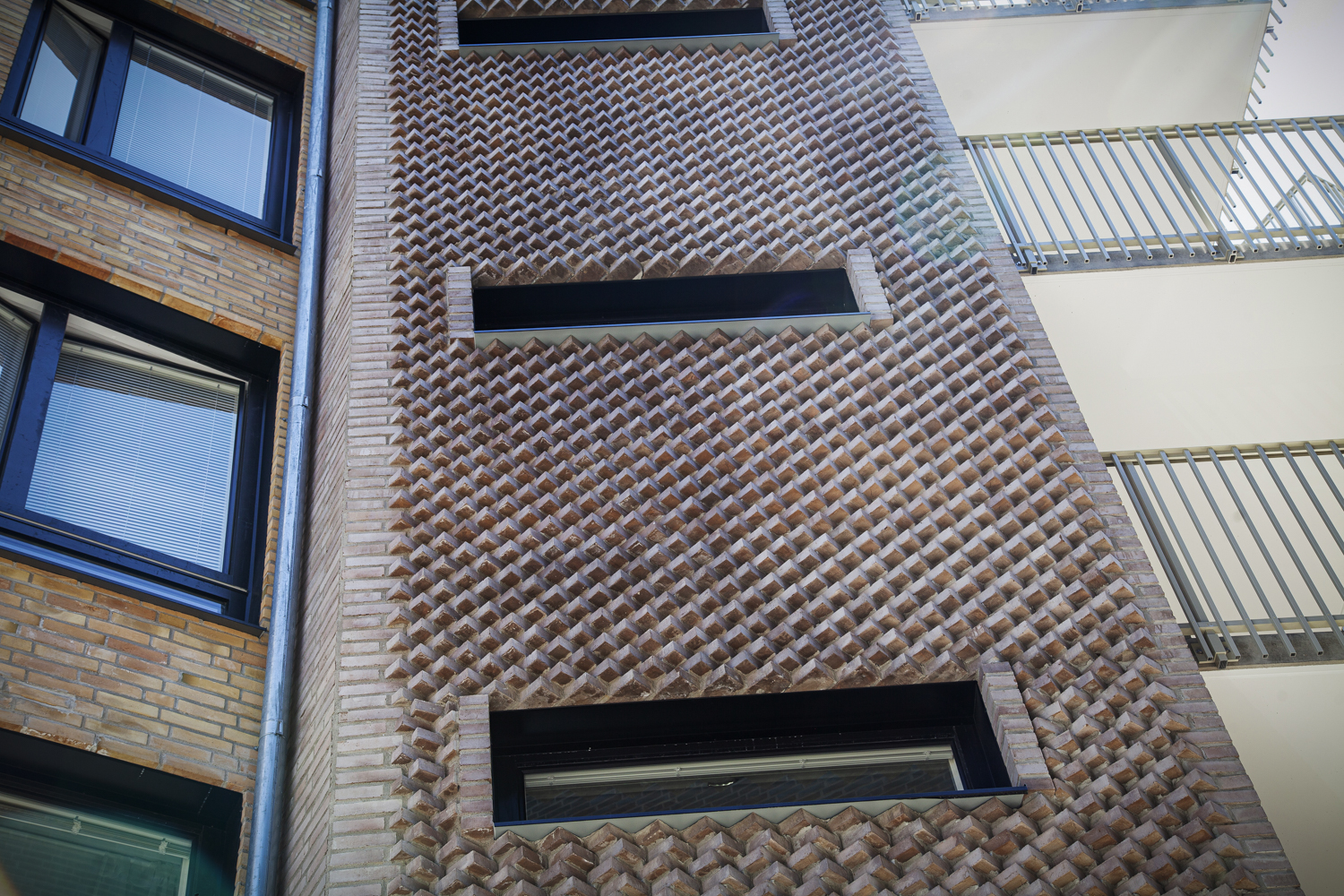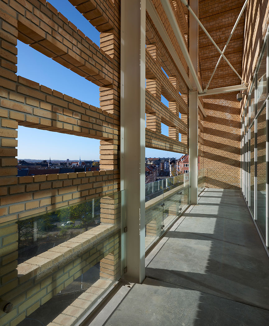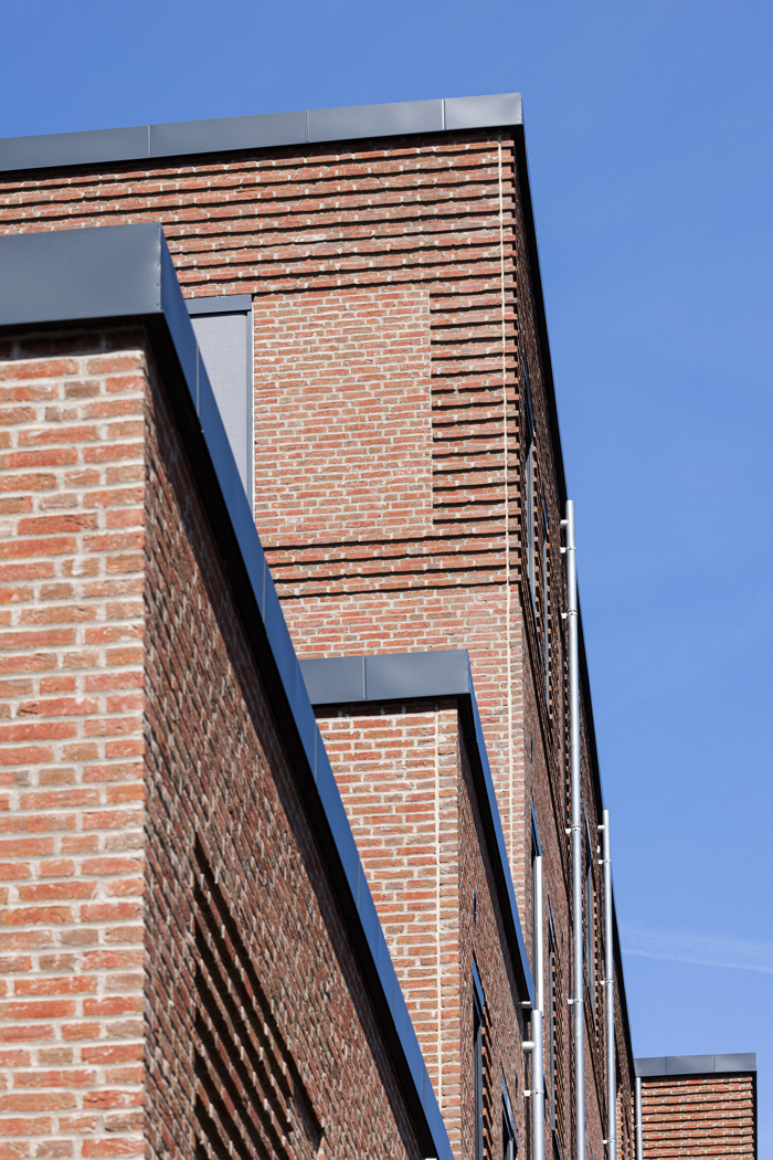 A modern campus building for the students where the special technique to apply the dark grey mortar gives an exciting expression. The glass roof accentuates the modernity.