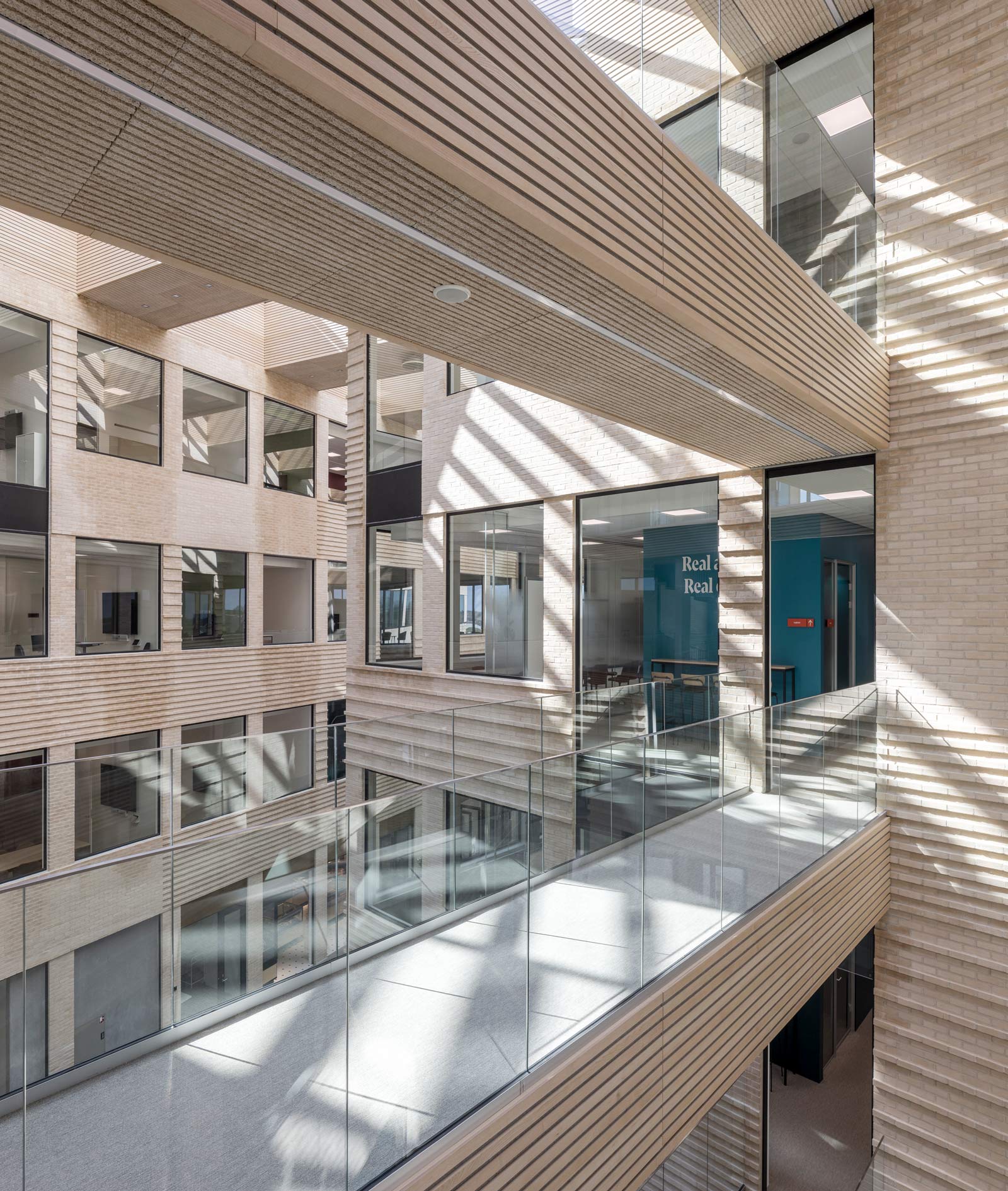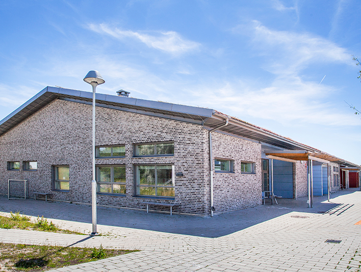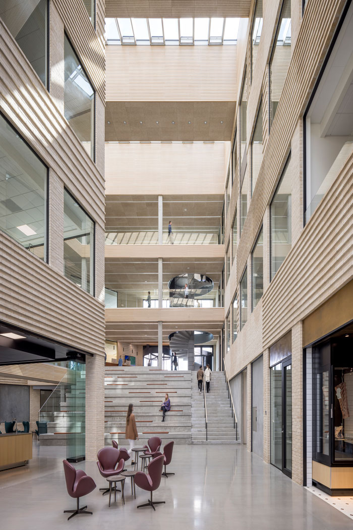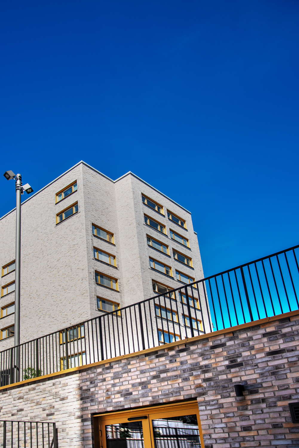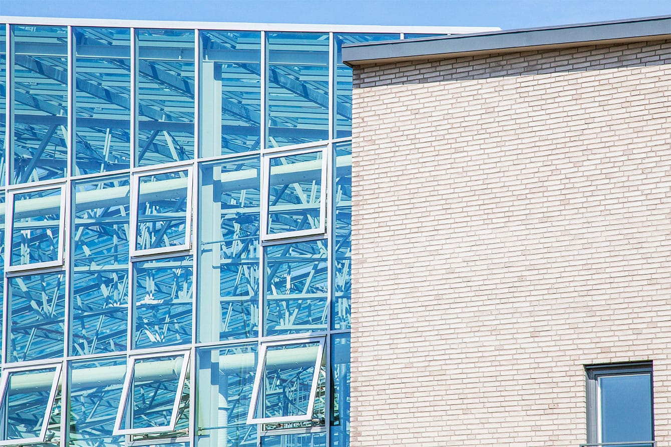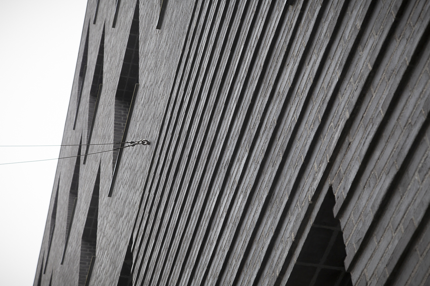 A modern campus building for the students where the special technique to apply the dark grey mortar gives an exciting expression. The glass roof accentuates the modernity.