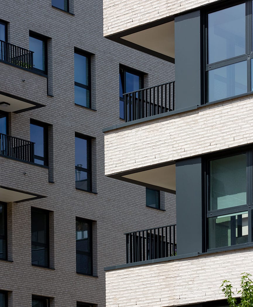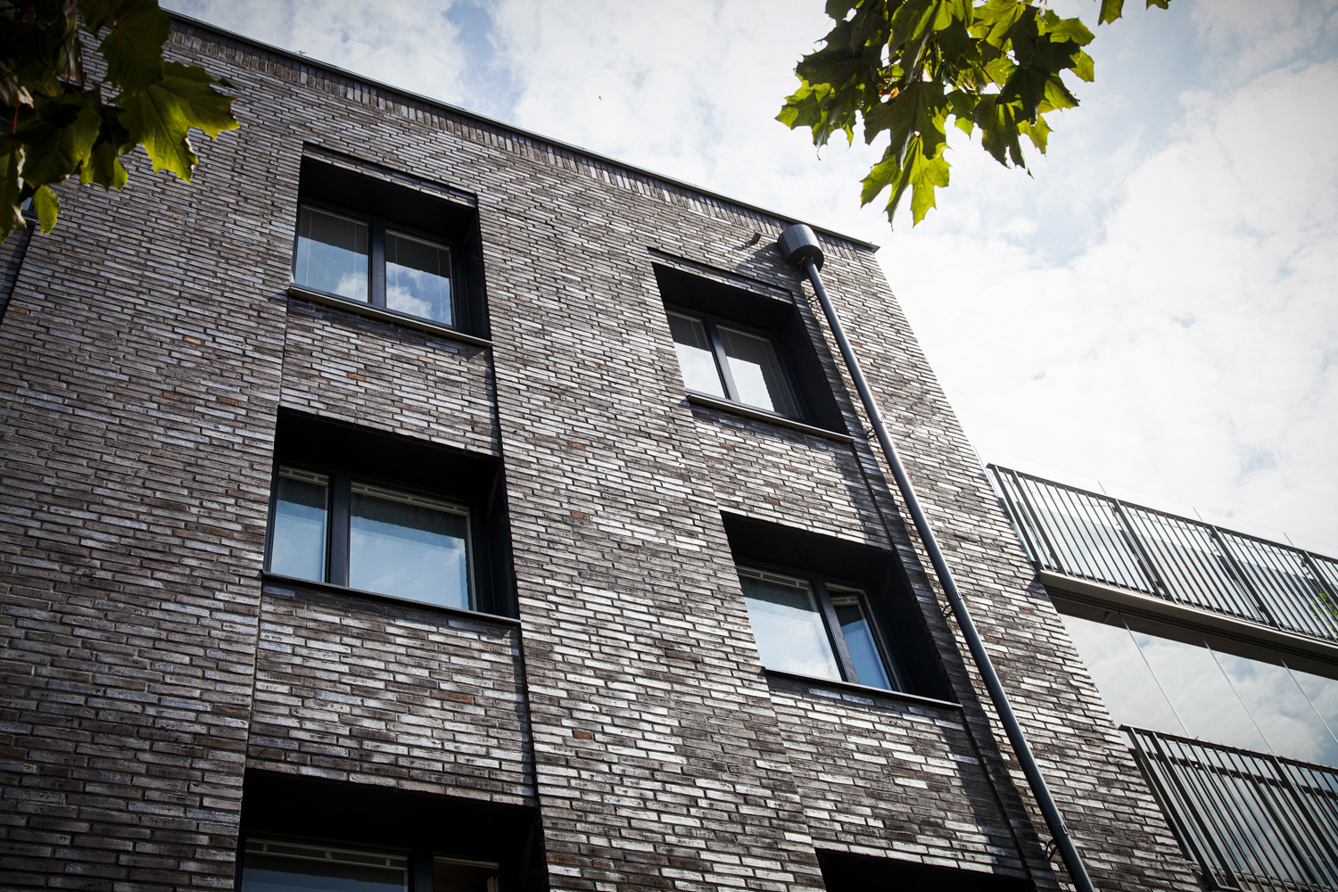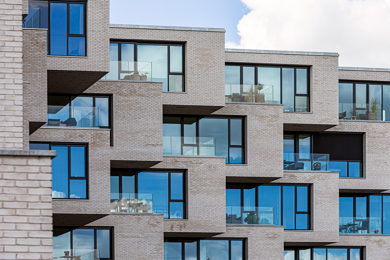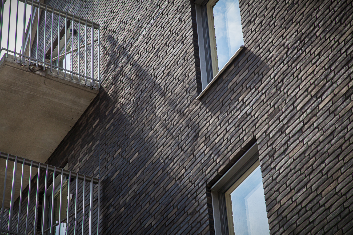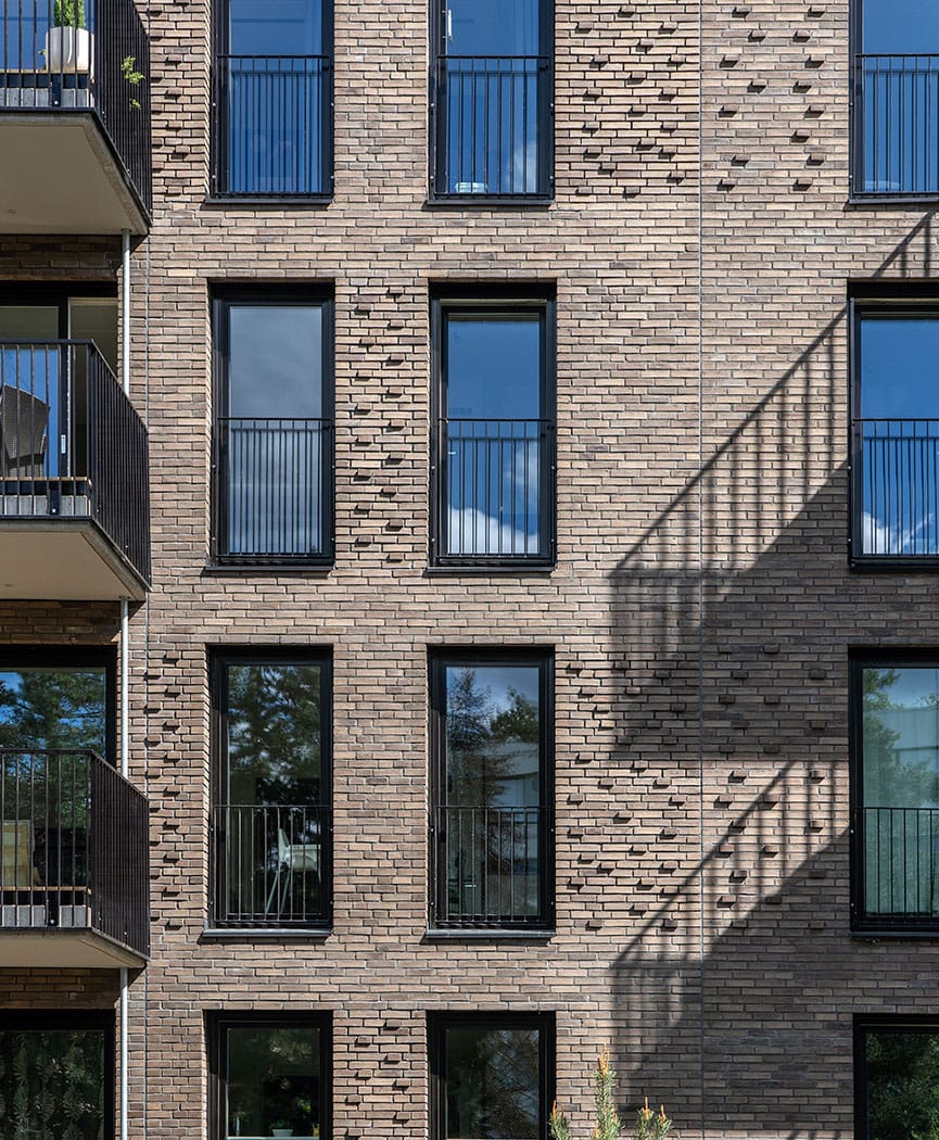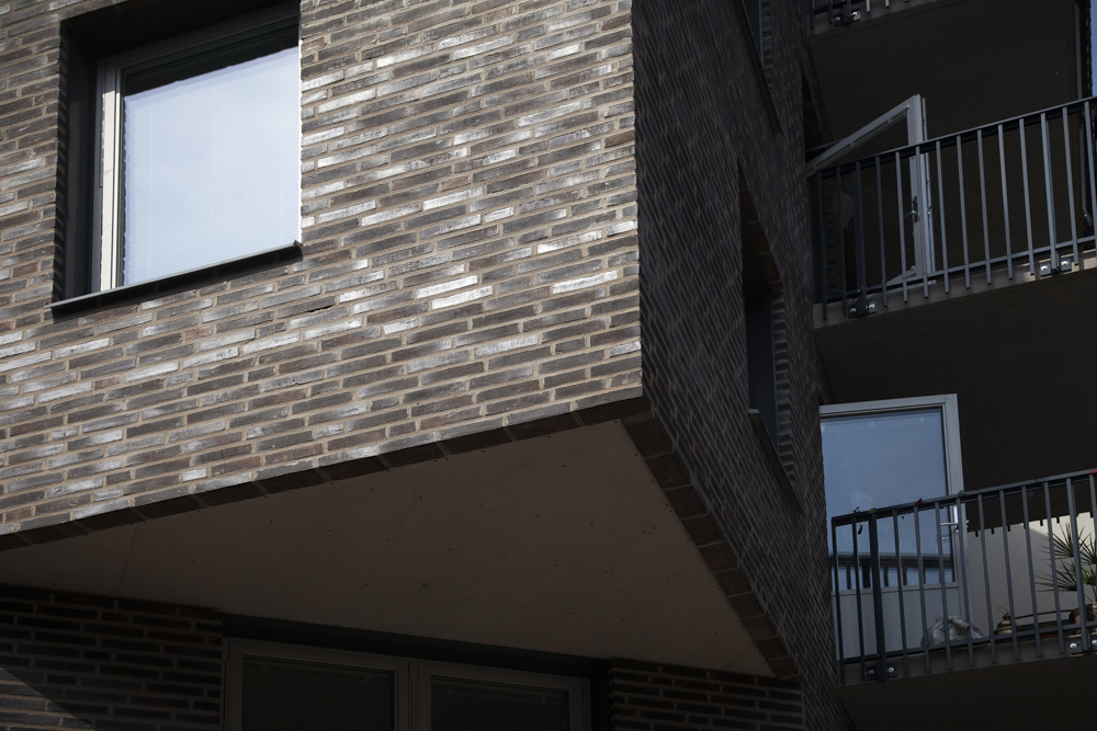 Apartments in irregular blocks combined with great craftmanship masonry and a beautiful brick colour toning in cold and warm sandy colours. Dark window frames and the minimalistic balcony rails frame a beautiful and unpretentious courtyard.