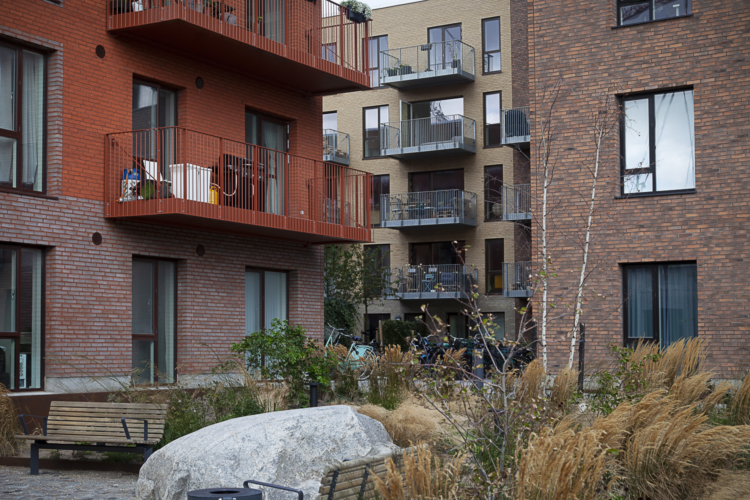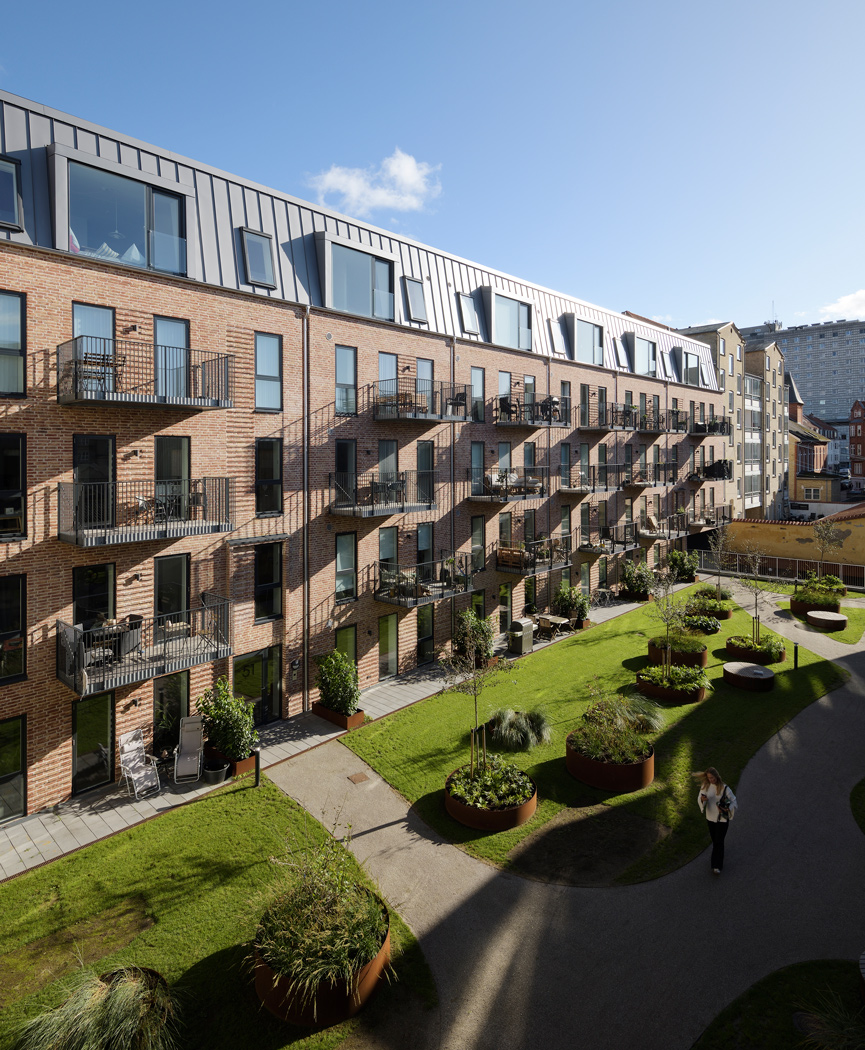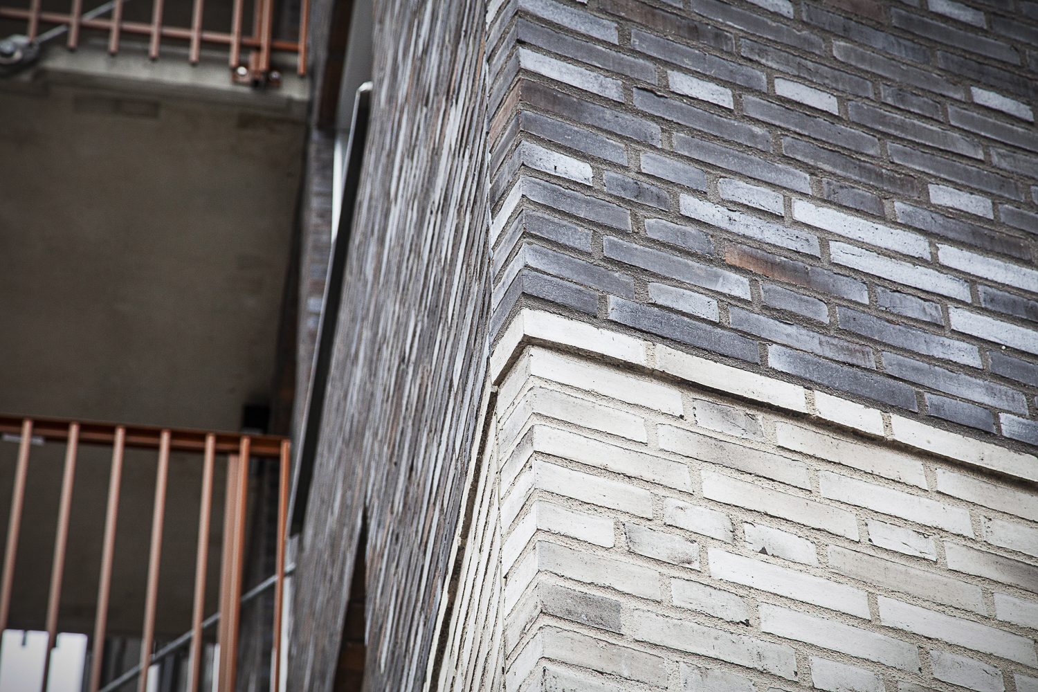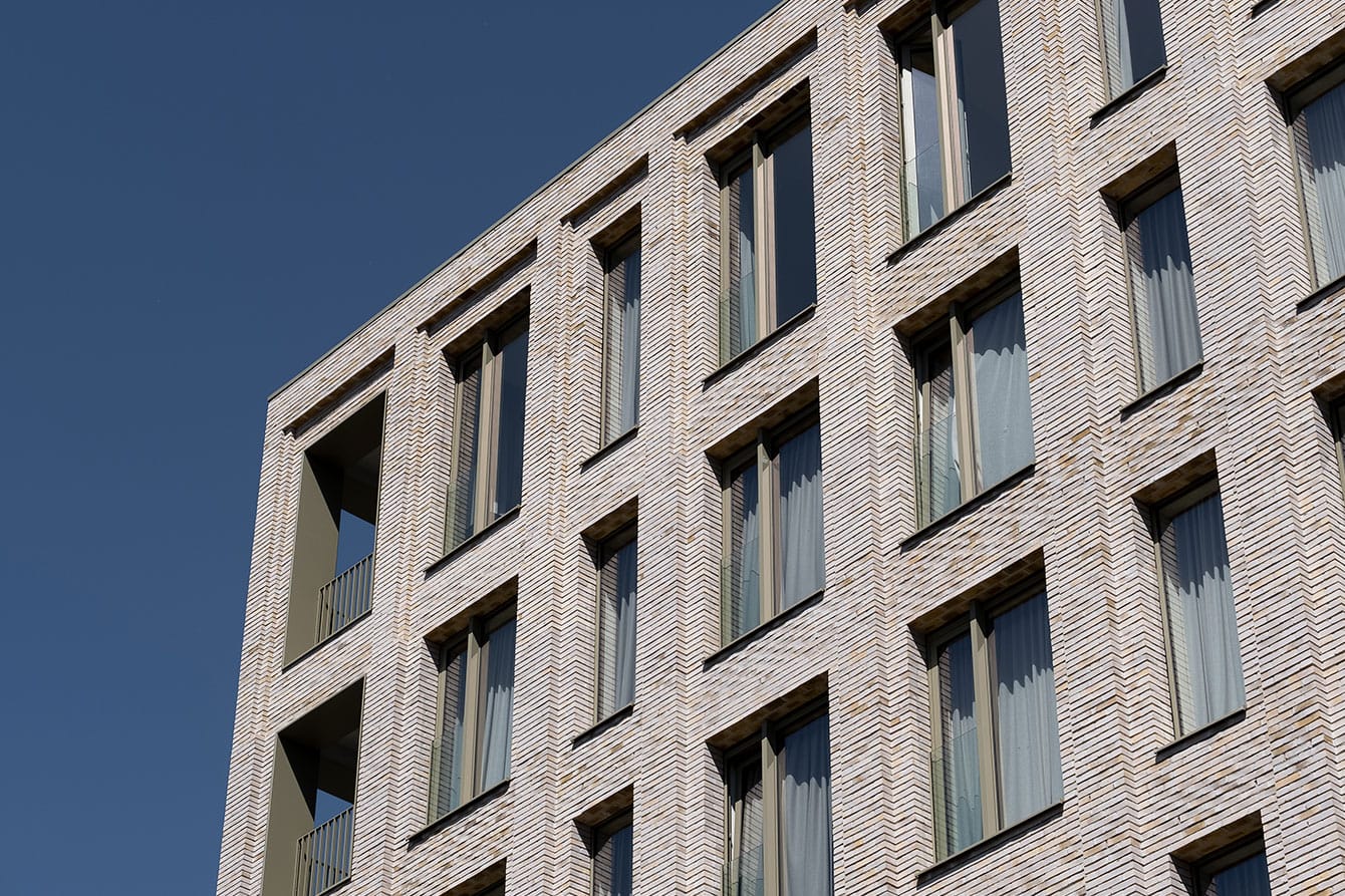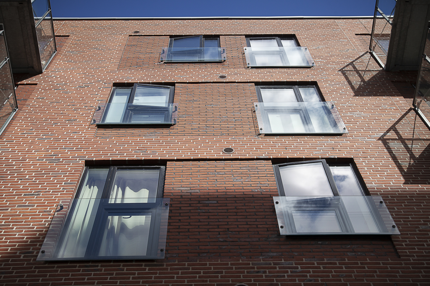 Apartments in irregular blocks combined with great craftmanship masonry and a beautiful brick colour toning in cold and warm sandy colours. Dark window frames and the minimalistic balcony rails frame a beautiful and unpretentious courtyard.