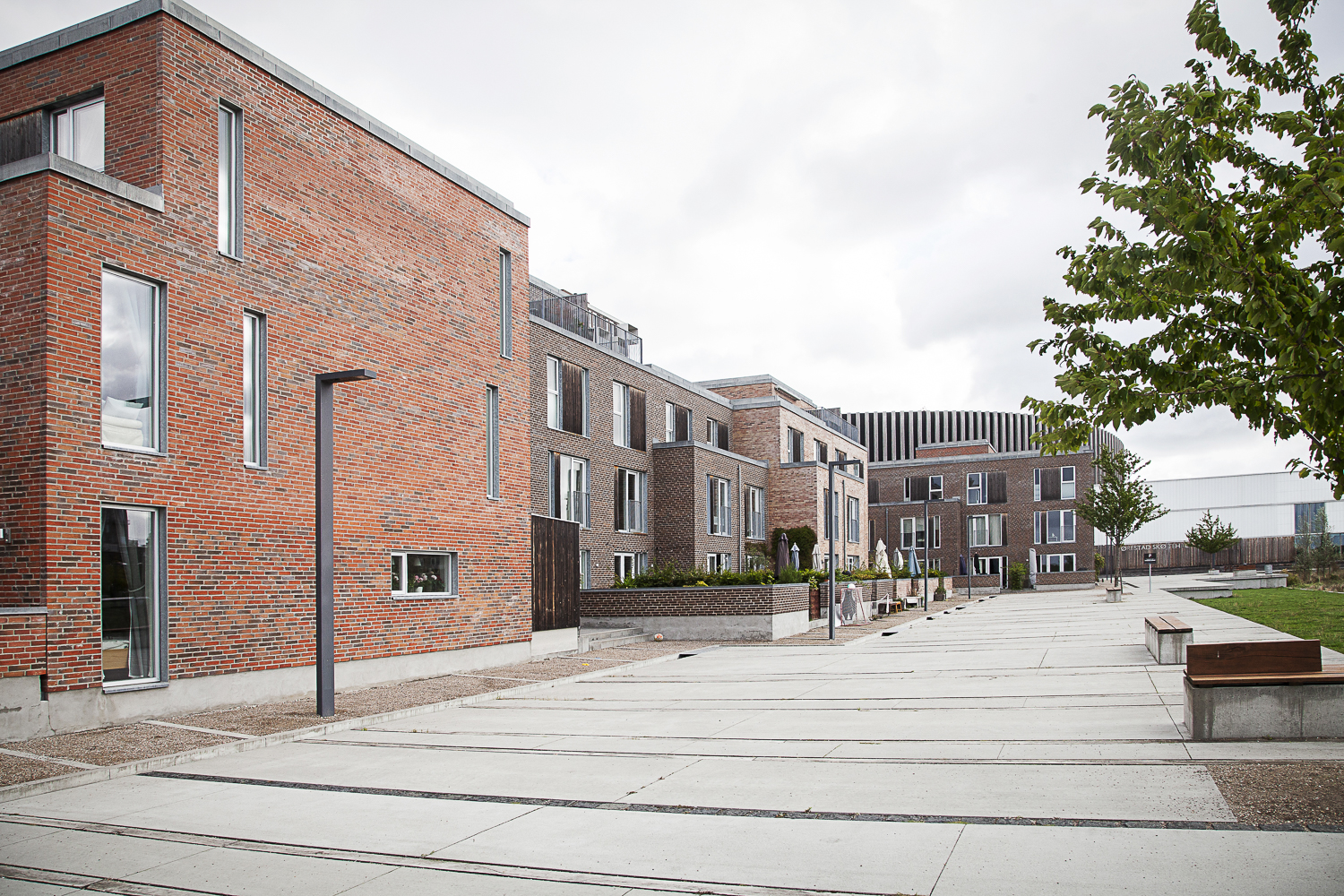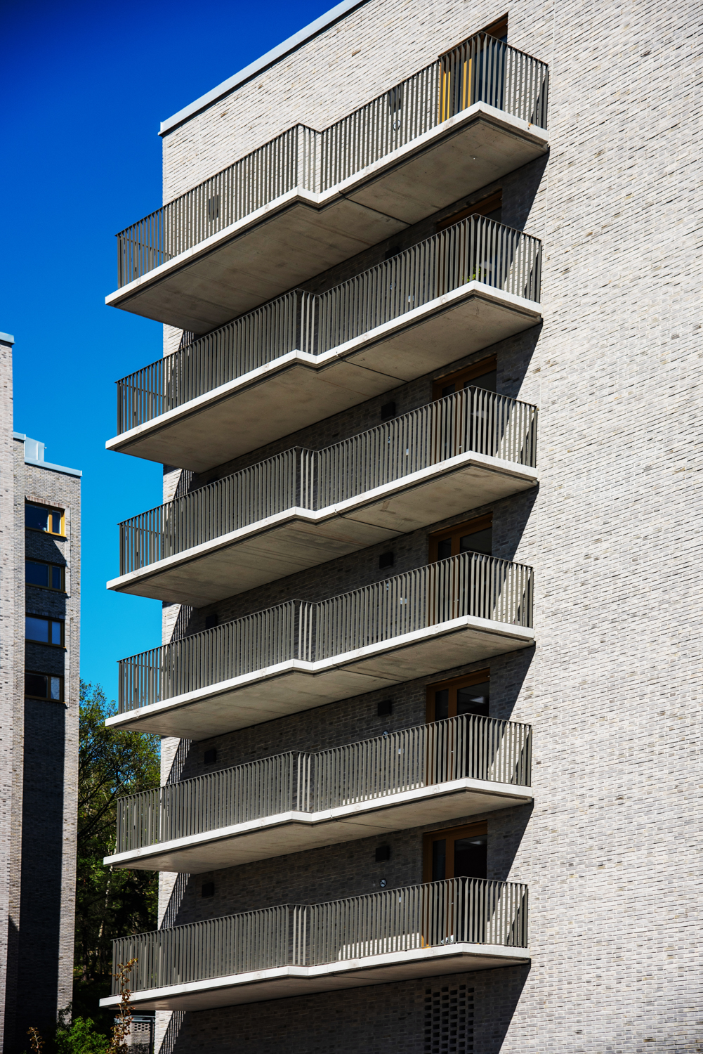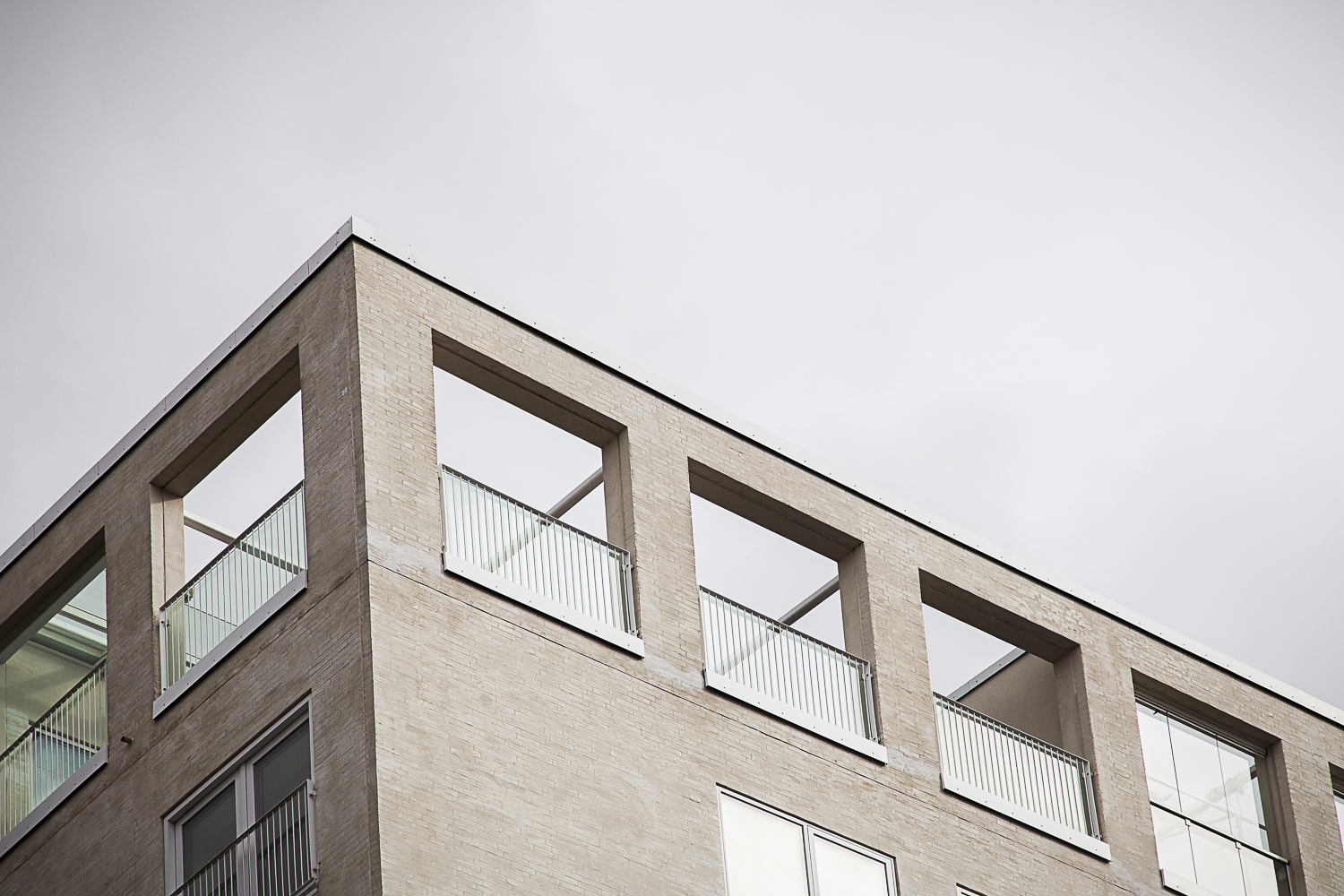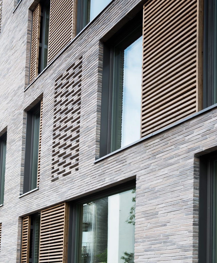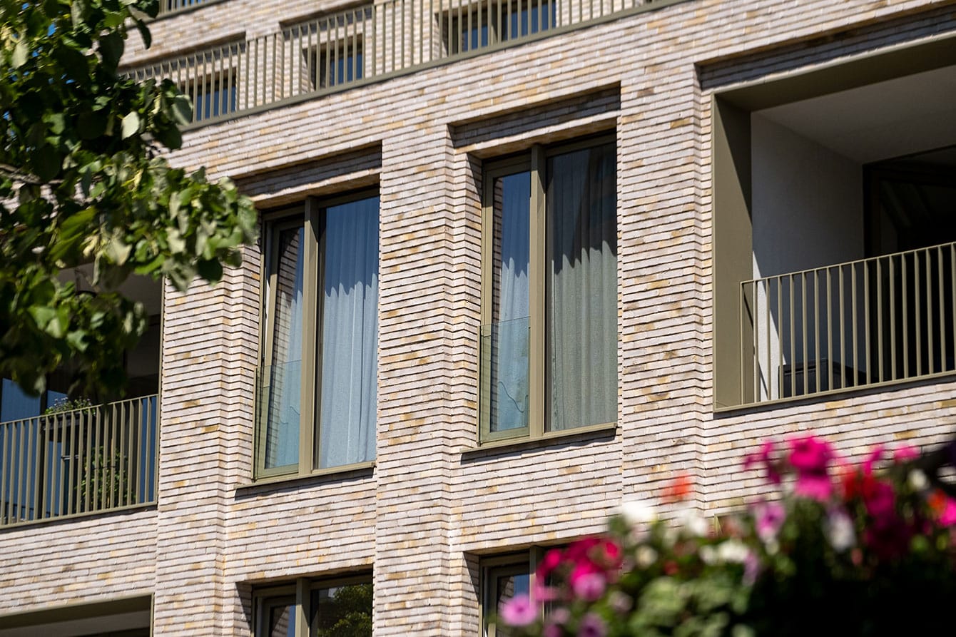 Apartments in irregular blocks combined with great craftmanship masonry and a beautiful brick colour toning in cold and warm sandy colours. Dark window frames and the minimalistic balcony rails frame a beautiful and unpretentious courtyard.