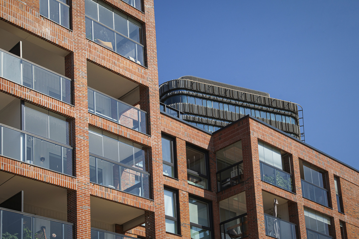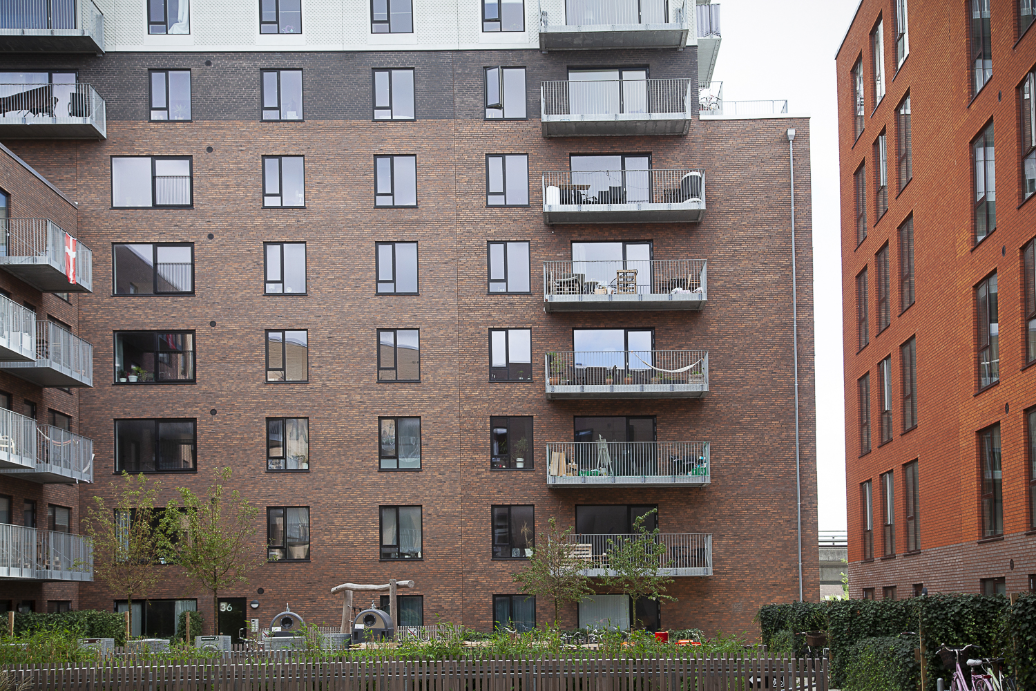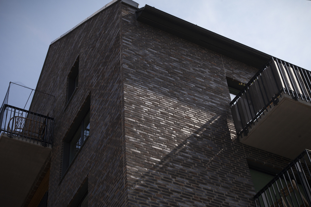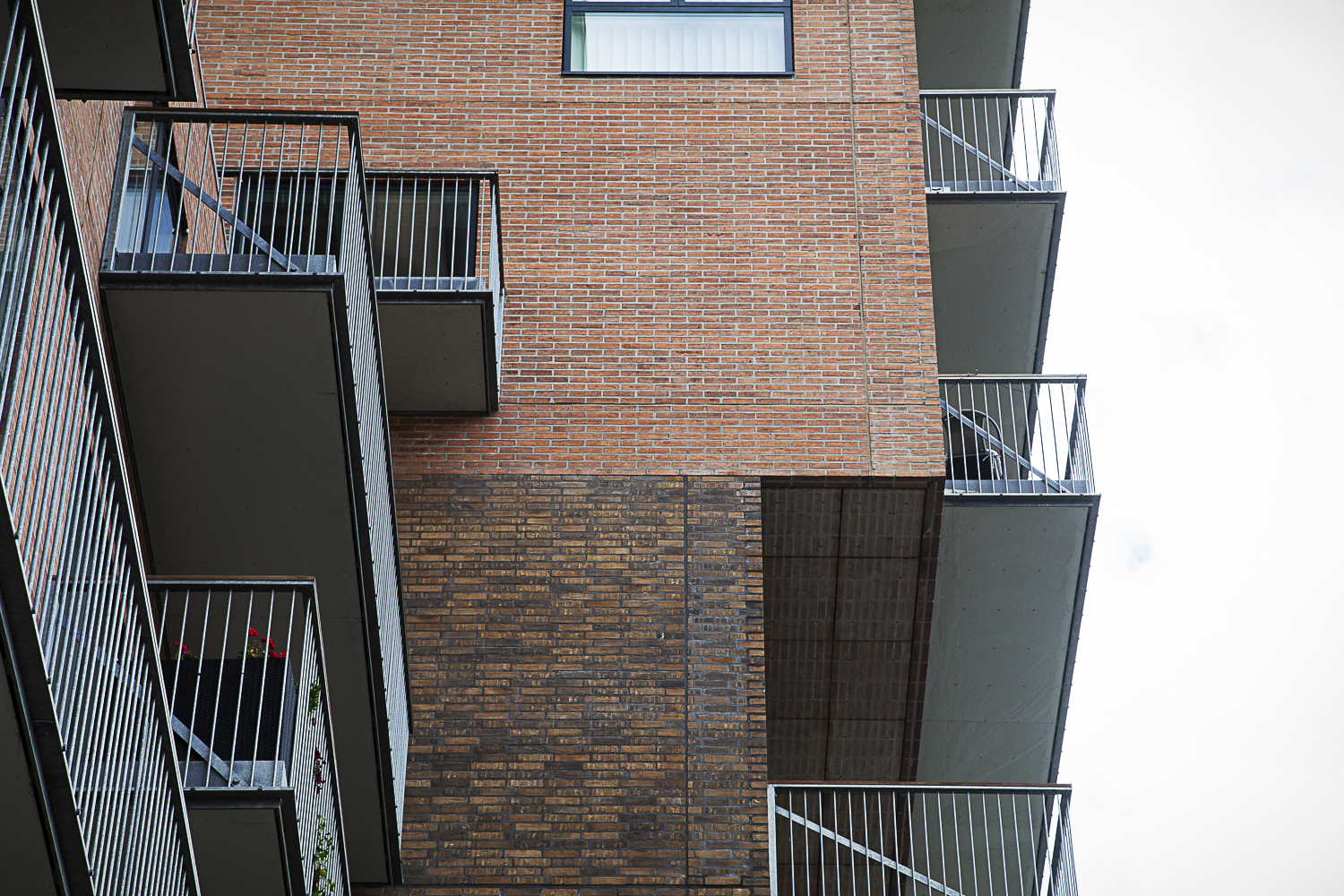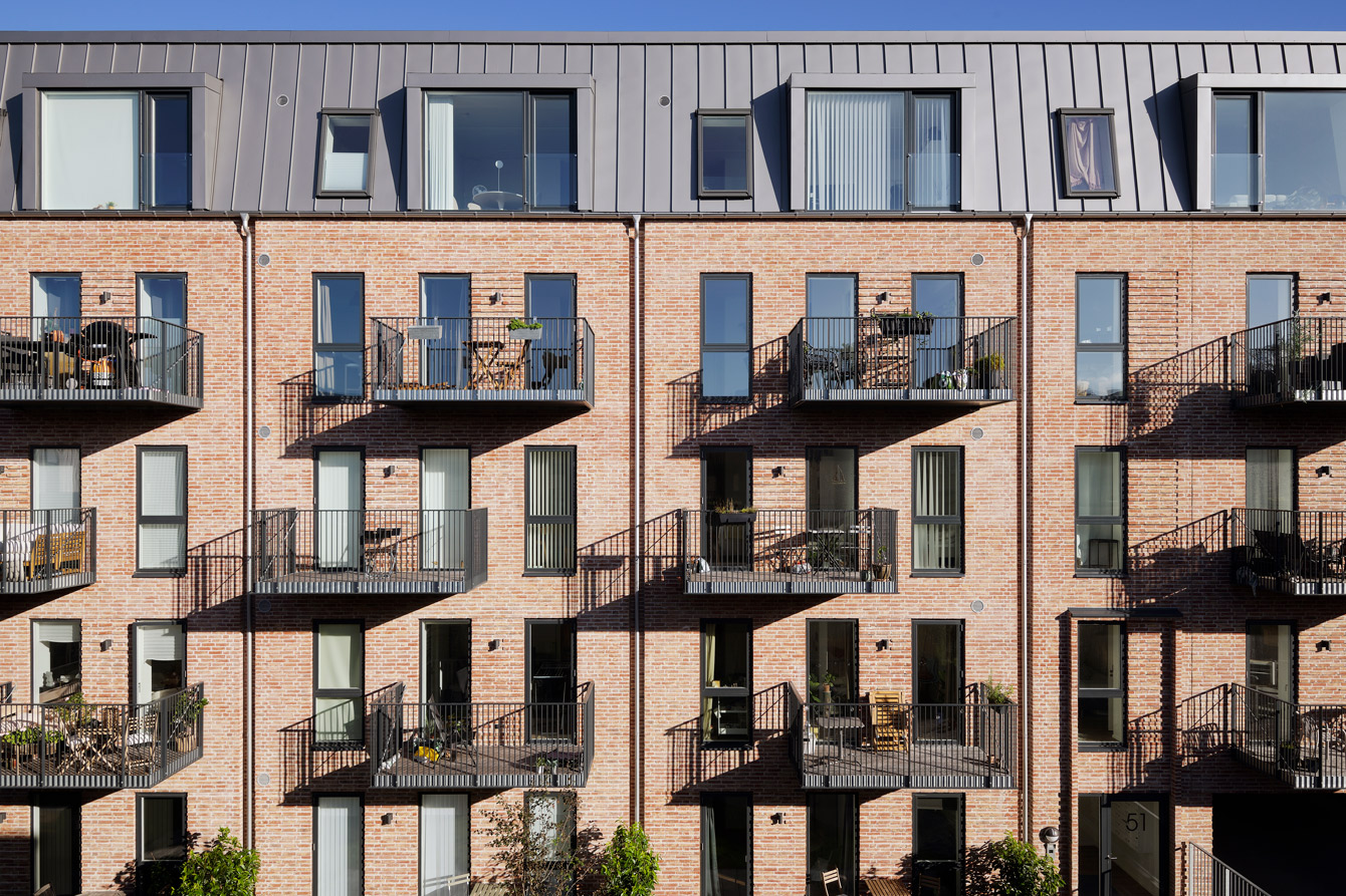 Apartments in irregular blocks combined with great craftmanship masonry and a beautiful brick colour toning in cold and warm sandy colours. Dark window frames and the minimalistic balcony rails frame a beautiful and unpretentious courtyard.