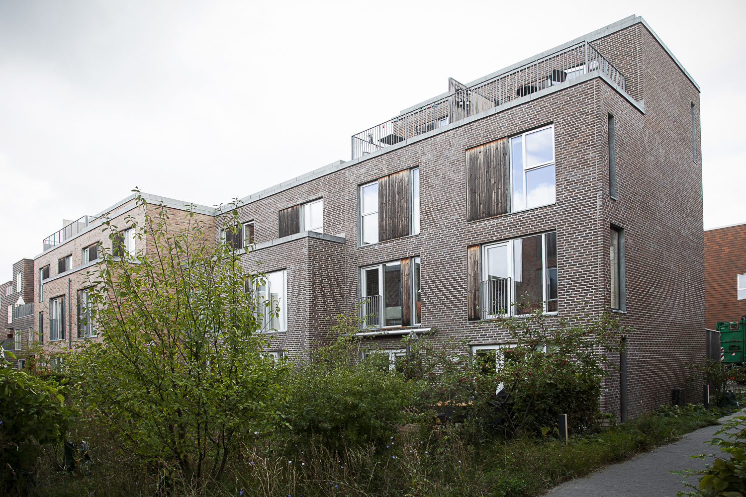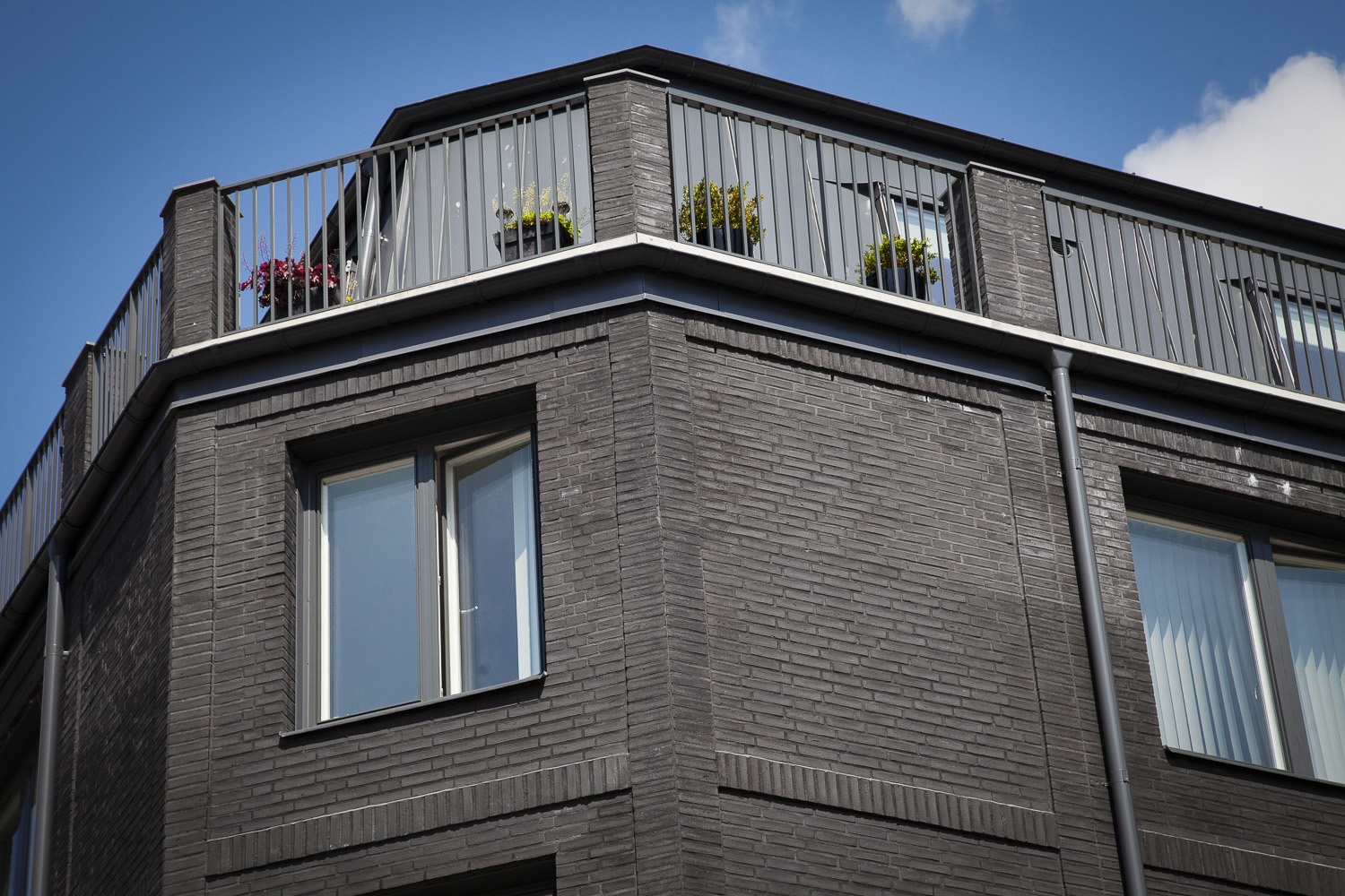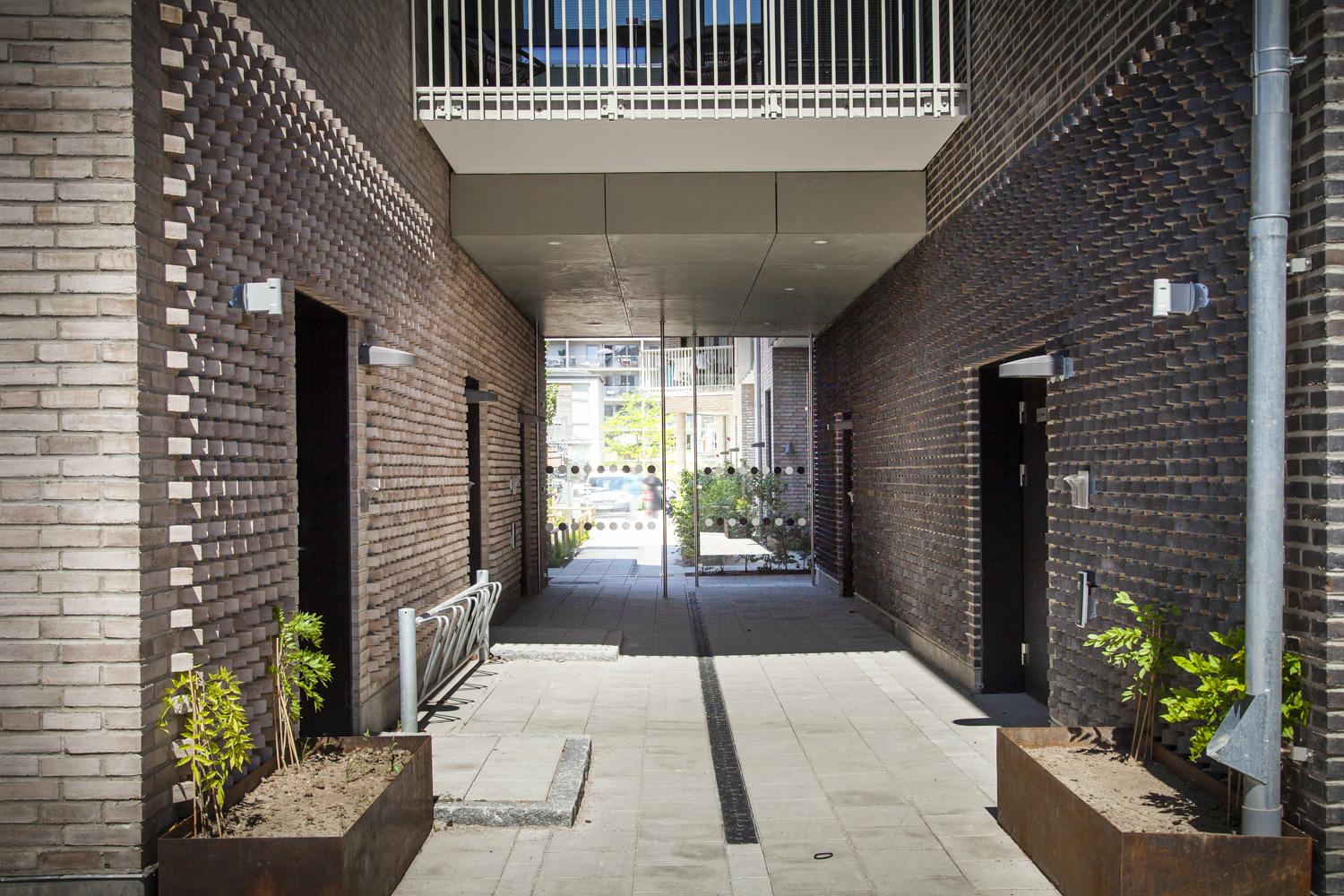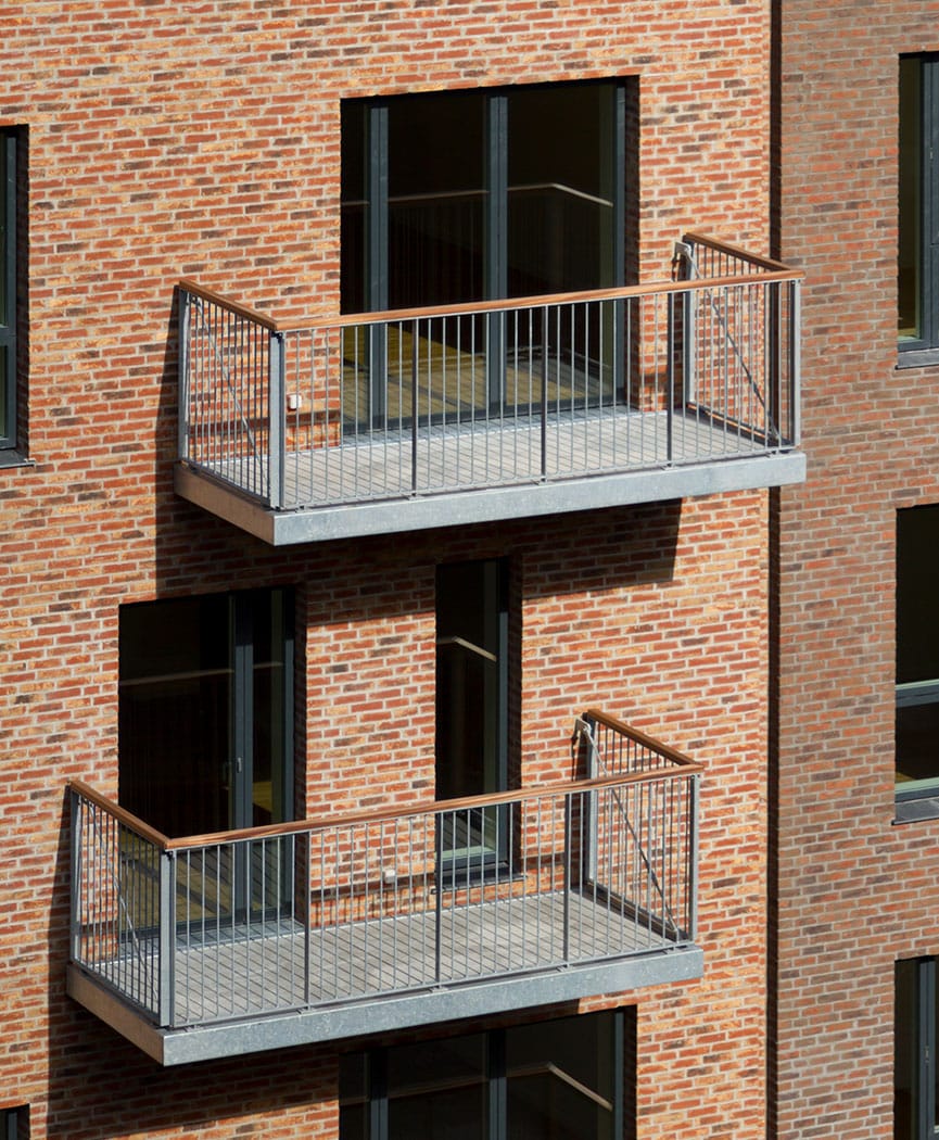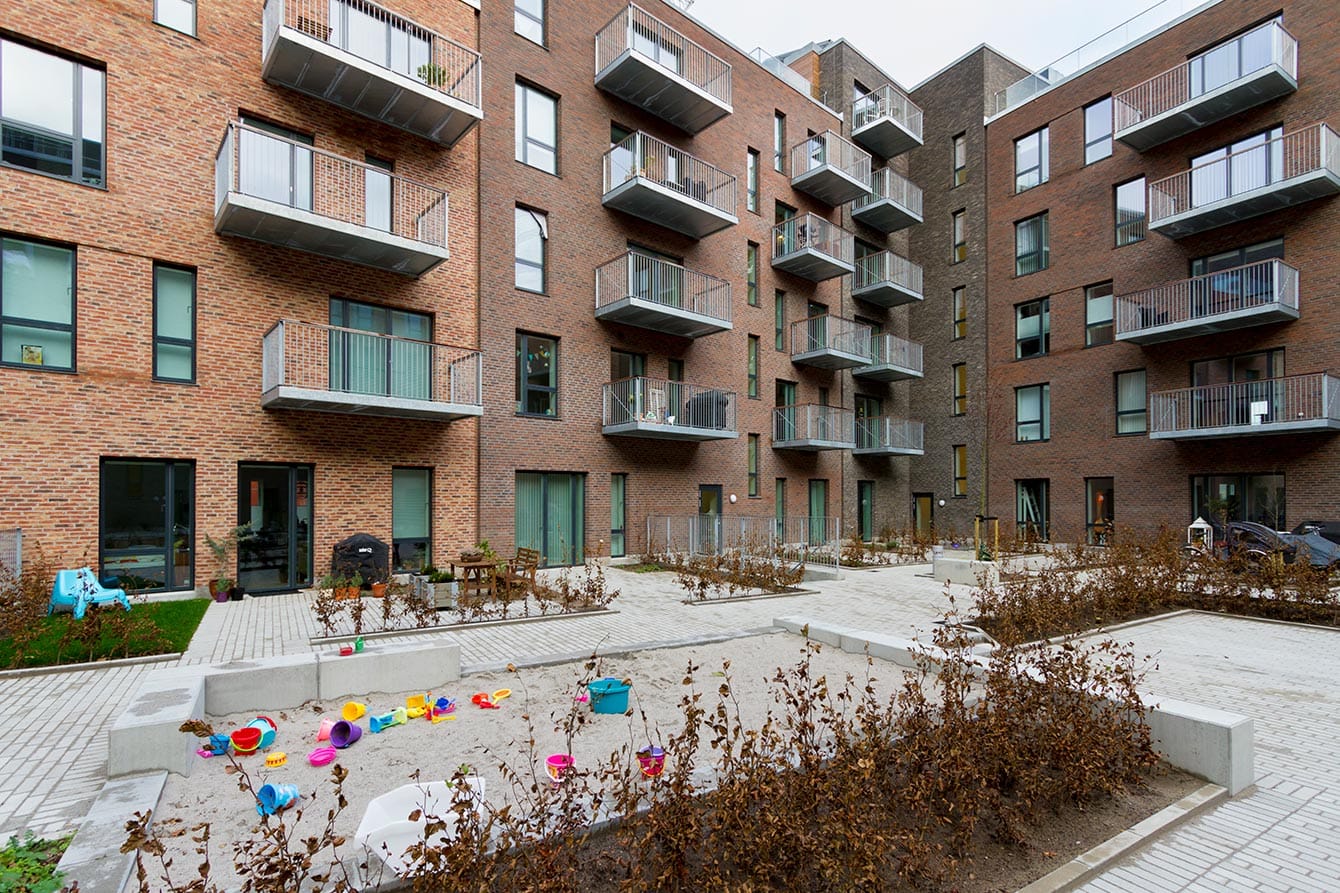 Apartments in irregular blocks combined with great craftmanship masonry and a beautiful brick colour toning in cold and warm sandy colours. Dark window frames and the minimalistic balcony rails frame a beautiful and unpretentious courtyard.