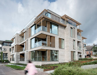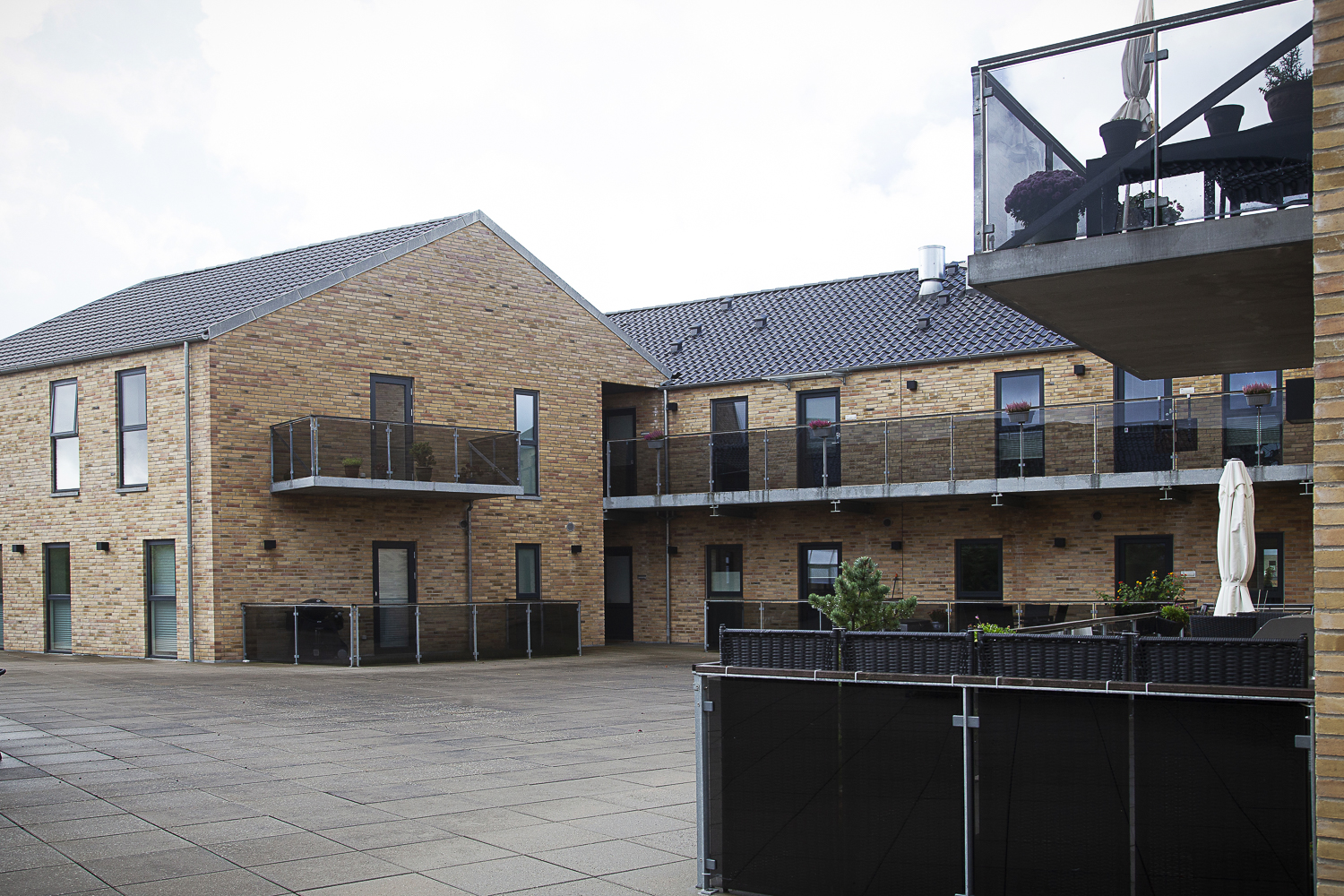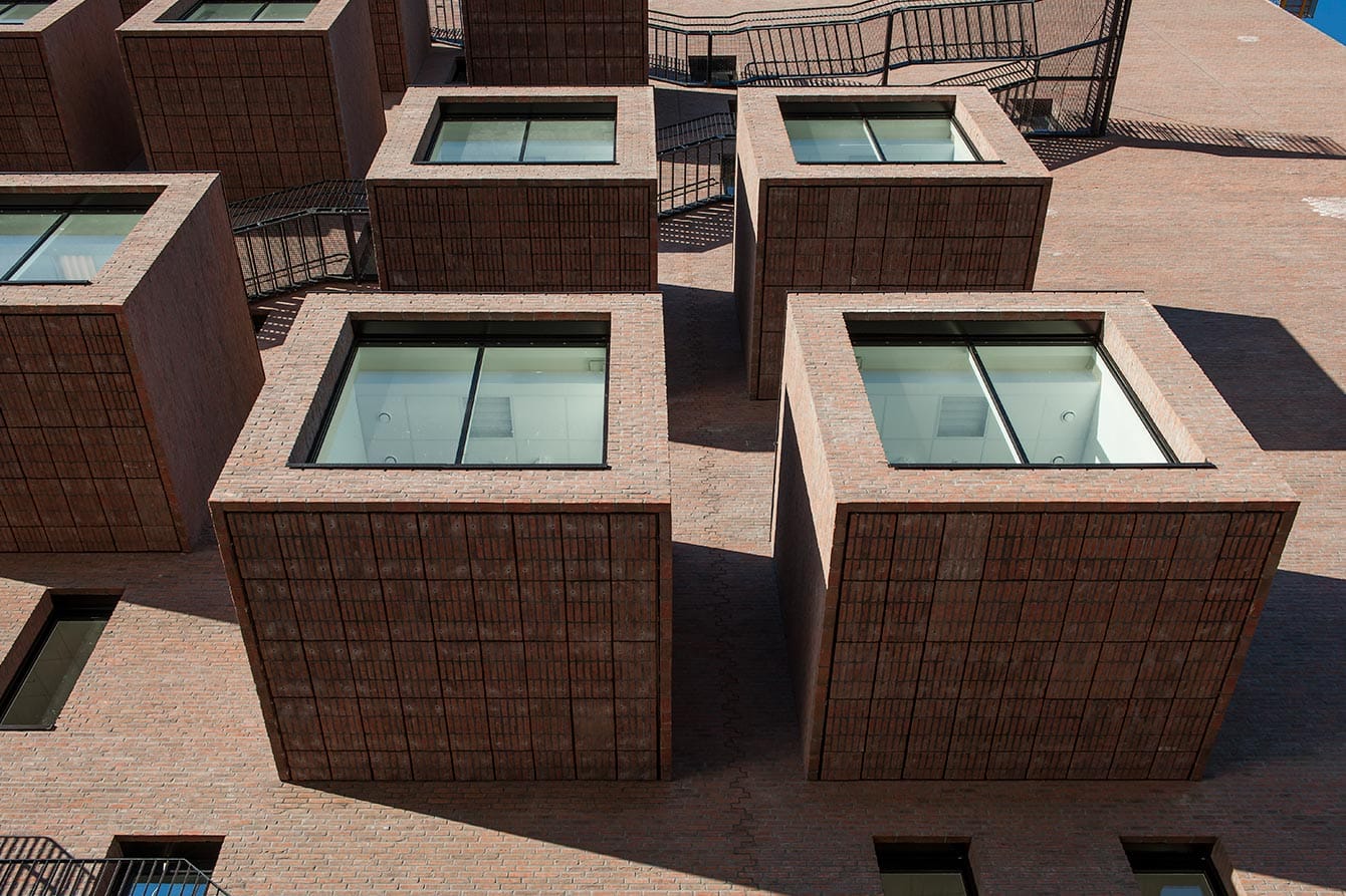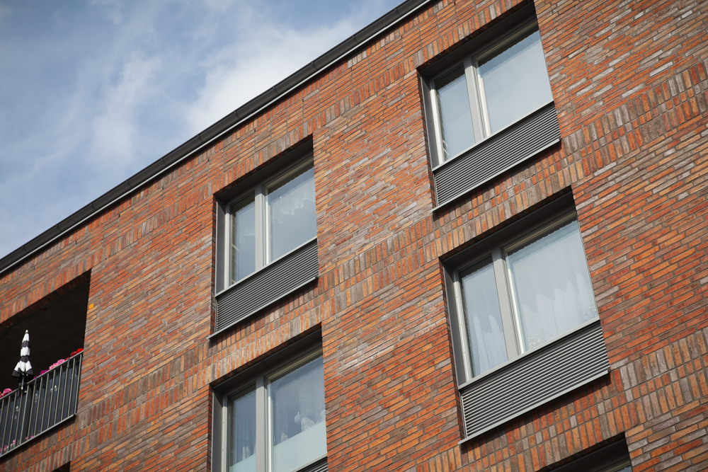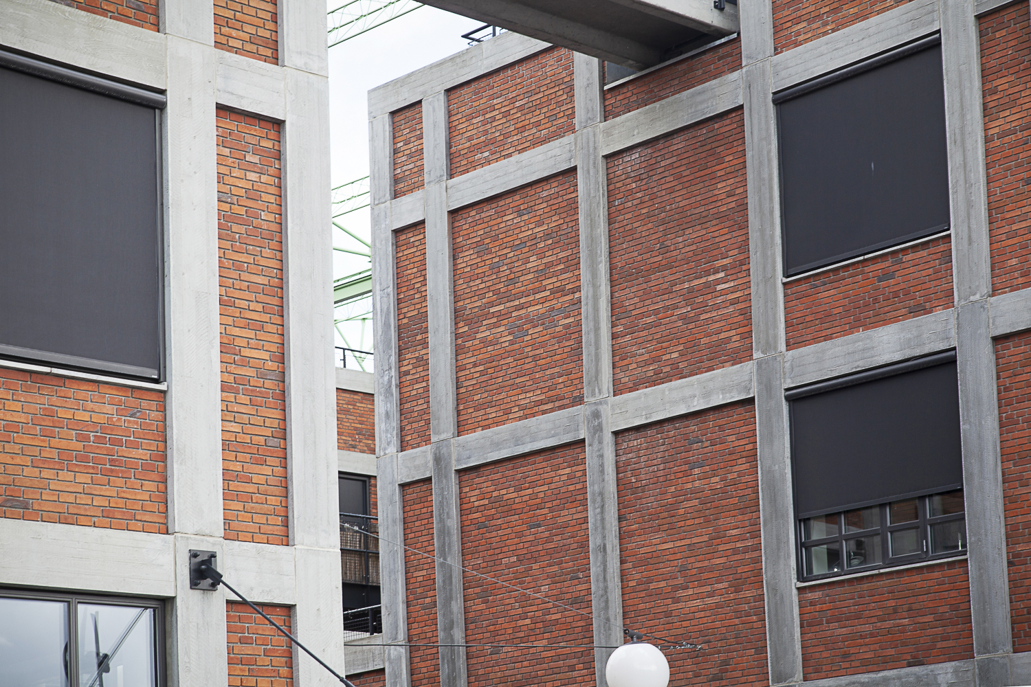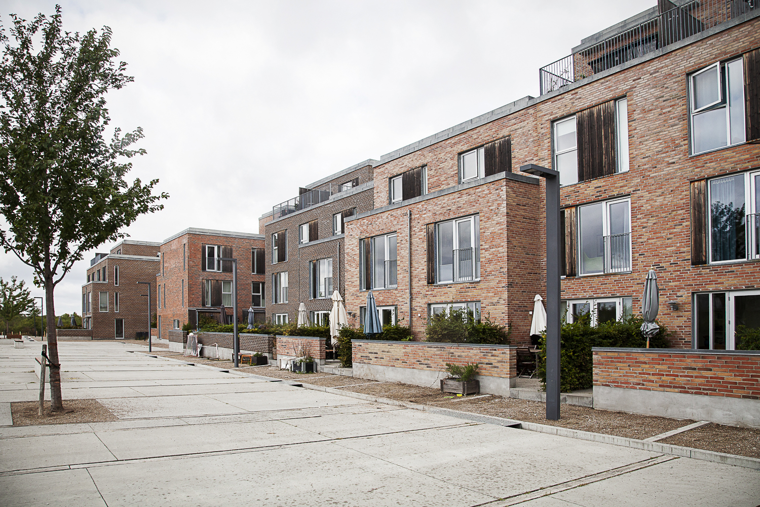 Apartments in irregular blocks combined with great craftmanship masonry and a beautiful brick colour toning in cold and warm sandy colours. Dark window frames and the minimalistic balcony rails frame a beautiful and unpretentious courtyard.