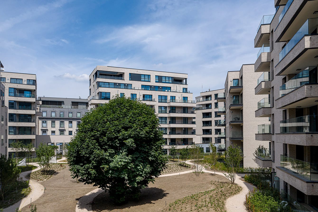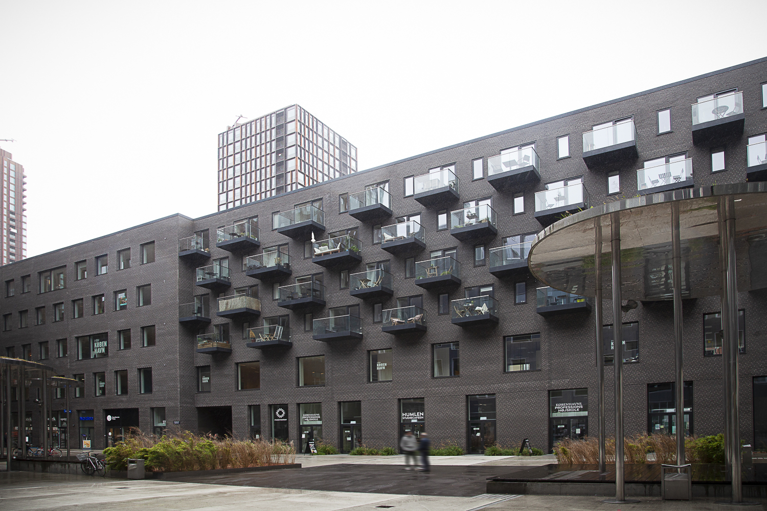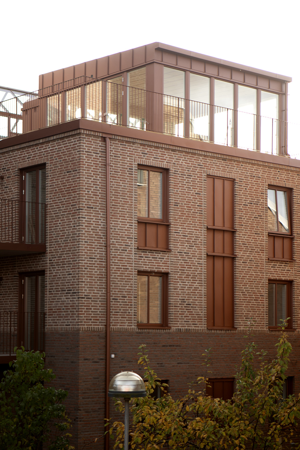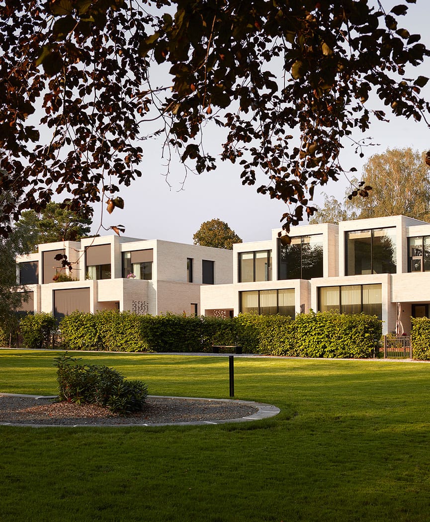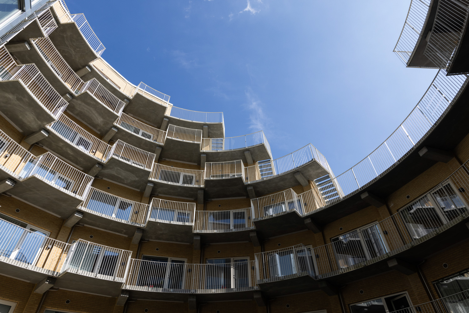 Apartments in irregular blocks combined with great craftmanship masonry and a beautiful brick colour toning in cold and warm sandy colours. Dark window frames and the minimalistic balcony rails frame a beautiful and unpretentious courtyard.