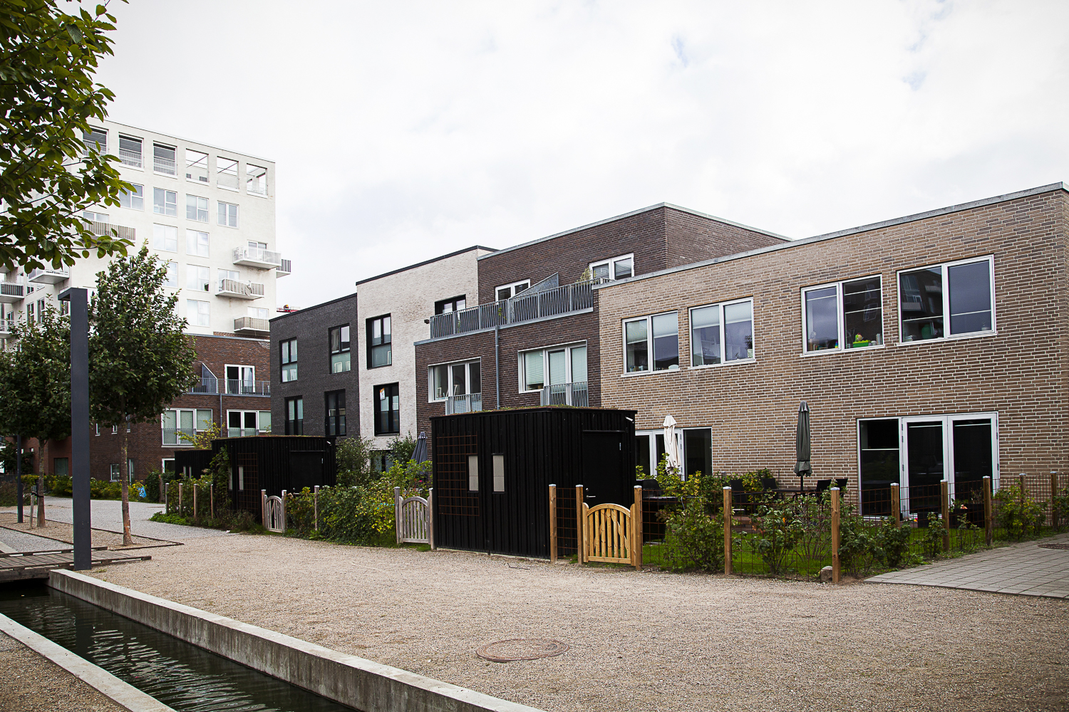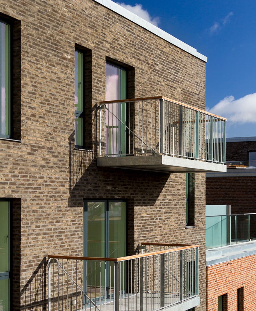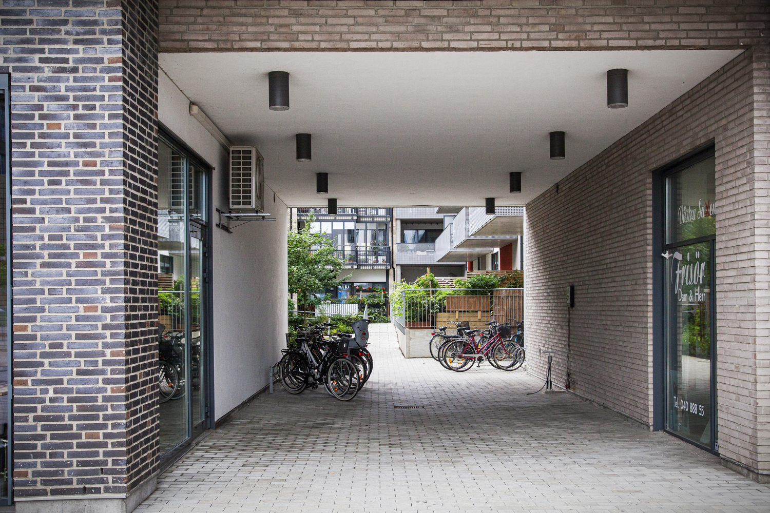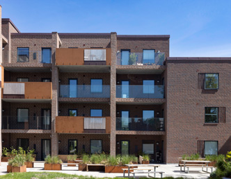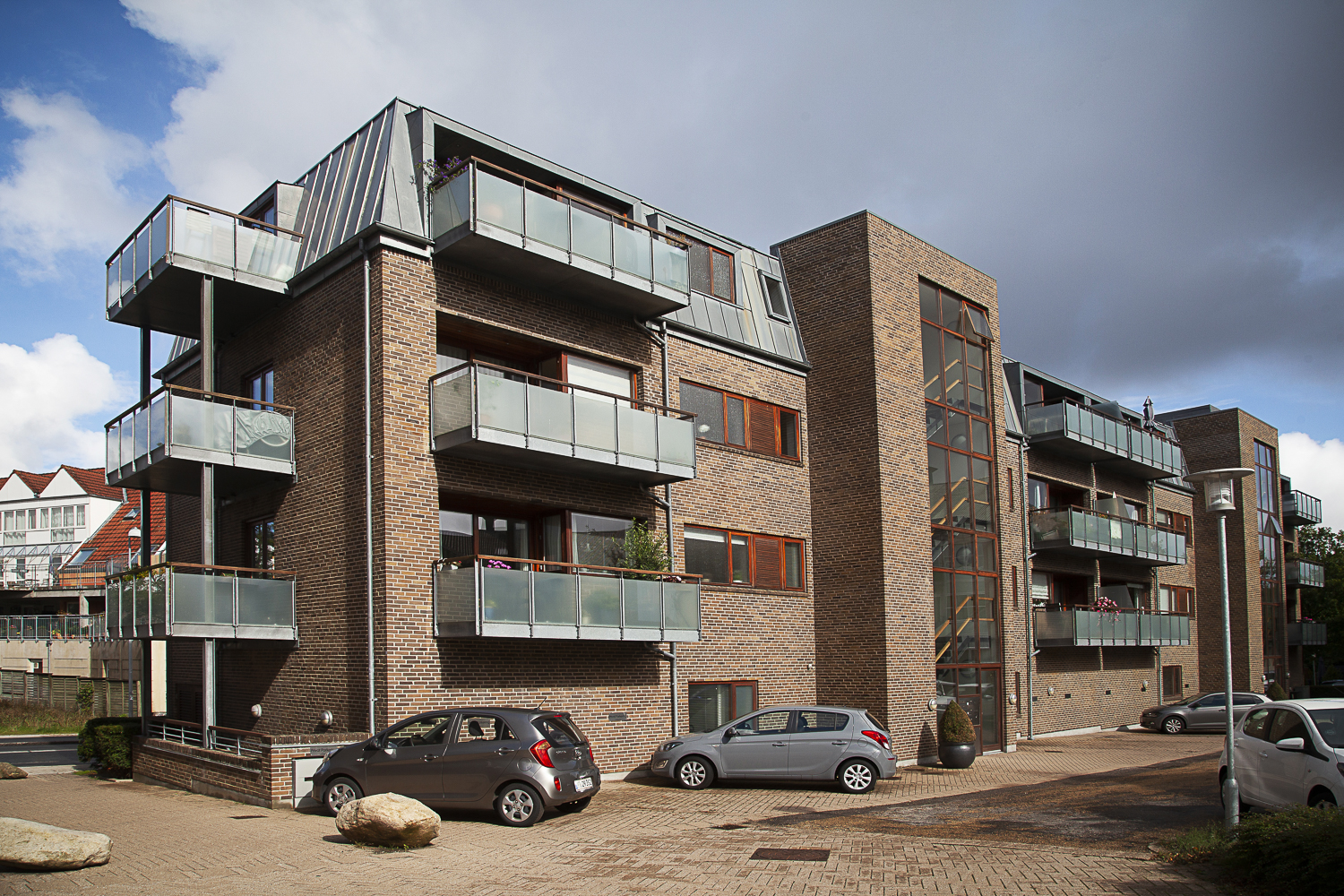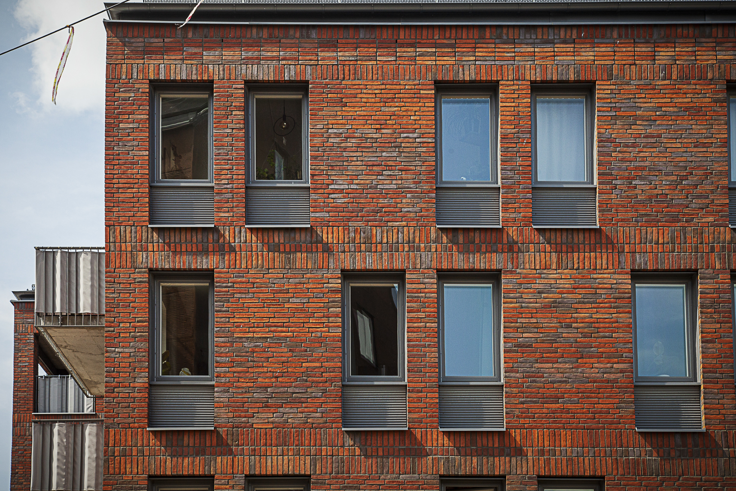 Apartments in irregular blocks combined with great craftmanship masonry and a beautiful brick colour toning in cold and warm sandy colours. Dark window frames and the minimalistic balcony rails frame a beautiful and unpretentious courtyard.