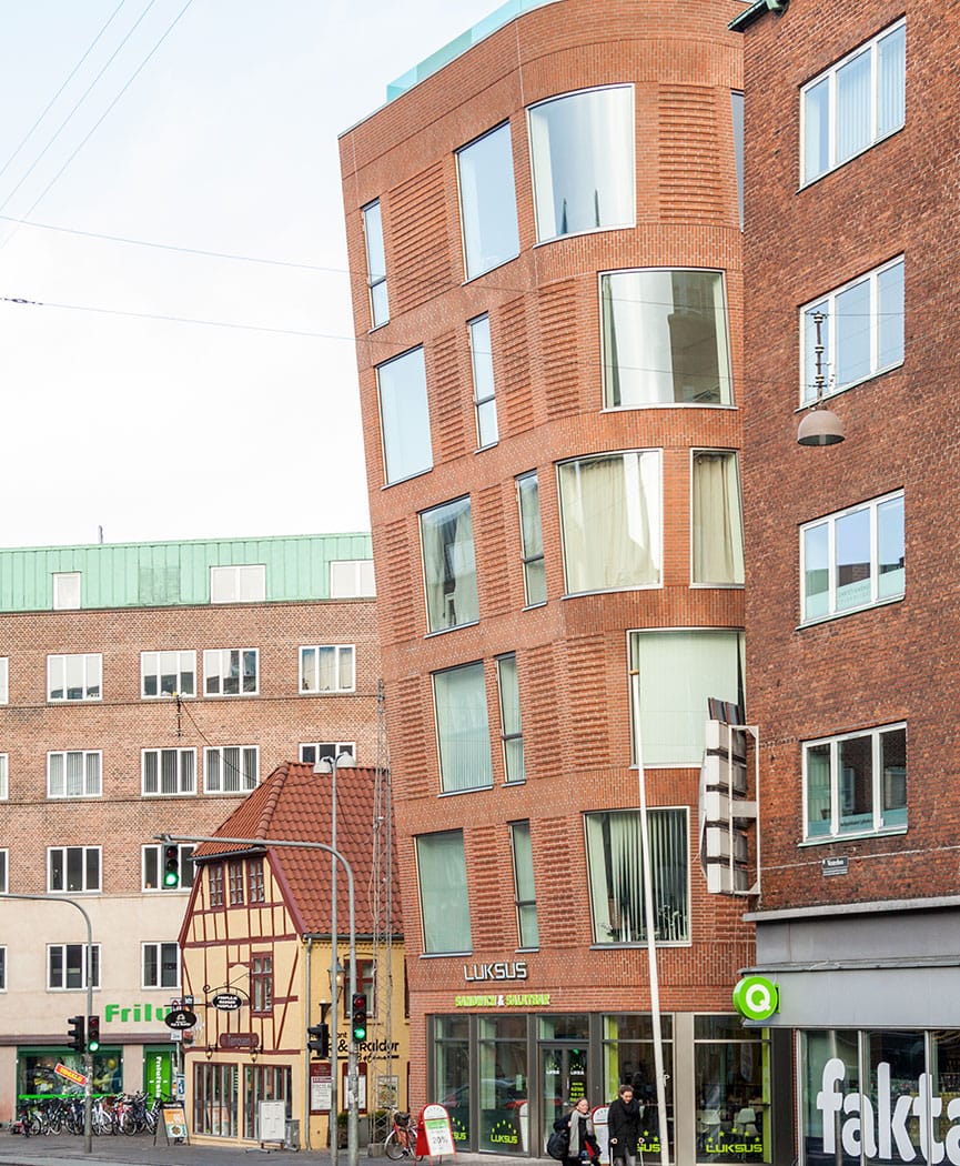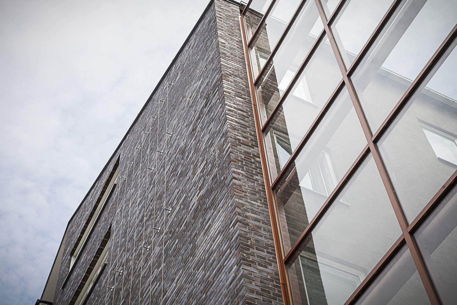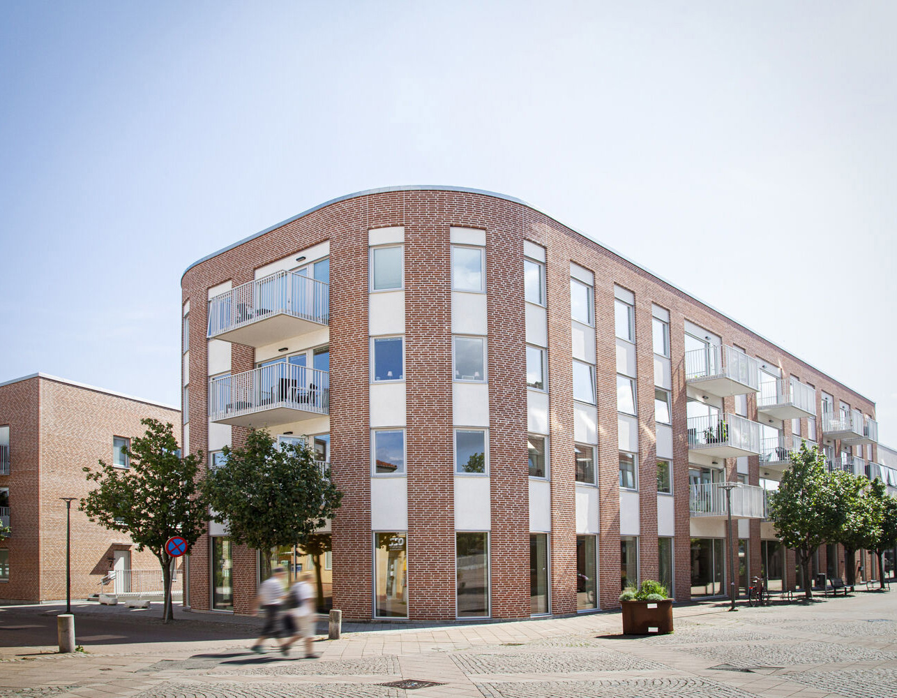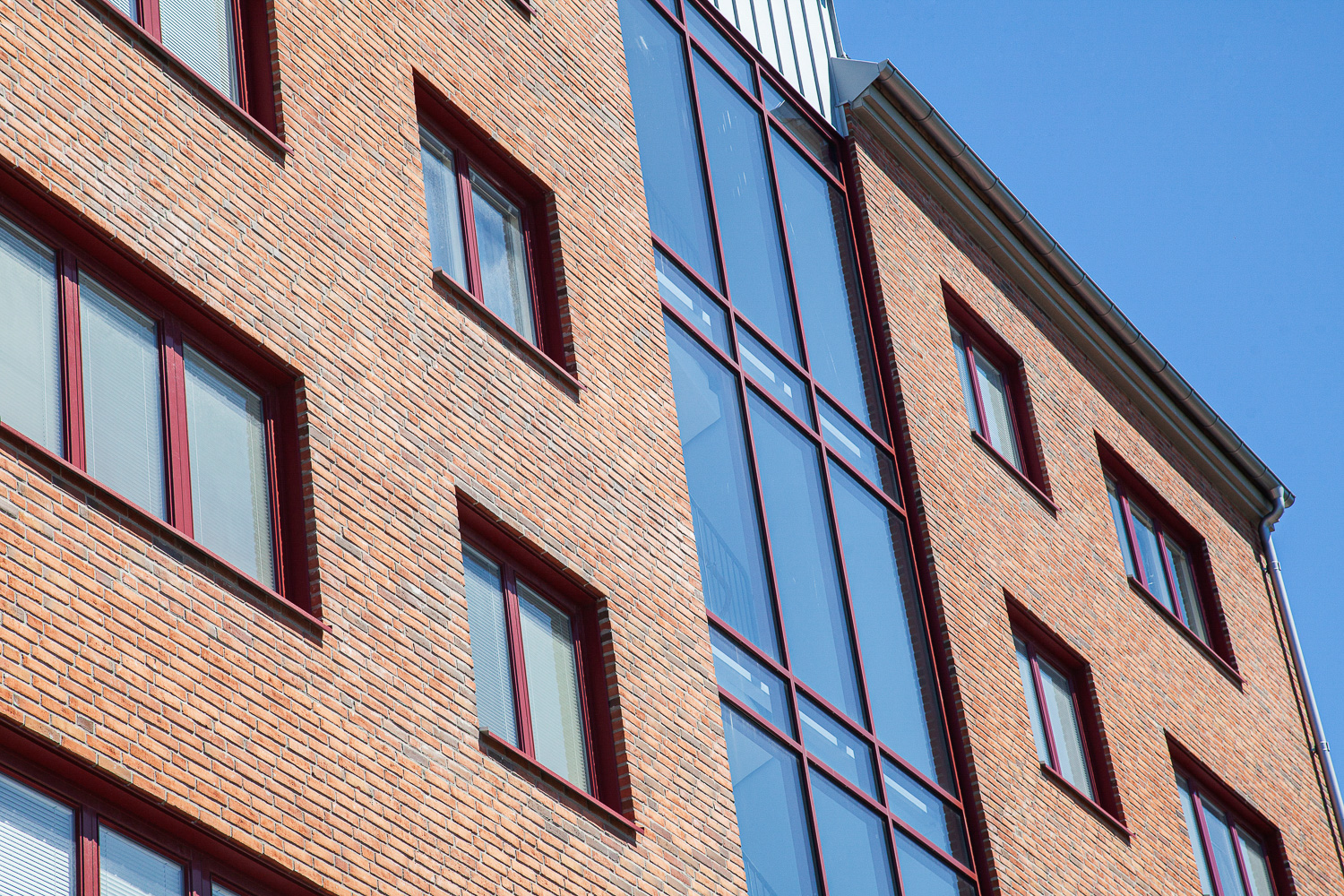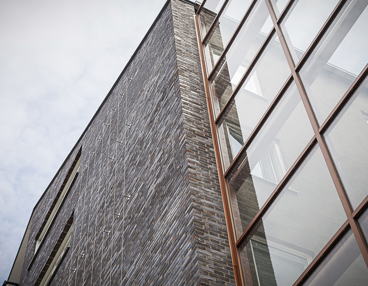 Innovative property in Aalborg City center with a distinct sloping façade. Randers Tegl assisted the performing contractor in designing and planning expansion joints, as well as suspension principles and determination of the masonry course according to the placement of brick bellows. The design of the façade posed special requirements for the building's carrying capacity.