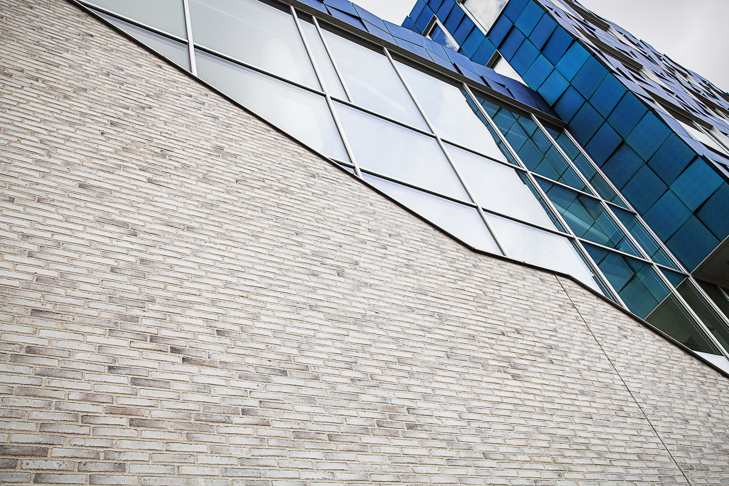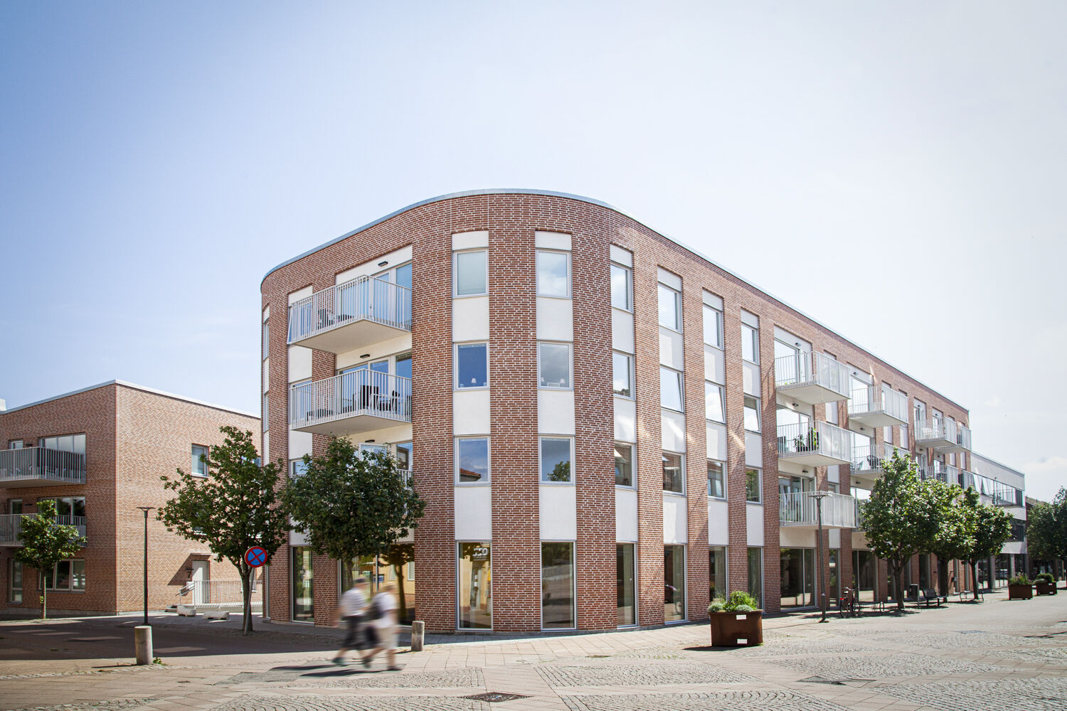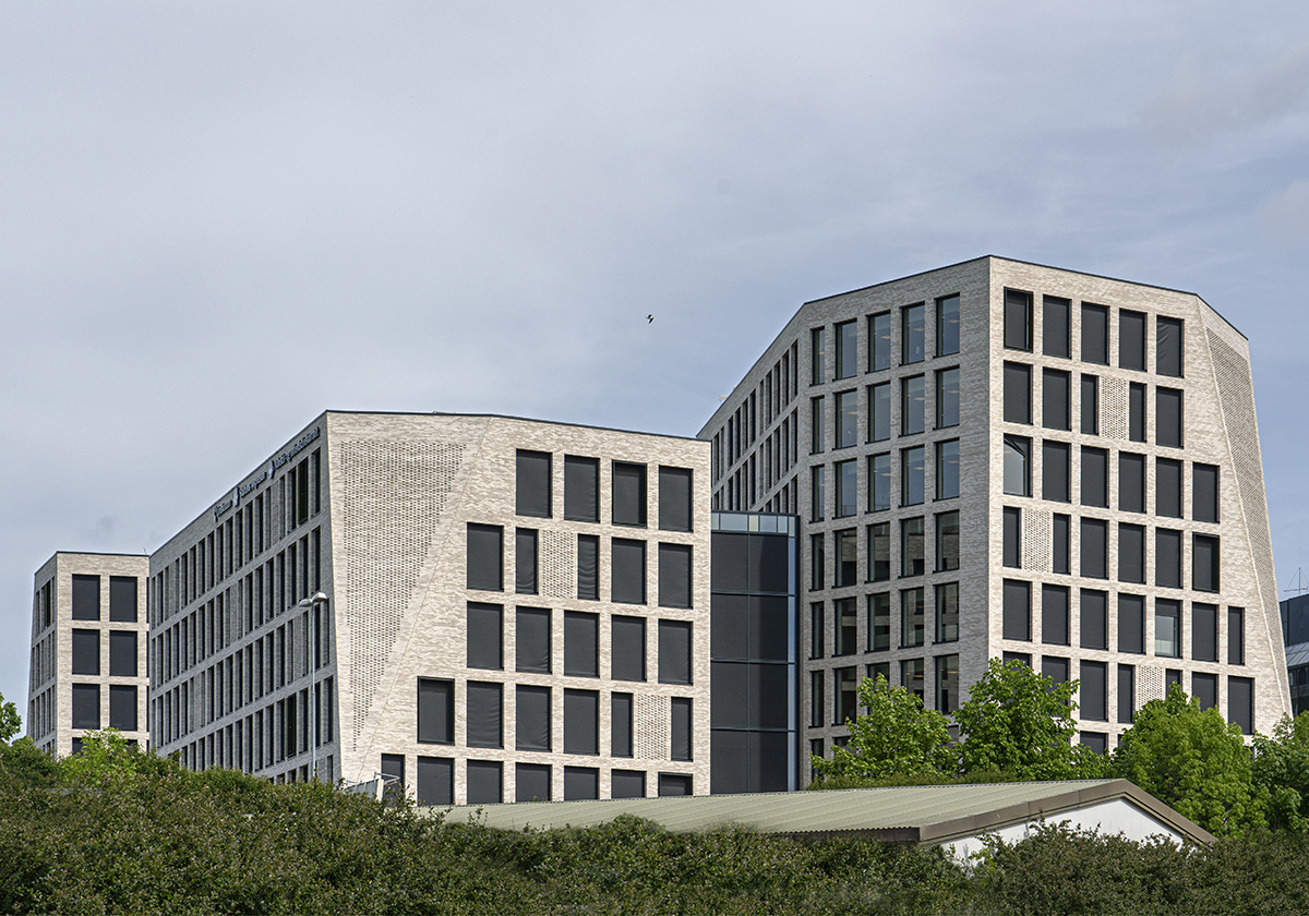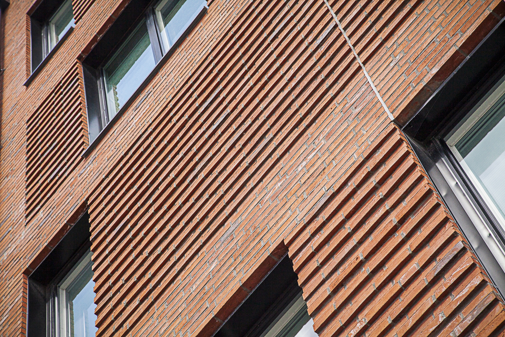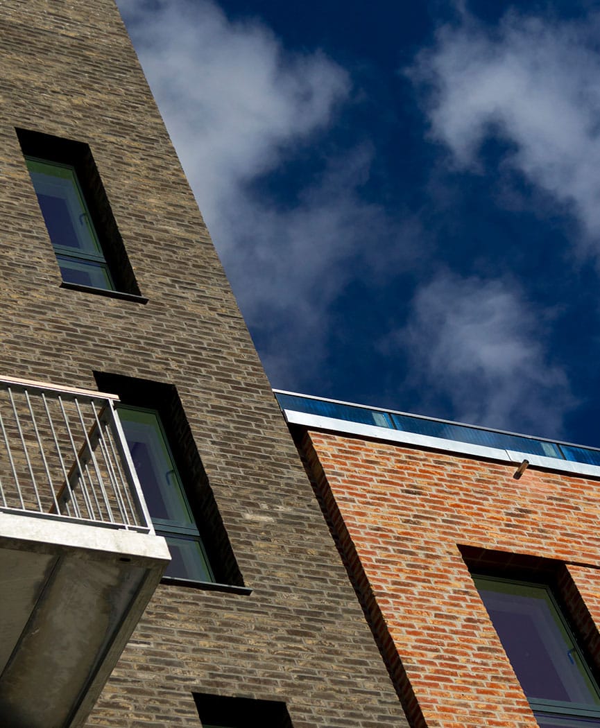 Innovative property in Aalborg City center with a distinct sloping façade. Randers Tegl assisted the performing contractor in designing and planning expansion joints, as well as suspension principles and determination of the masonry course according to the placement of brick bellows. The design of the façade posed special requirements for the building's carrying capacity.