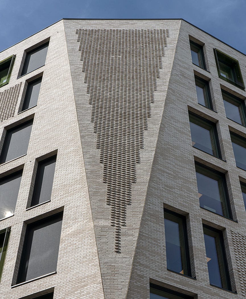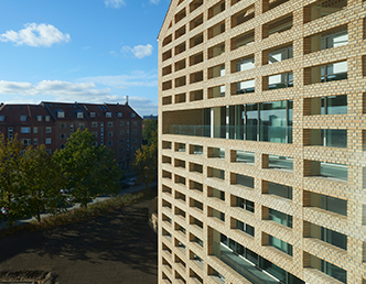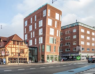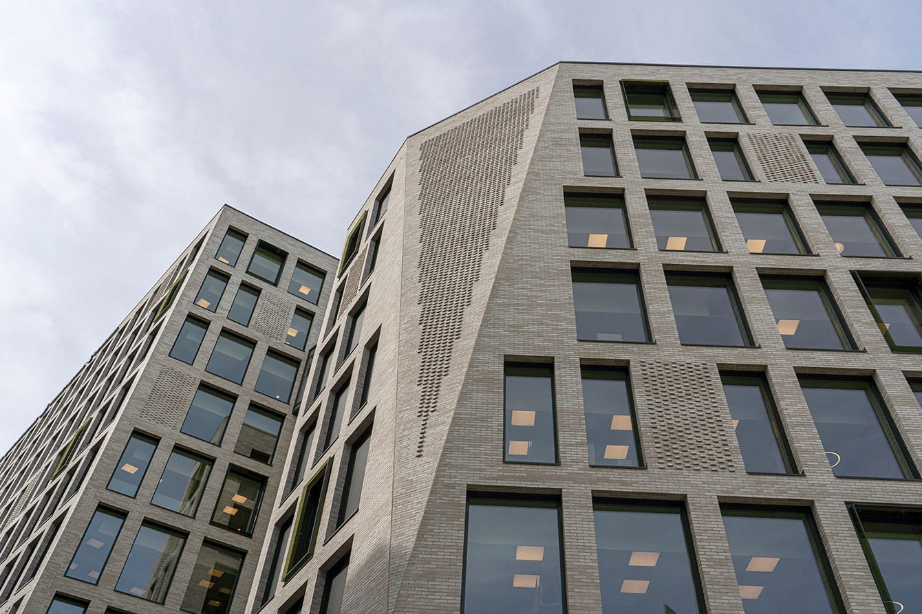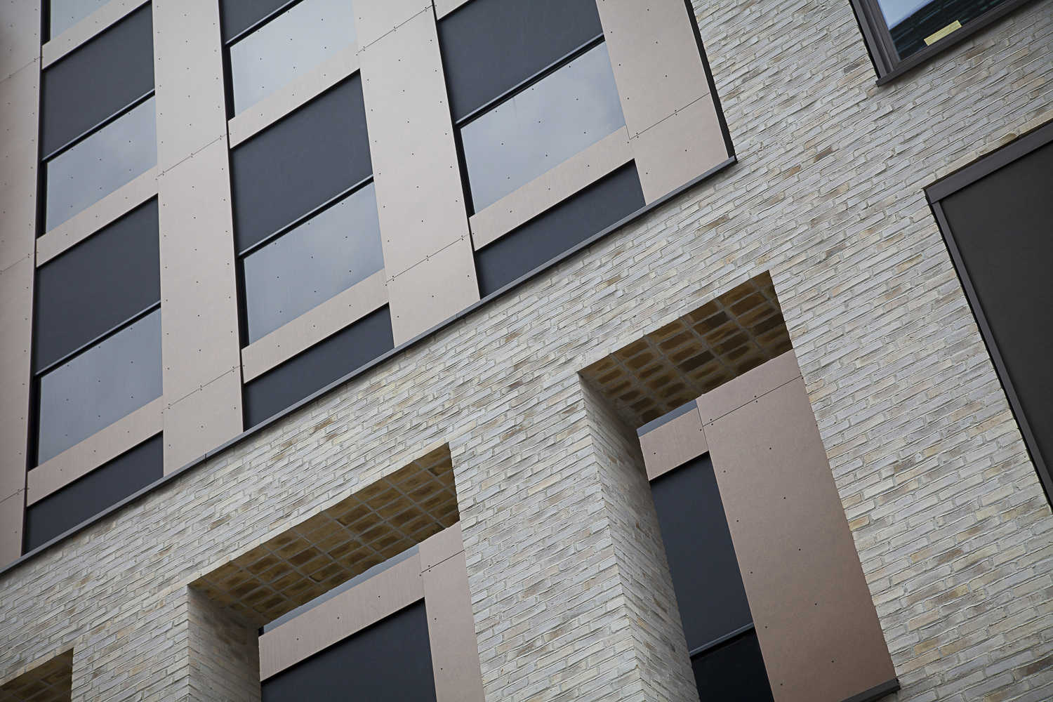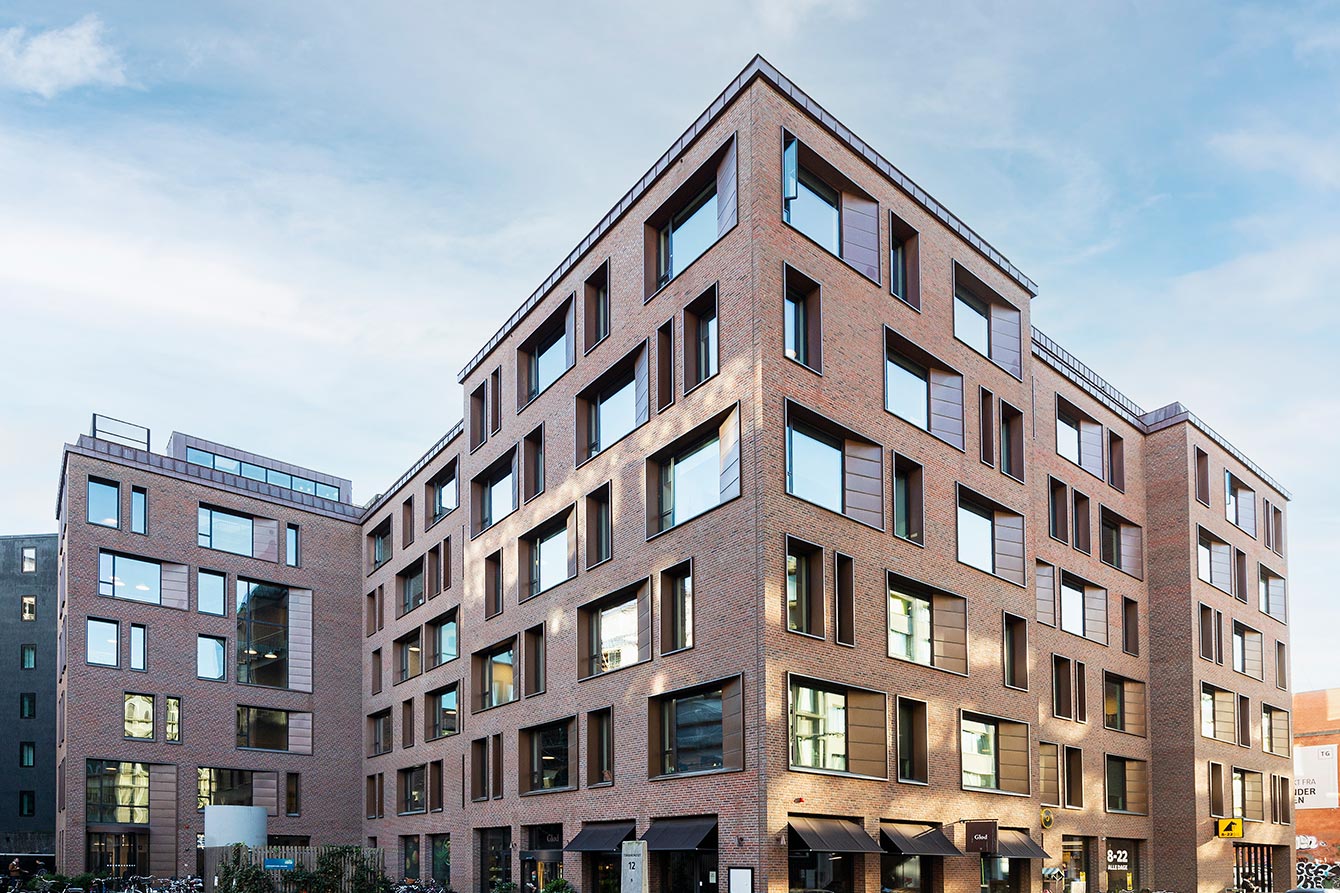 Innovative property in Aalborg City center with a distinct sloping façade. Randers Tegl assisted the performing contractor in designing and planning expansion joints, as well as suspension principles and determination of the masonry course according to the placement of brick bellows. The design of the façade posed special requirements for the building's carrying capacity.
