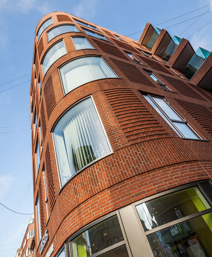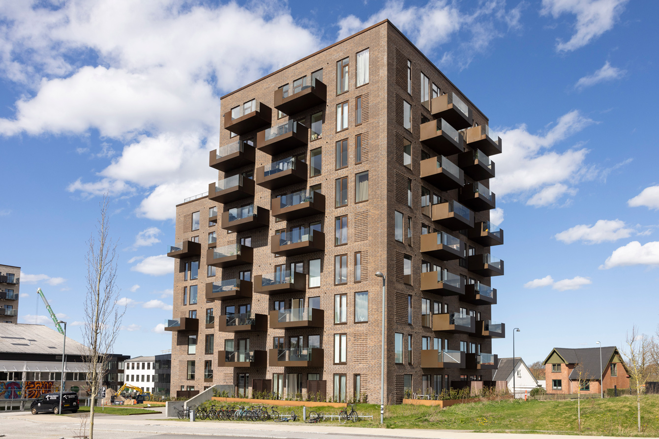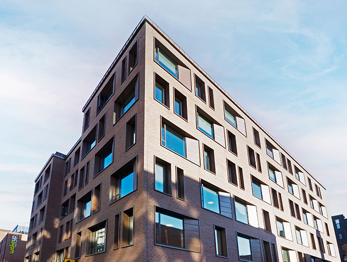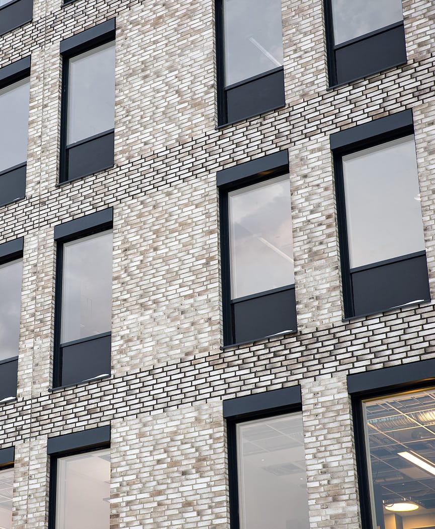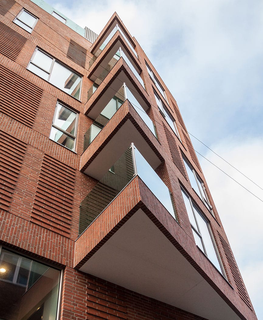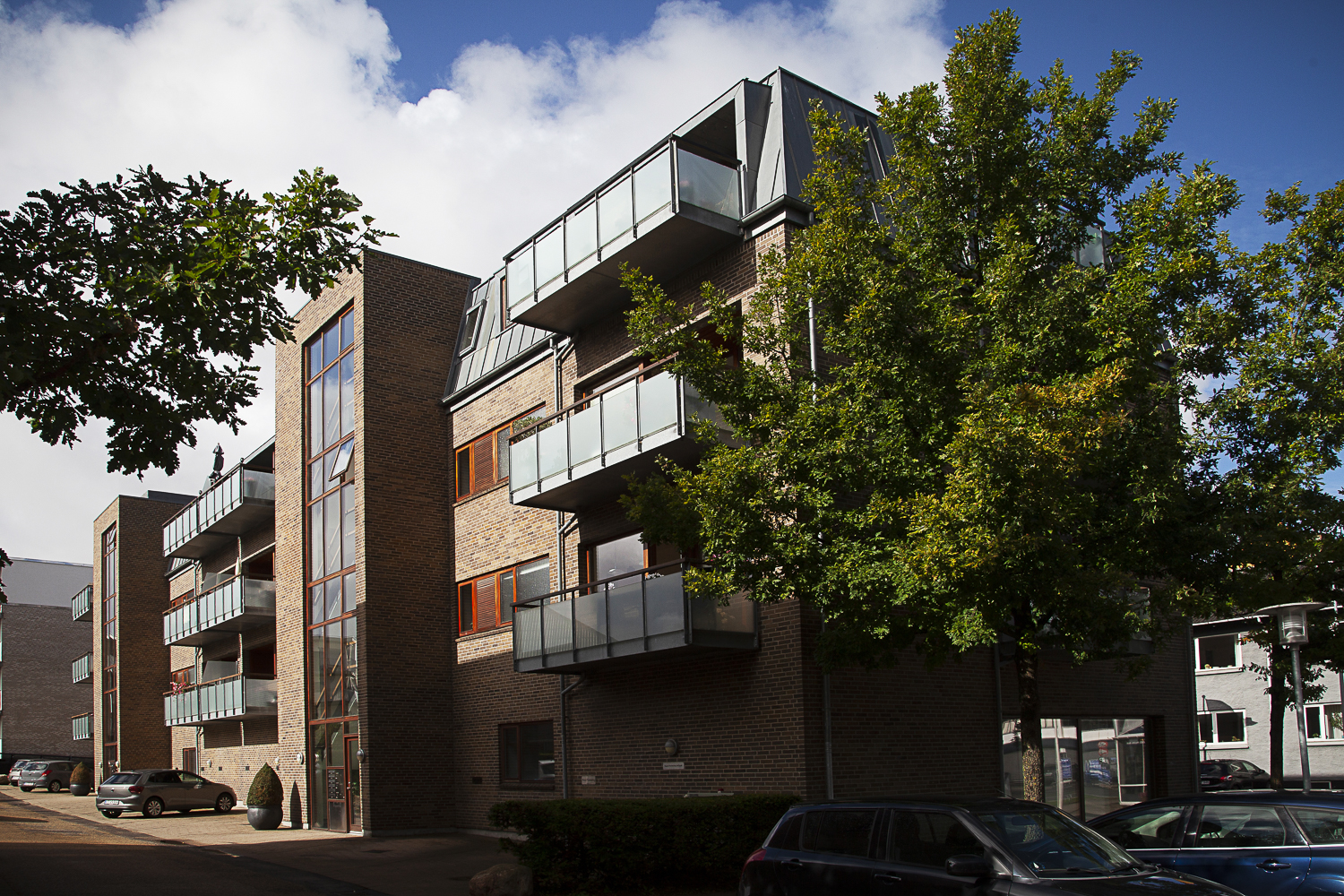 Innovative property in Aalborg City center with a distinct sloping façade. Randers Tegl assisted the performing contractor in designing and planning expansion joints, as well as suspension principles and determination of the masonry course according to the placement of brick bellows. The design of the façade posed special requirements for the building's carrying capacity.