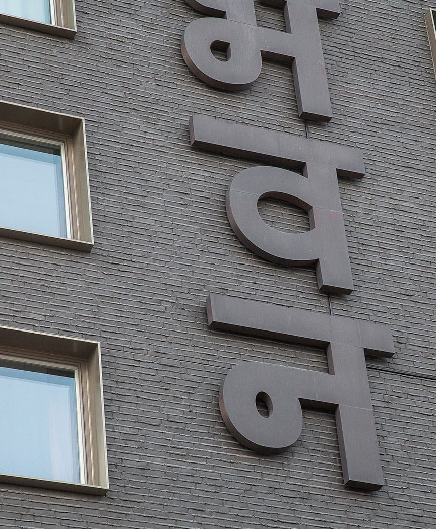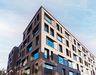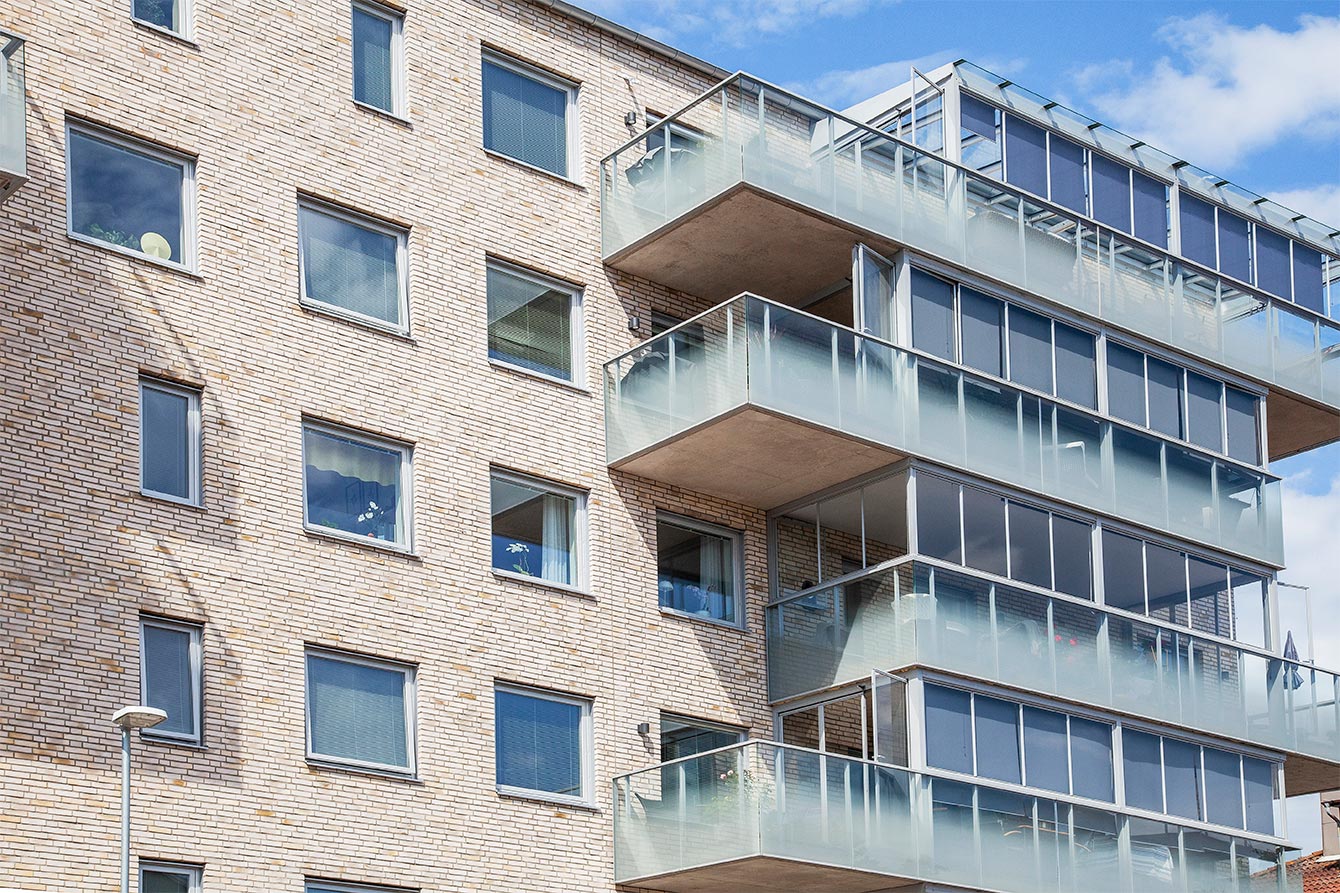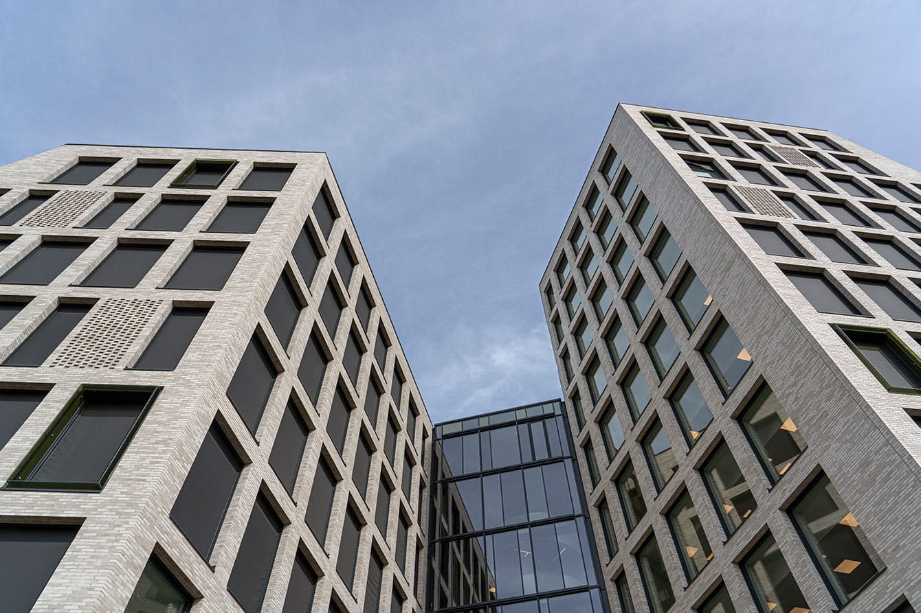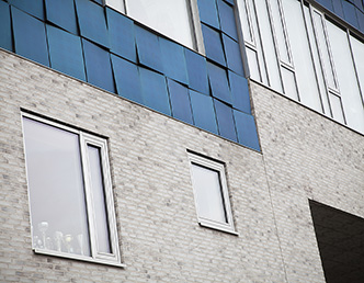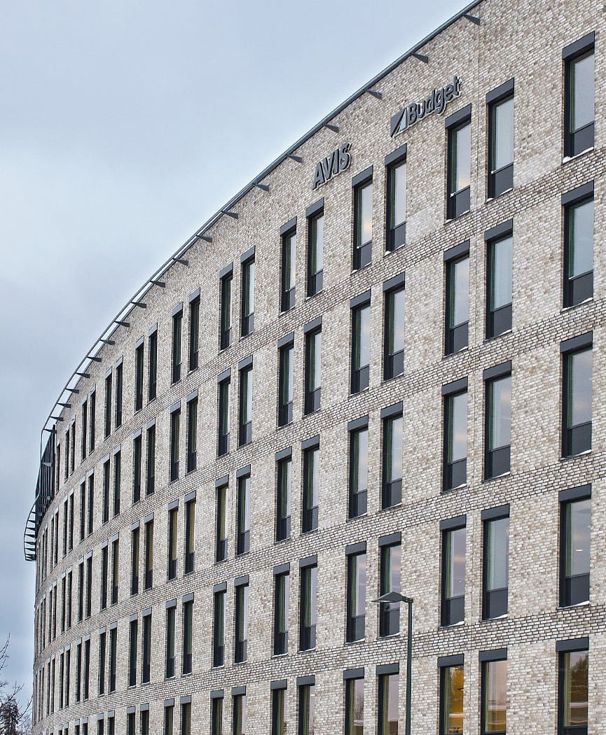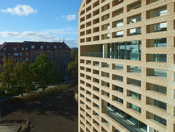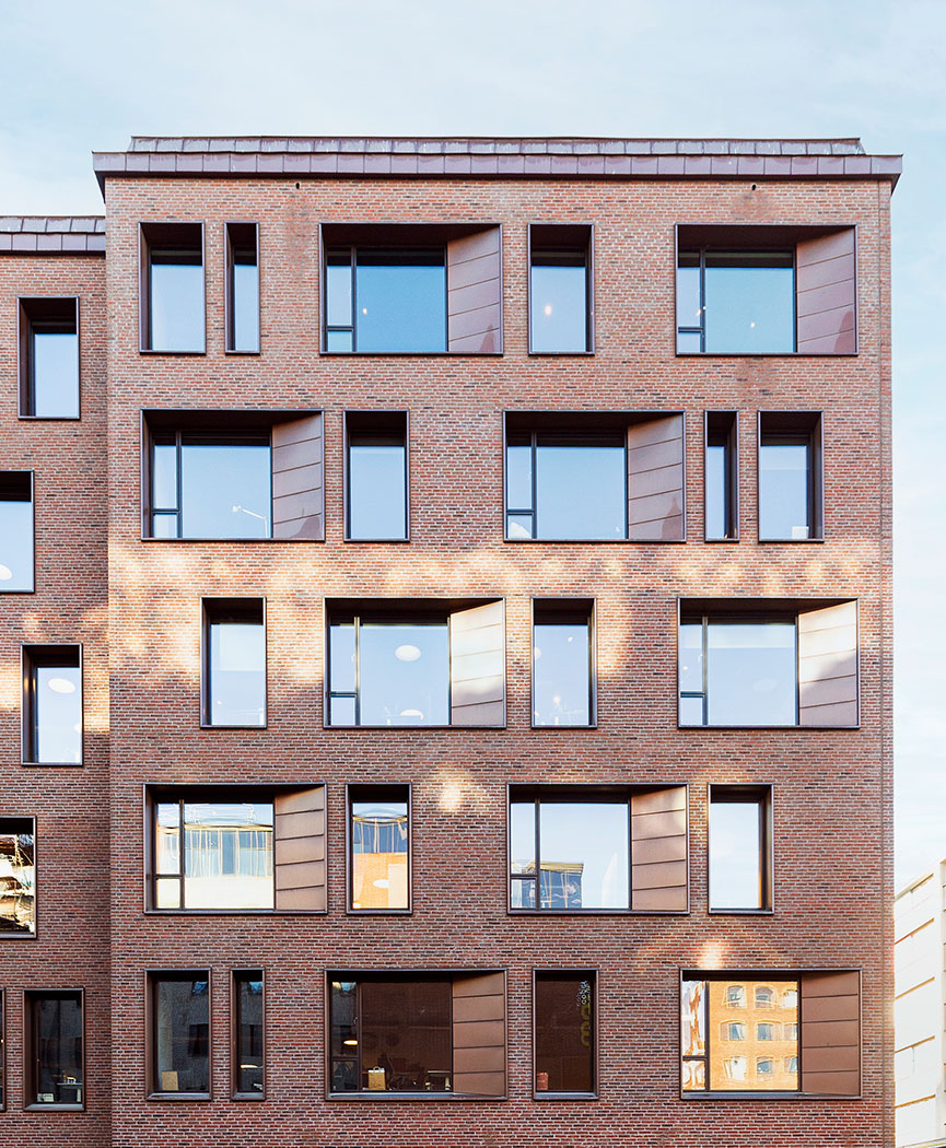 Innovative property in Aalborg City center with a distinct sloping façade. Randers Tegl assisted the performing contractor in designing and planning expansion joints, as well as suspension principles and determination of the masonry course according to the placement of brick bellows. The design of the façade posed special requirements for the building's carrying capacity.