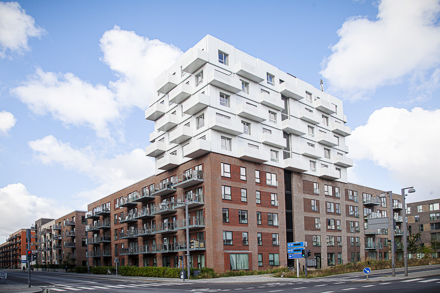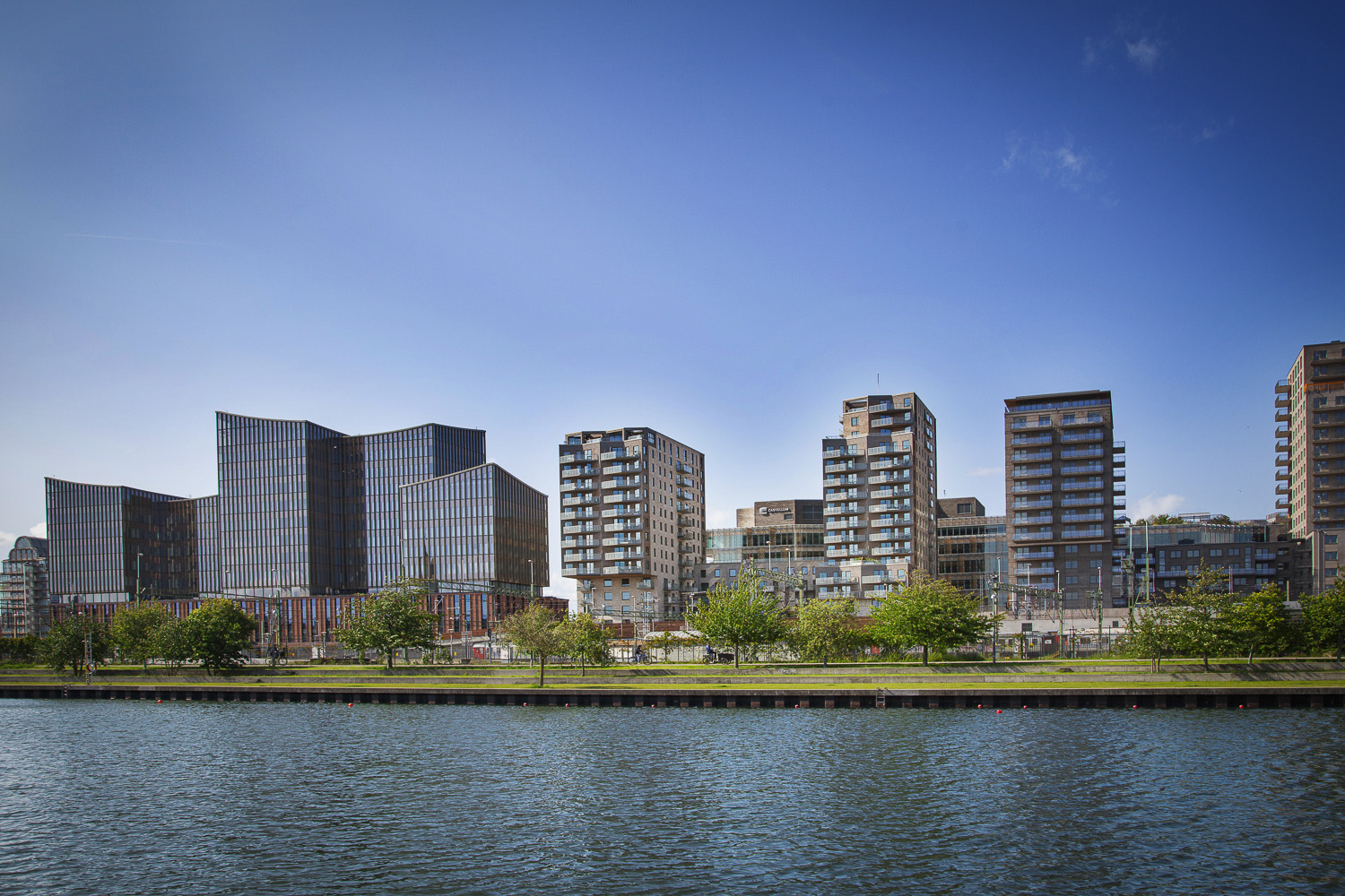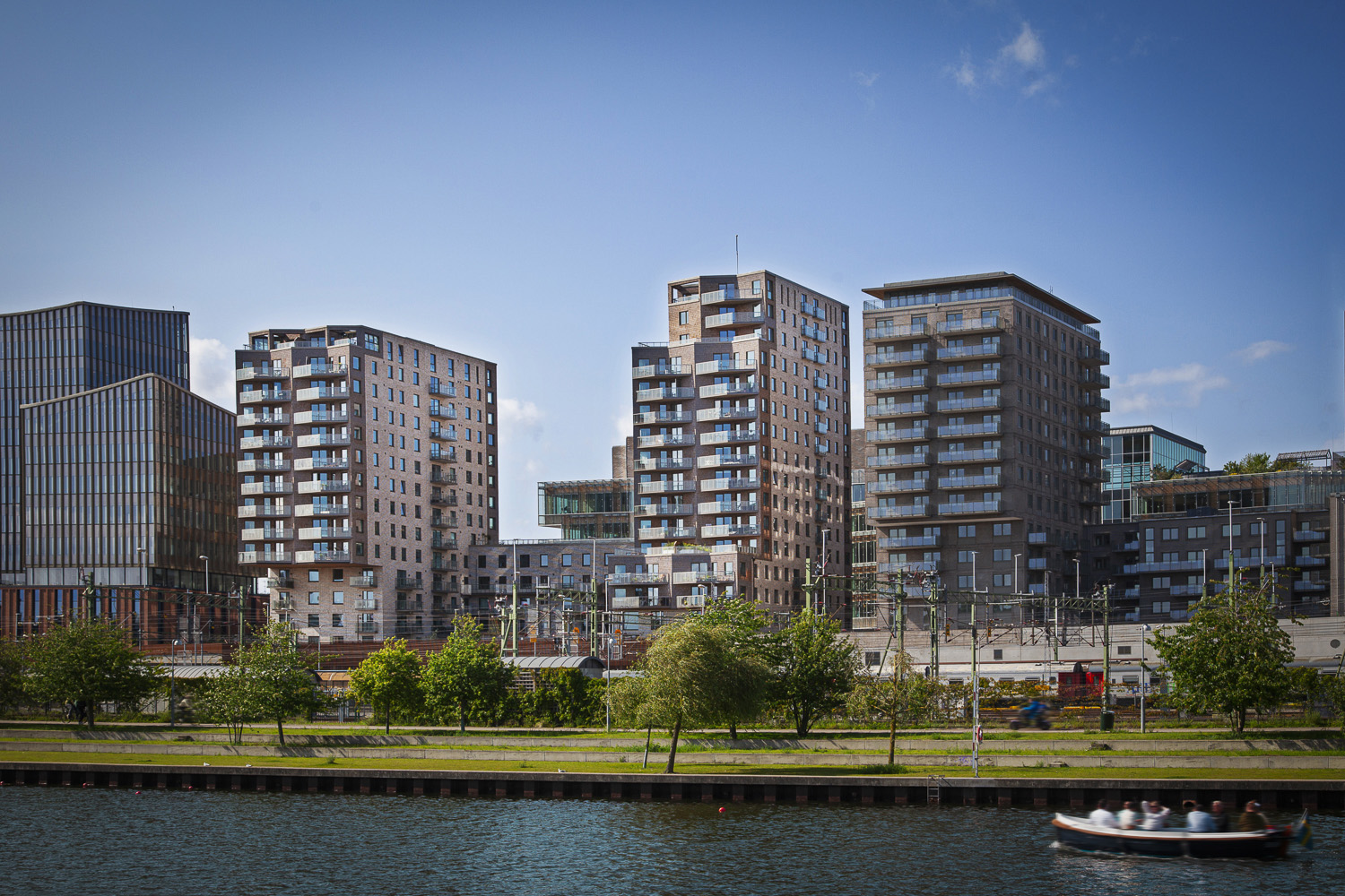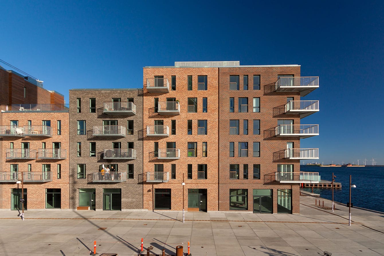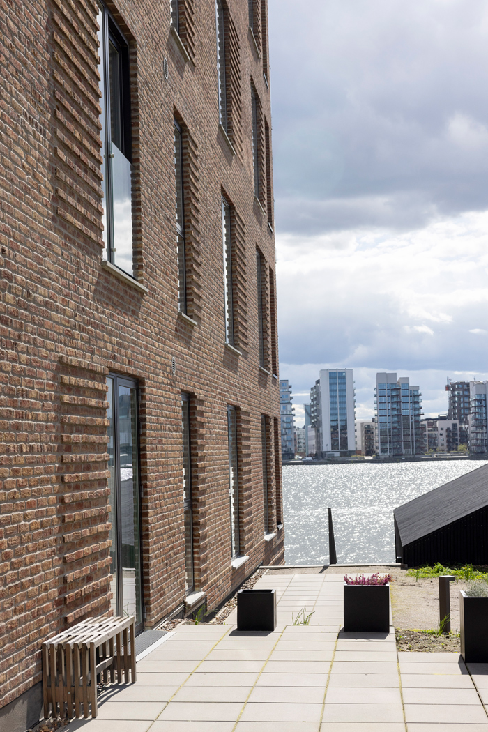 97 owner-occupied flats in Harbour Park, Copenhagen, Denmark. The architecture of the block has classical roots. Owing to its well-defined shape, the block has a recreational courtyard area offering optimum conditions for light and shelter from the wind. The large scale of the building is broken down into smaller elements by means of a variety of façade materials and changes in elevation from 4 to 6 stories.