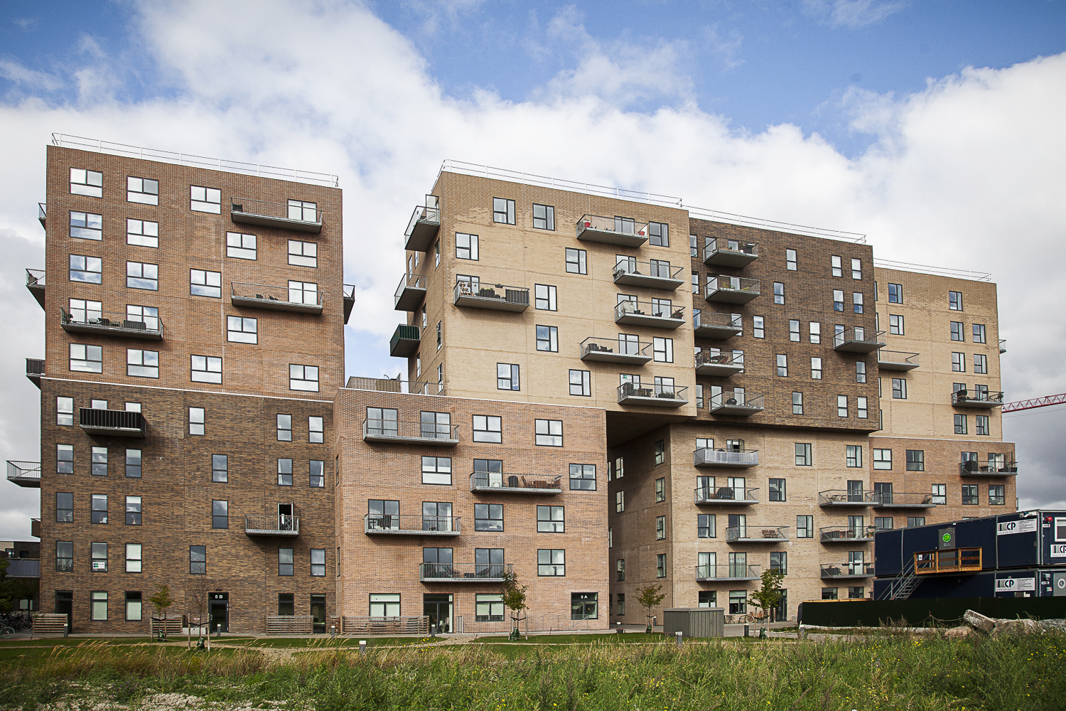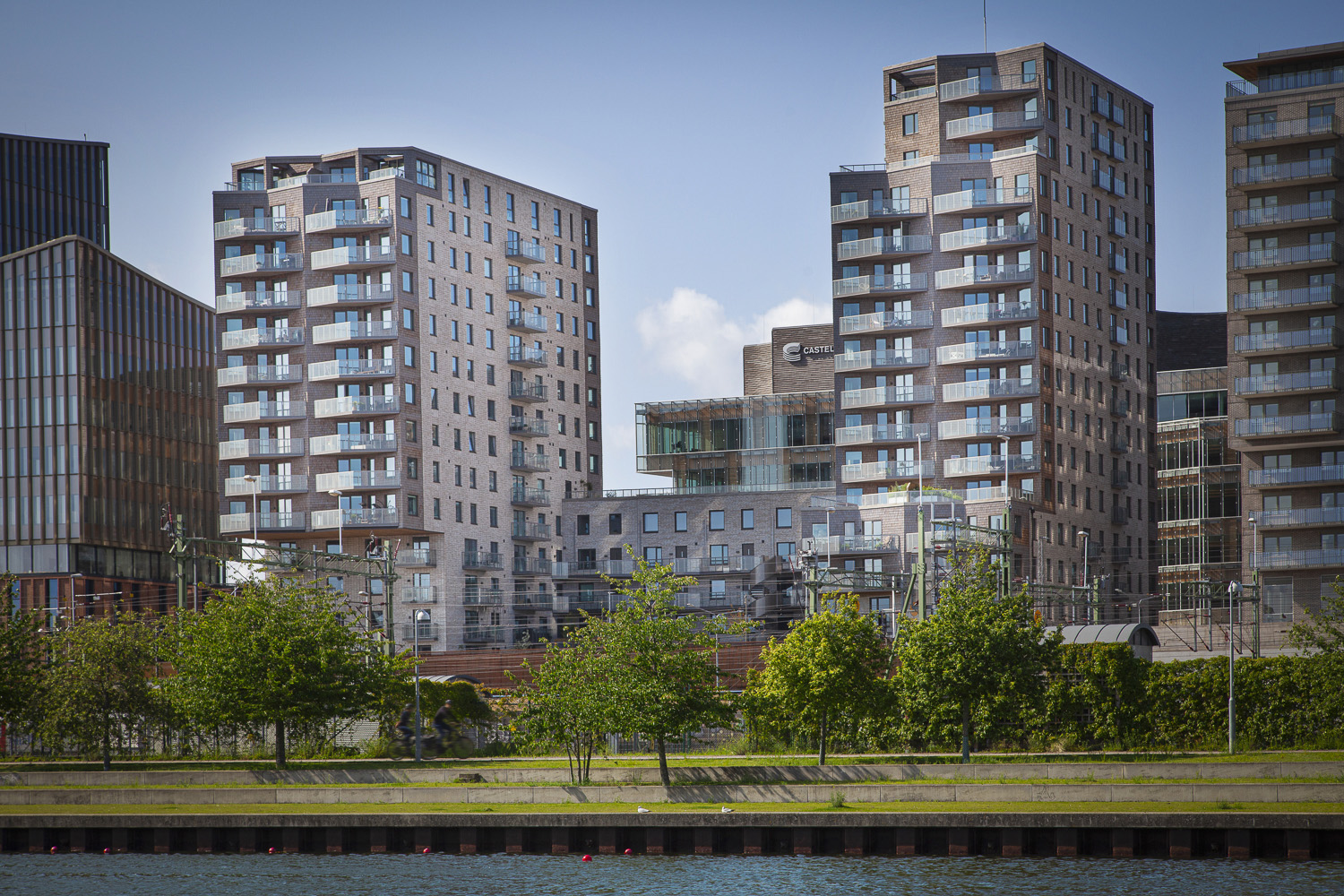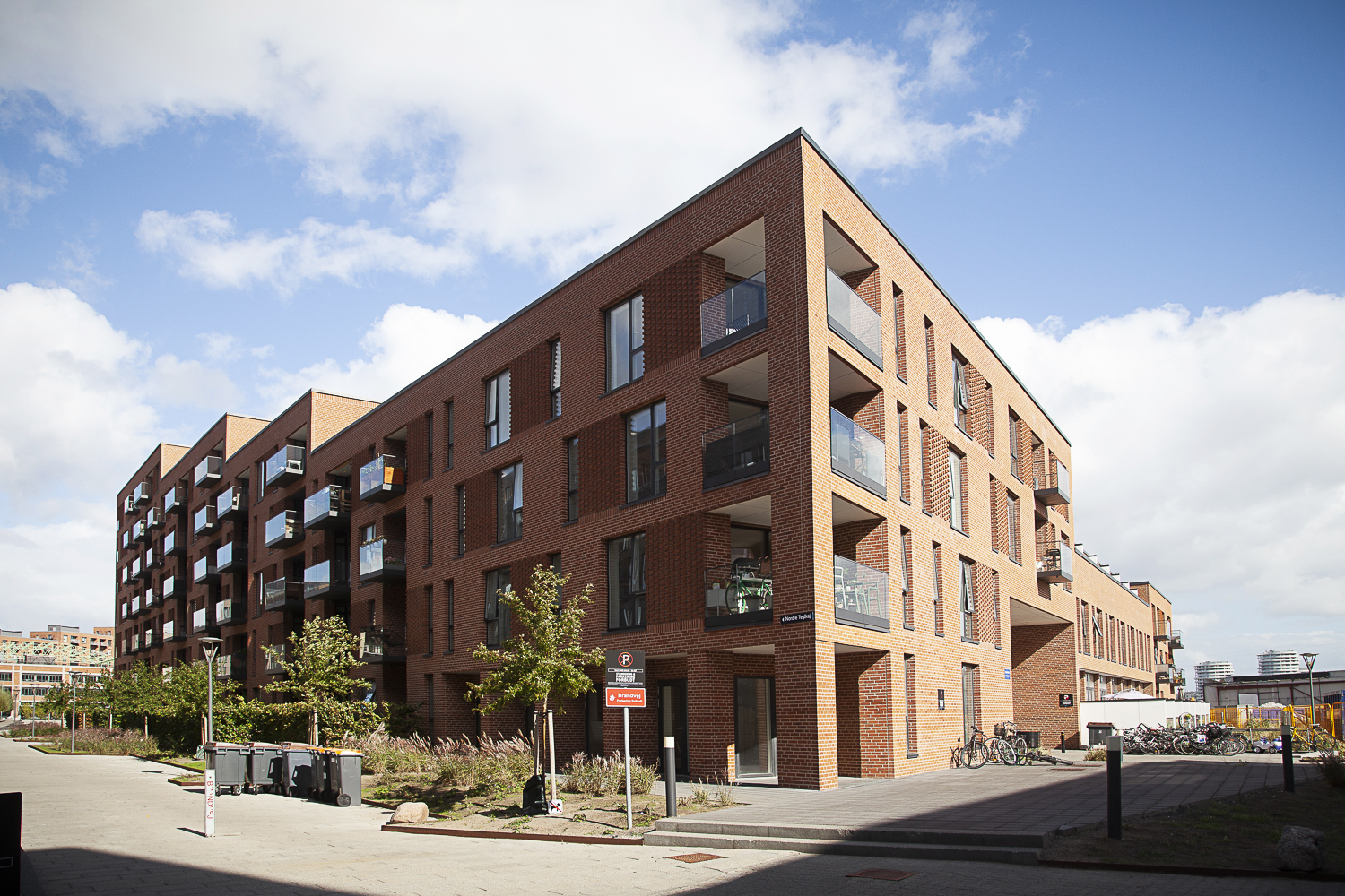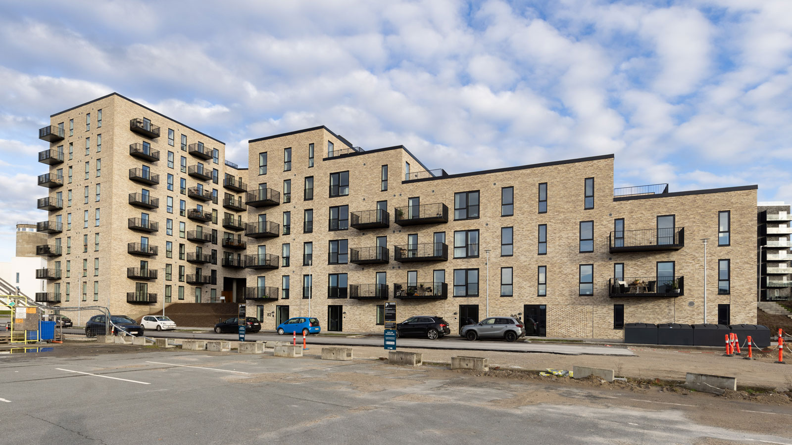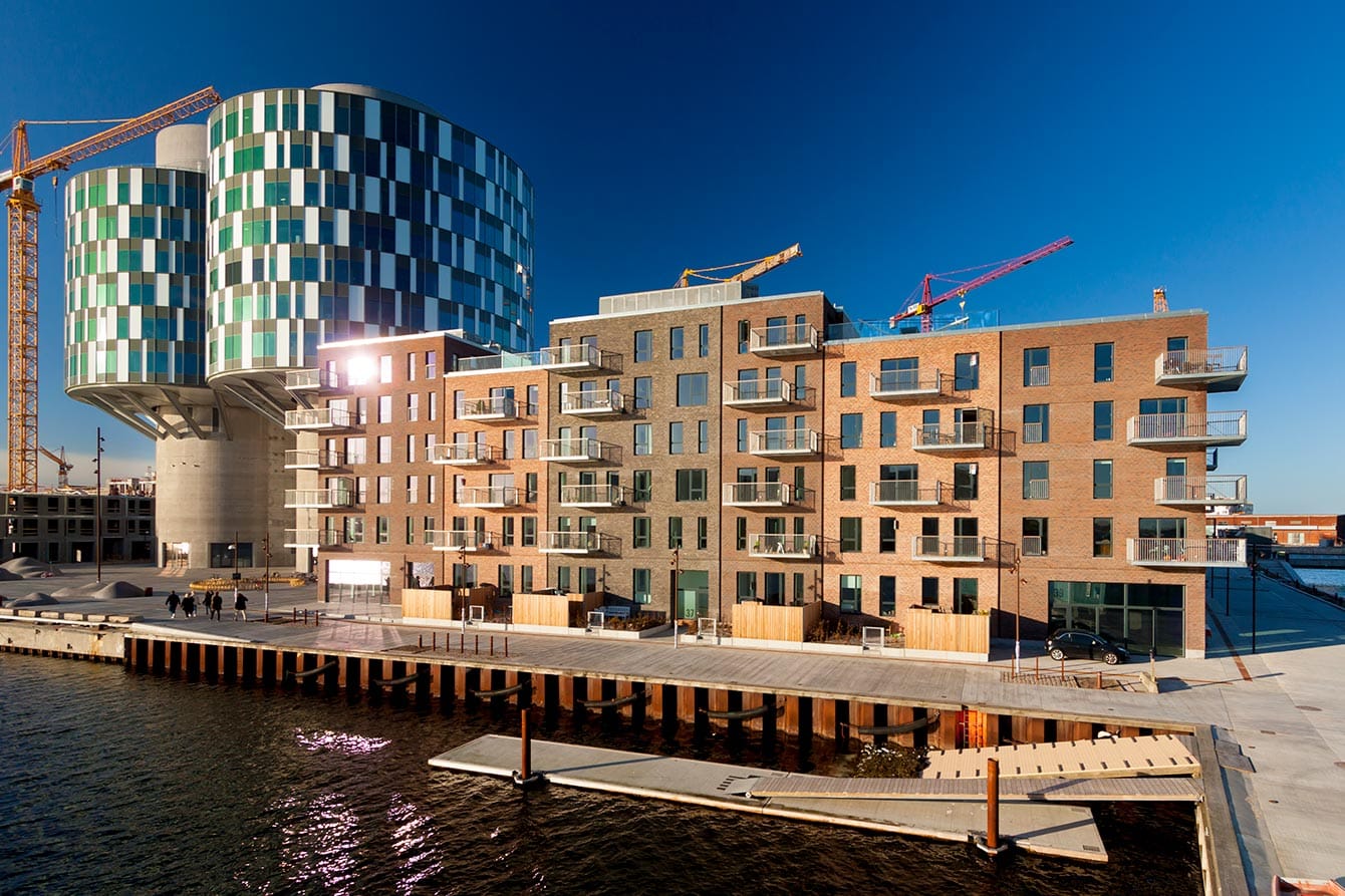 97 owner-occupied flats in Harbour Park, Copenhagen, Denmark. The architecture of the block has classical roots. Owing to its well-defined shape, the block has a recreational courtyard area offering optimum conditions for light and shelter from the wind. The large scale of the building is broken down into smaller elements by means of a variety of façade materials and changes in elevation from 4 to 6 stories.