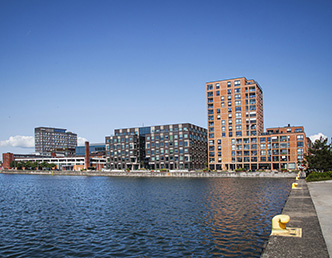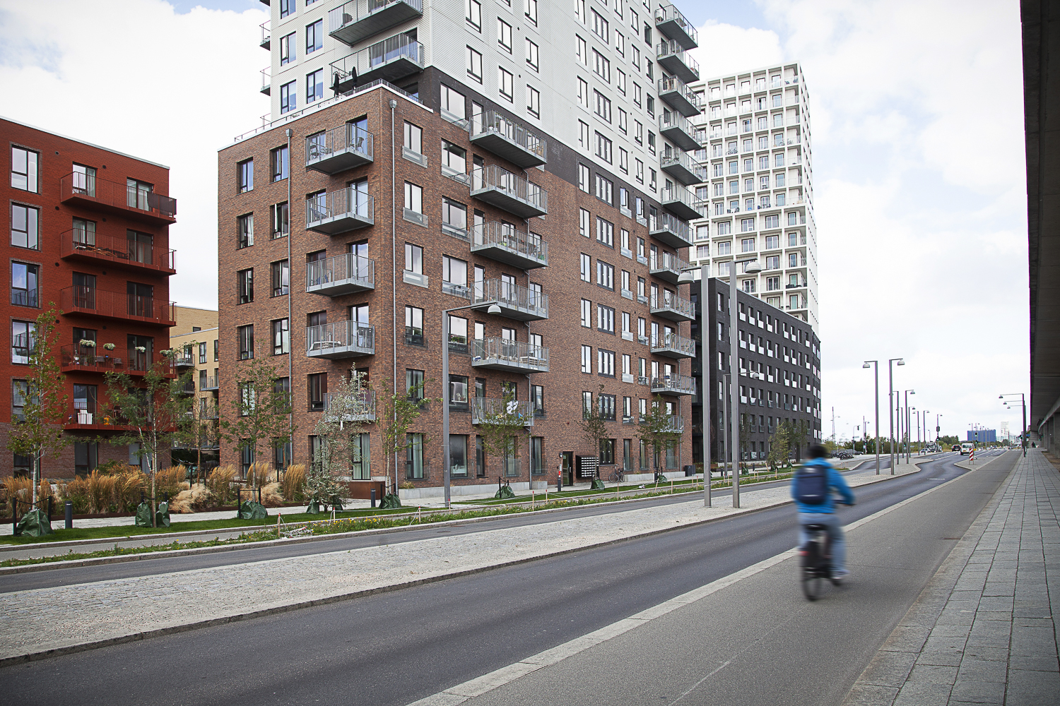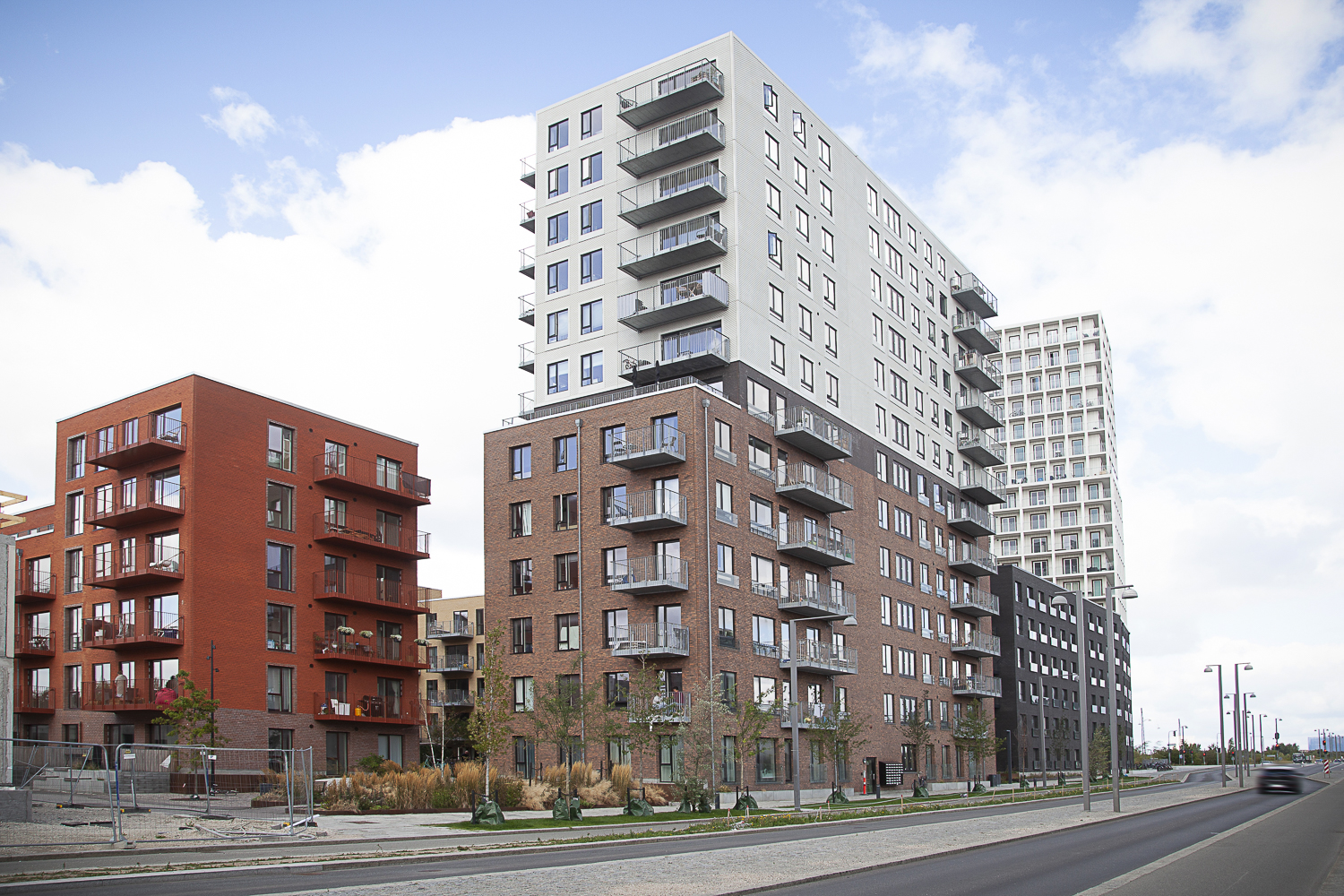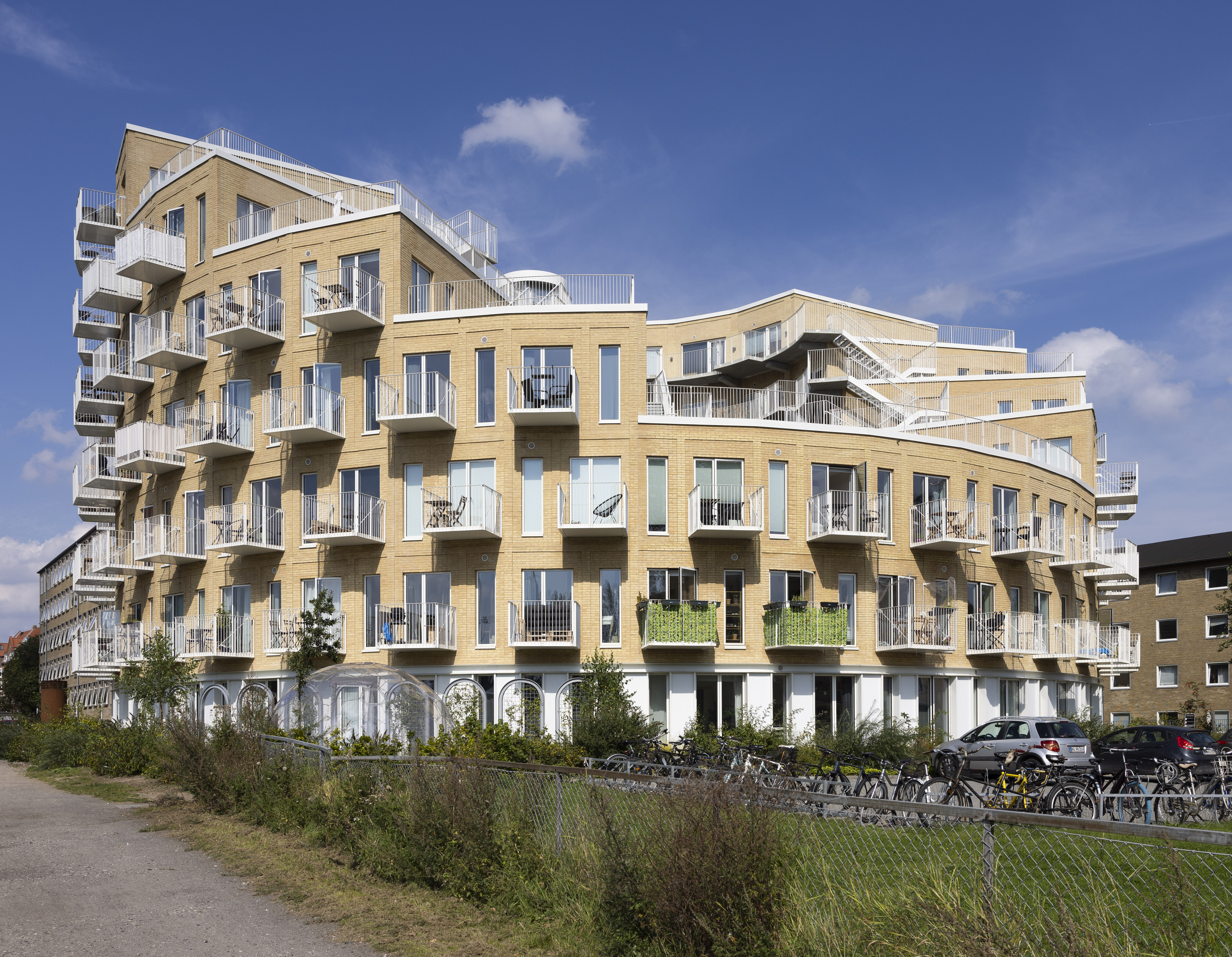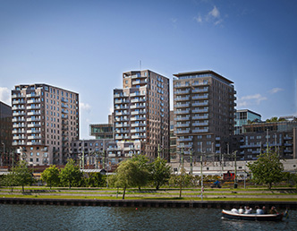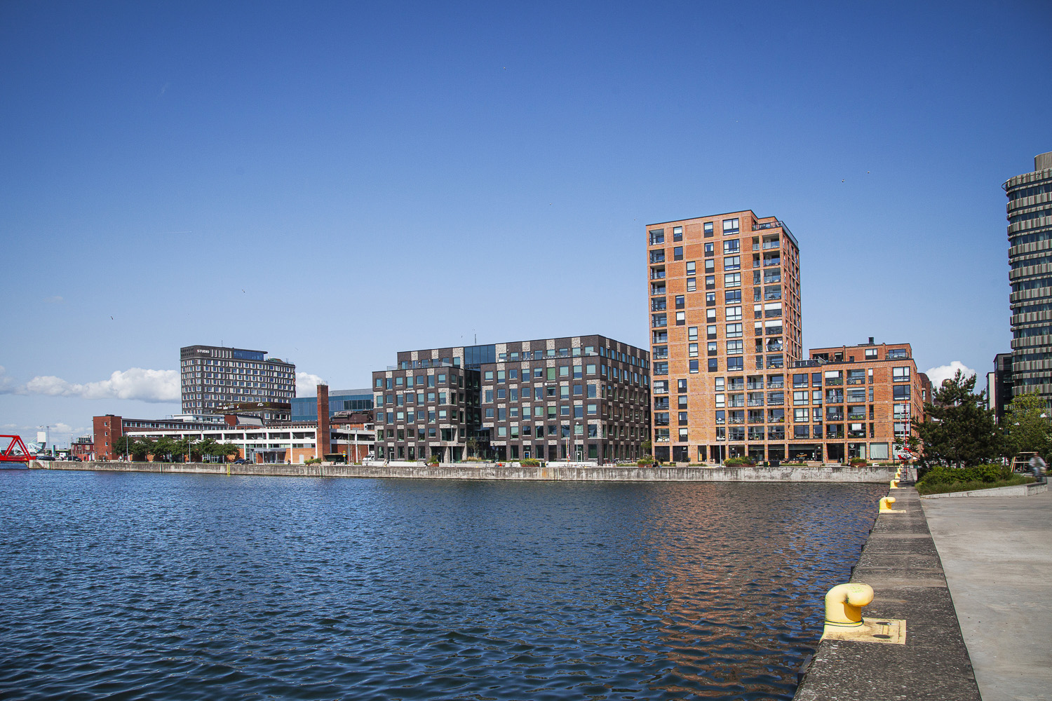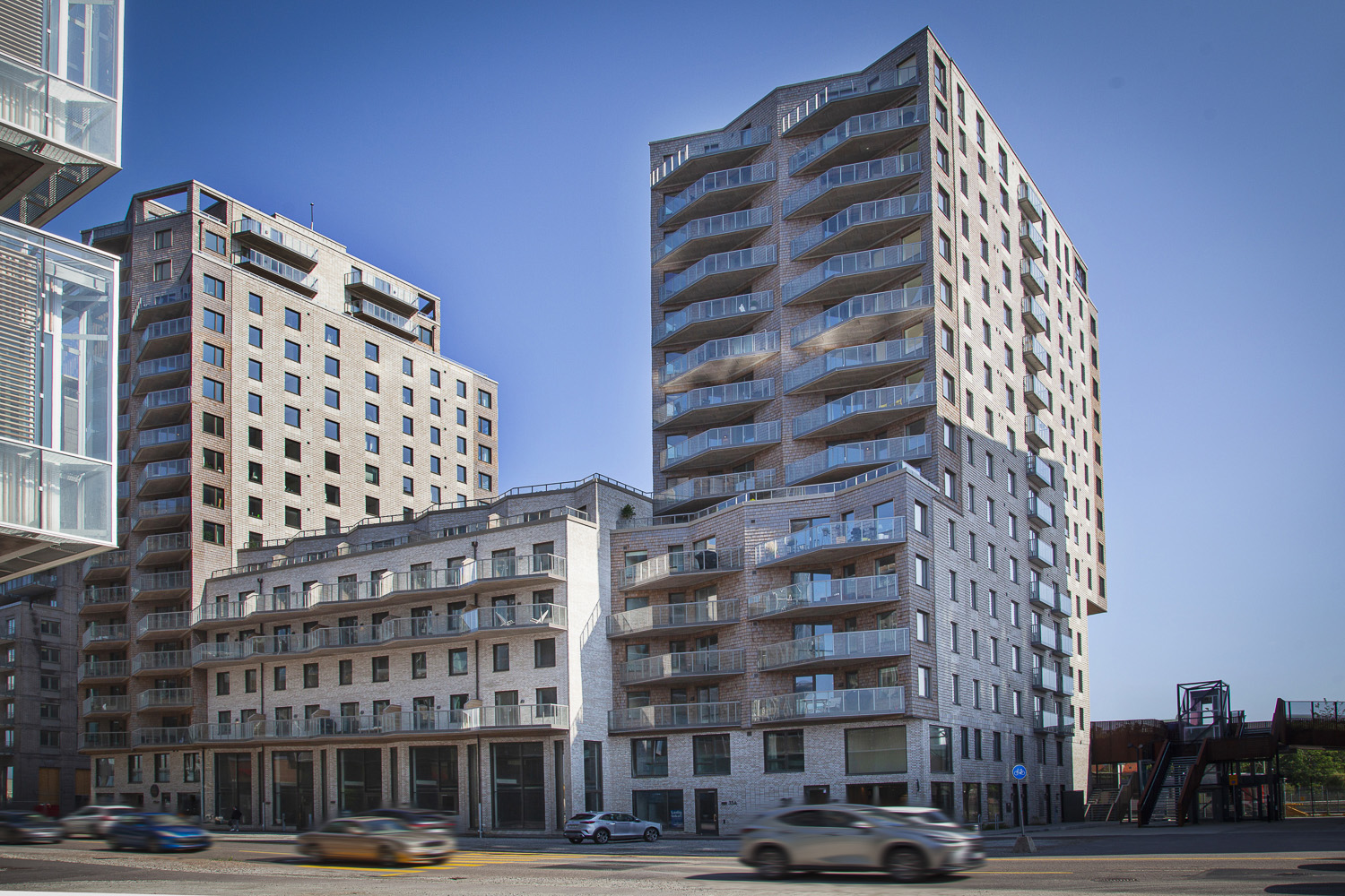 97 owner-occupied flats in Harbour Park, Copenhagen, Denmark. The architecture of the block has classical roots. Owing to its well-defined shape, the block has a recreational courtyard area offering optimum conditions for light and shelter from the wind. The large scale of the building is broken down into smaller elements by means of a variety of façade materials and changes in elevation from 4 to 6 stories.