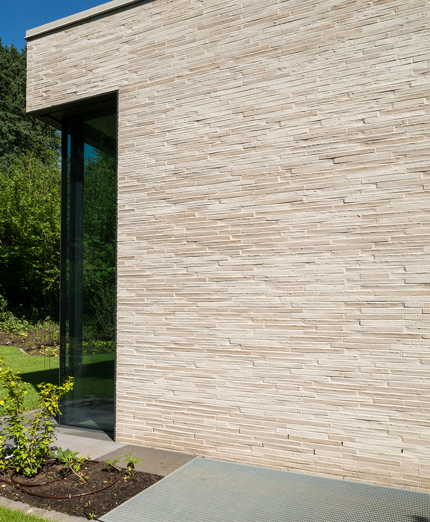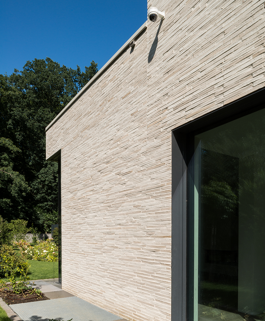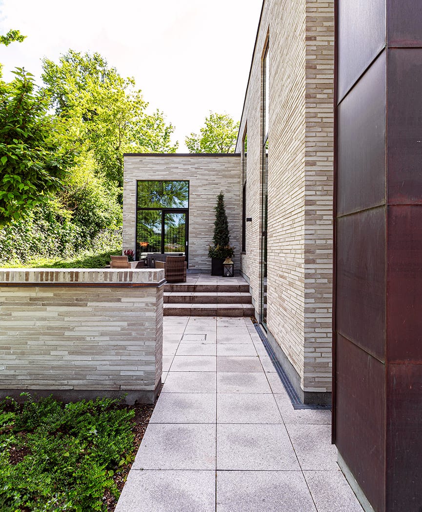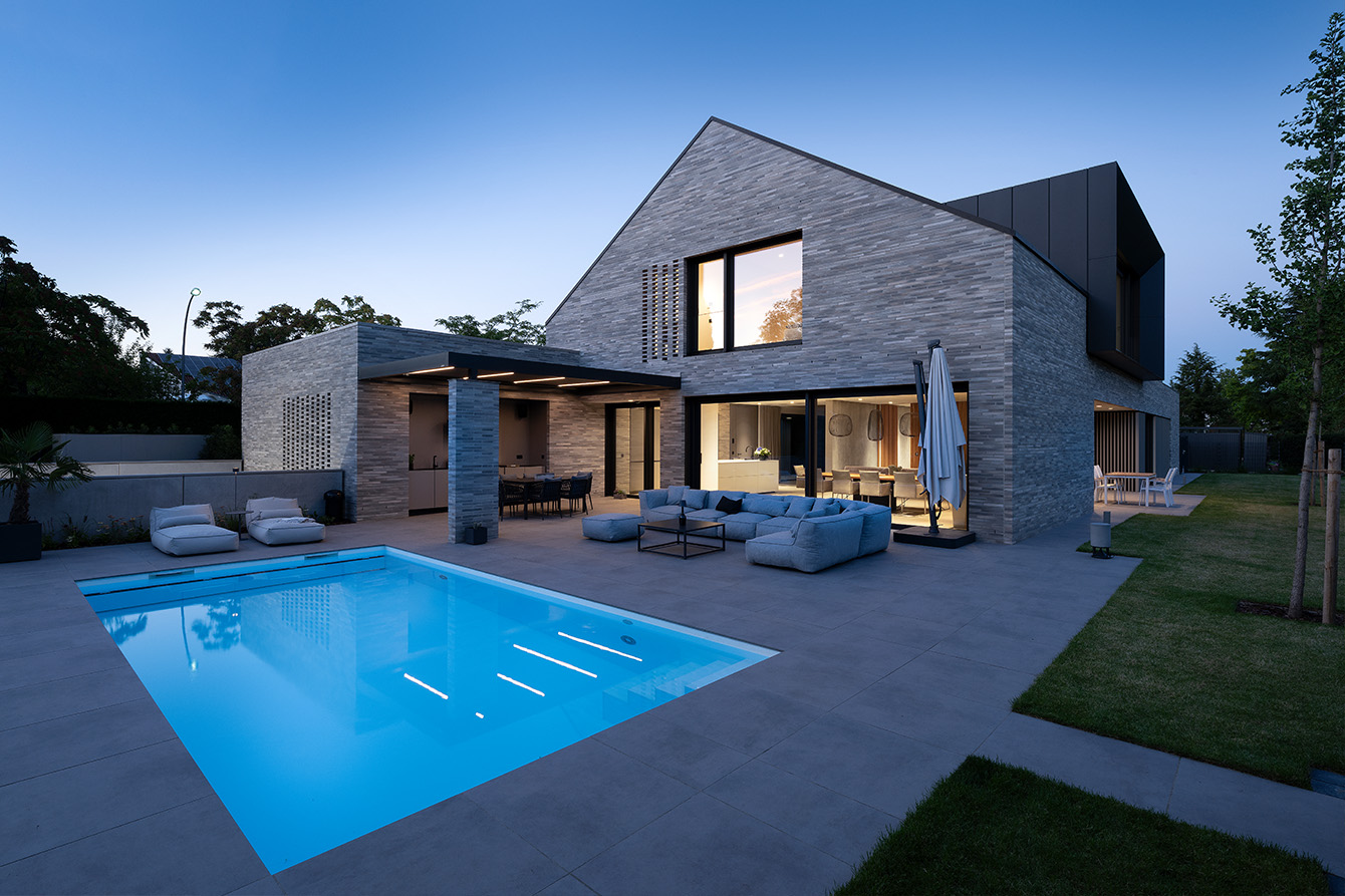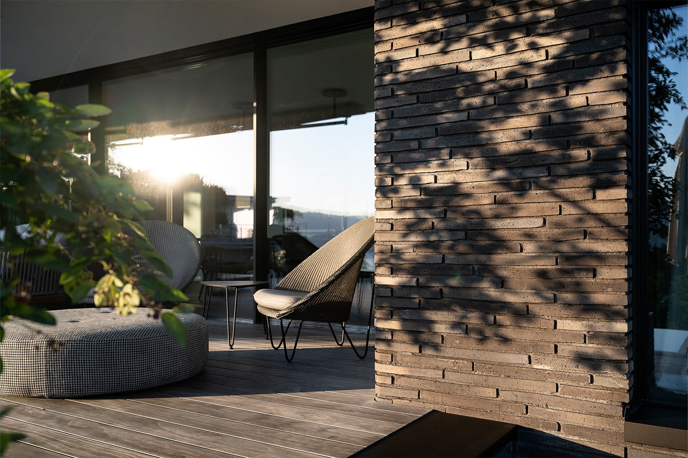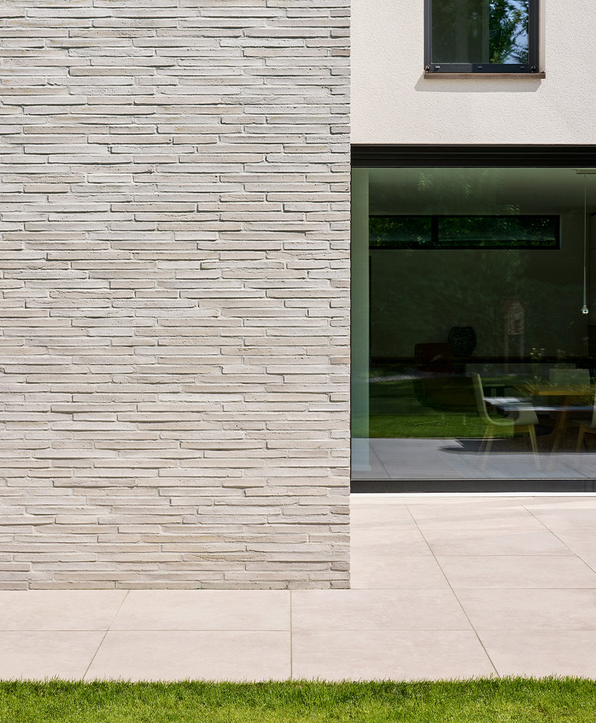 Med Villa K. har bygherrerne i Saarlouis, Tyskland, opfyldt en ægte drøm. Den omhyggeligt designede bygning udstråler tidløs elegance, ikke mindst på grund af det minimalistiske udseende. Langformatstenen ULTIMA RT153 blev i dette projekt også brugt som beklædning på en køkkenvæg indendørs.
