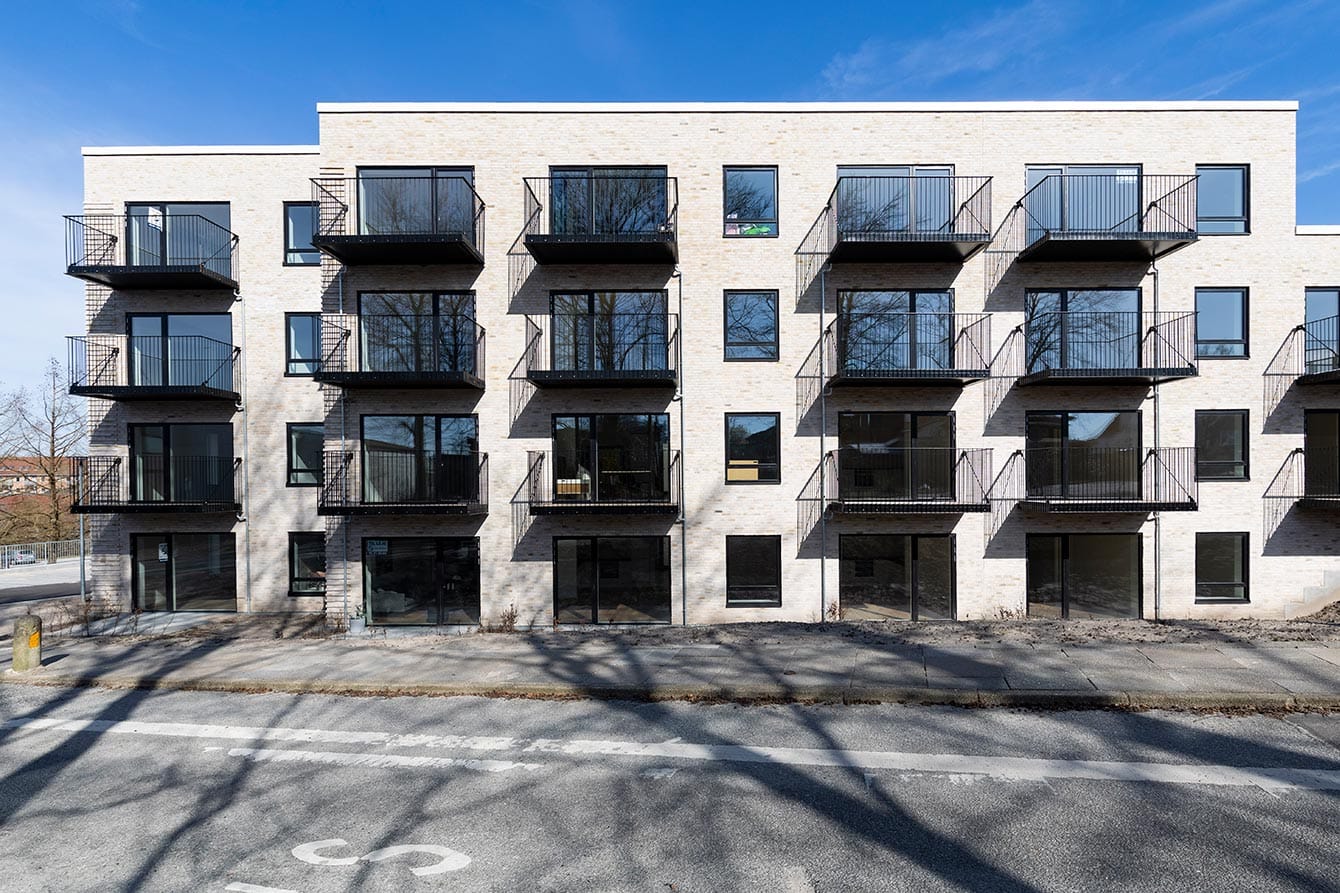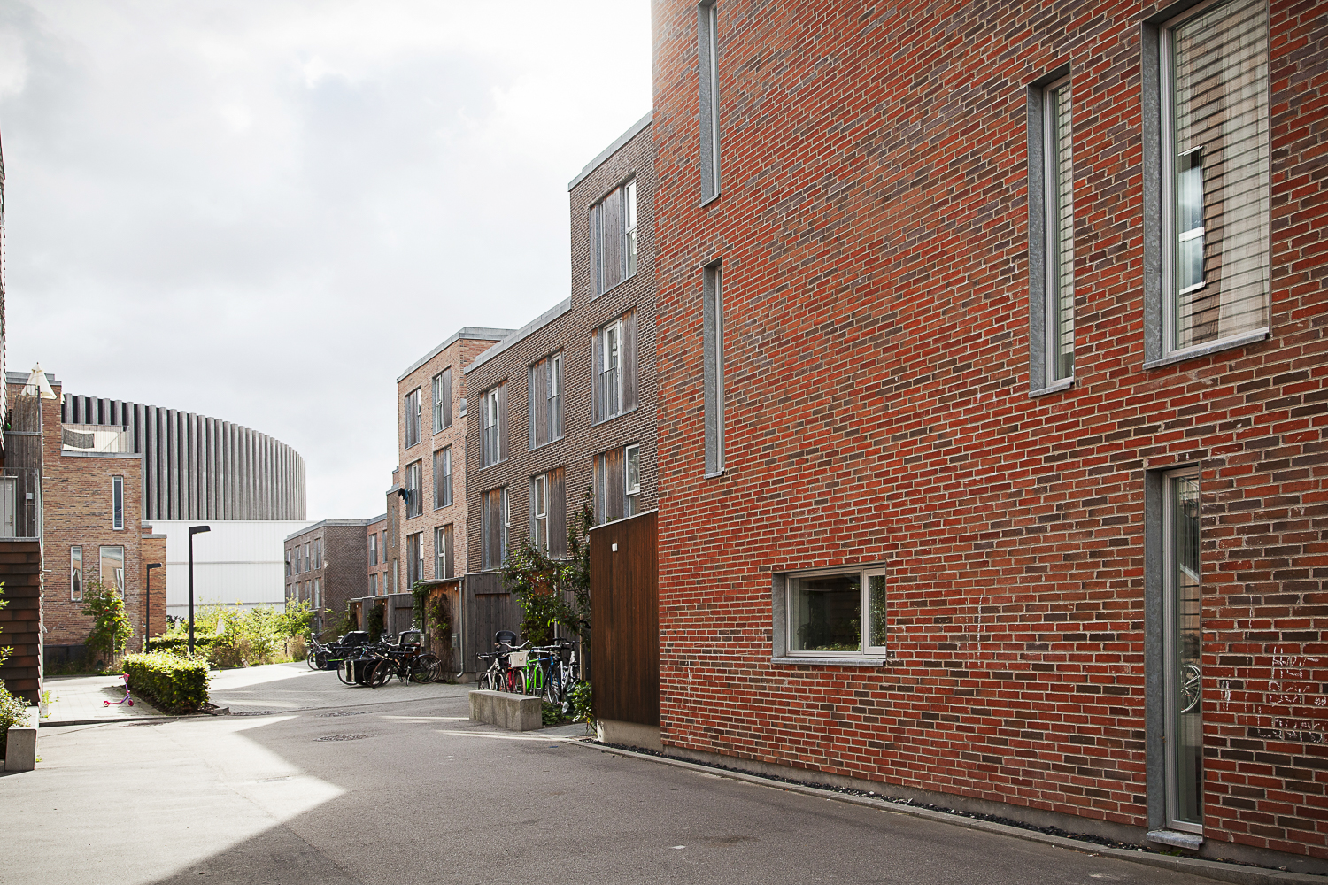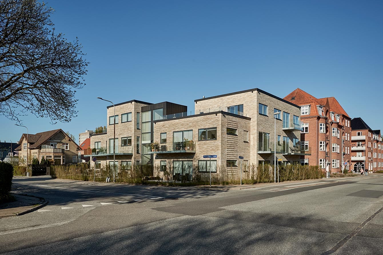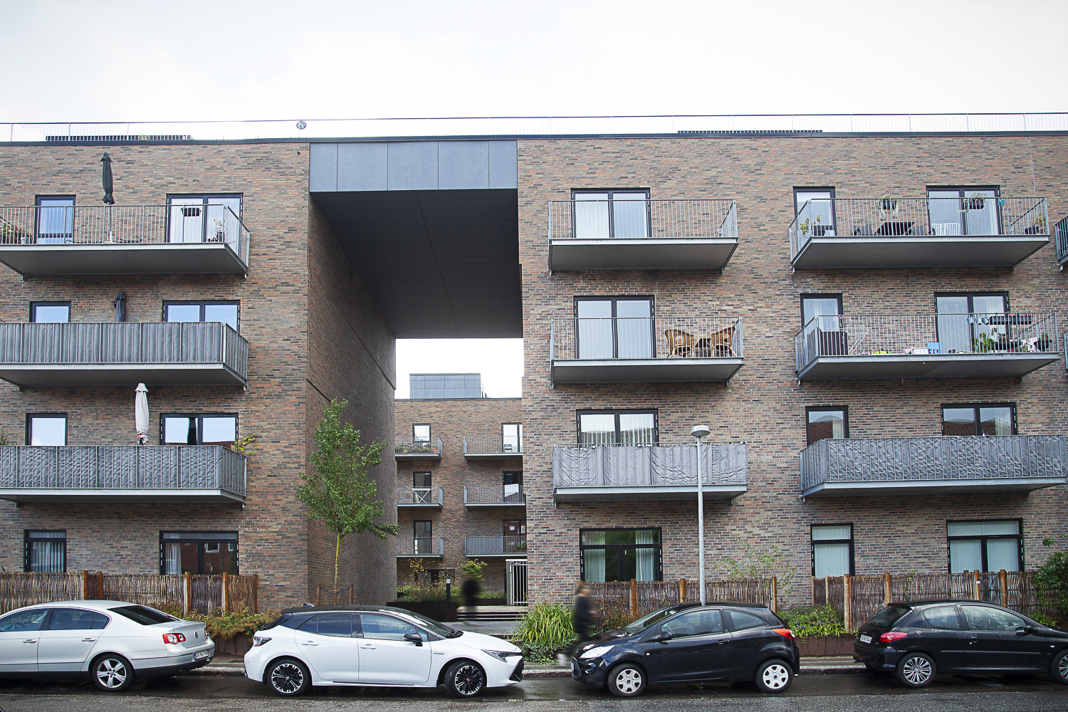 The project on the old skating ridge in Aalborg is located on the border between the old residential quarter with masonry villas from the 1920s along Bernstorffsgade and the Øgade district's 4-5-story long-houses from 1940-50s. The houses facing Bernstorffsgade are laid out as separate villas with their own carport, roof terrace and outdoor living spaces. In selected locations, relief masonry, along with balconies and window sections provide a facade variety and a human scale.