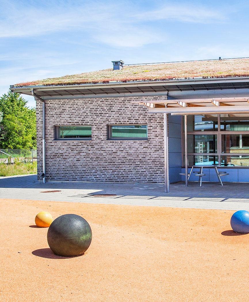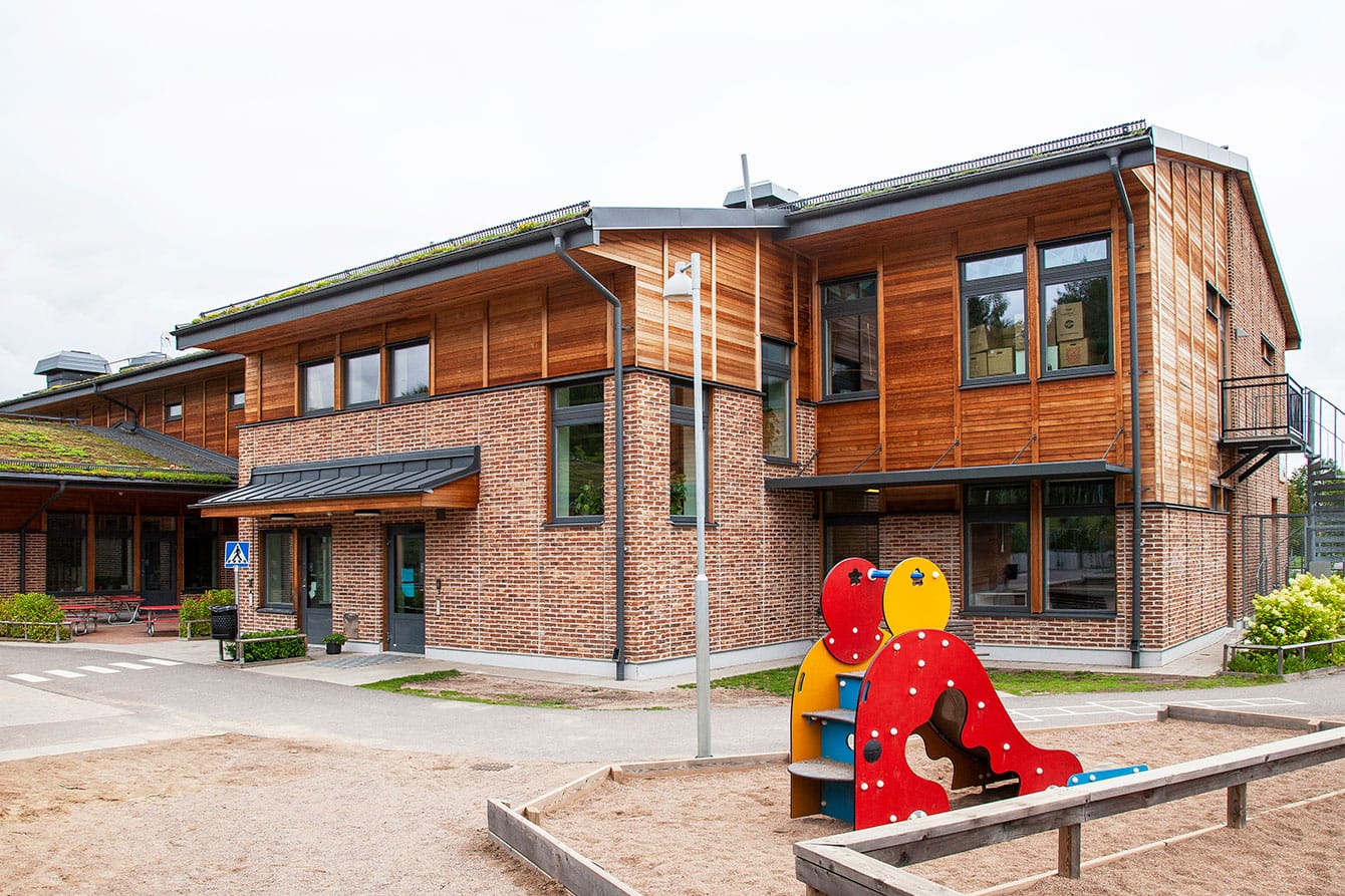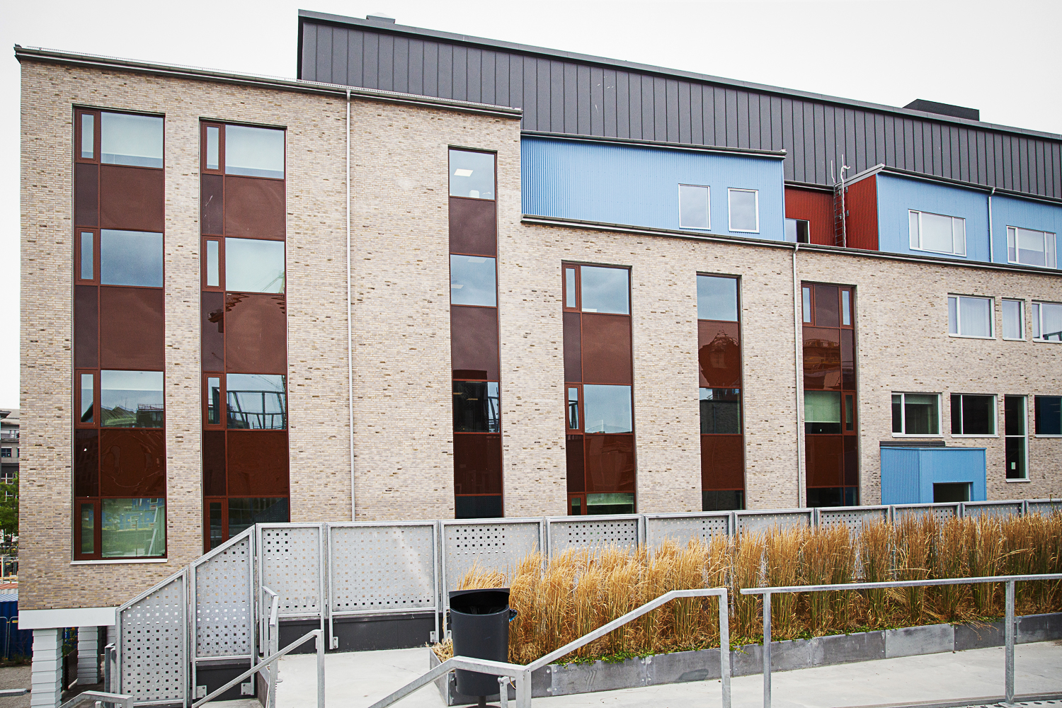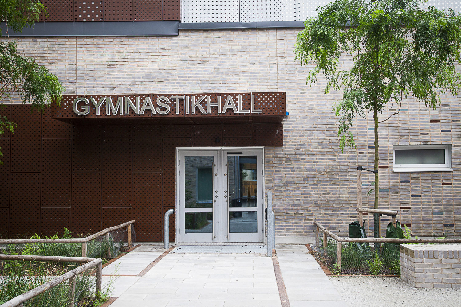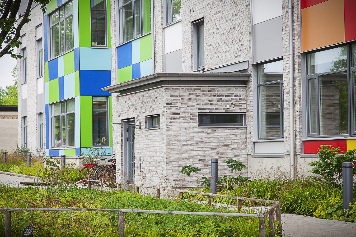 This Swedish public school has a colourful courtyard for those hectic recesses. The details in the masonry and brick alignment show what can be done to make the façade look so much more exciting.