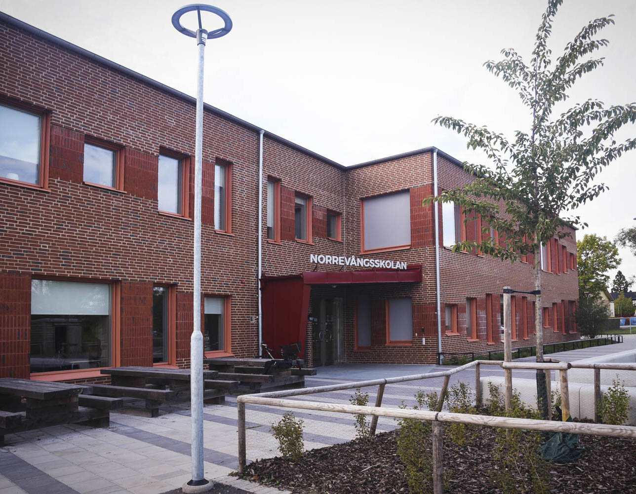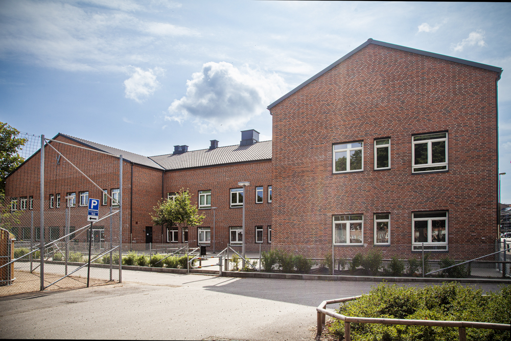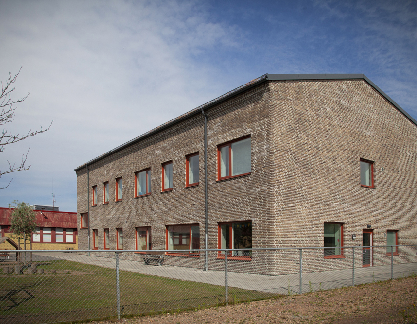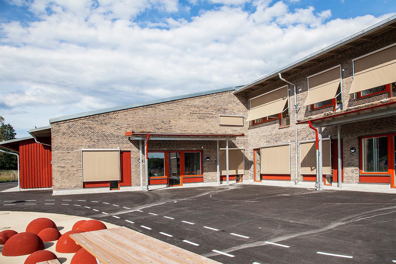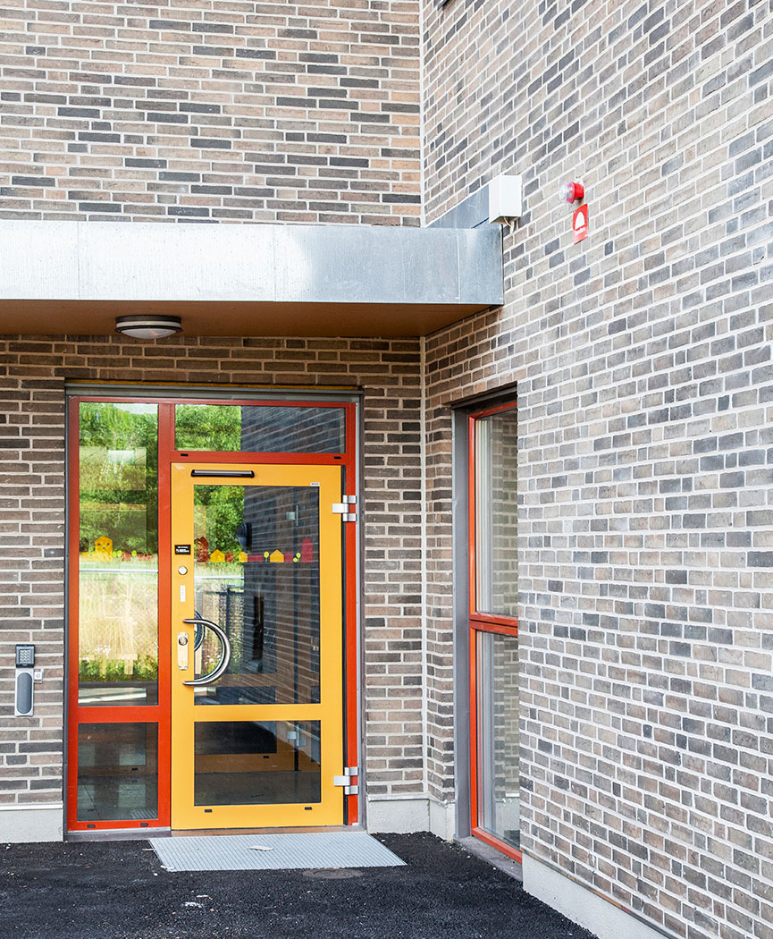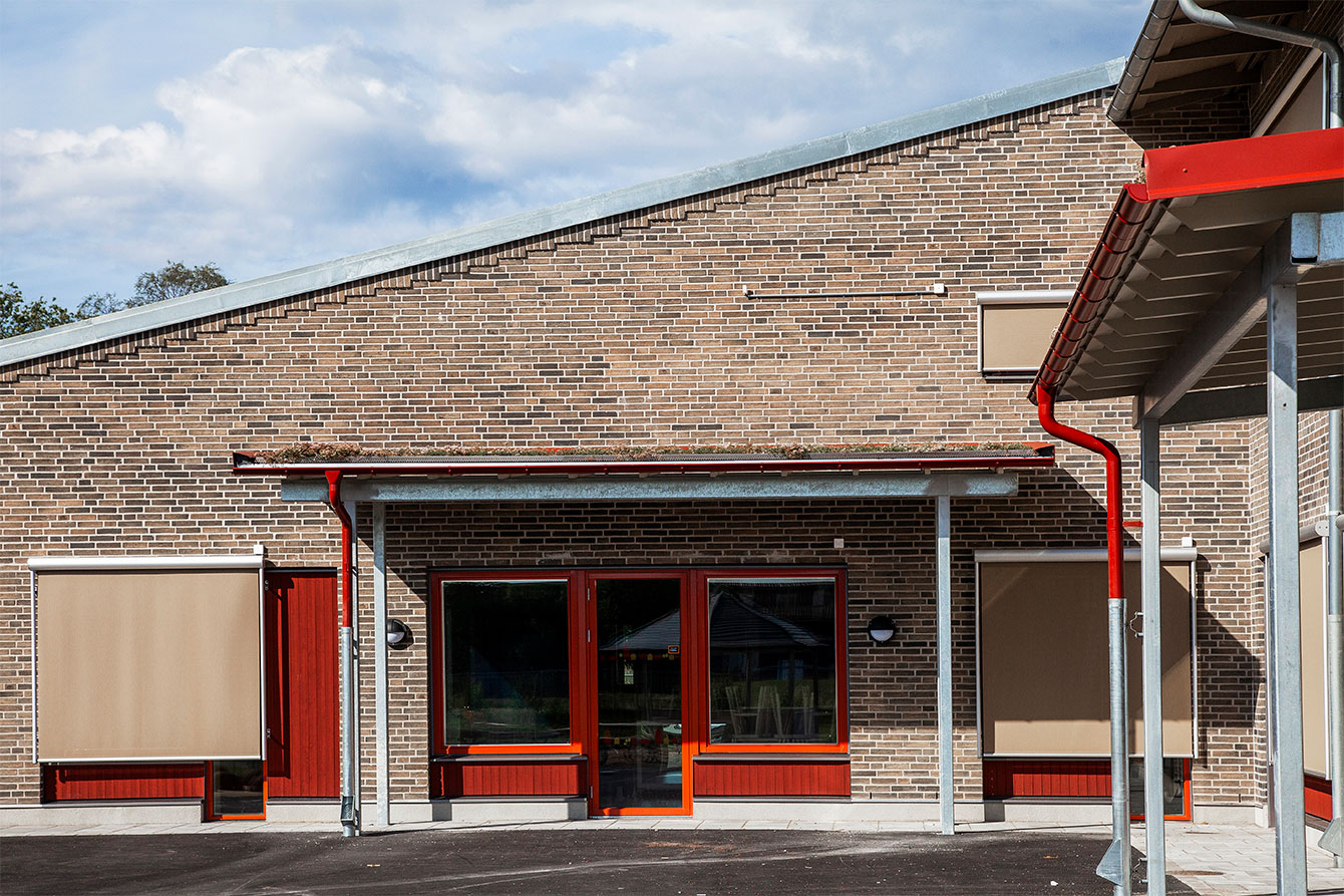 This Swedish public school has a colourful courtyard for those hectic recesses. The details in the masonry and brick alignment show what can be done to make the façade look so much more exciting.