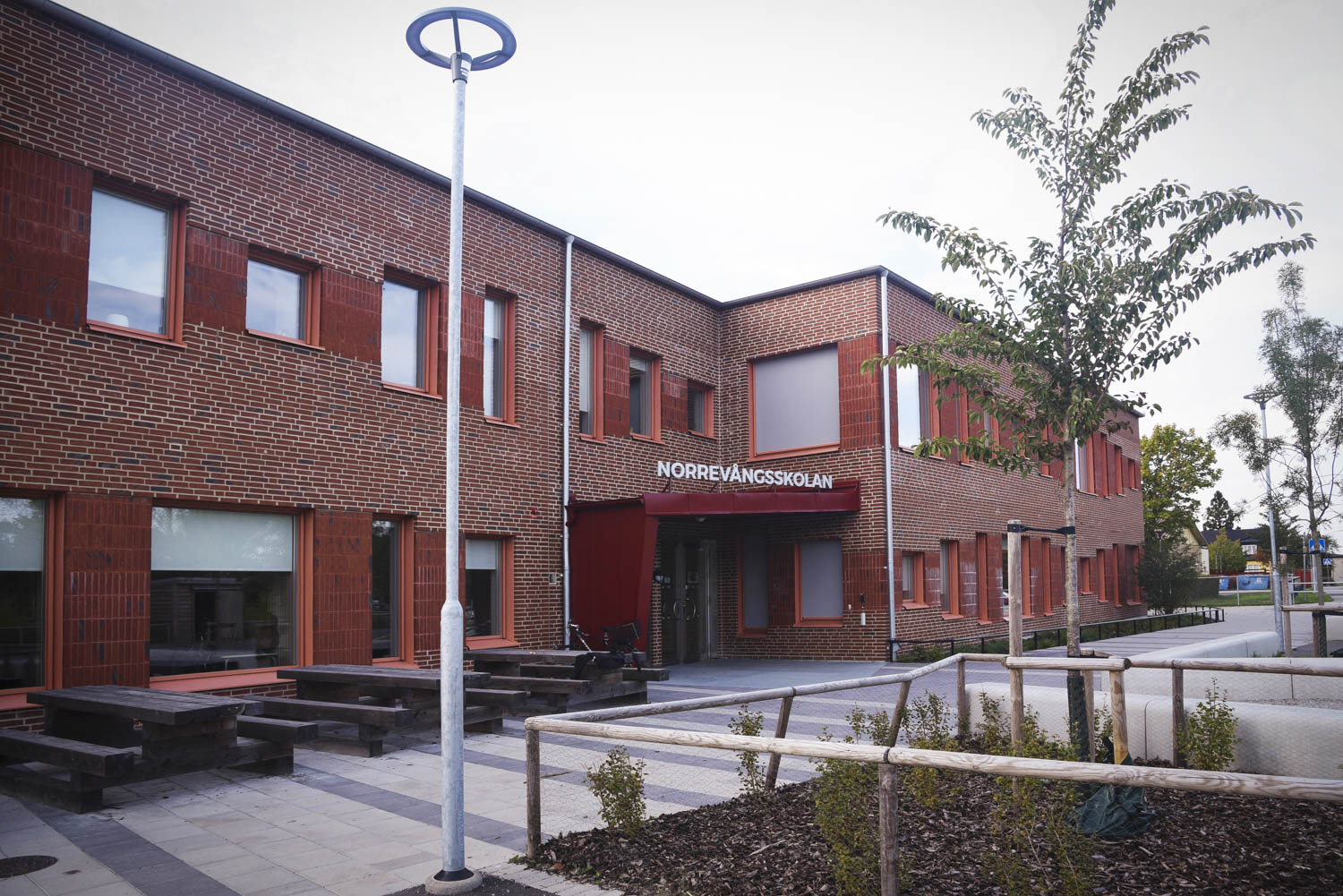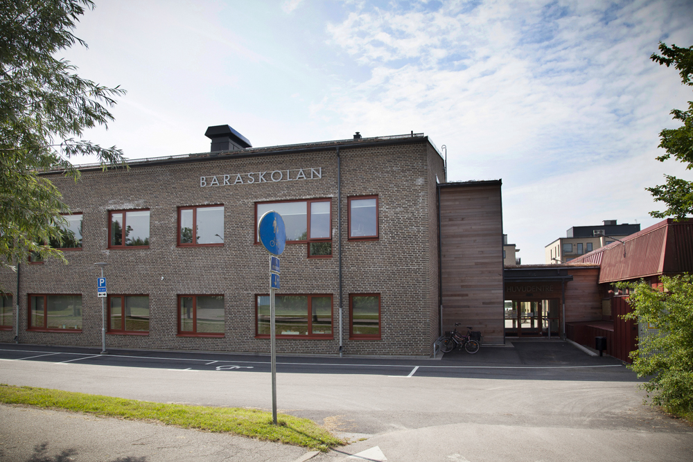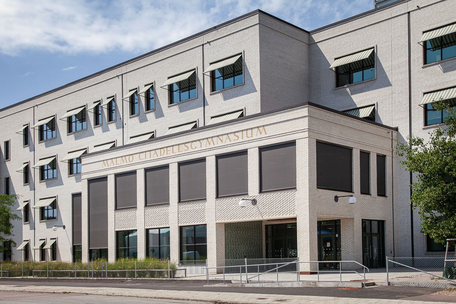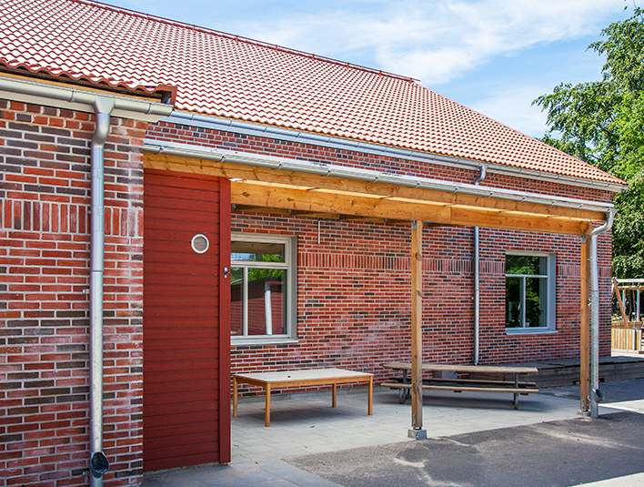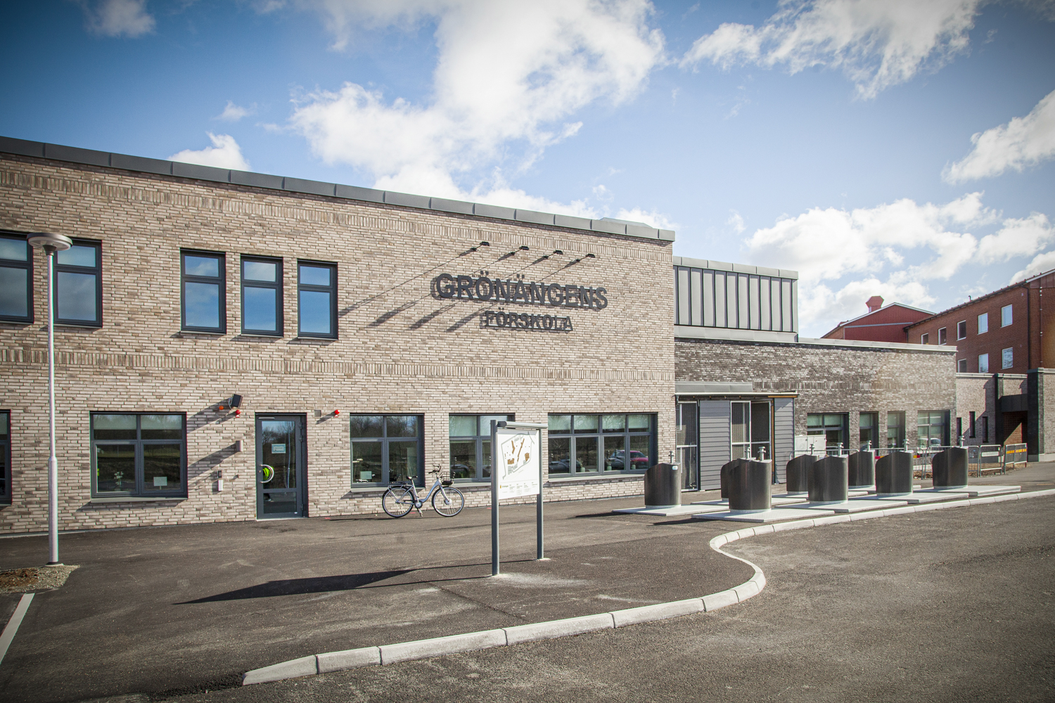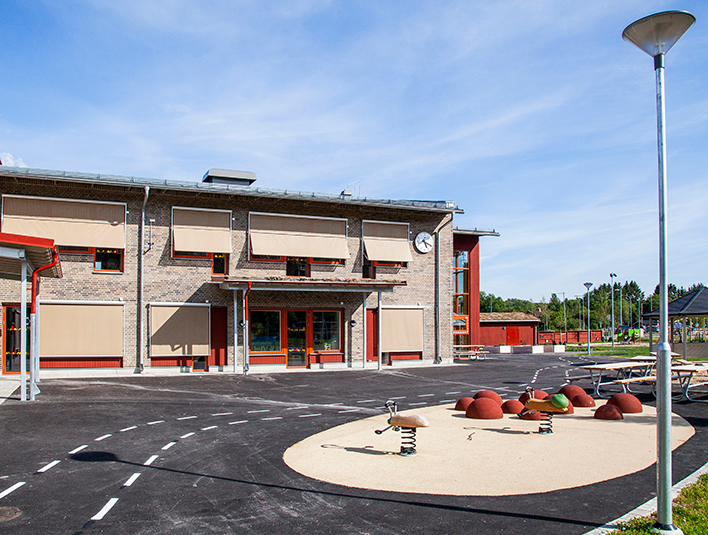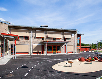 This Swedish public school has a colourful courtyard for those hectic recesses. The details in the masonry and brick alignment show what can be done to make the façade look so much more exciting.