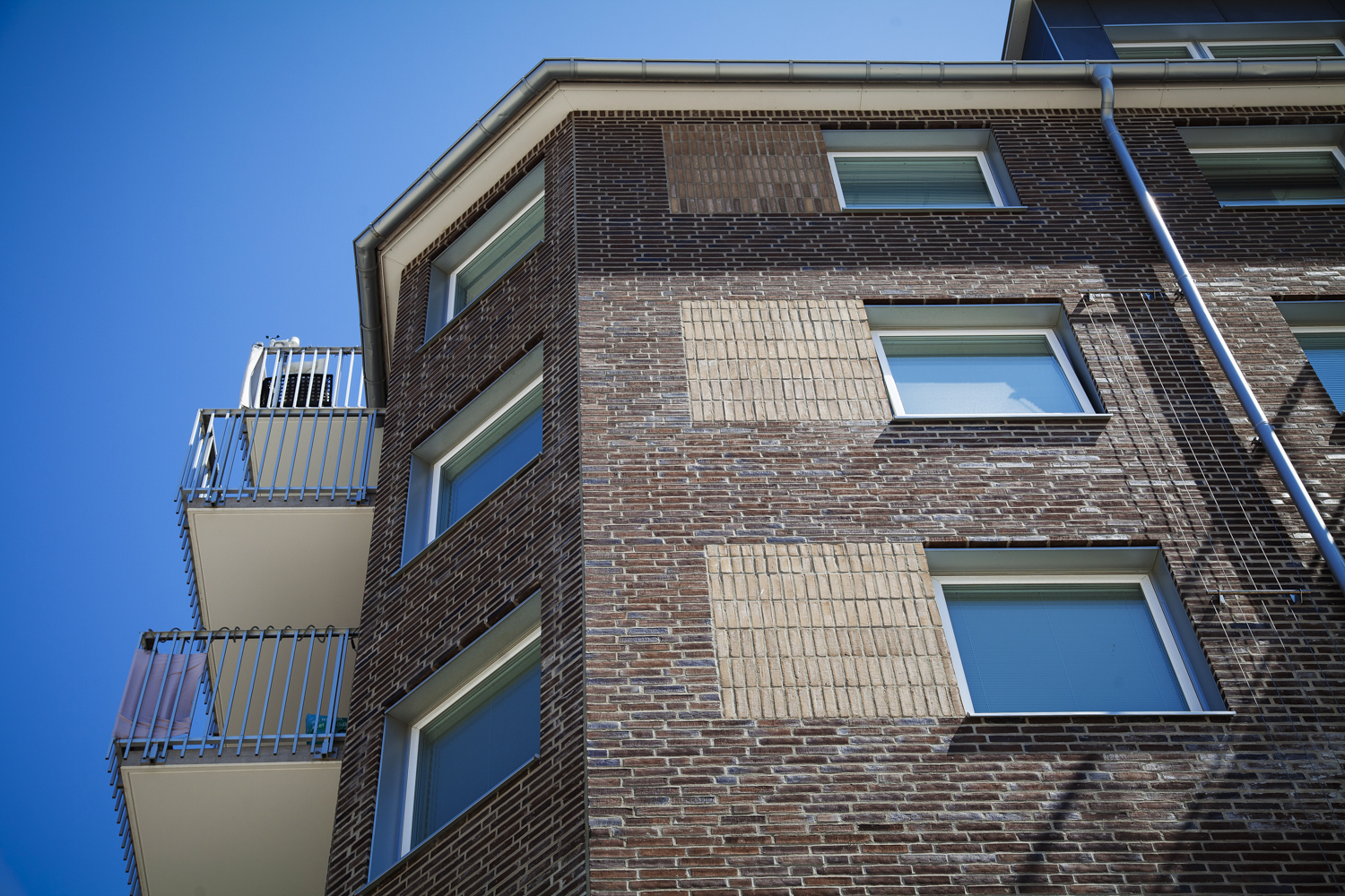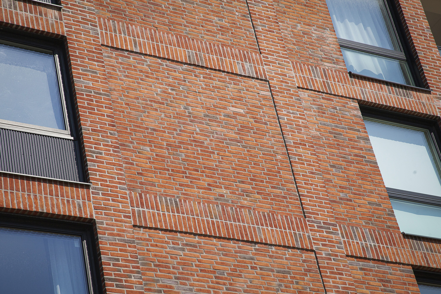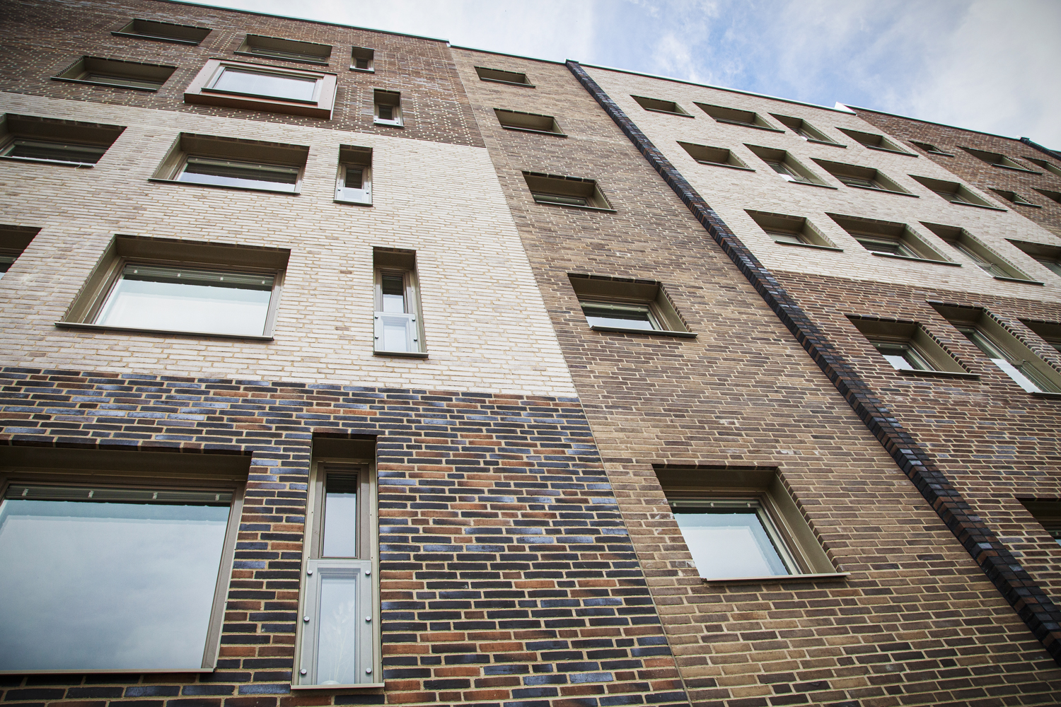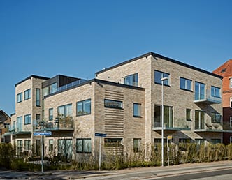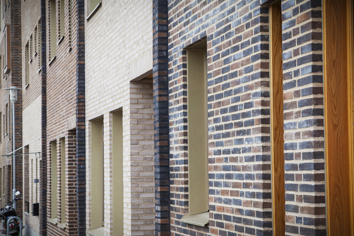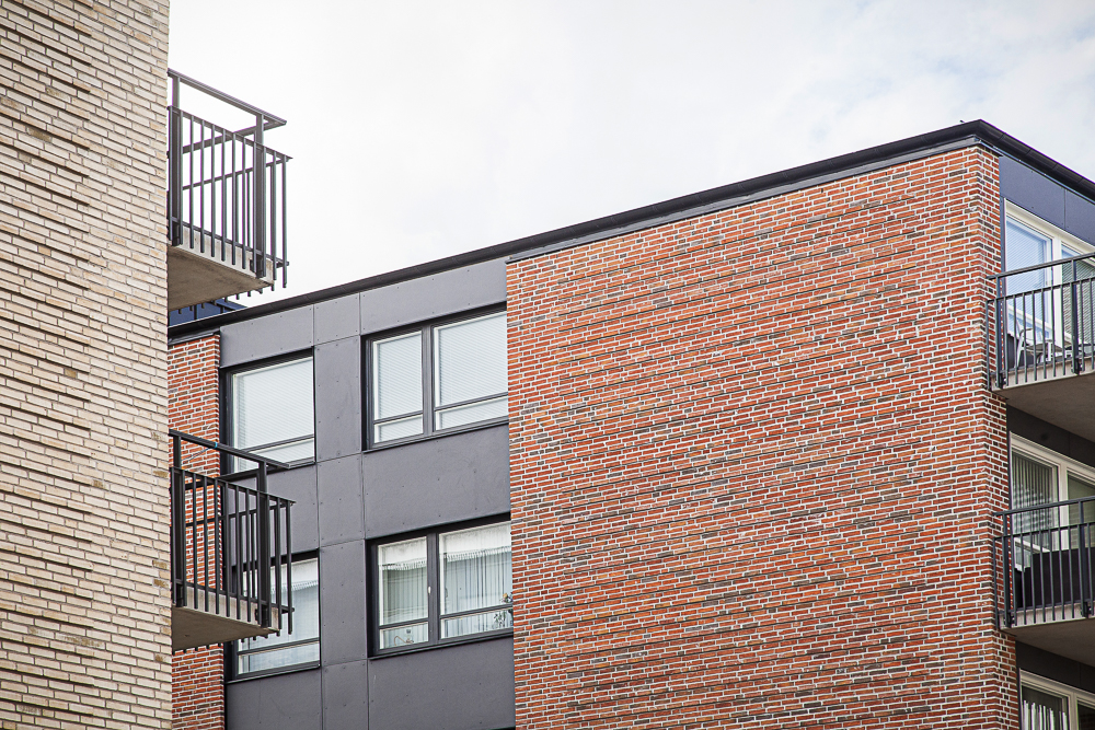 Block of apartment building in three different brick colours with each its distinctive expression. Matching colours and exciting masonry in the façade make these city apartments blend in an architectural sense, despite the different colours.
