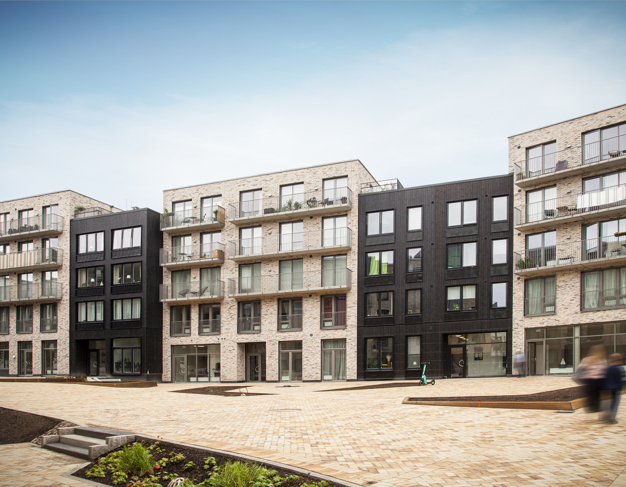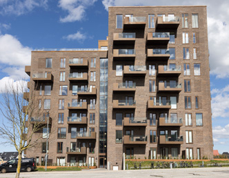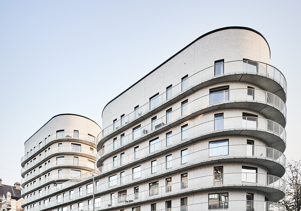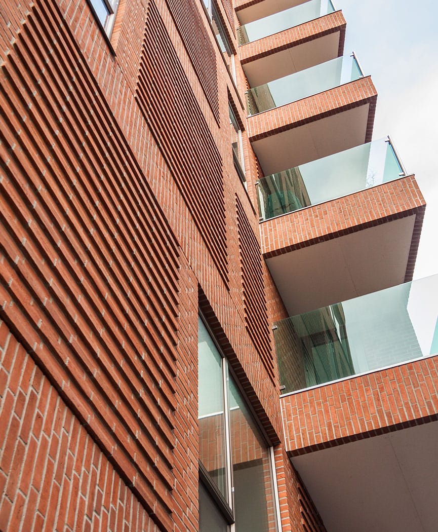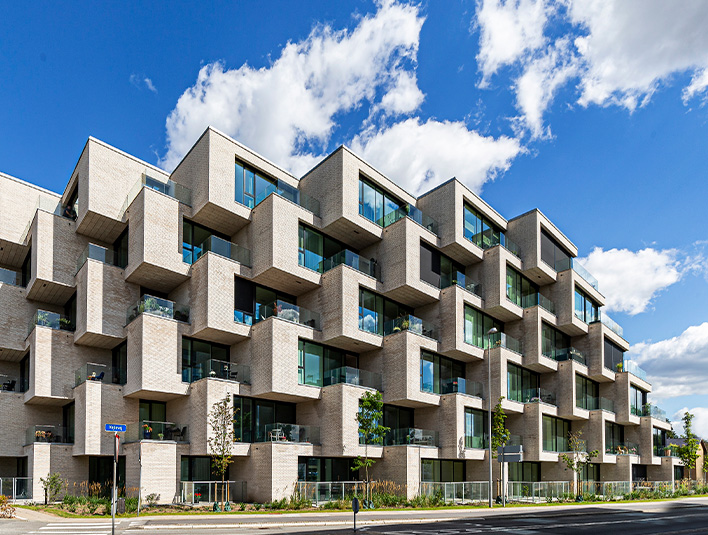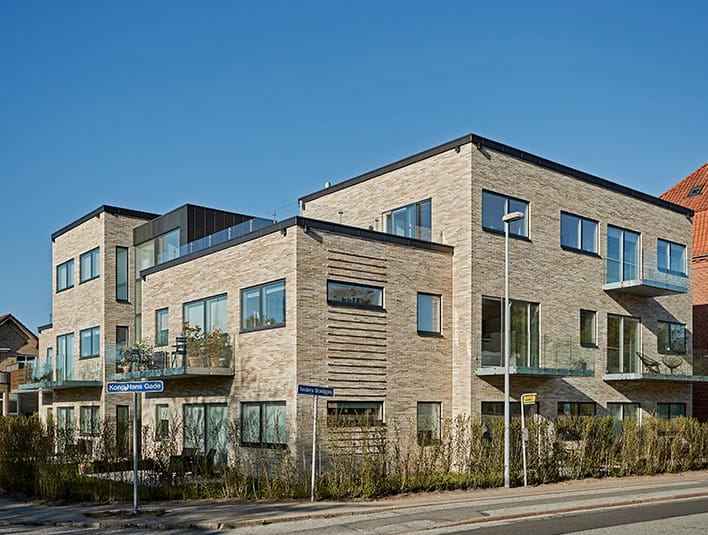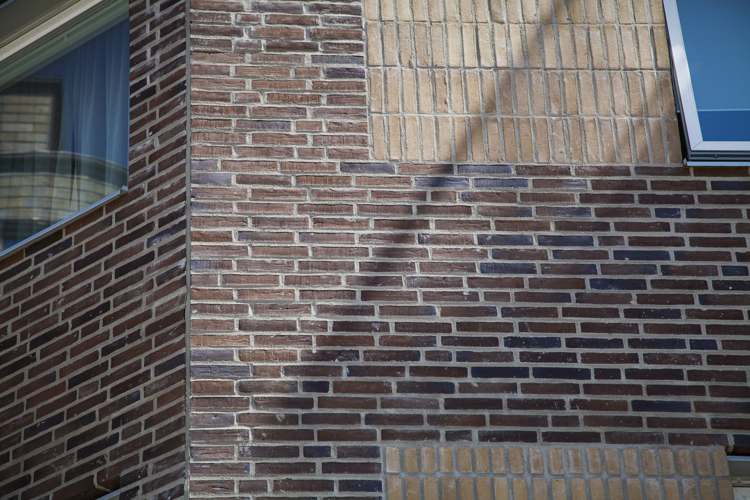 Block of apartment building in three different brick colours with each its distinctive expression. Matching colours and exciting masonry in the façade make these city apartments blend in an architectural sense, despite the different colours.