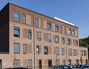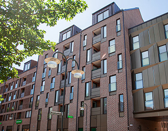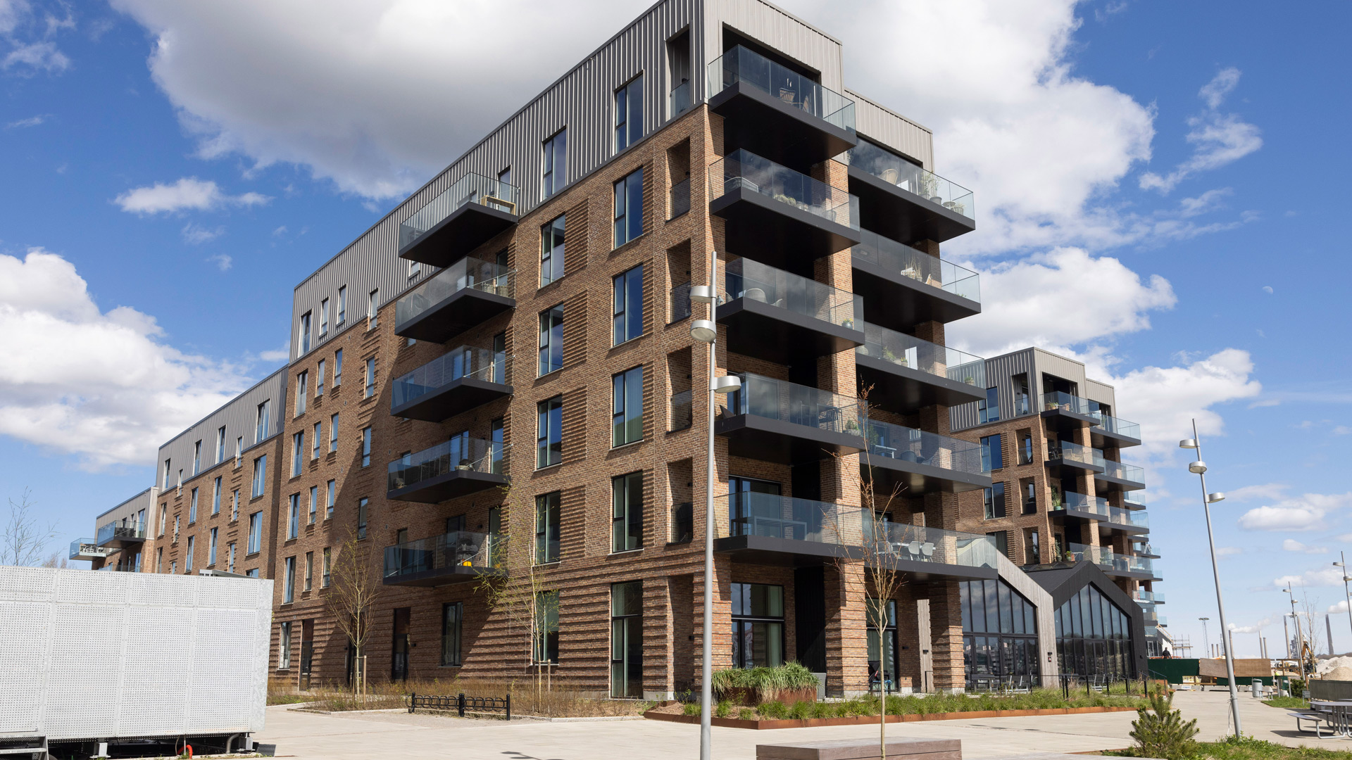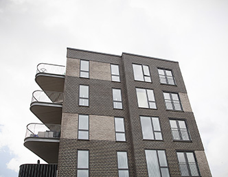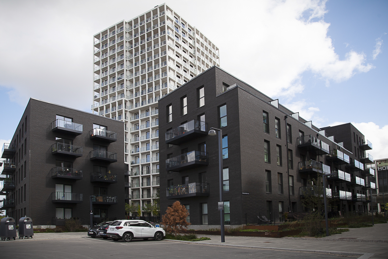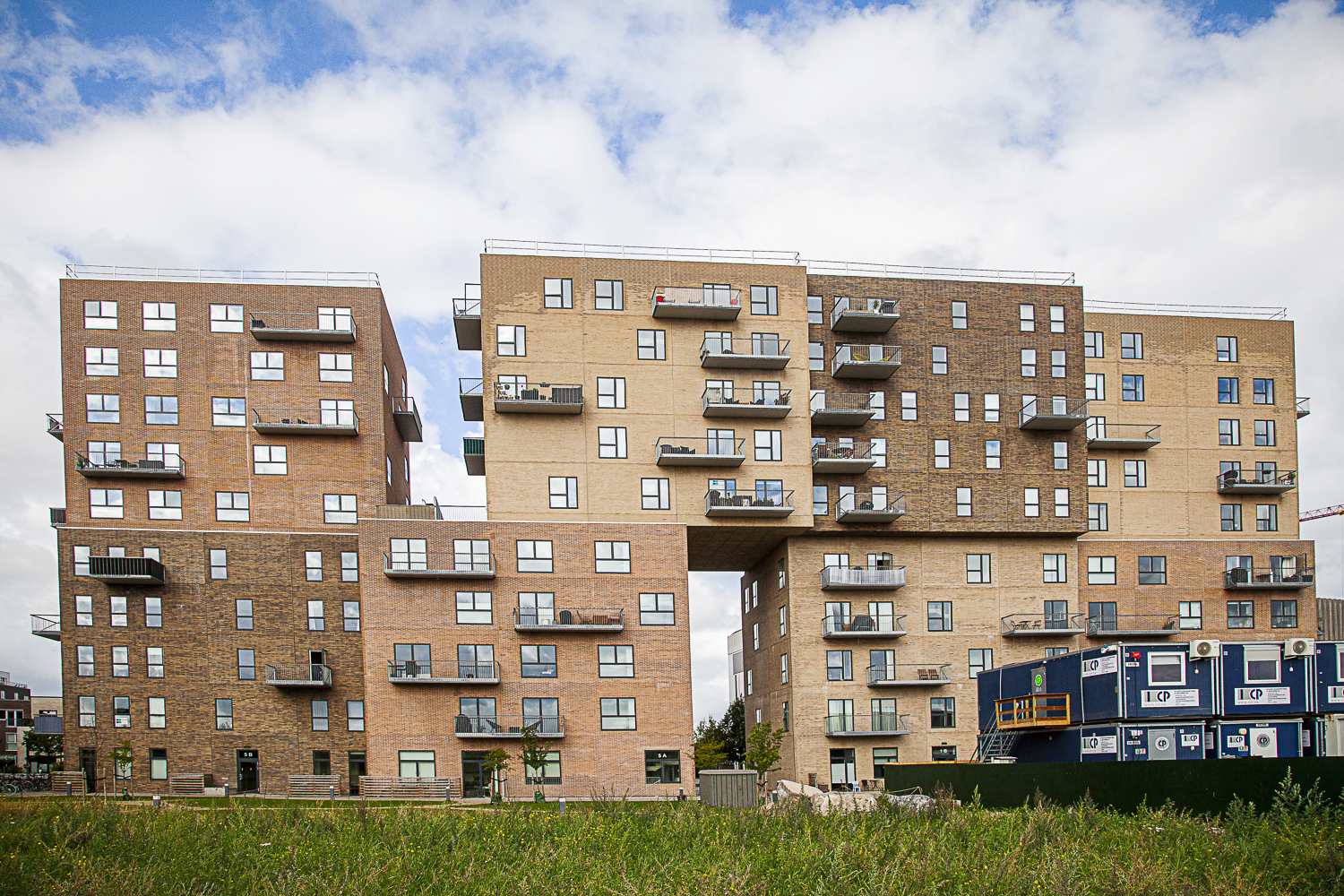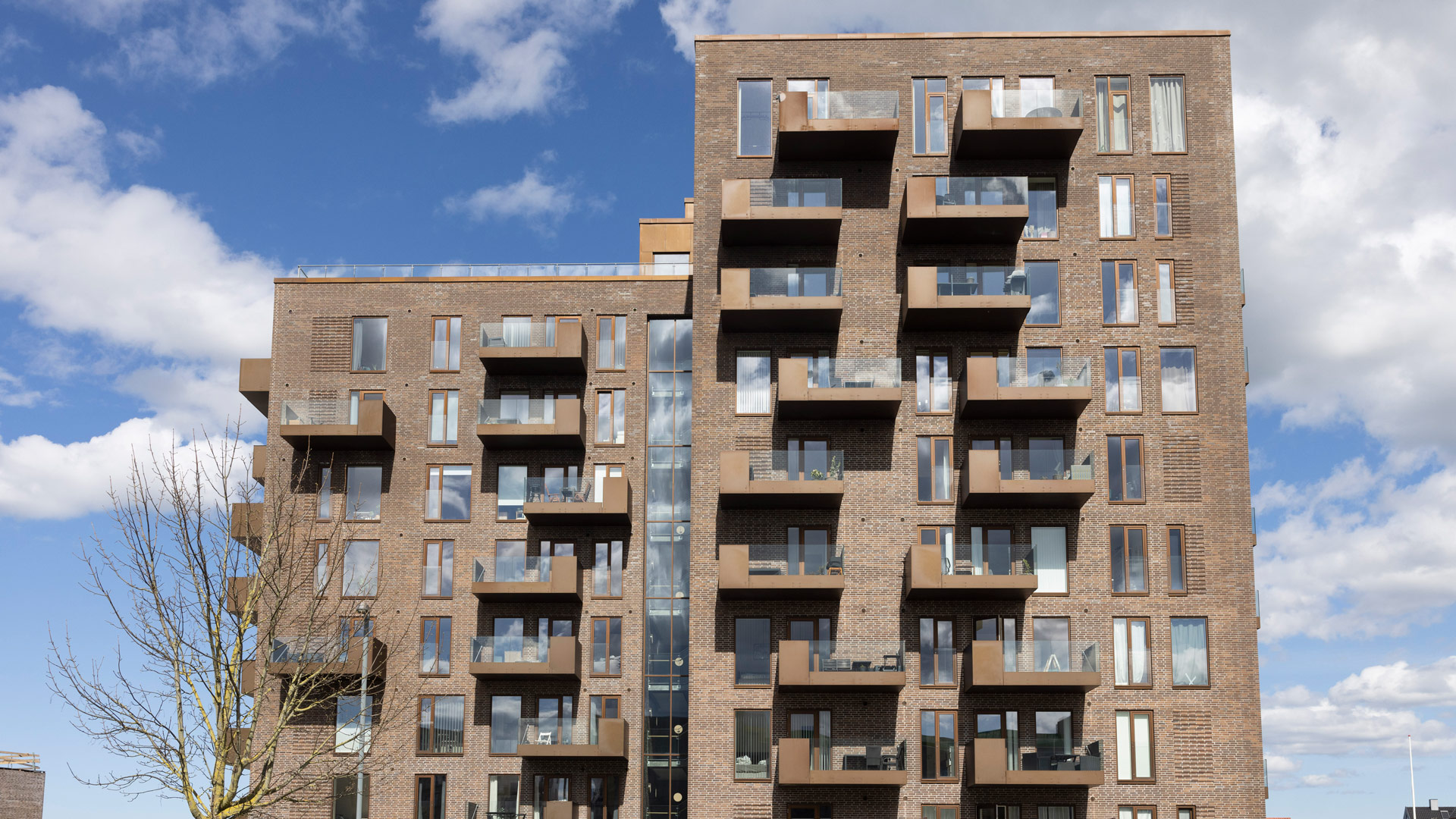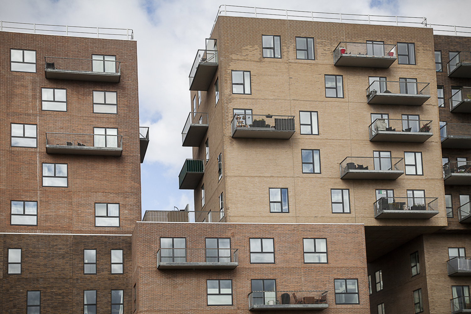 Block of apartment building in three different brick colours with each its distinctive expression. Matching colours and exciting masonry in the façade make these city apartments blend in an architectural sense, despite the different colours.