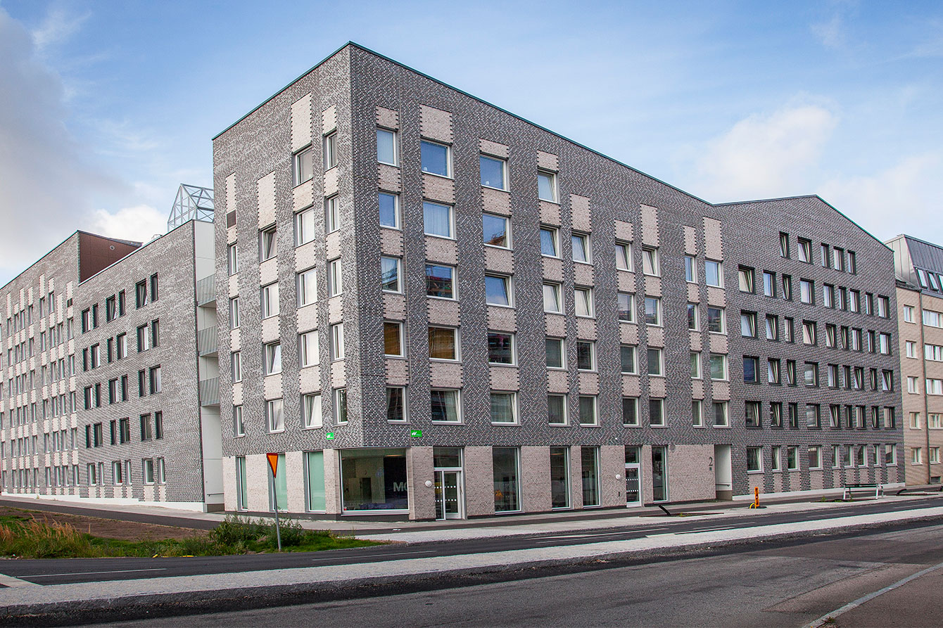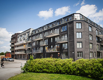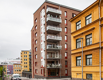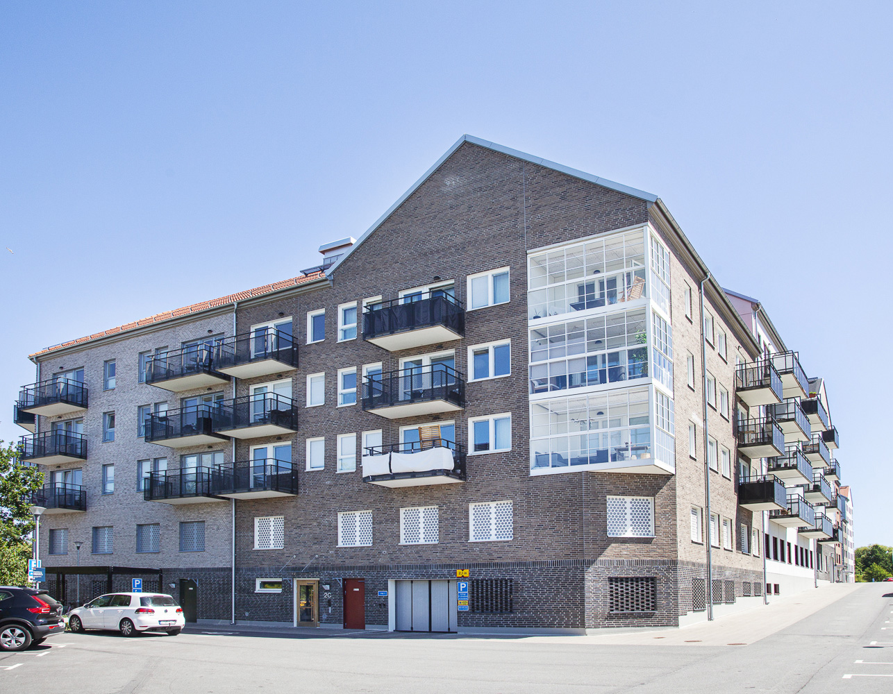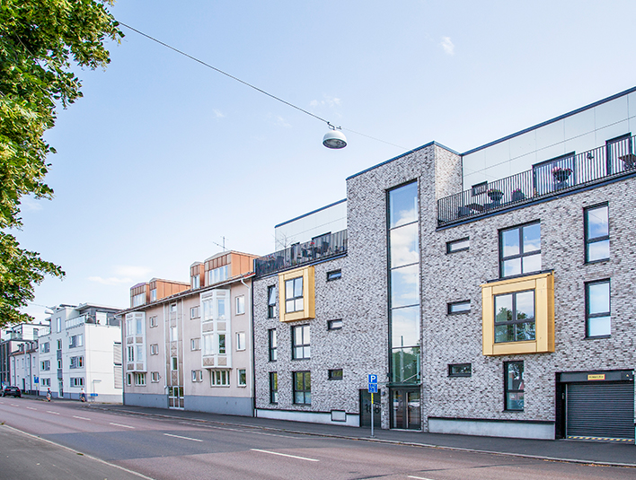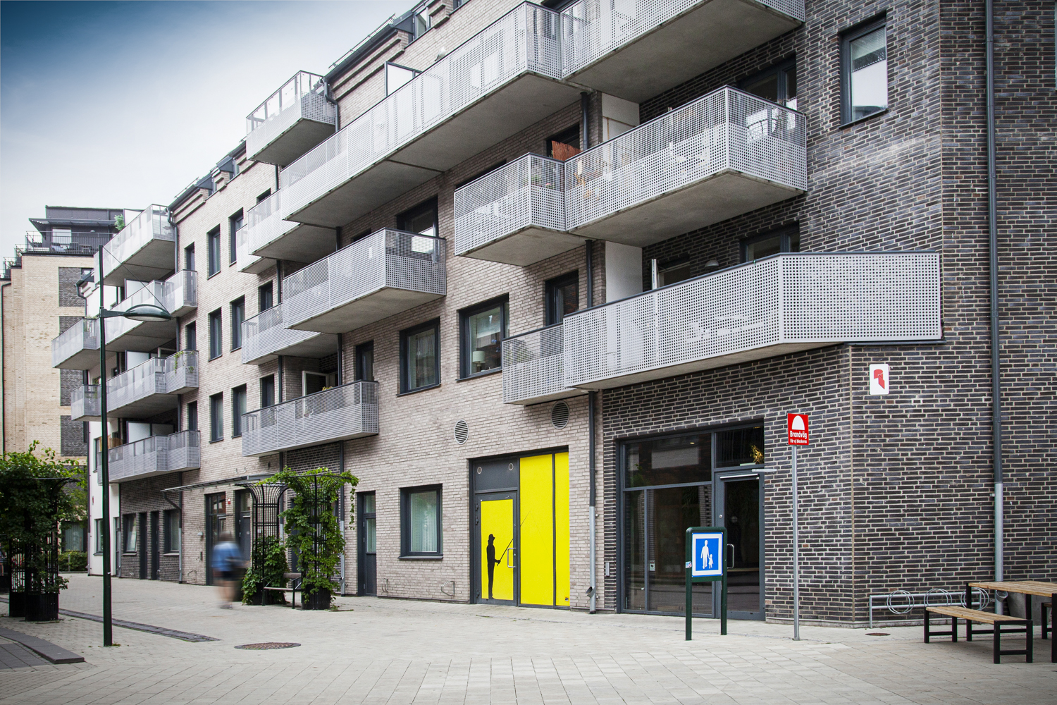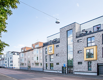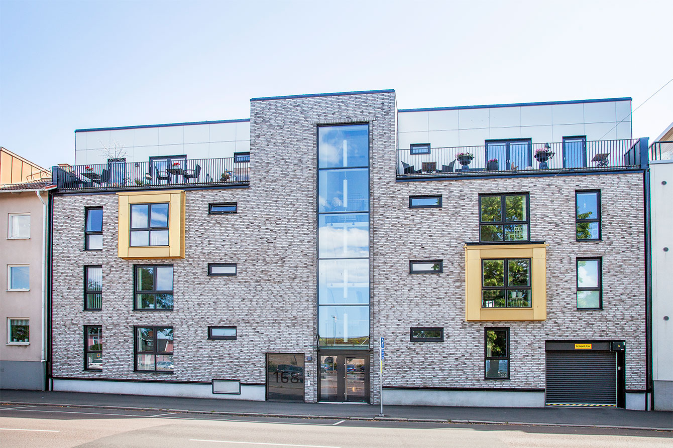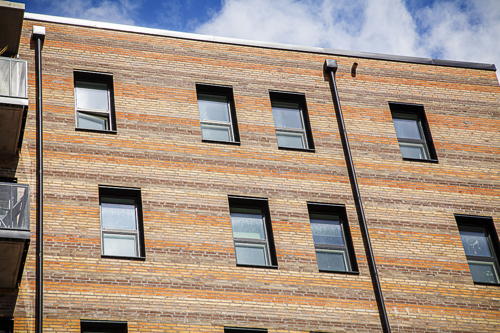 In the centre of Norrköping you’ll find these apartments where the architect has used the various colours and textures in the bricks to create the characteristics of the façade. The contrast between black and yellow is a bold touch that creates profound character for this unique building.
