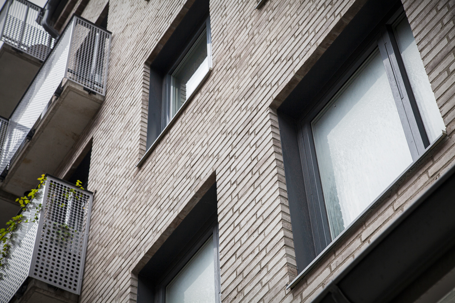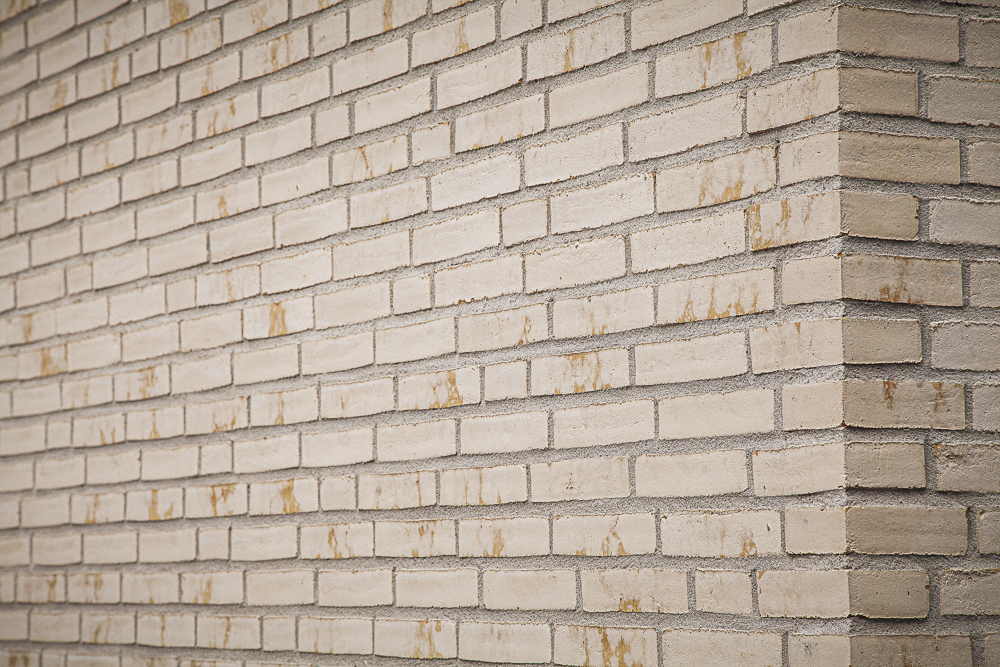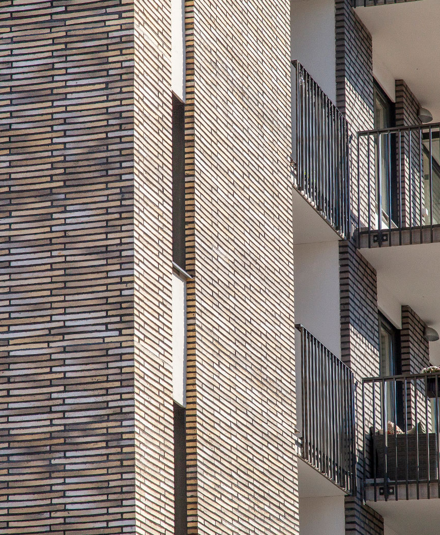 These harmonic apartments are located in the Wilrijk-district of Antwerpen. By combining Unika Helios’ gloomy flare with golden metallic frames for windows and balconies, the façade resonates with warmth and white-gold-elegance. The water struck brick’s yellow softness, white engobe and varying coal burns create a fine rhythm to the brickwork. Subtracted windows in brick frames and subtracted mortars add delicate touch too.
