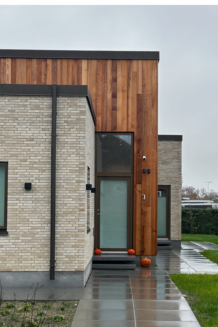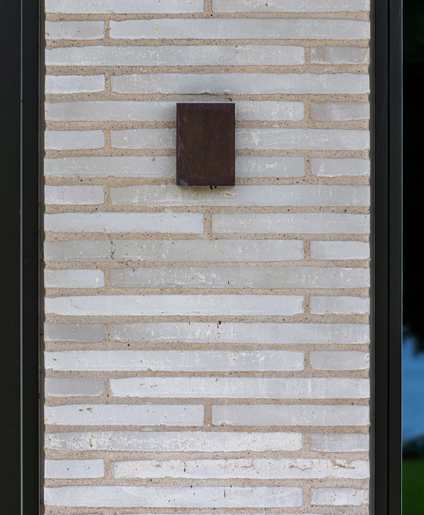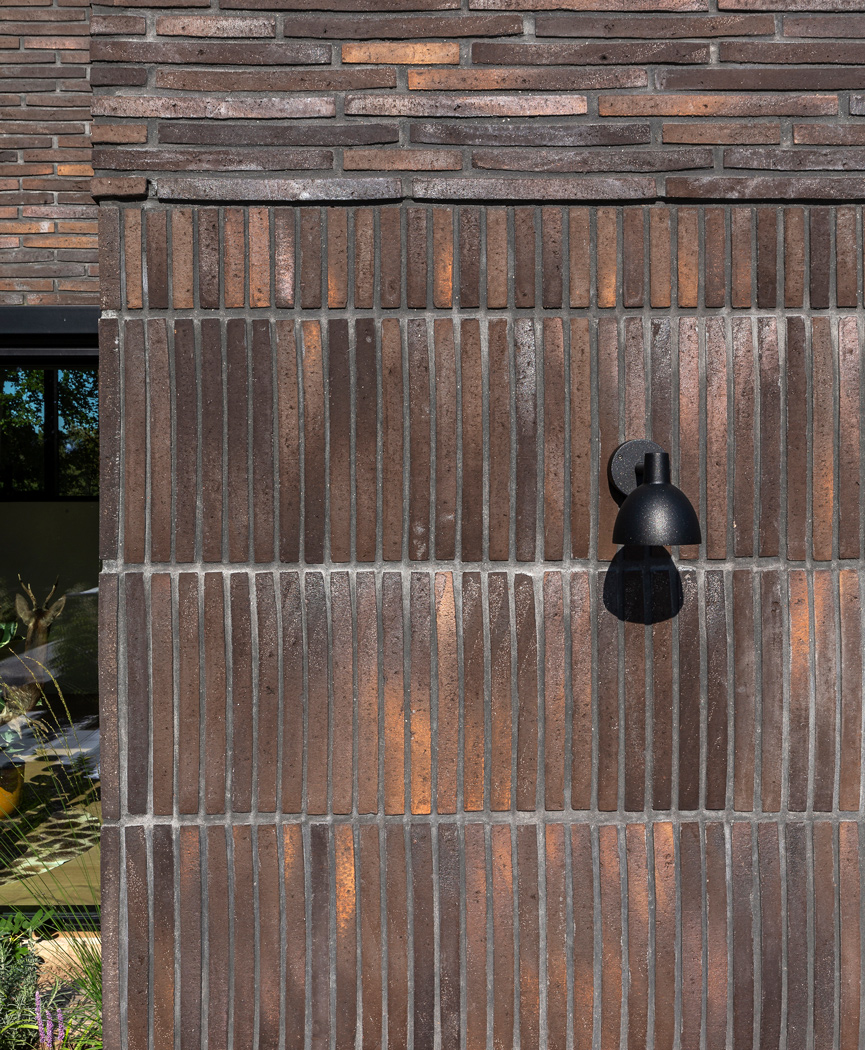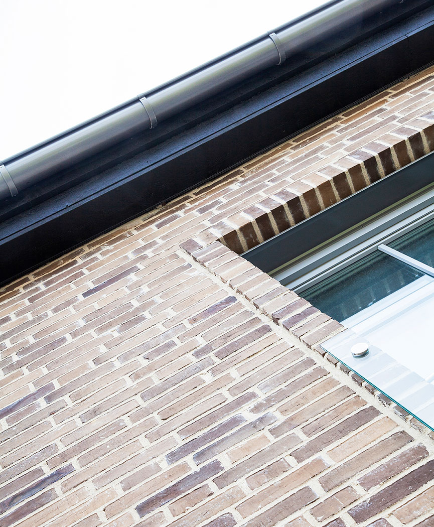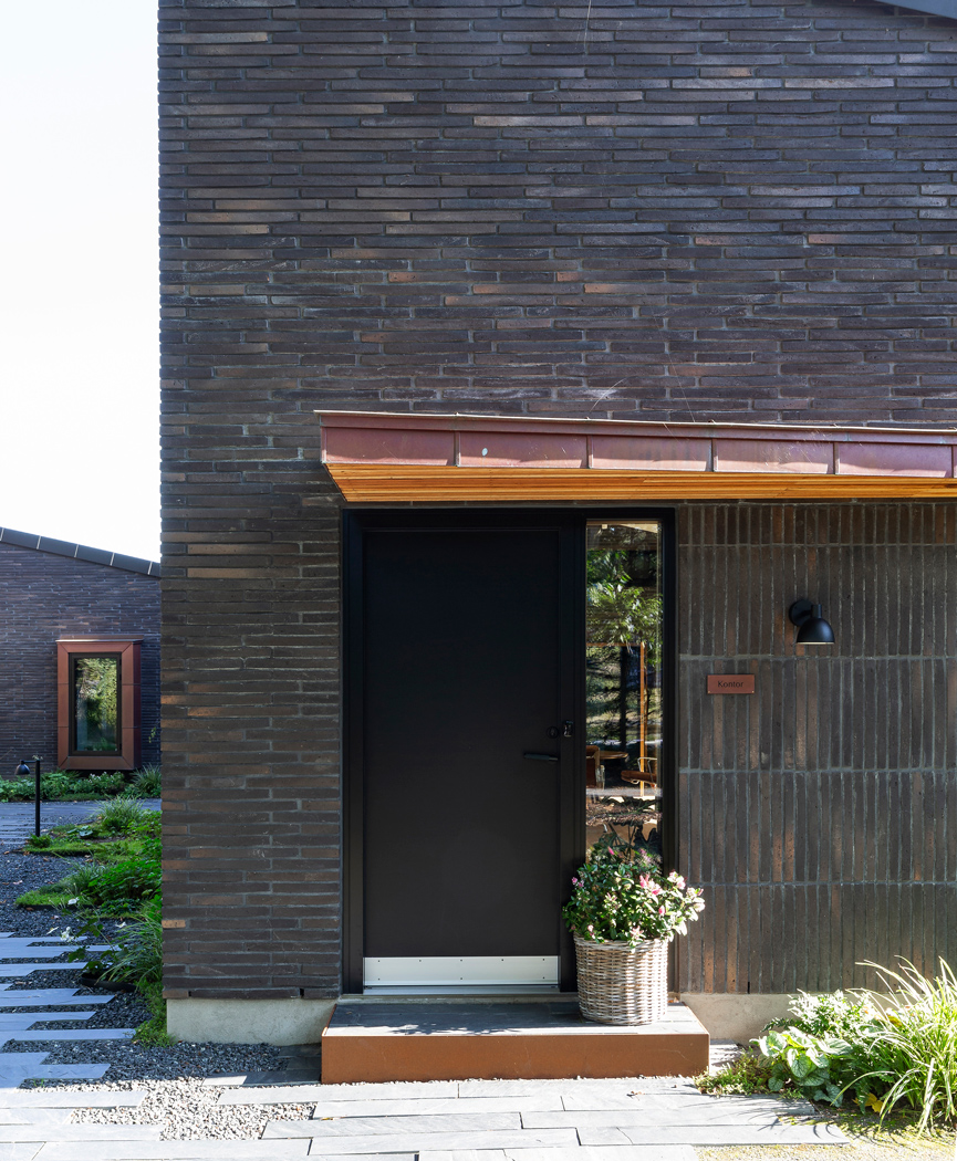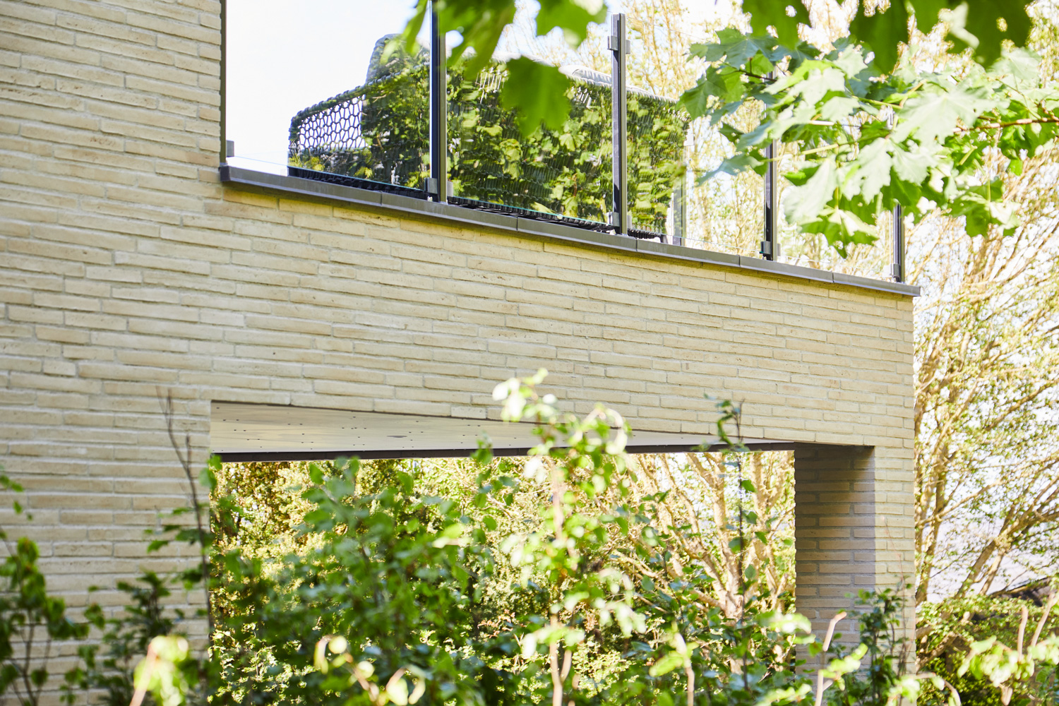 The bricks are light-tinted with a raw and coarse touch that adds a sand-coloured diversity to the finished masonry. The slightly retracted masonry joints have been chosen to bring out the brick’s rustic surfaces even more. This detail rich façade plays elegantly with panels lined with pre-patinated copper cladding and obliquely cut hardwood cladding on the front door and garage doors. A symphony of warm and natural materials that blends in perfect symphony.