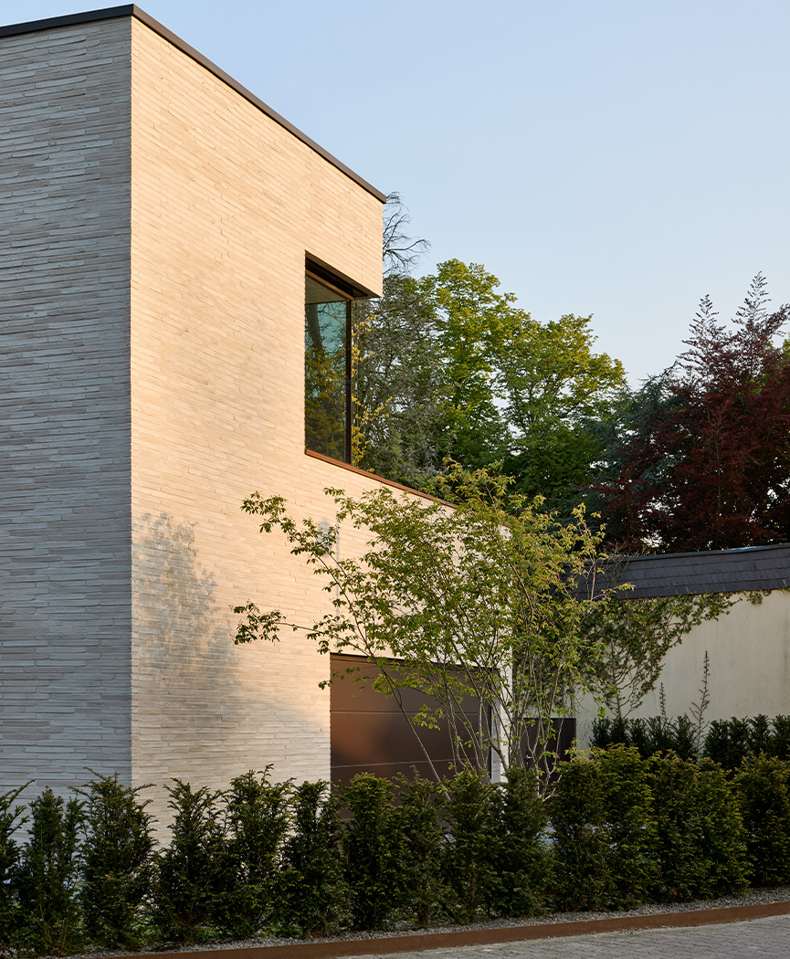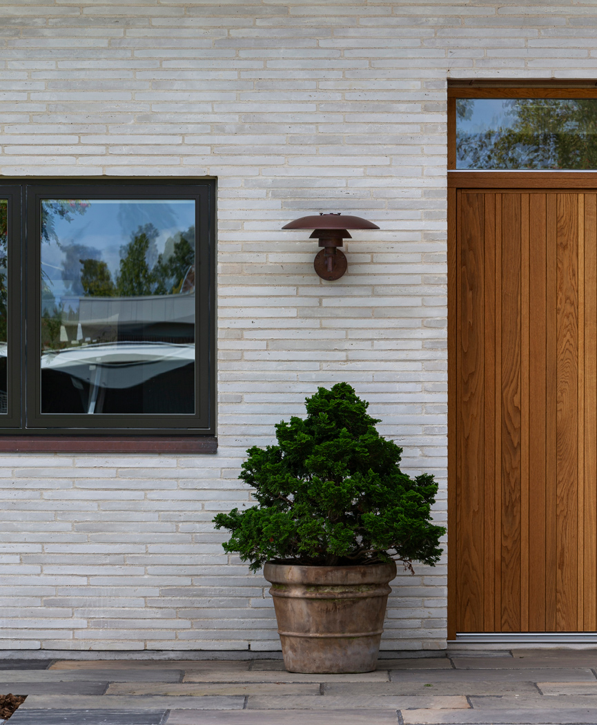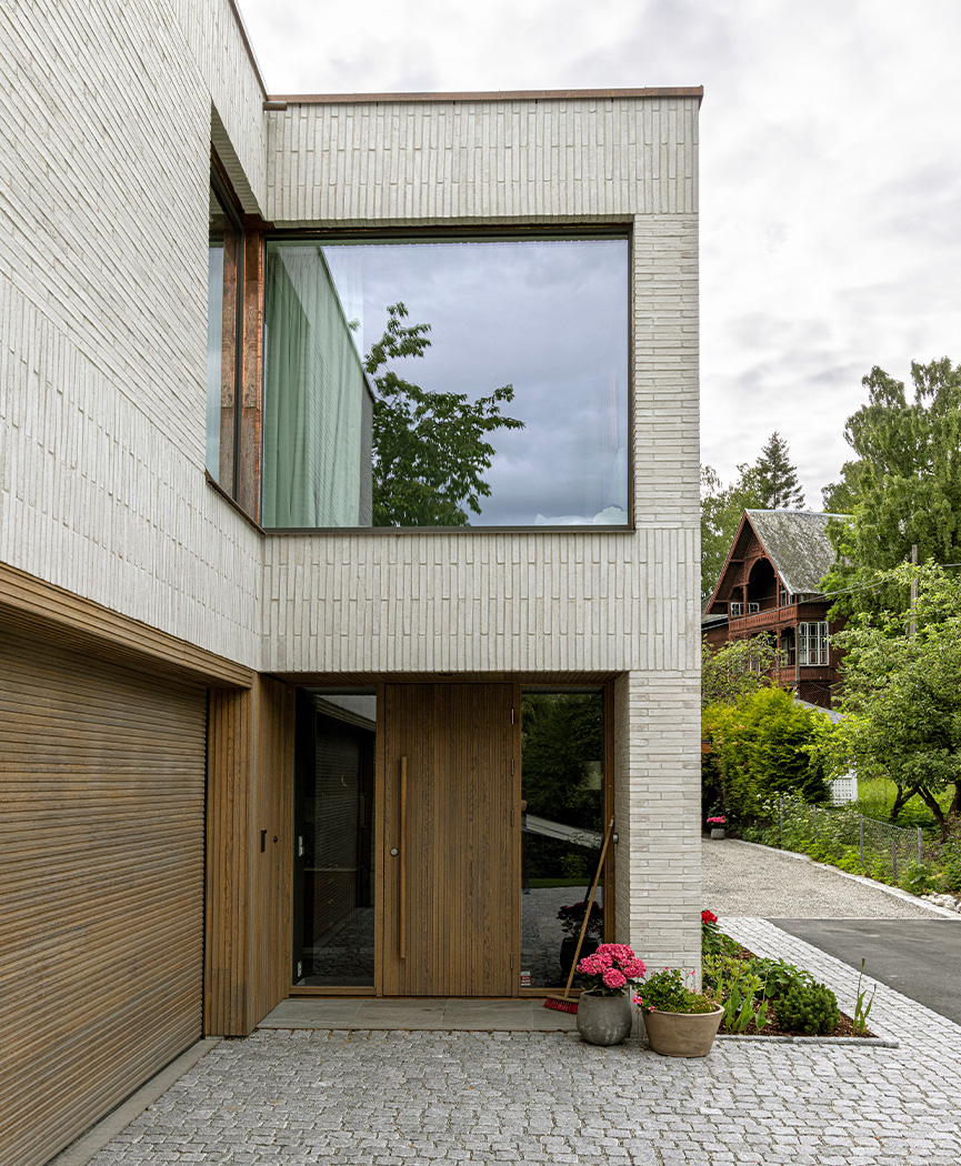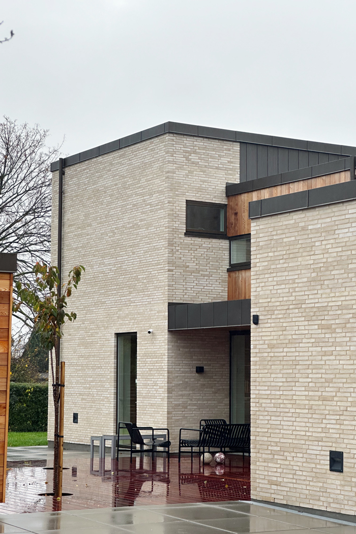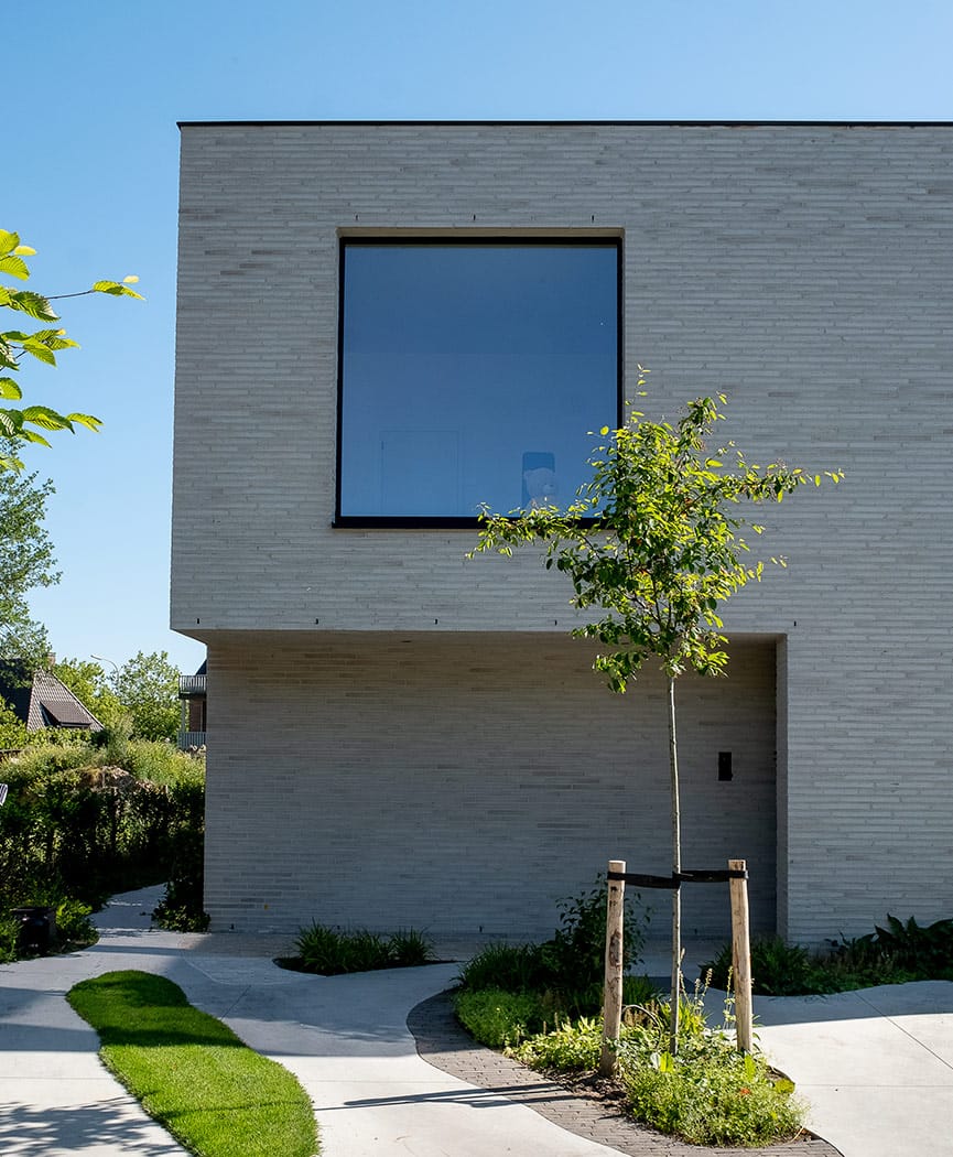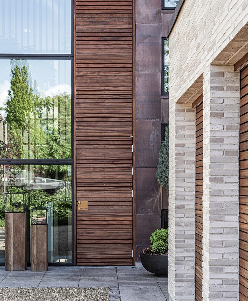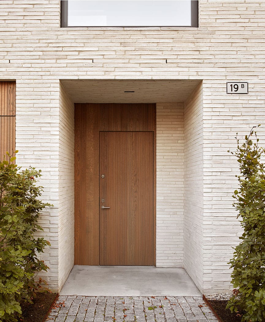 The bricks are light-tinted with a raw and coarse touch that adds a sand-coloured diversity to the finished masonry. The slightly retracted masonry joints have been chosen to bring out the brick’s rustic surfaces even more. This detail rich façade plays elegantly with panels lined with pre-patinated copper cladding and obliquely cut hardwood cladding on the front door and garage doors. A symphony of warm and natural materials that blends in perfect symphony.