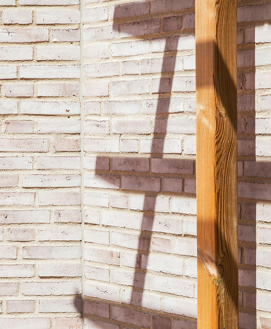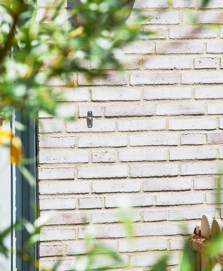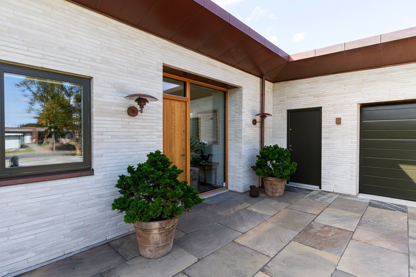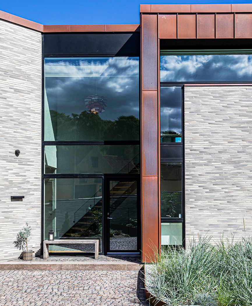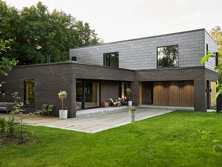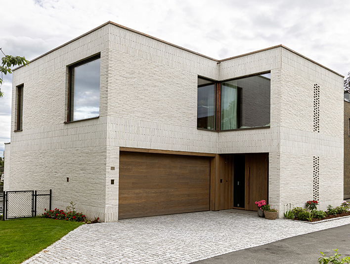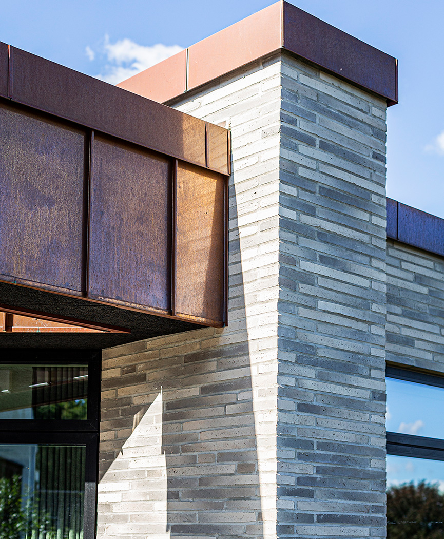 The bricks are light-tinted with a raw and coarse touch that adds a sand-coloured diversity to the finished masonry. The slightly retracted masonry joints have been chosen to bring out the brick’s rustic surfaces even more. This detail rich façade plays elegantly with panels lined with pre-patinated copper cladding and obliquely cut hardwood cladding on the front door and garage doors. A symphony of warm and natural materials that blends in perfect symphony.