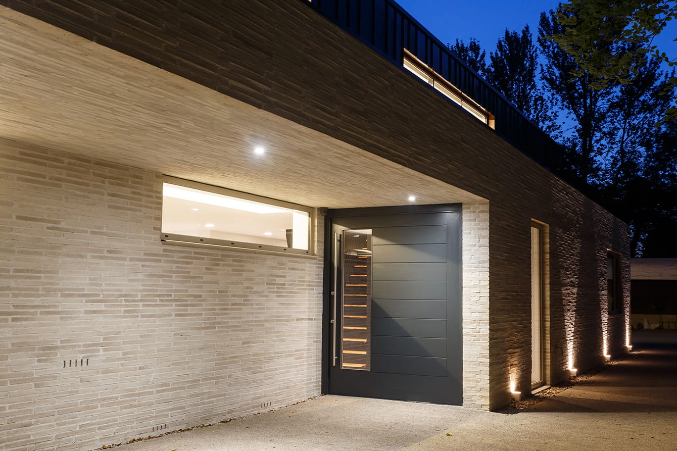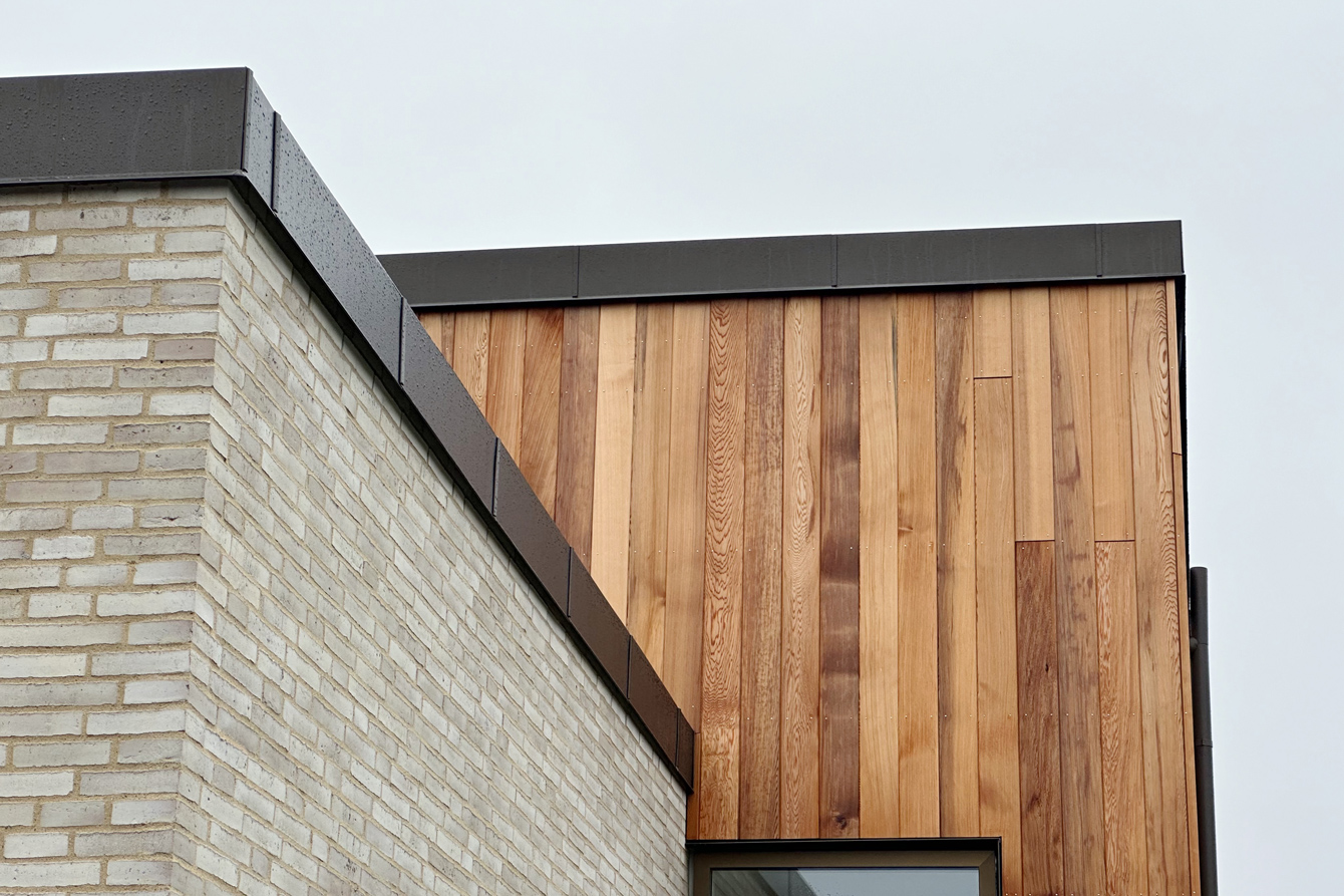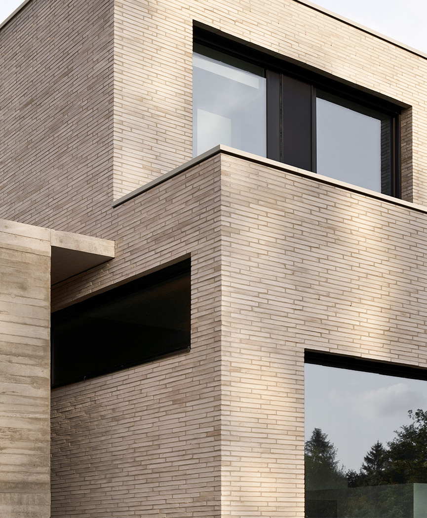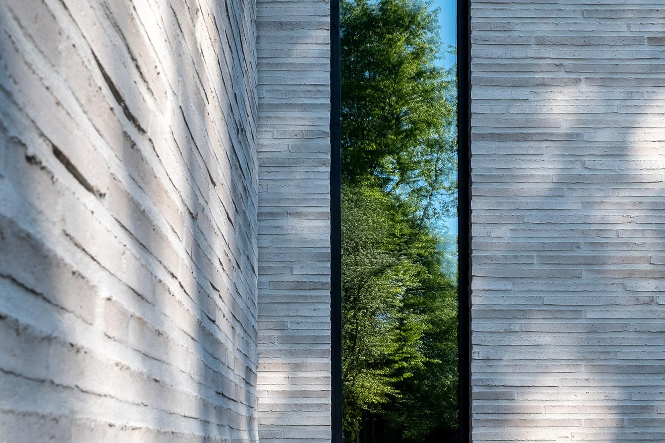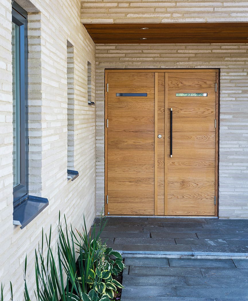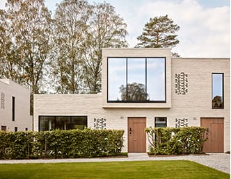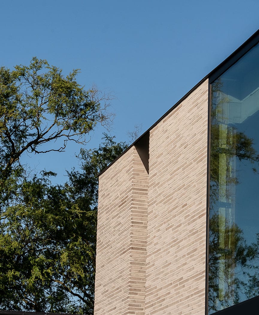 The bricks are light-tinted with a raw and coarse touch that adds a sand-coloured diversity to the finished masonry. The slightly retracted masonry joints have been chosen to bring out the brick’s rustic surfaces even more. This detail rich façade plays elegantly with panels lined with pre-patinated copper cladding and obliquely cut hardwood cladding on the front door and garage doors. A symphony of warm and natural materials that blends in perfect symphony.