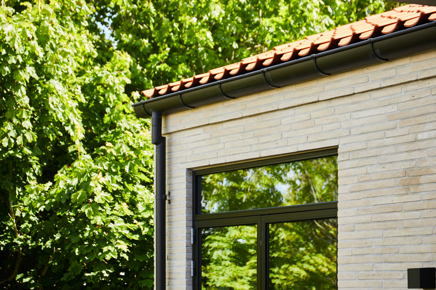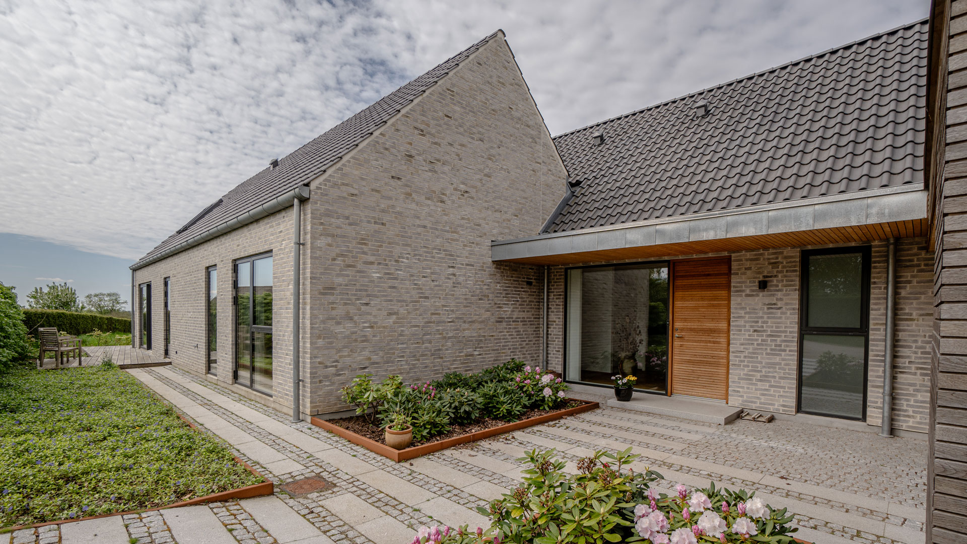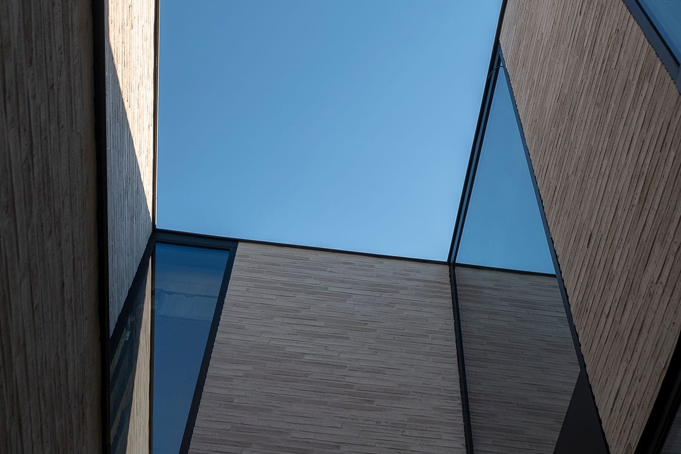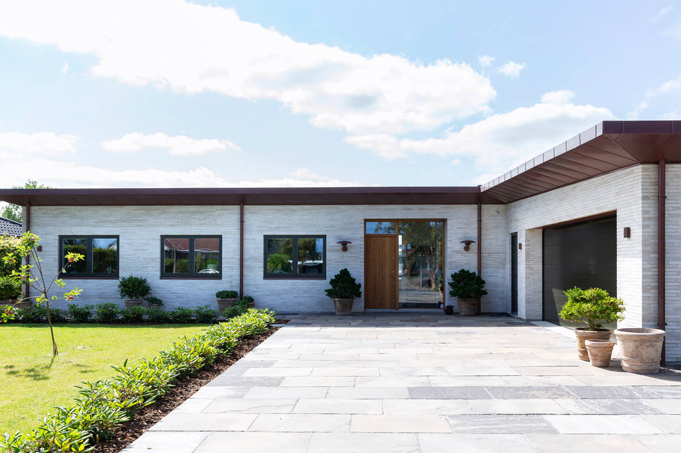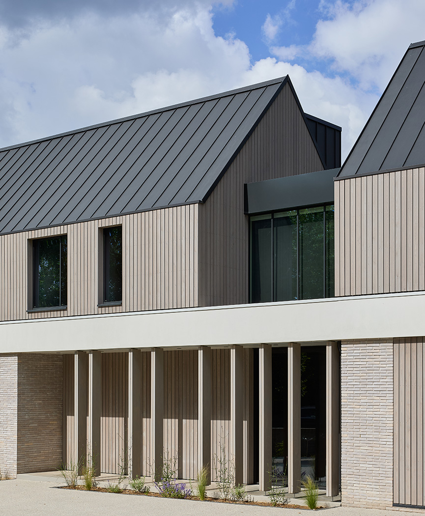 The bricks are light-tinted with a raw and coarse touch that adds a sand-coloured diversity to the finished masonry. The slightly retracted masonry joints have been chosen to bring out the brick’s rustic surfaces even more. This detail rich façade plays elegantly with panels lined with pre-patinated copper cladding and obliquely cut hardwood cladding on the front door and garage doors. A symphony of warm and natural materials that blends in perfect symphony.