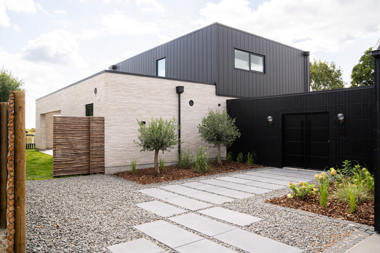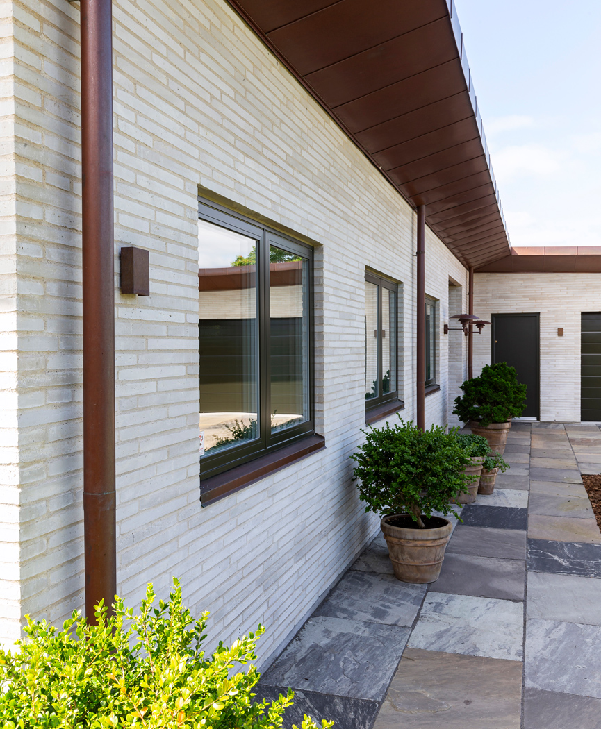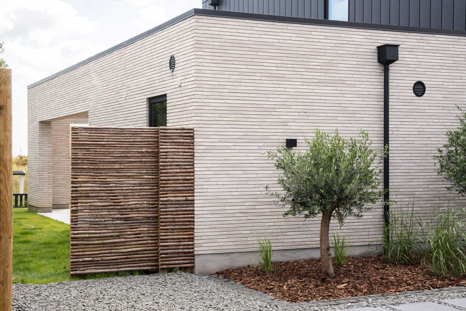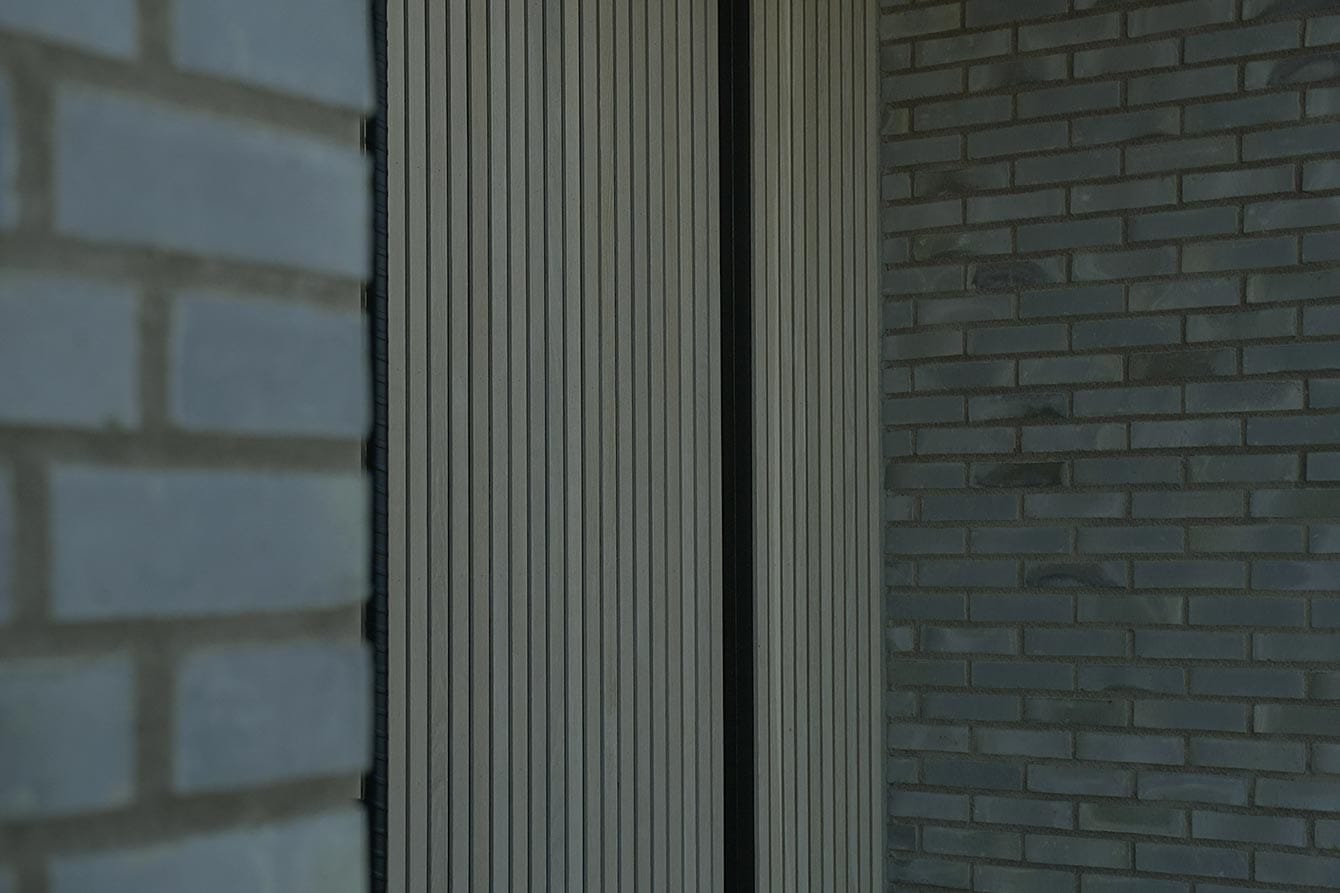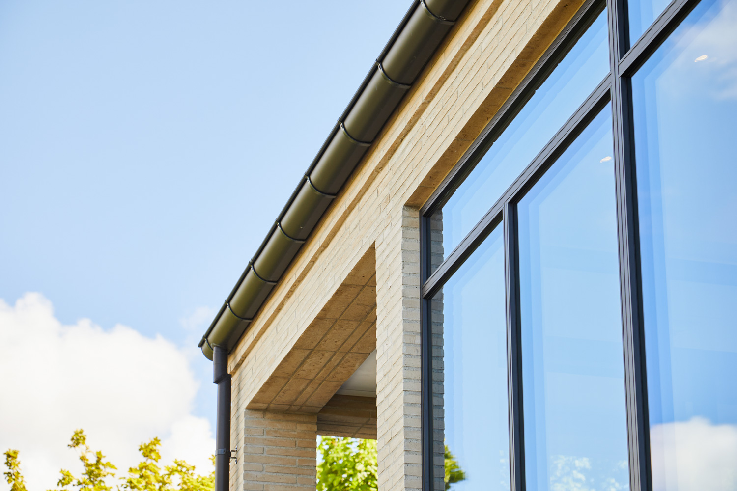 The bricks are light-tinted with a raw and coarse touch that adds a sand-coloured diversity to the finished masonry. The slightly retracted masonry joints have been chosen to bring out the brick’s rustic surfaces even more. This detail rich façade plays elegantly with panels lined with pre-patinated copper cladding and obliquely cut hardwood cladding on the front door and garage doors. A symphony of warm and natural materials that blends in perfect symphony.