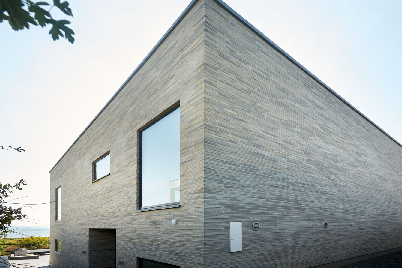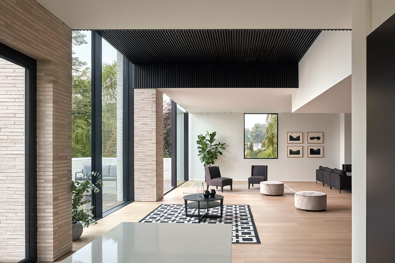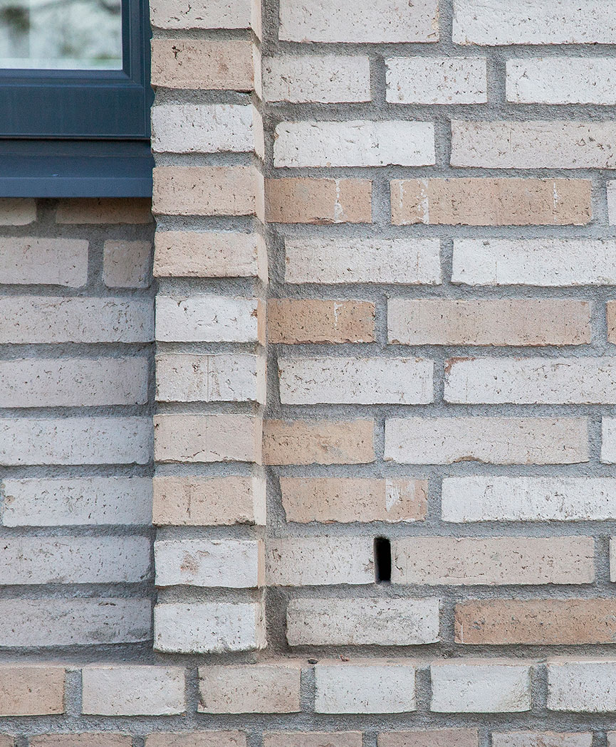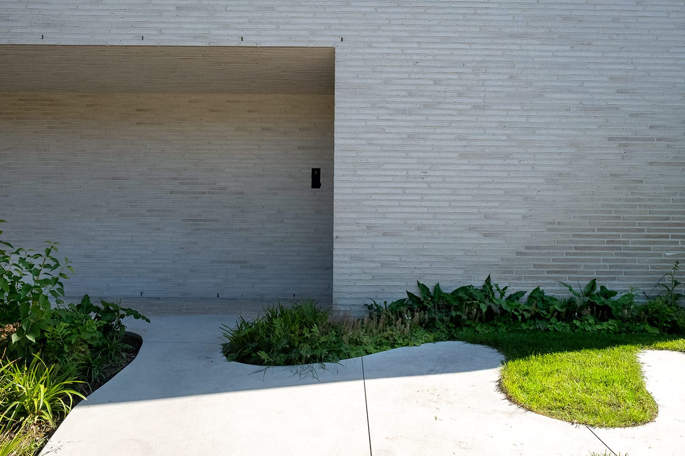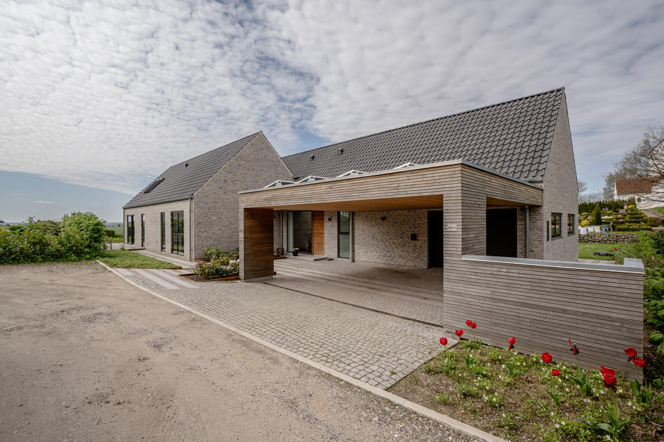 The bricks are light-tinted with a raw and coarse touch that adds a sand-coloured diversity to the finished masonry. The slightly retracted masonry joints have been chosen to bring out the brick’s rustic surfaces even more. This detail rich façade plays elegantly with panels lined with pre-patinated copper cladding and obliquely cut hardwood cladding on the front door and garage doors. A symphony of warm and natural materials that blends in perfect symphony.