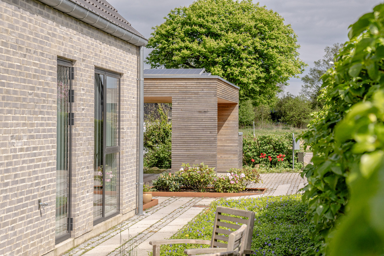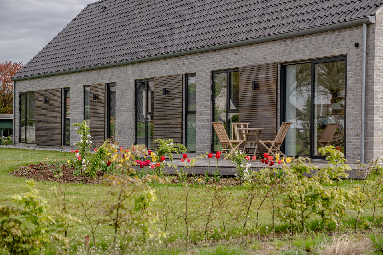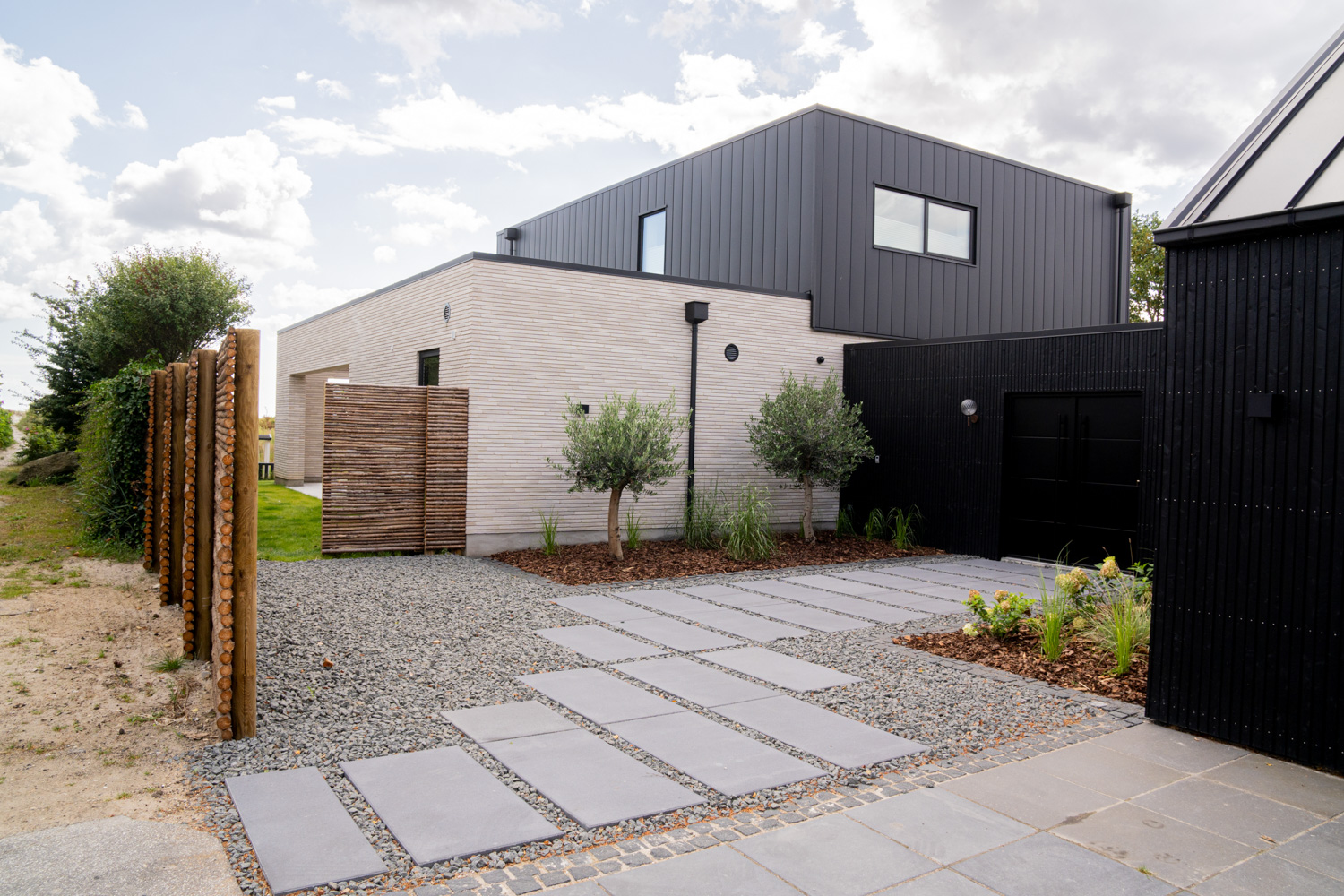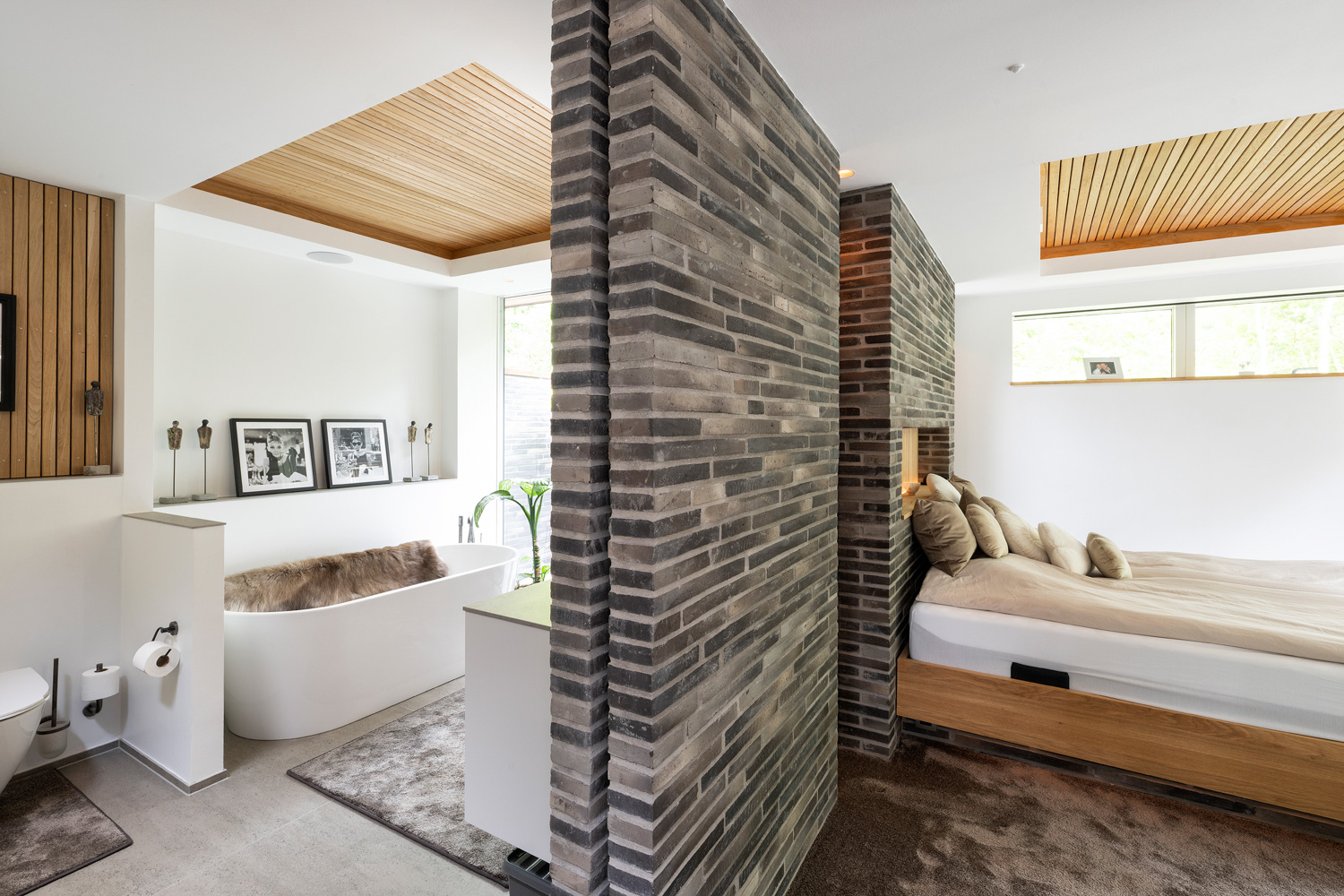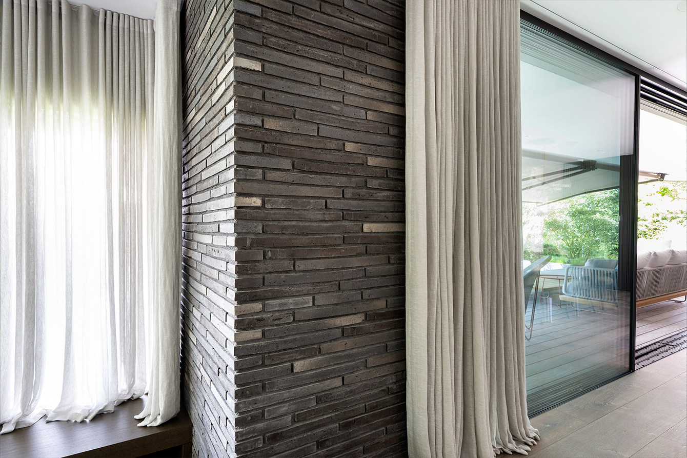 The bricks are light-tinted with a raw and coarse touch that adds a sand-coloured diversity to the finished masonry. The slightly retracted masonry joints have been chosen to bring out the brick’s rustic surfaces even more. This detail rich façade plays elegantly with panels lined with pre-patinated copper cladding and obliquely cut hardwood cladding on the front door and garage doors. A symphony of warm and natural materials that blends in perfect symphony.