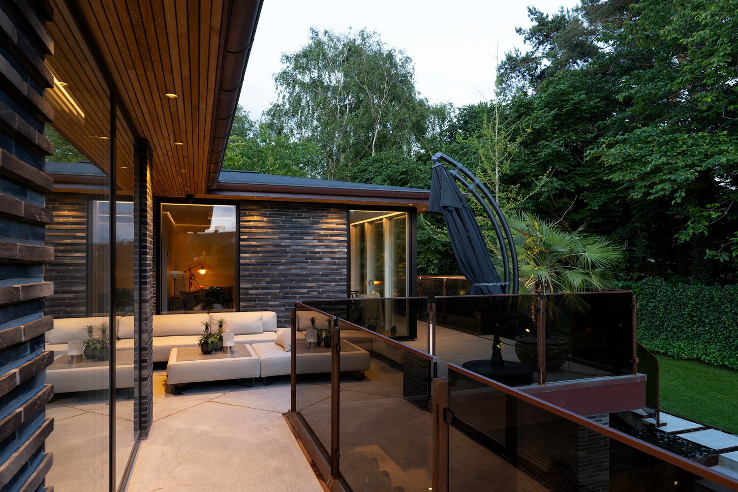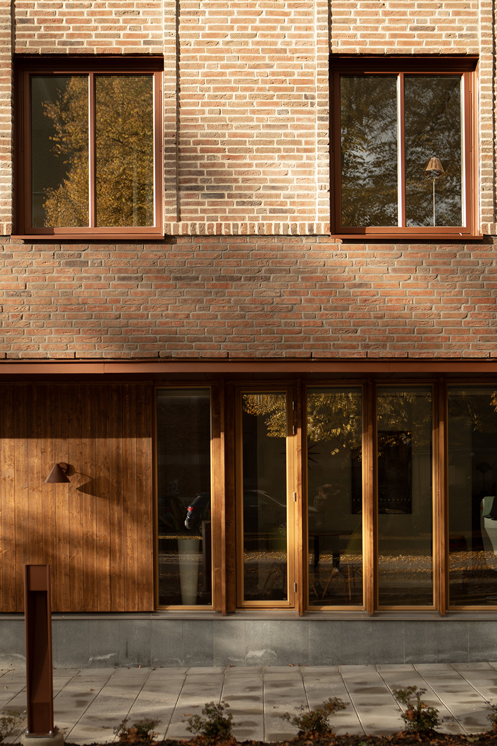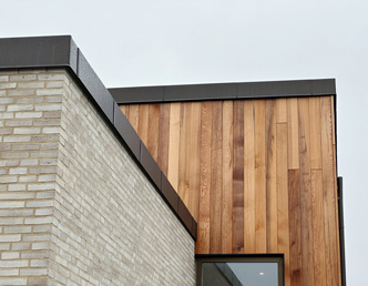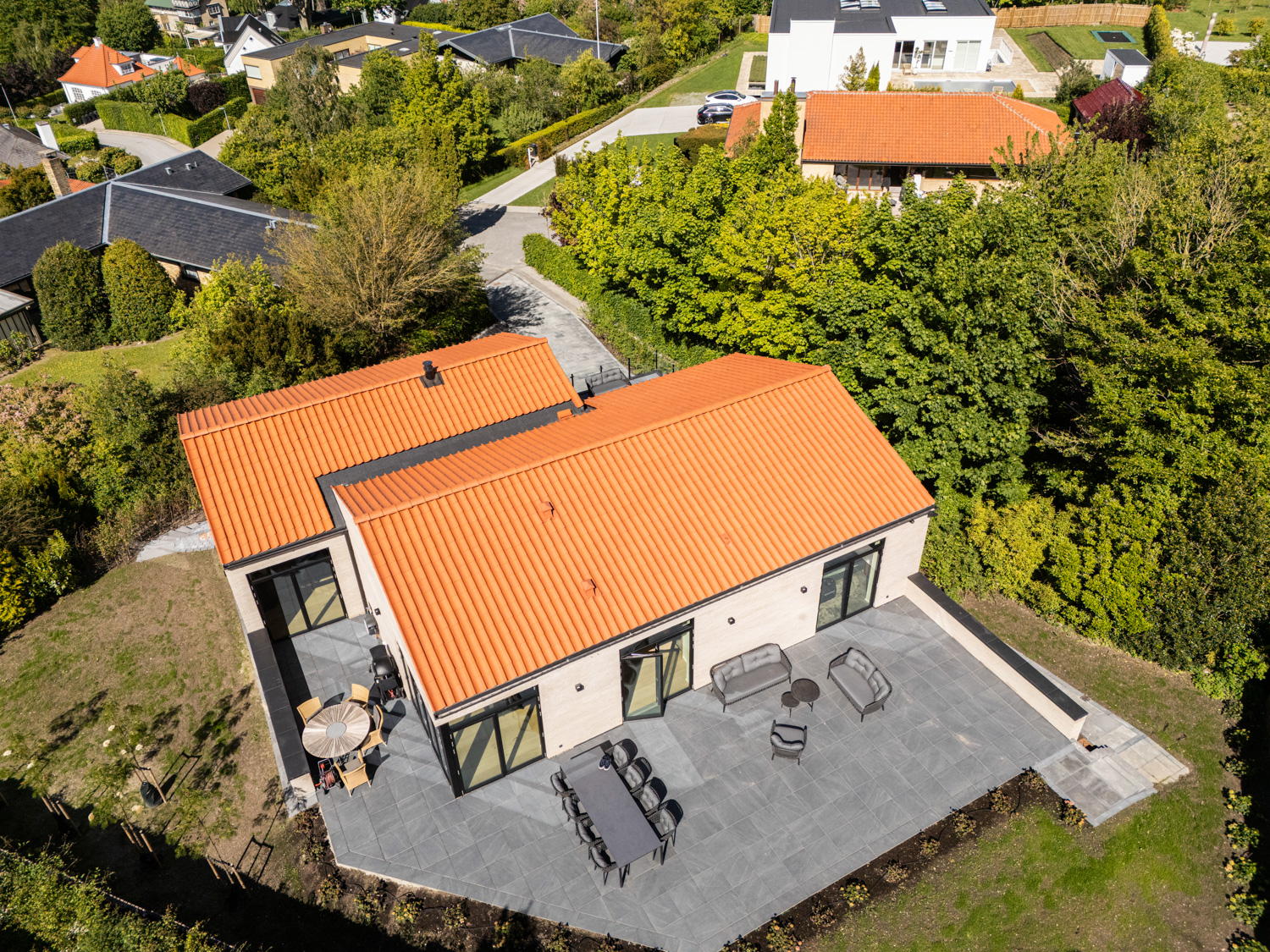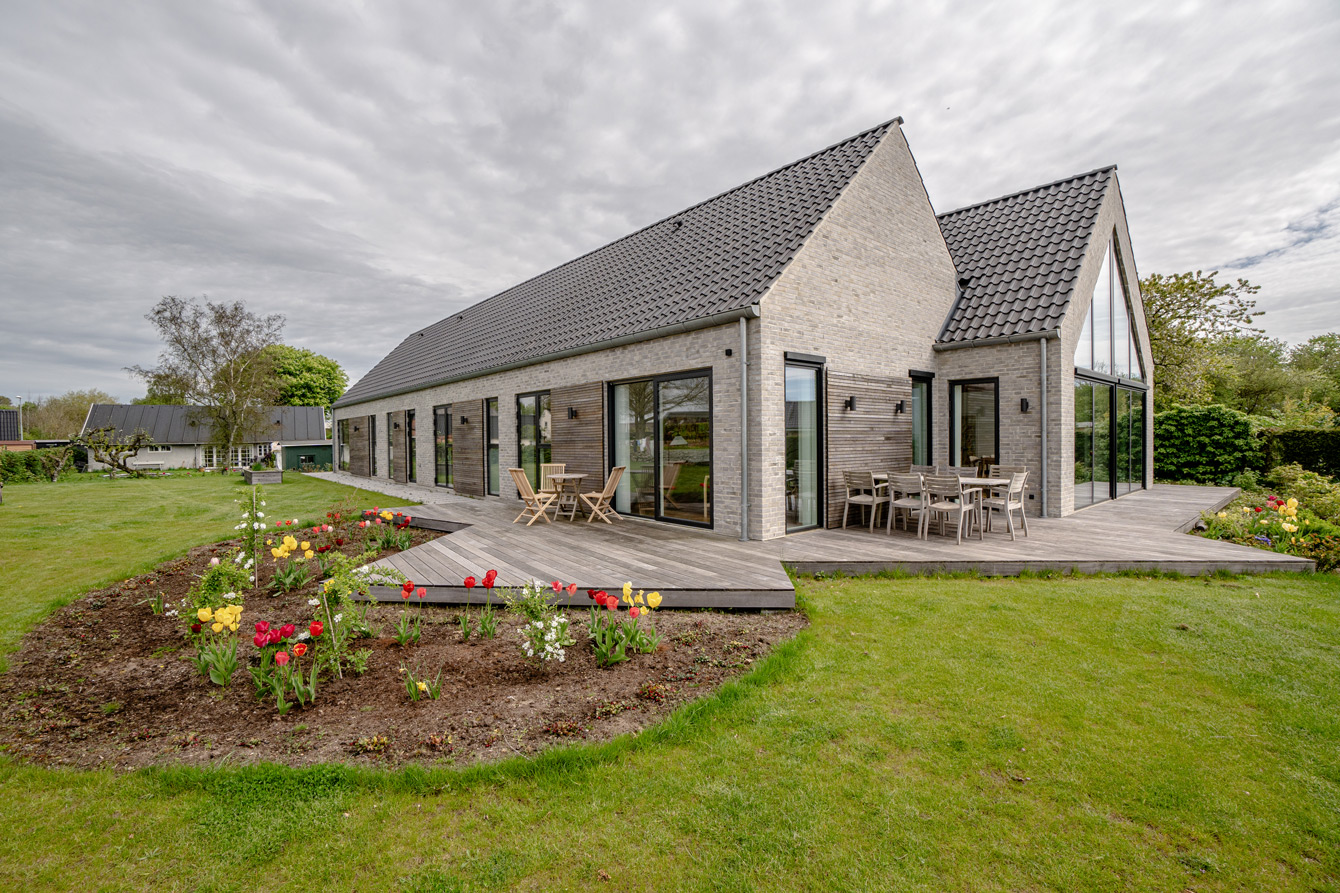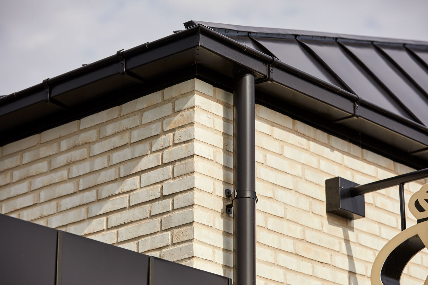 The bricks are light-tinted with a raw and coarse touch that adds a sand-coloured diversity to the finished masonry. The slightly retracted masonry joints have been chosen to bring out the brick’s rustic surfaces even more. This detail rich façade plays elegantly with panels lined with pre-patinated copper cladding and obliquely cut hardwood cladding on the front door and garage doors. A symphony of warm and natural materials that blends in perfect symphony.