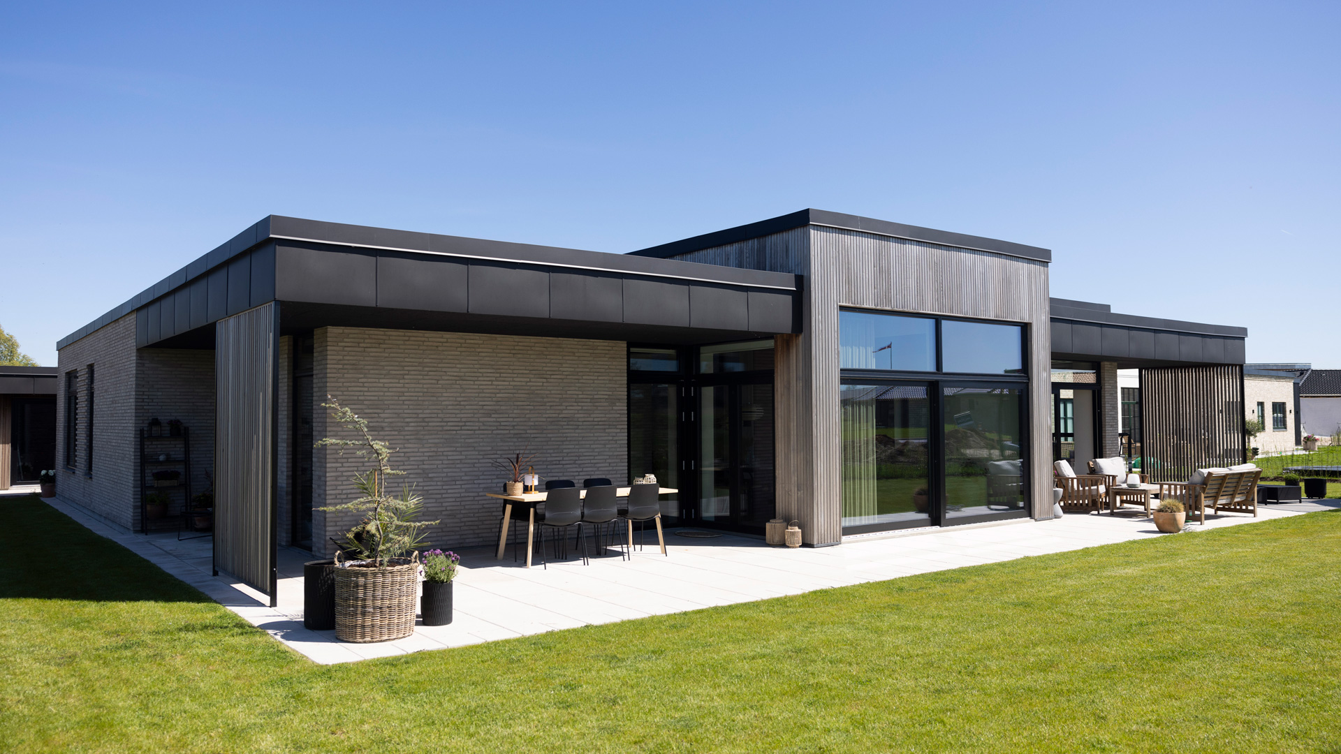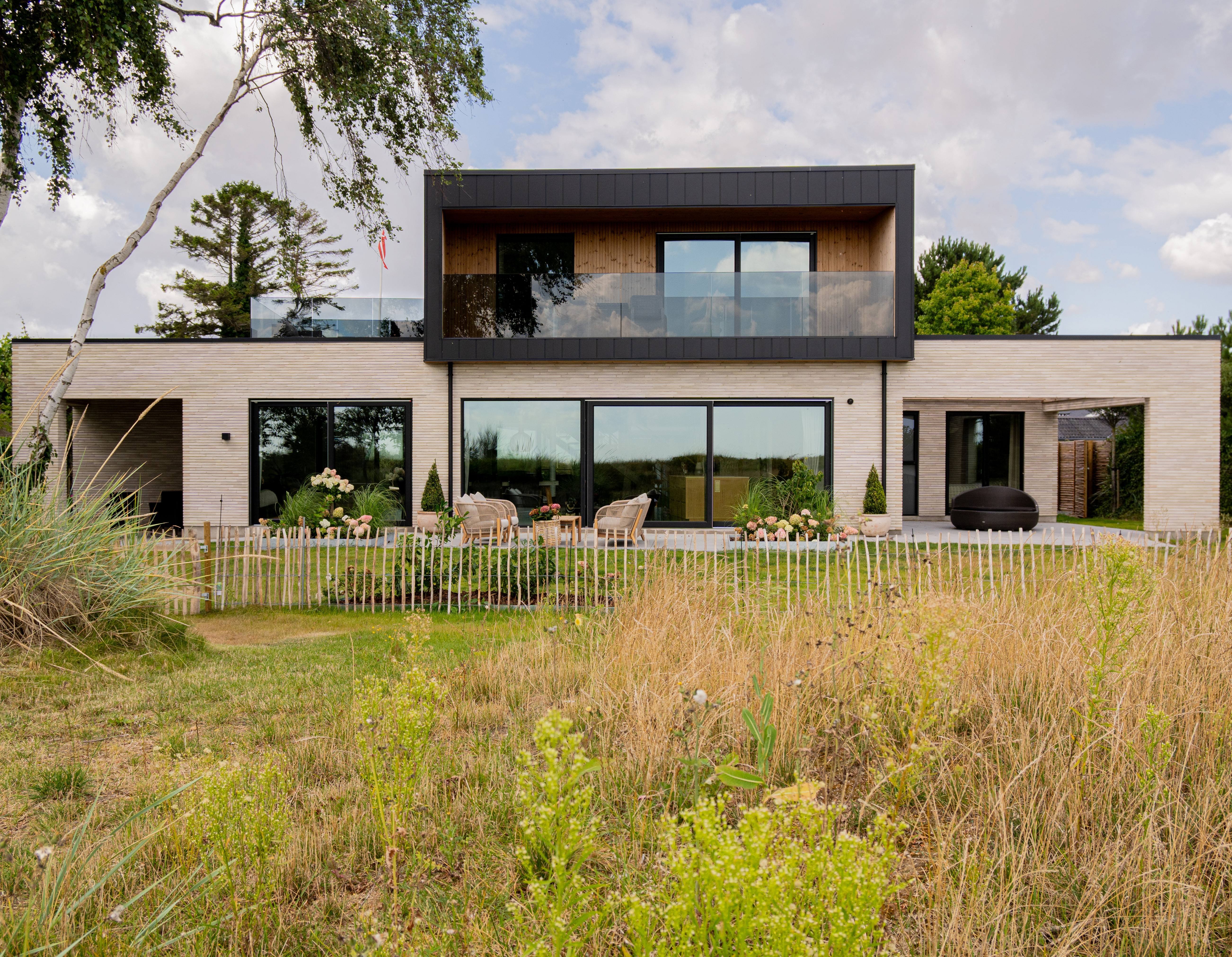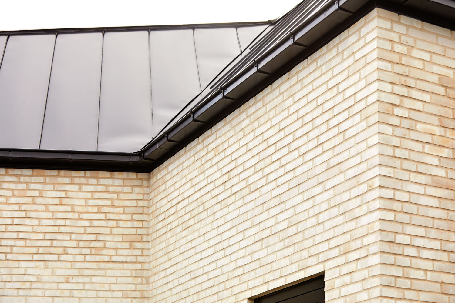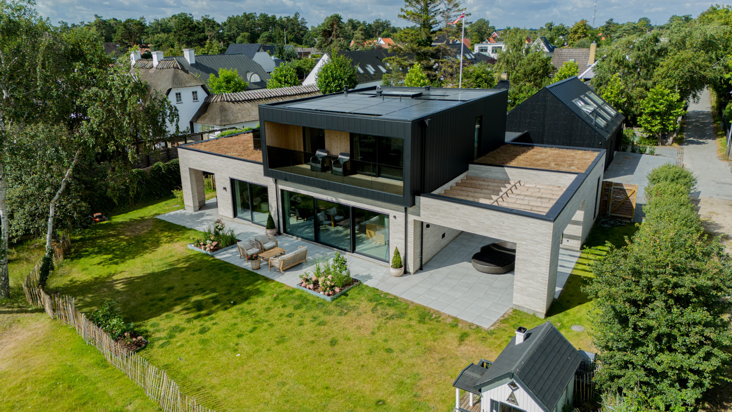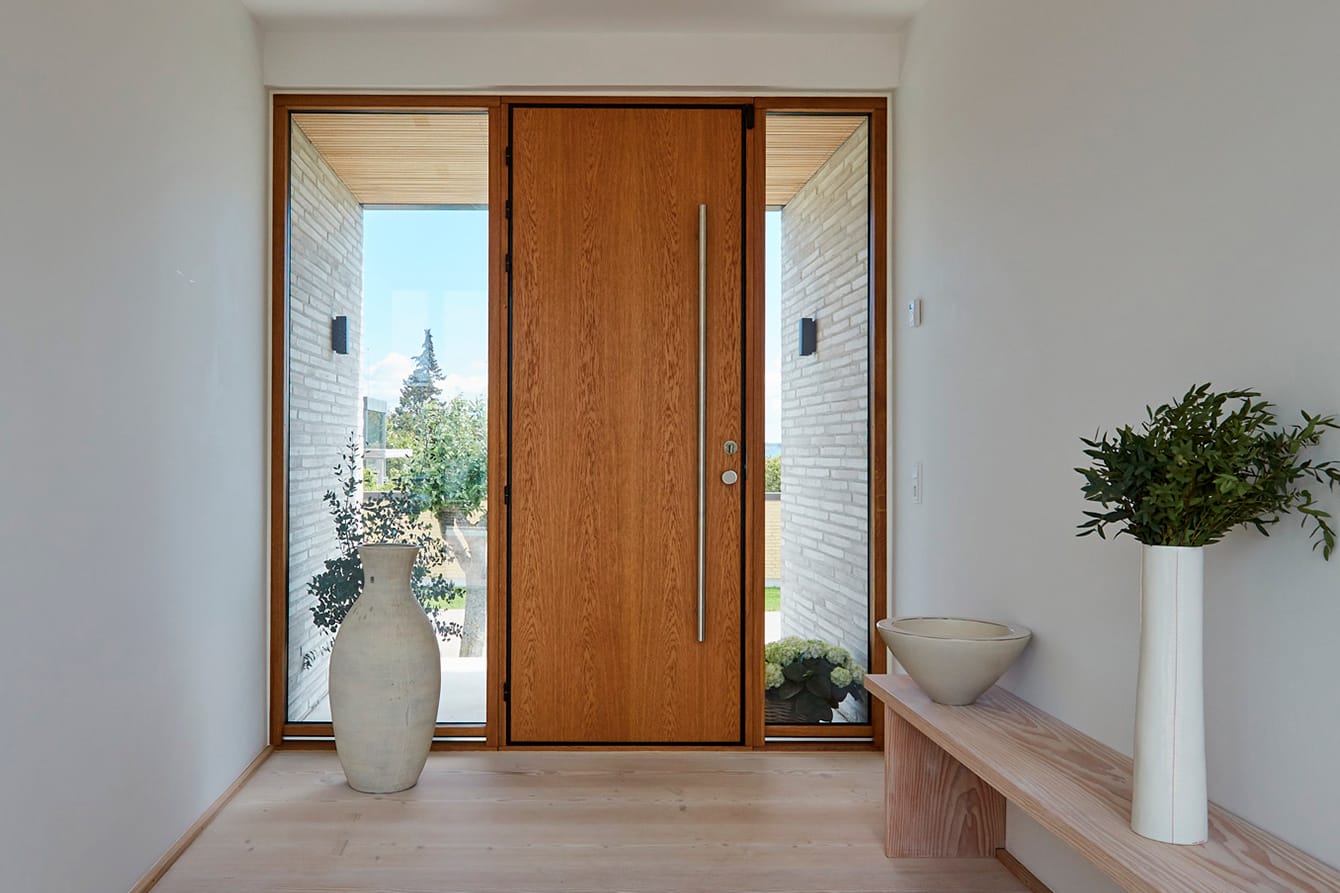 The bricks are light-tinted with a raw and coarse touch that adds a sand-coloured diversity to the finished masonry. The slightly retracted masonry joints have been chosen to bring out the brick’s rustic surfaces even more. This detail rich façade plays elegantly with panels lined with pre-patinated copper cladding and obliquely cut hardwood cladding on the front door and garage doors. A symphony of warm and natural materials that blends in perfect symphony.