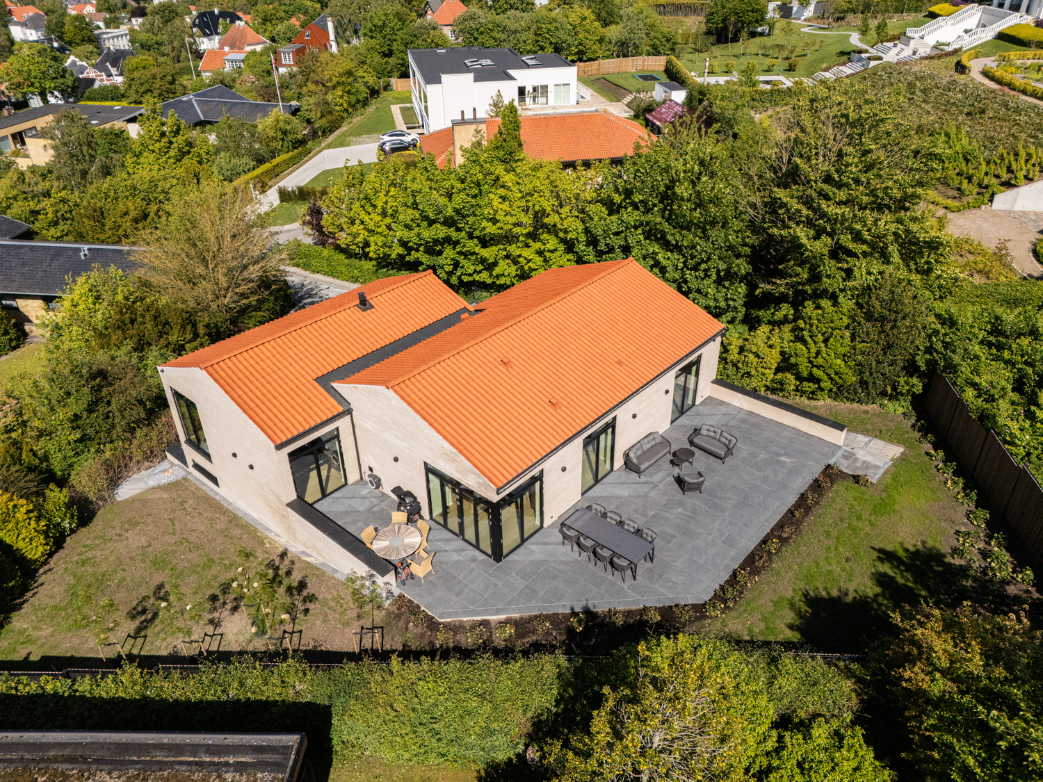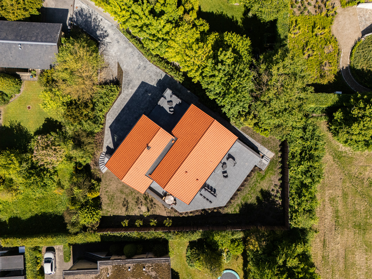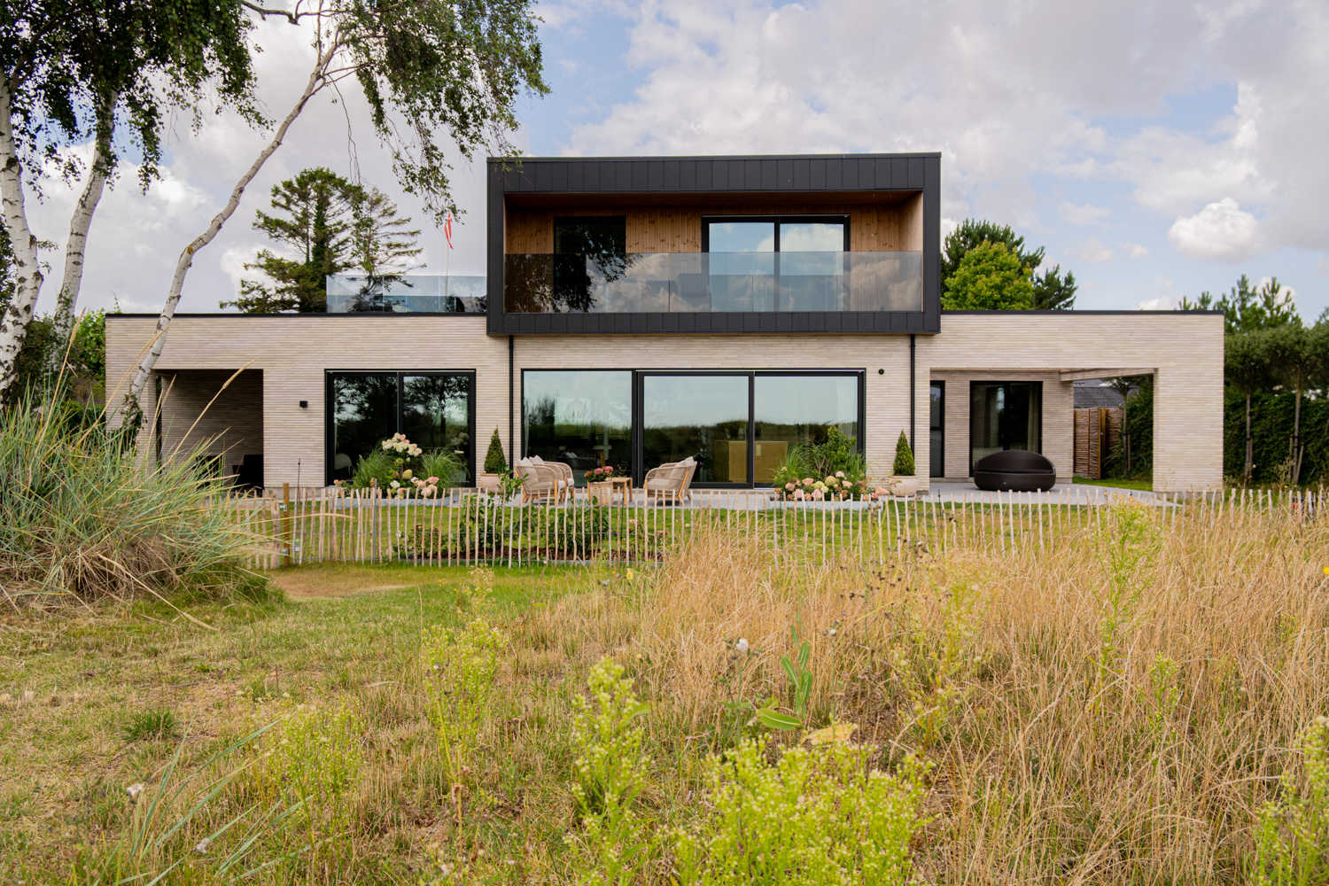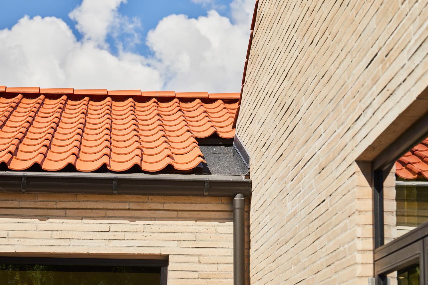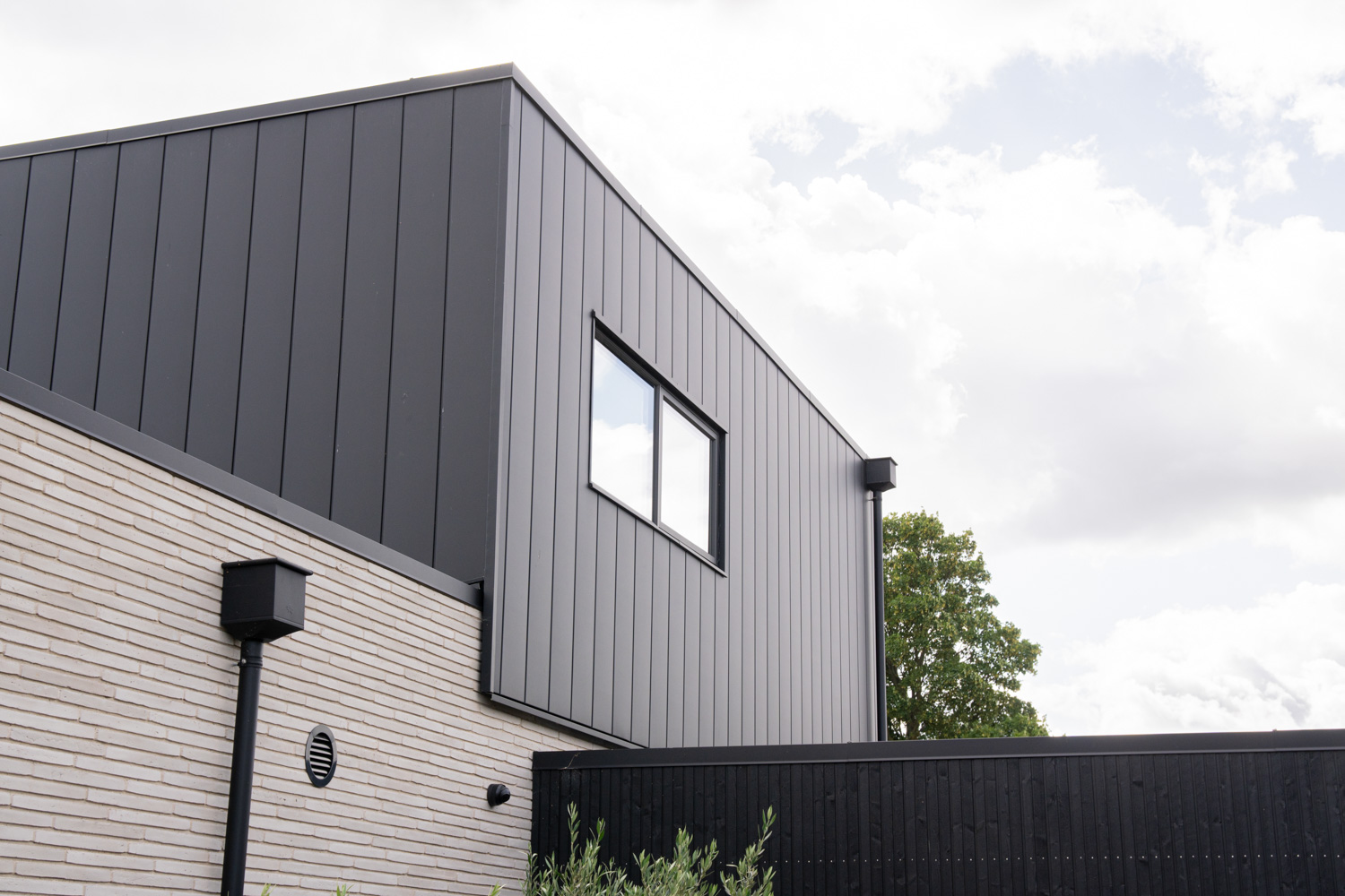 The bricks are light-tinted with a raw and coarse touch that adds a sand-coloured diversity to the finished masonry. The slightly retracted masonry joints have been chosen to bring out the brick’s rustic surfaces even more. This detail rich façade plays elegantly with panels lined with pre-patinated copper cladding and obliquely cut hardwood cladding on the front door and garage doors. A symphony of warm and natural materials that blends in perfect symphony.