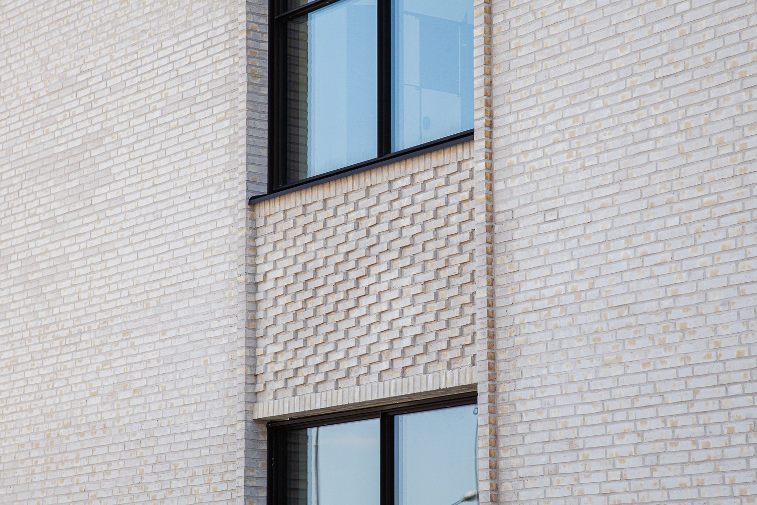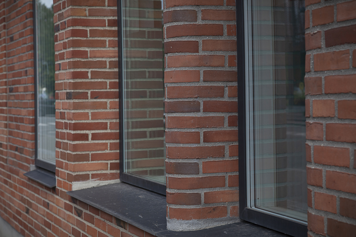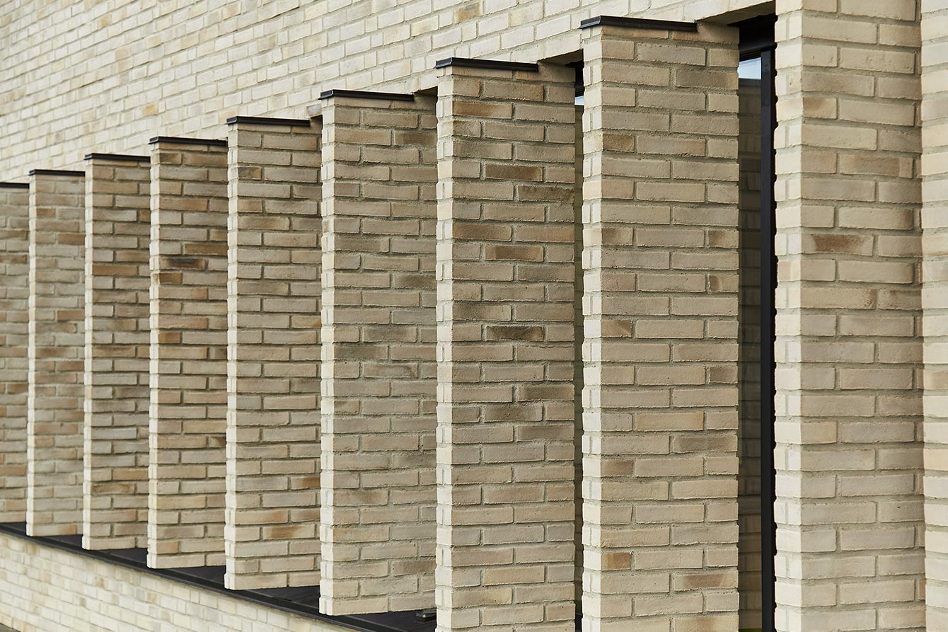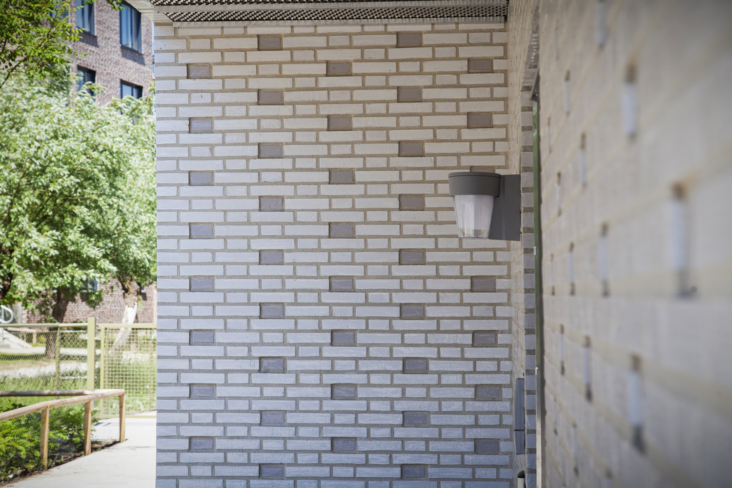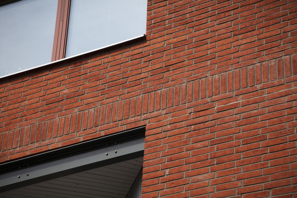 One of the ideas was that the rounded window sash would lead in trailing light along the facades. On the northern façade, the creepers are rounded on both sides, to maximize both morning and evening light. On the eastern façade, the slip is rounded to the south, so that the southern light is directed in, while to the north, the slip has a straight edge. Above each gate, we used the brick to create a brick pattern on the facade, different patterns for each gate. This resulted in each gate having its own expression and identity.