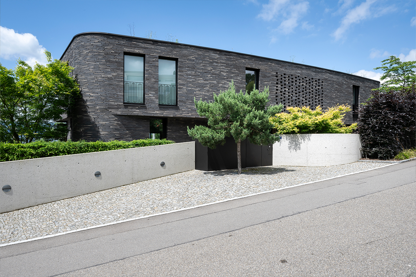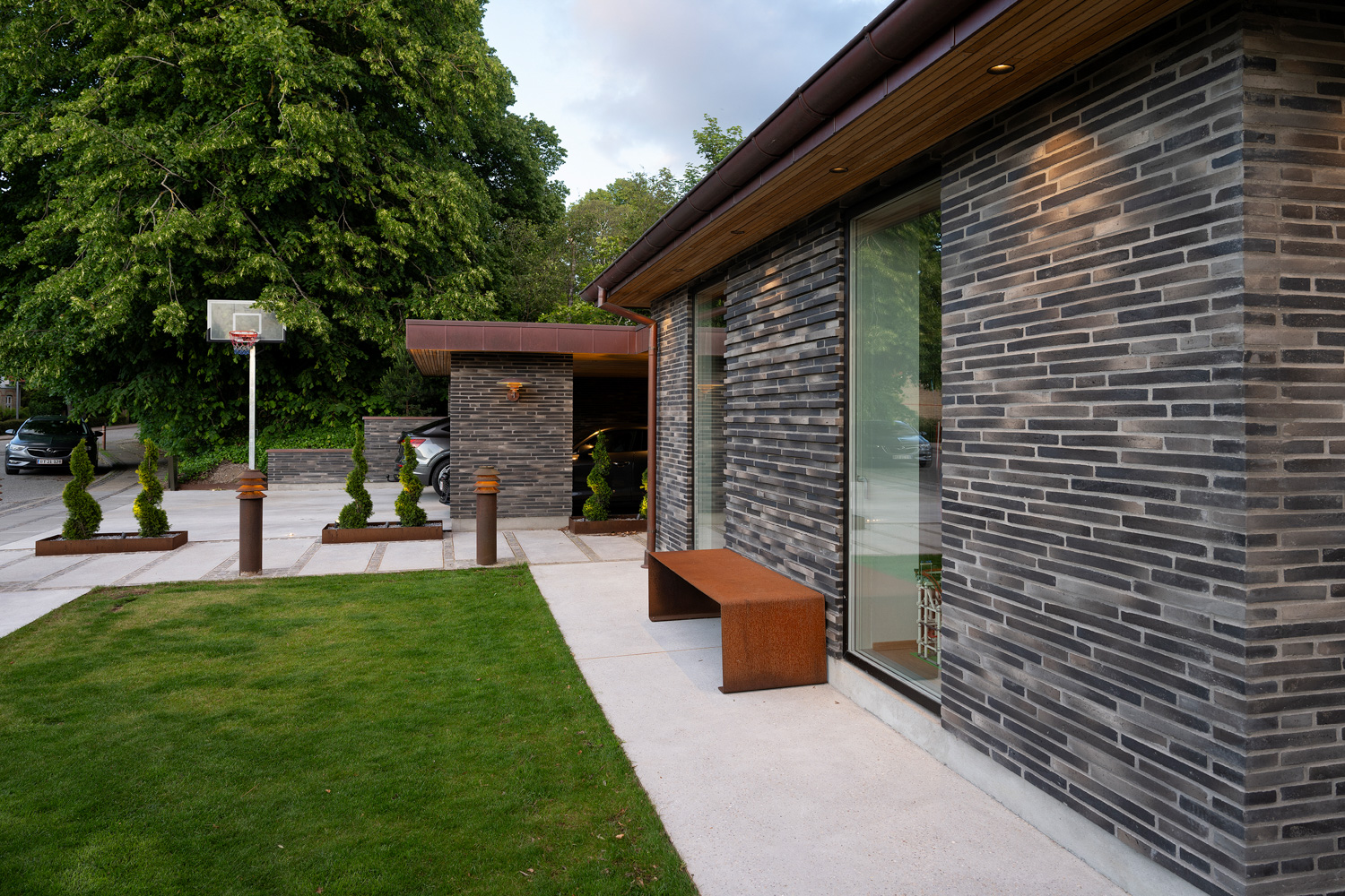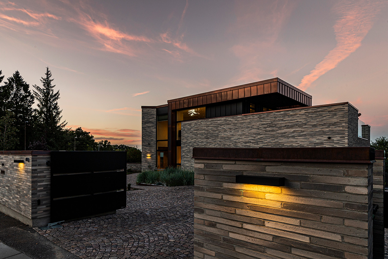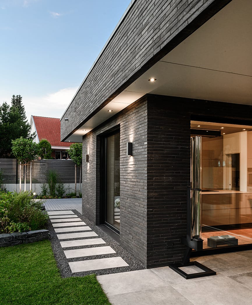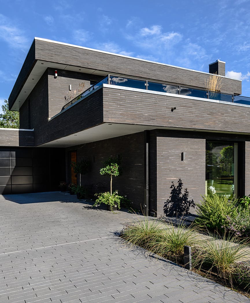 The combination of a broad driveway and parallel pathway elegantly lures visitors in for a closer look. The varying surface of light-bathed black RT 150 Ultima-bricks glooms at night.