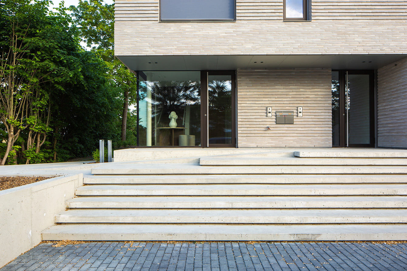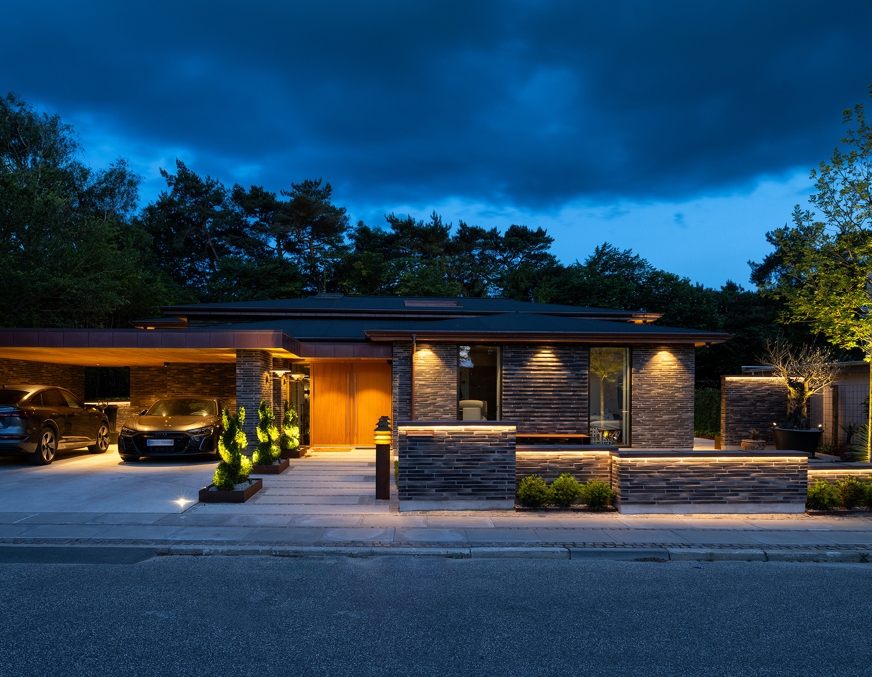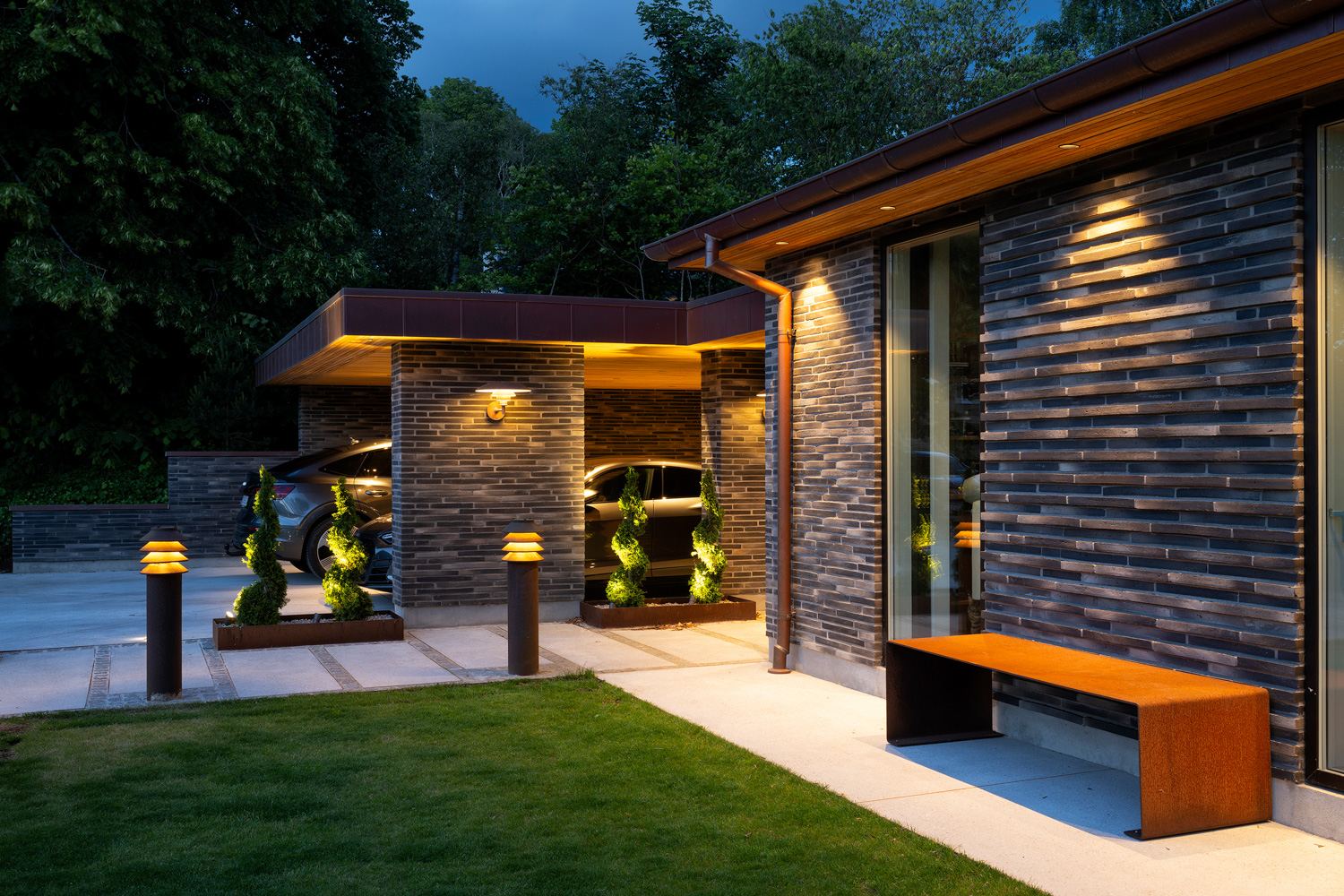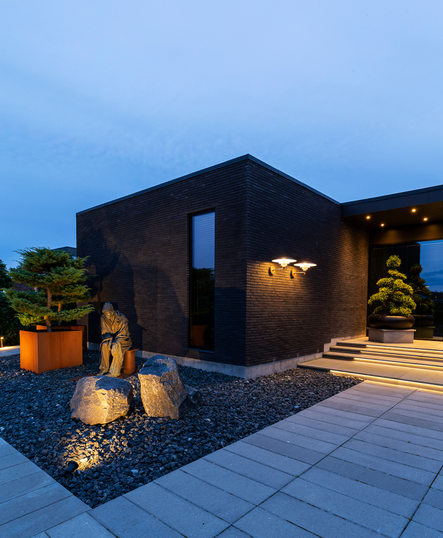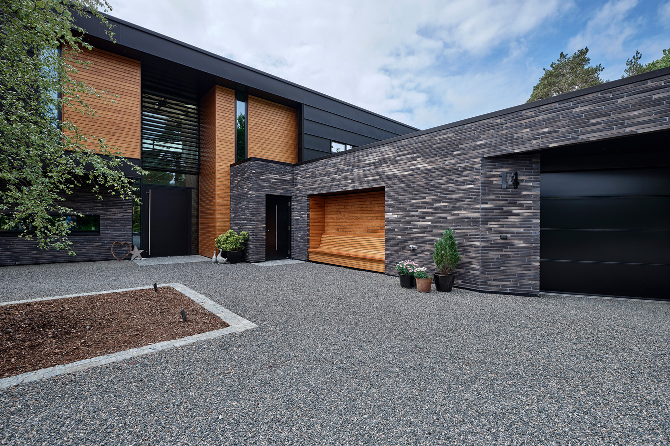 The combination of a broad driveway and parallel pathway elegantly lures visitors in for a closer look. The varying surface of light-bathed black RT 150 Ultima-bricks glooms at night.