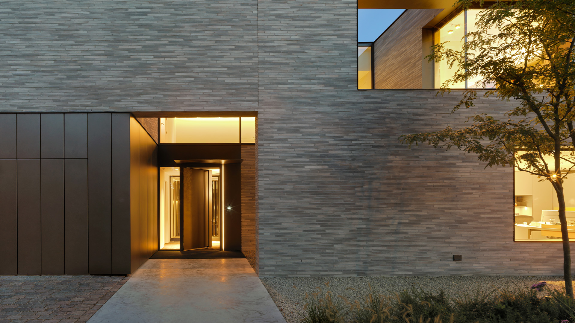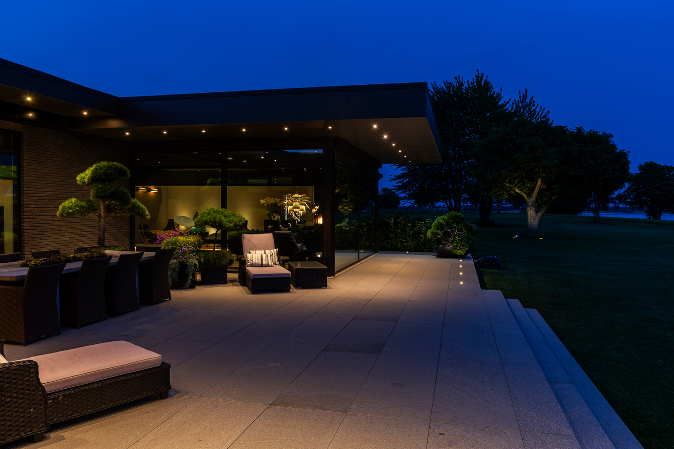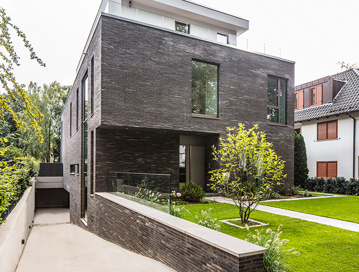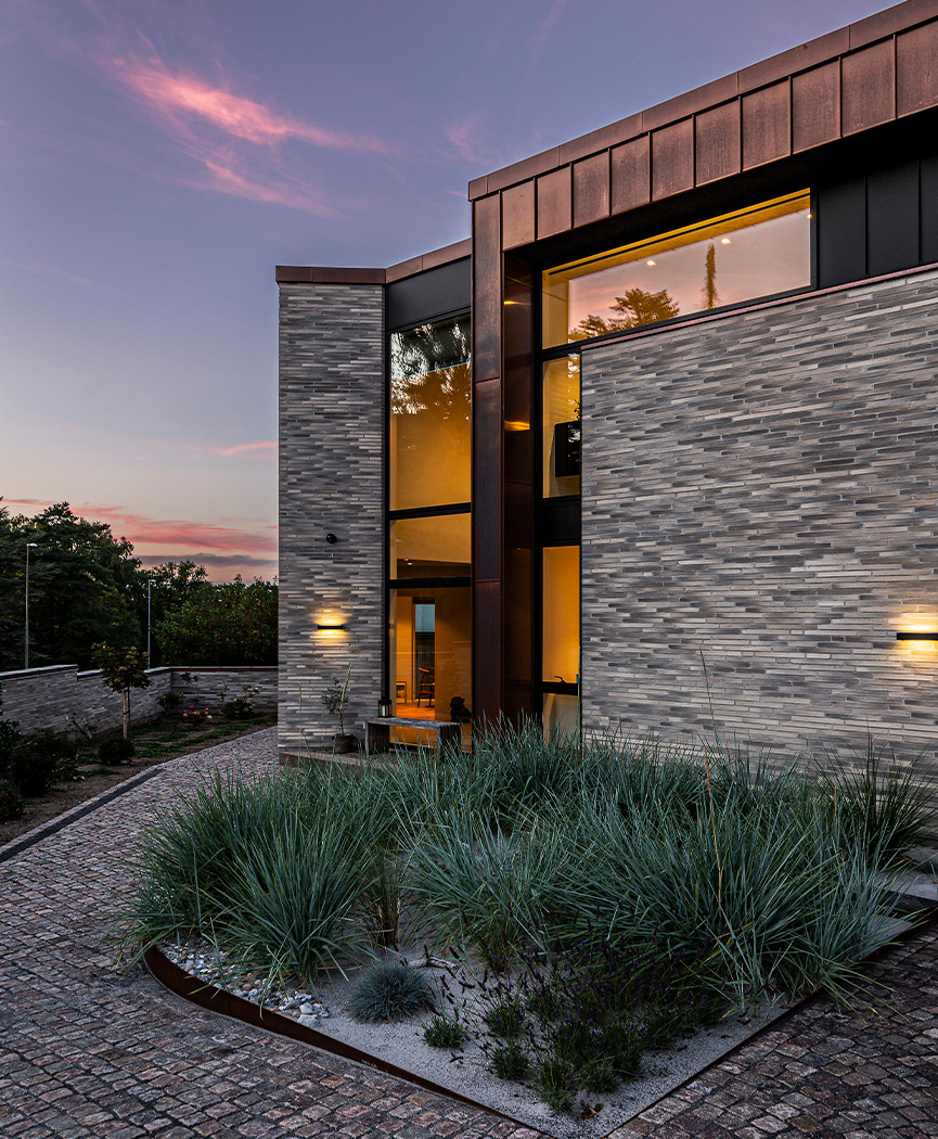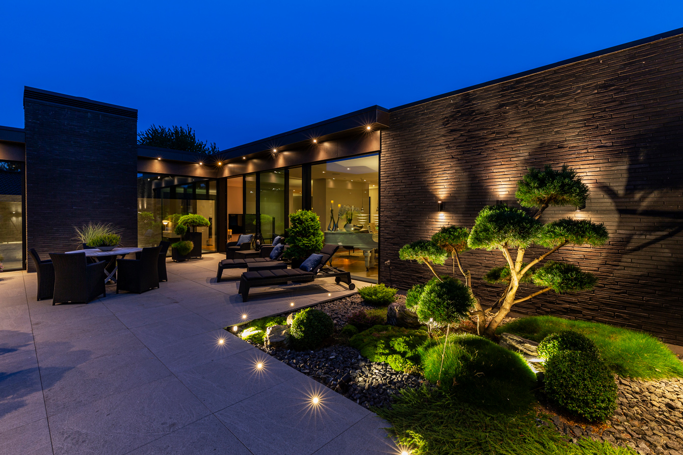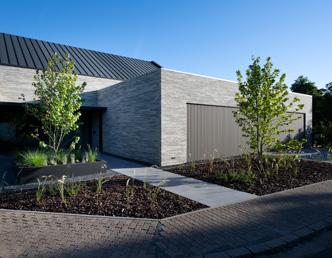 The combination of a broad driveway and parallel pathway elegantly lures visitors in for a closer look. The varying surface of light-bathed black RT 150 Ultima-bricks glooms at night.