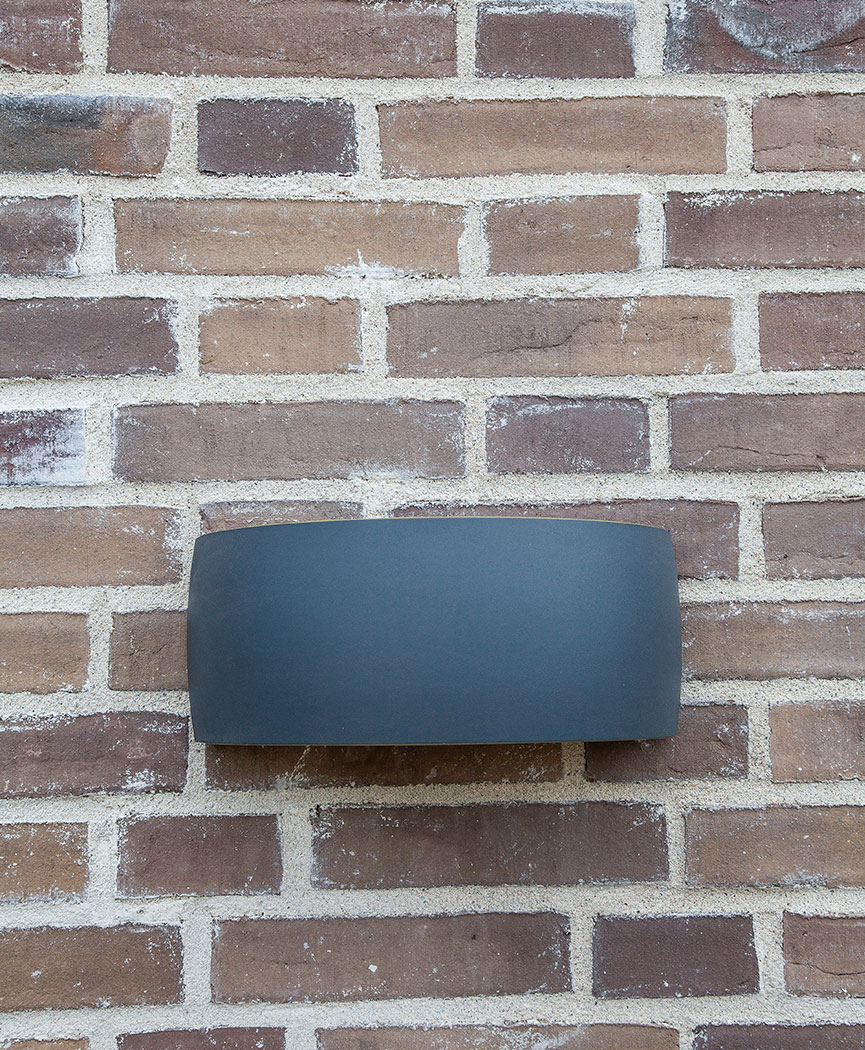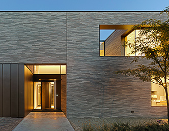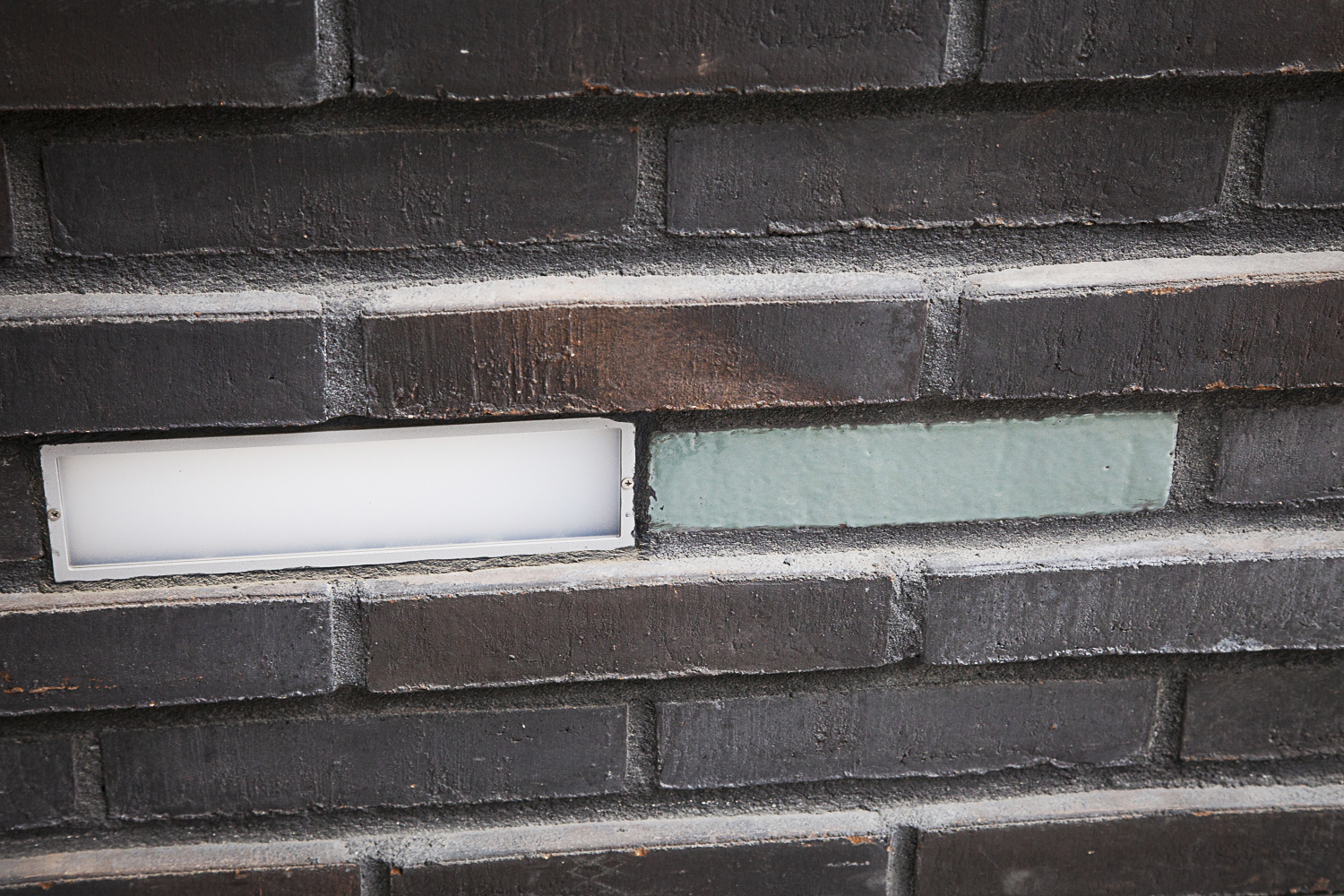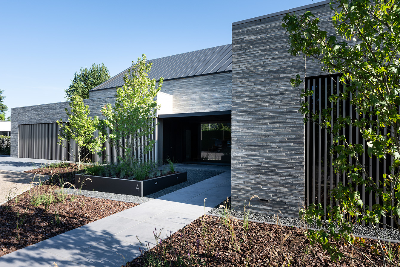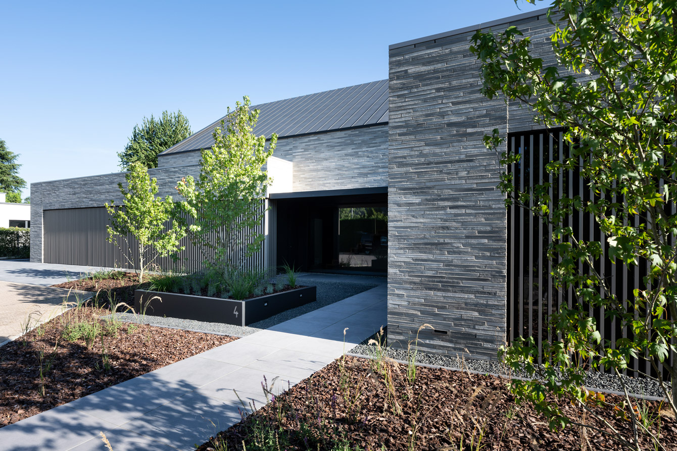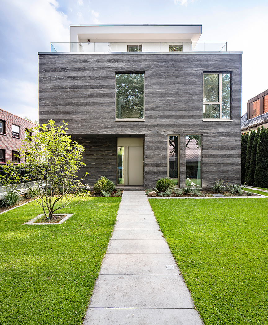 The combination of a broad driveway and parallel pathway elegantly lures visitors in for a closer look. The varying surface of light-bathed black RT 150 Ultima-bricks glooms at night.