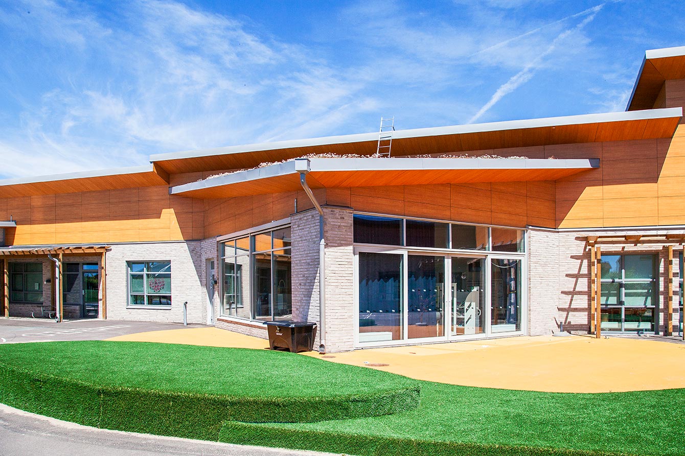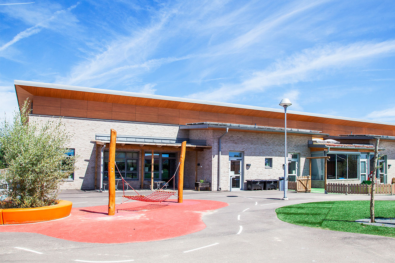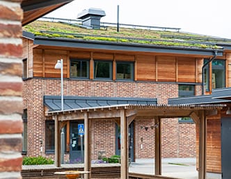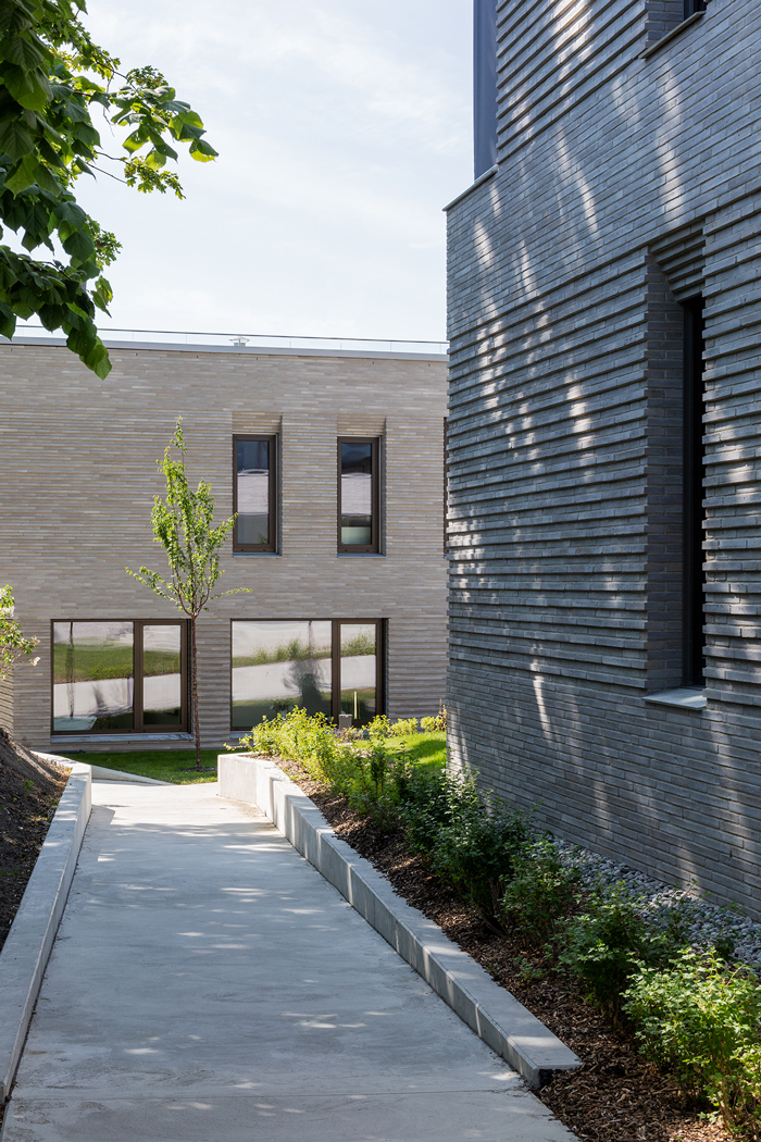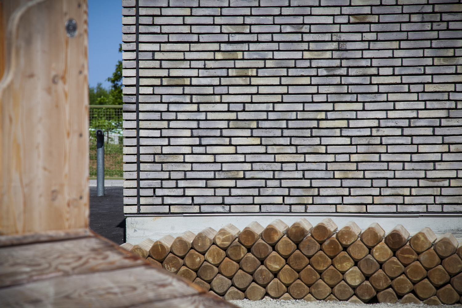 What an exciting playground, with a nice tactile façade in the background, for the kids to play. Interesting details in the façade play beautifully together with the timber sections and the lush green roofs.