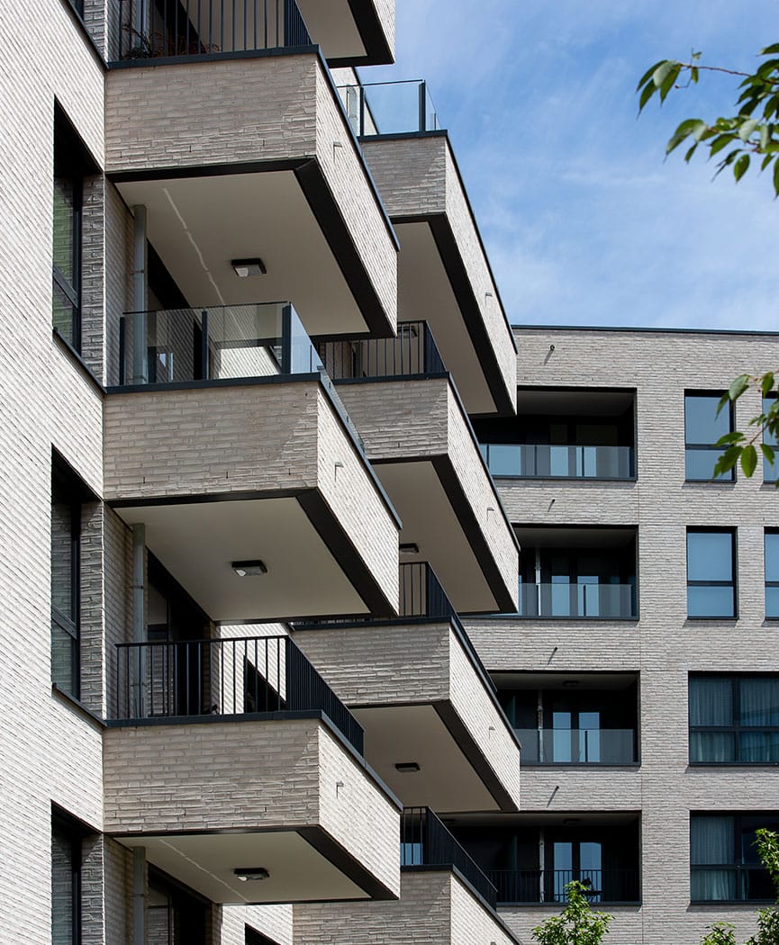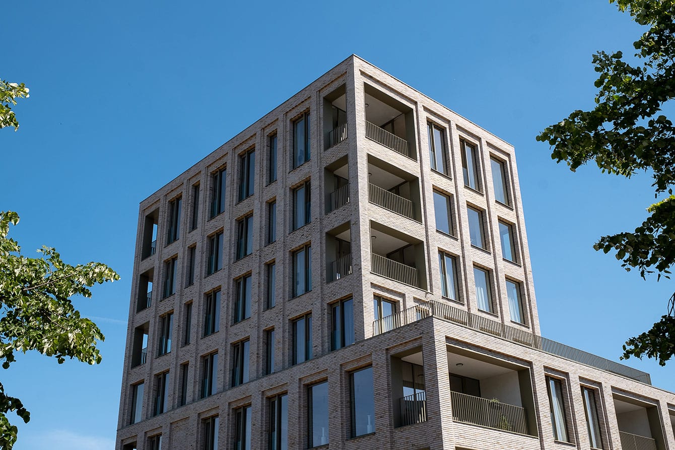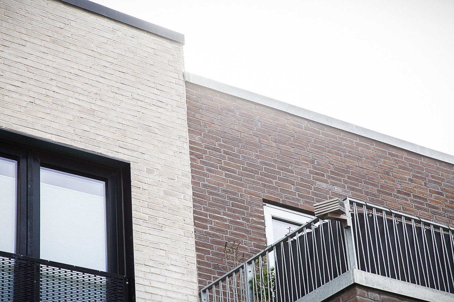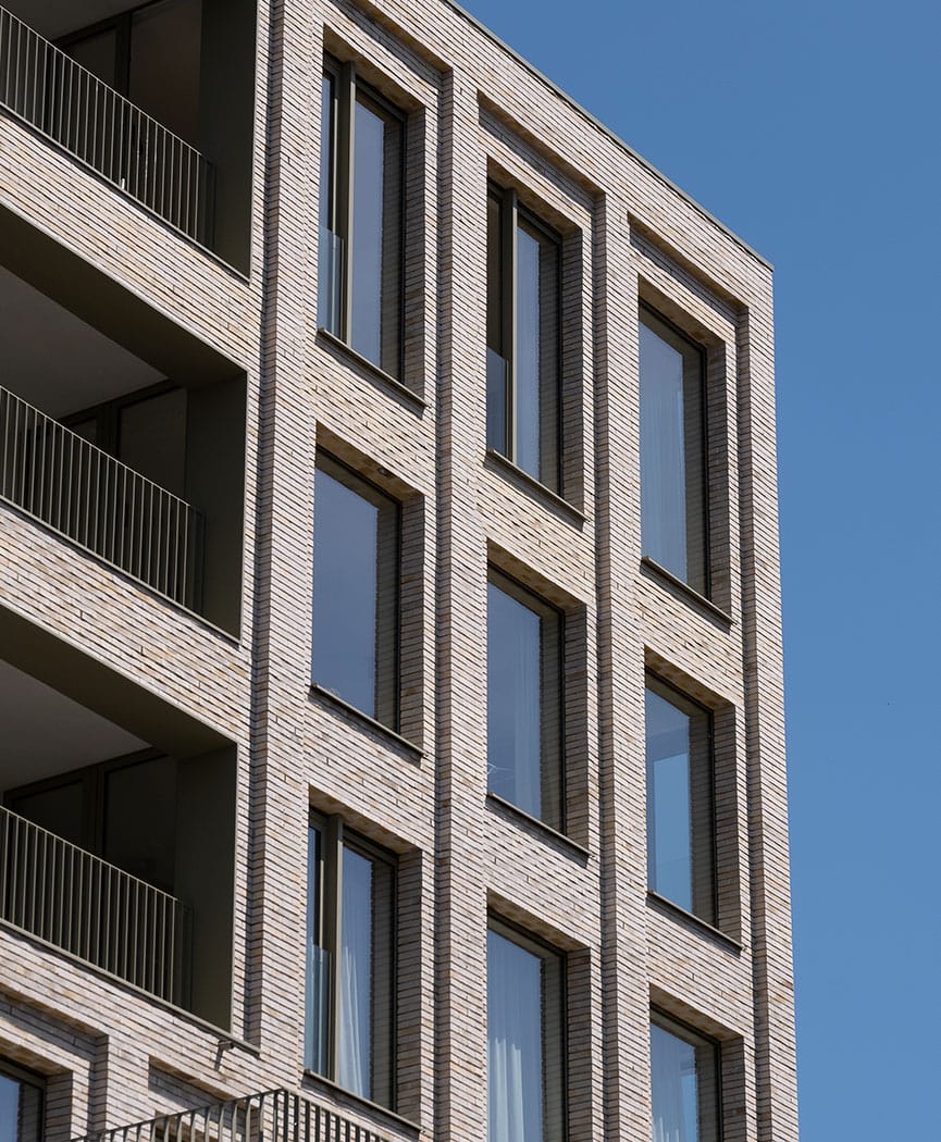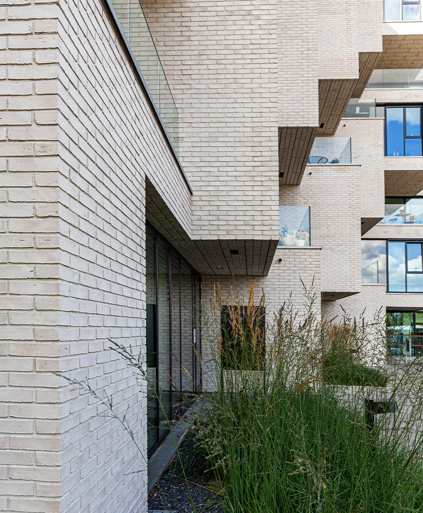 Exclusive apartment building with generous balconies overlooking a collective courtyard. Prima Lucca-bricks give this facade a fresh and modern look with shades of off-white and light-tinted yellow.
